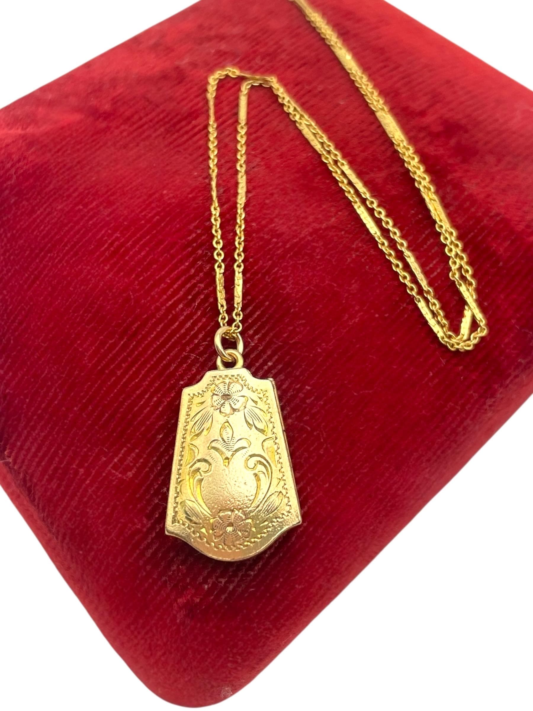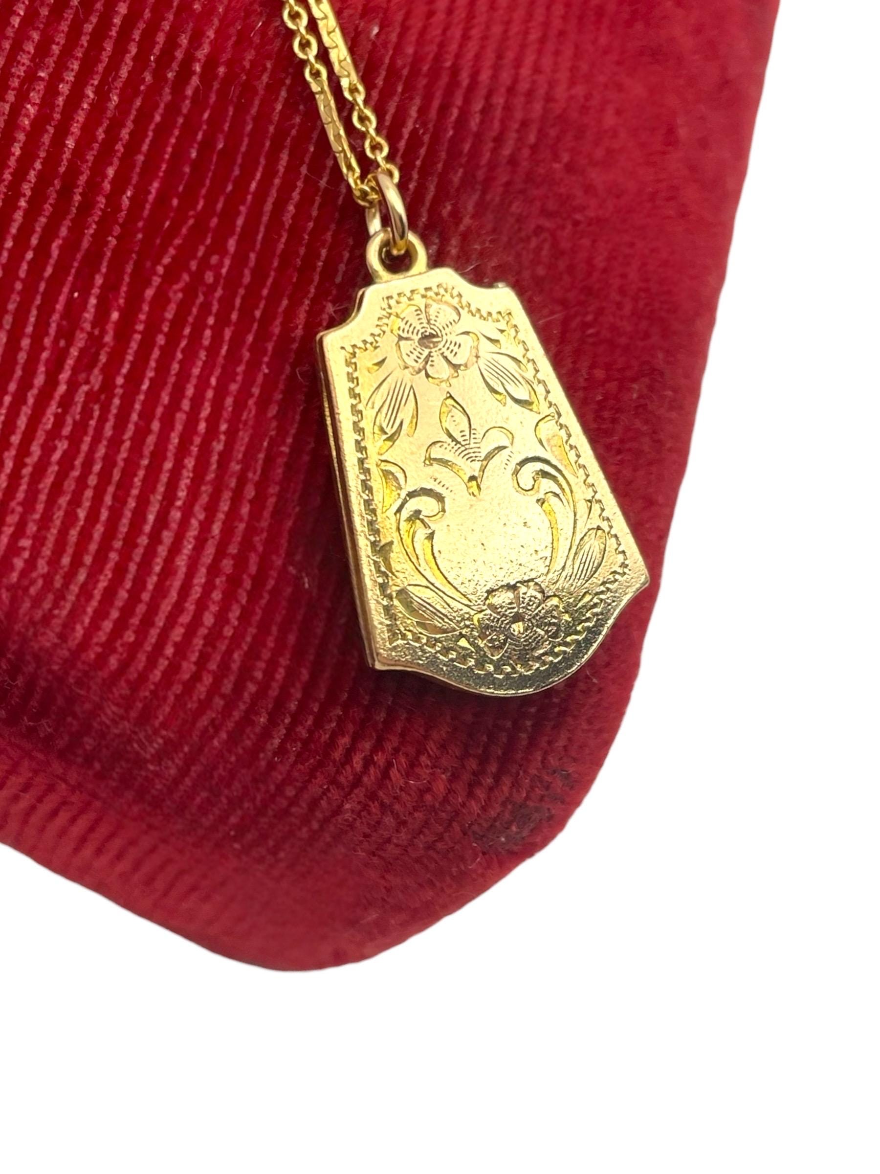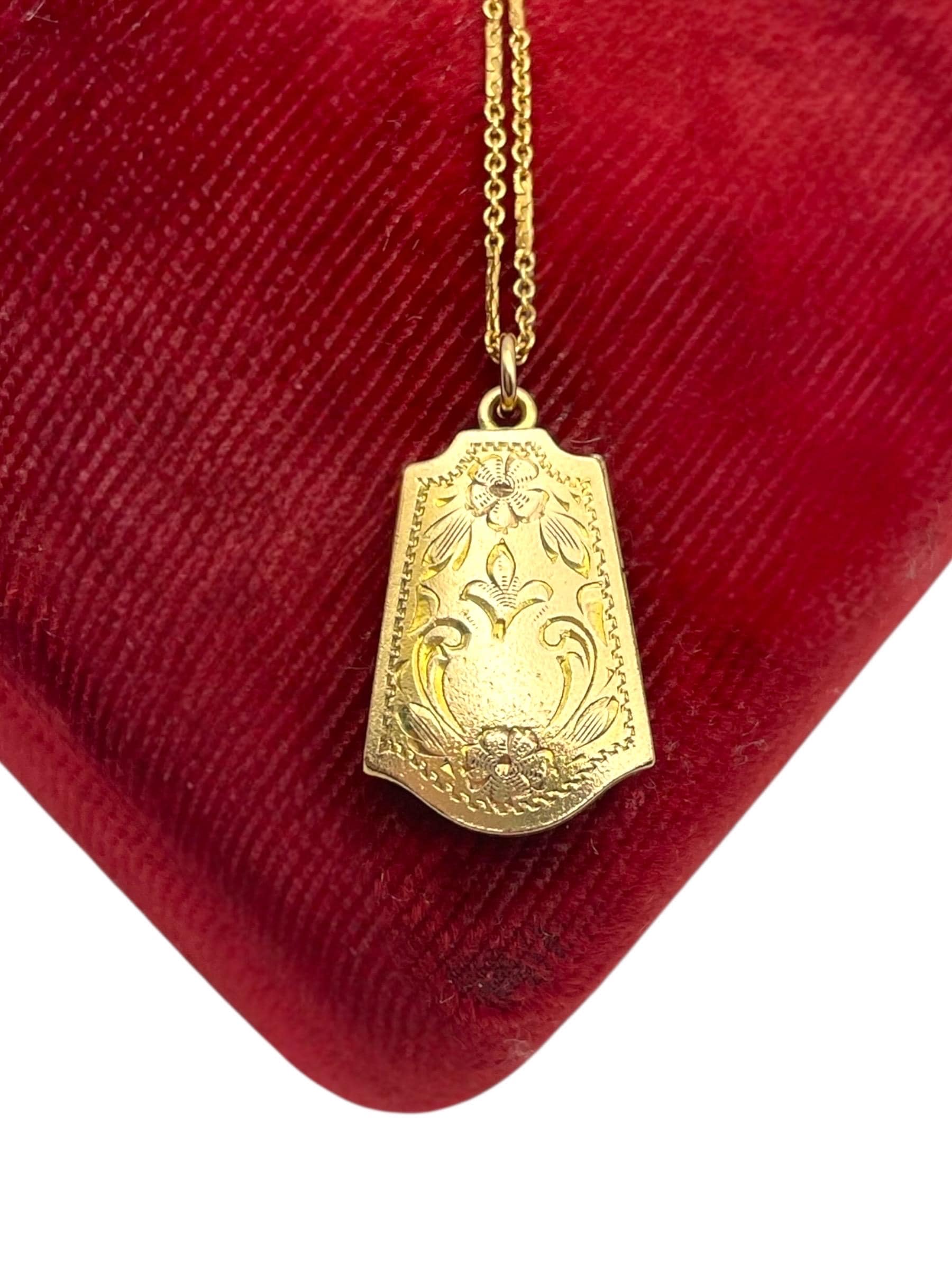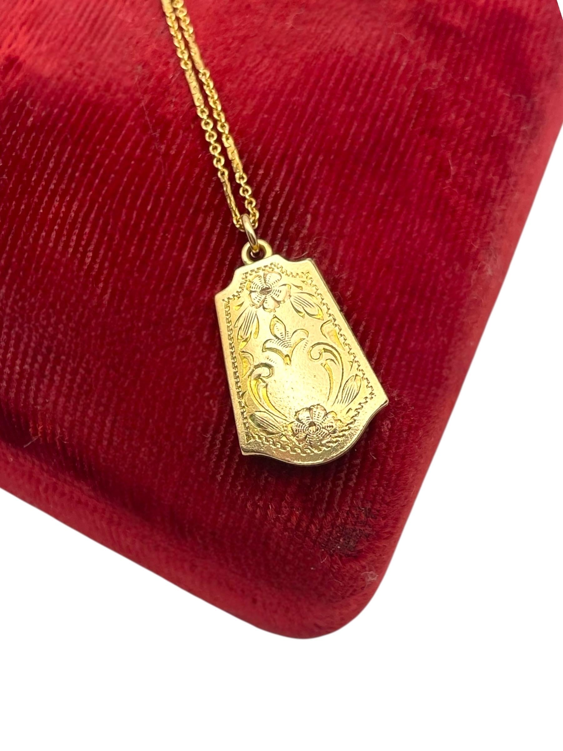 A unique yellow gold shield shaped locket necklace with a floral etched design on the front. The back of the locket is plain with no design.