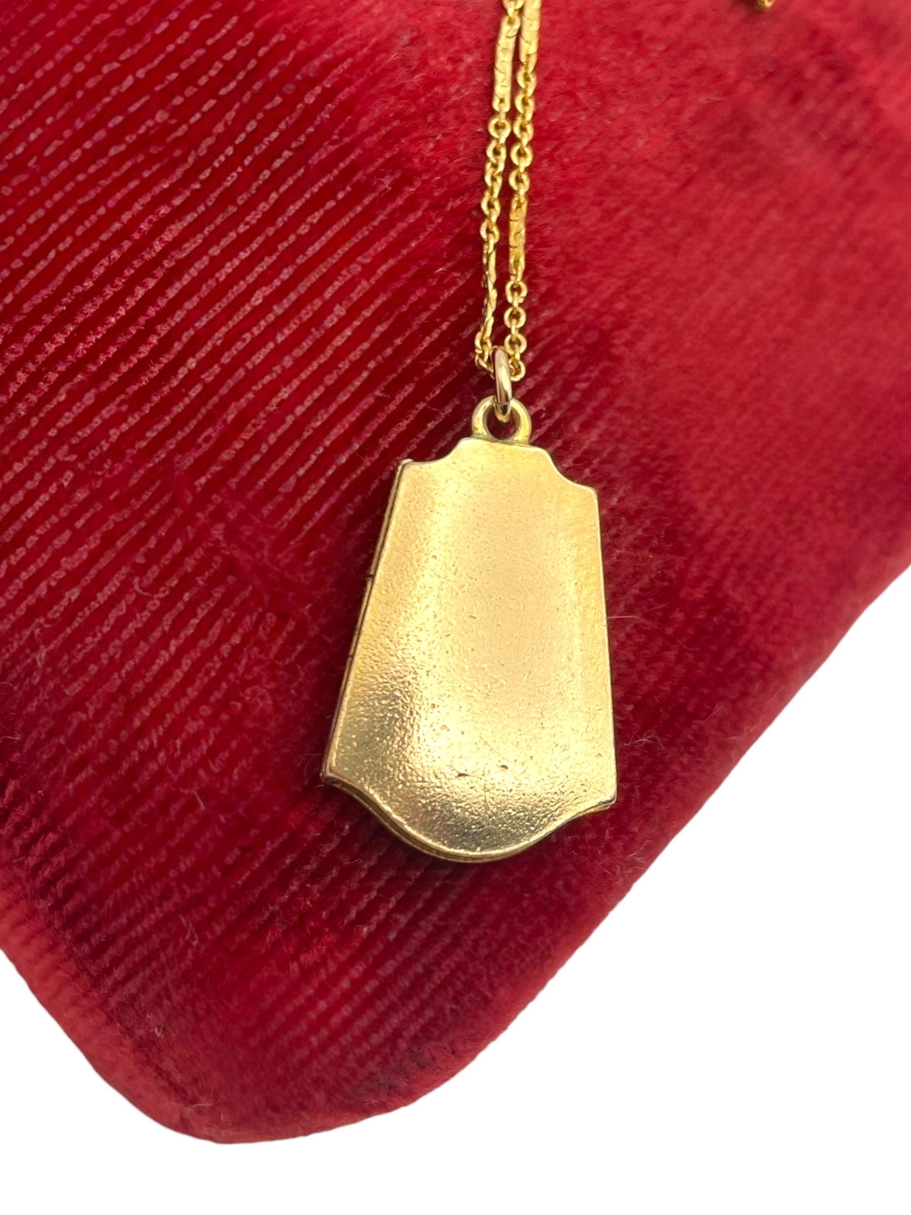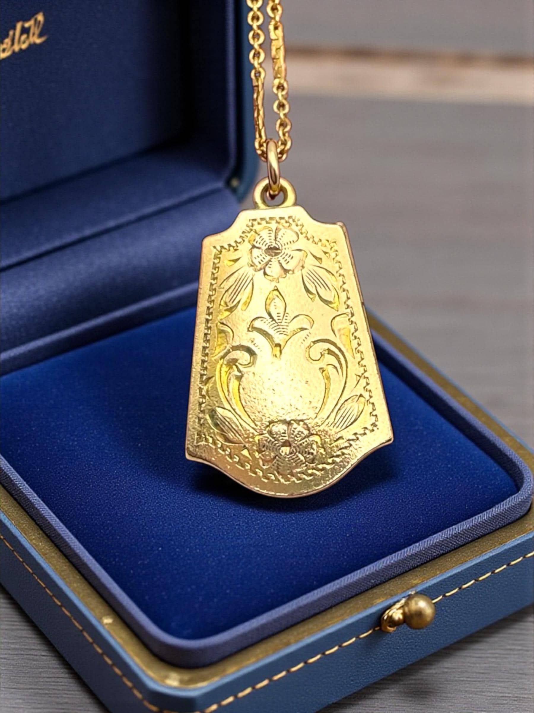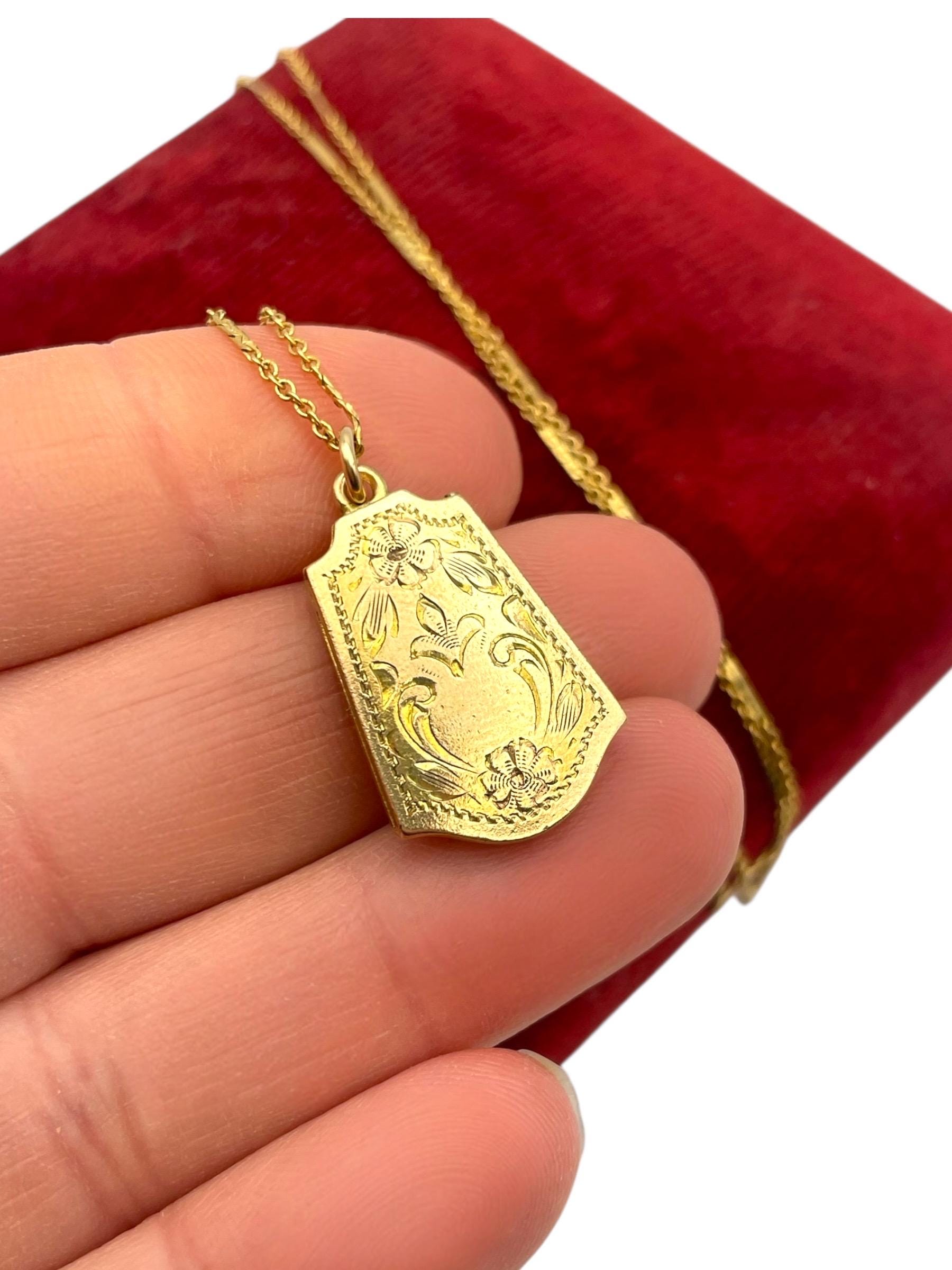 A unique yellow gold shield shaped locket necklace with a floral etched design on the front. The back of the locket is plain with no design.