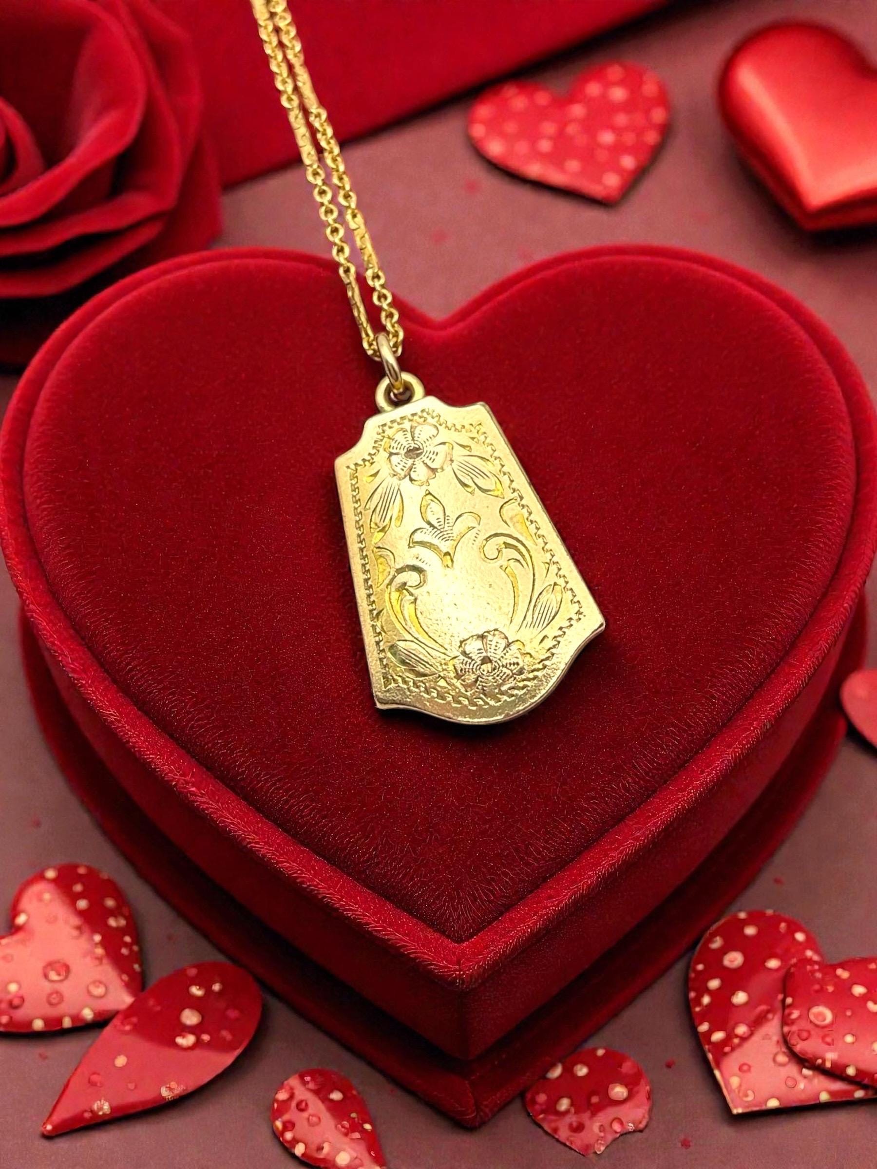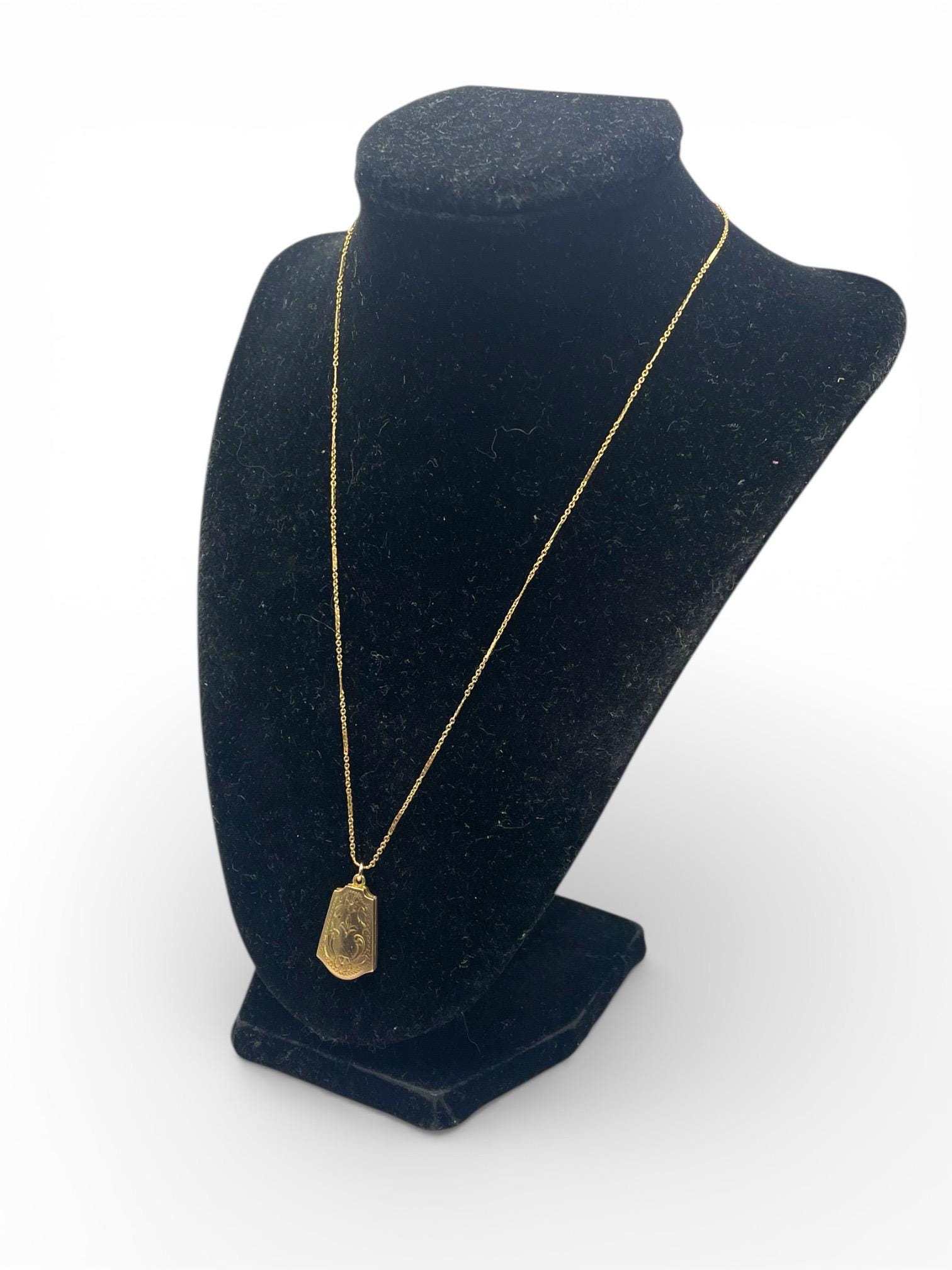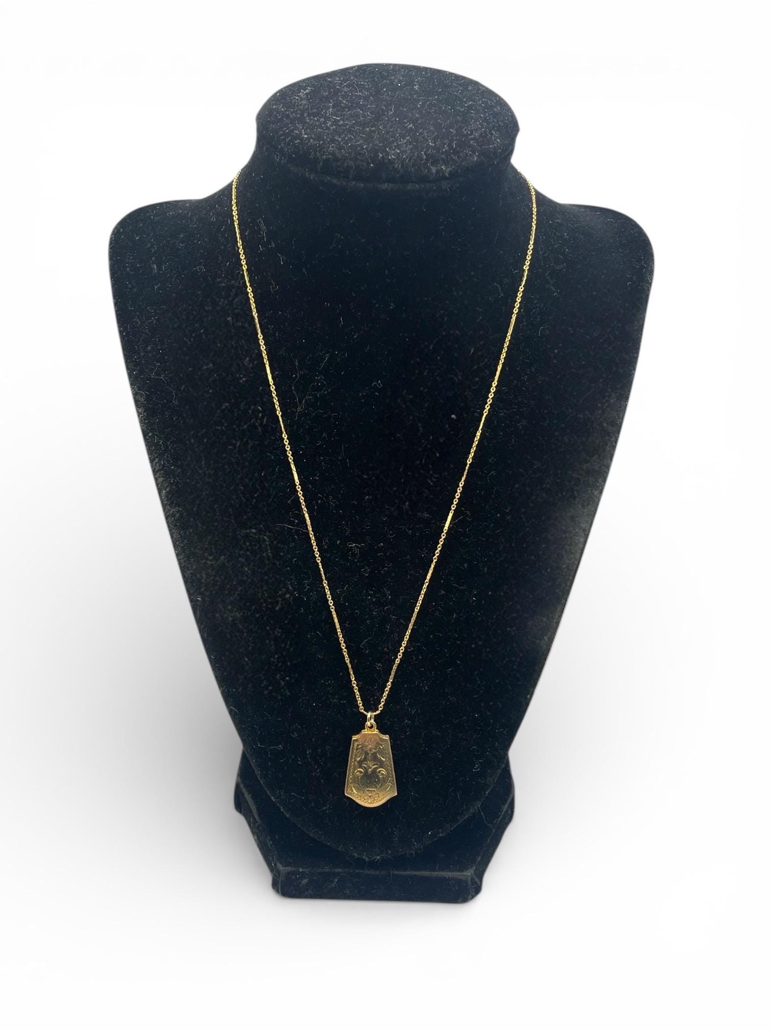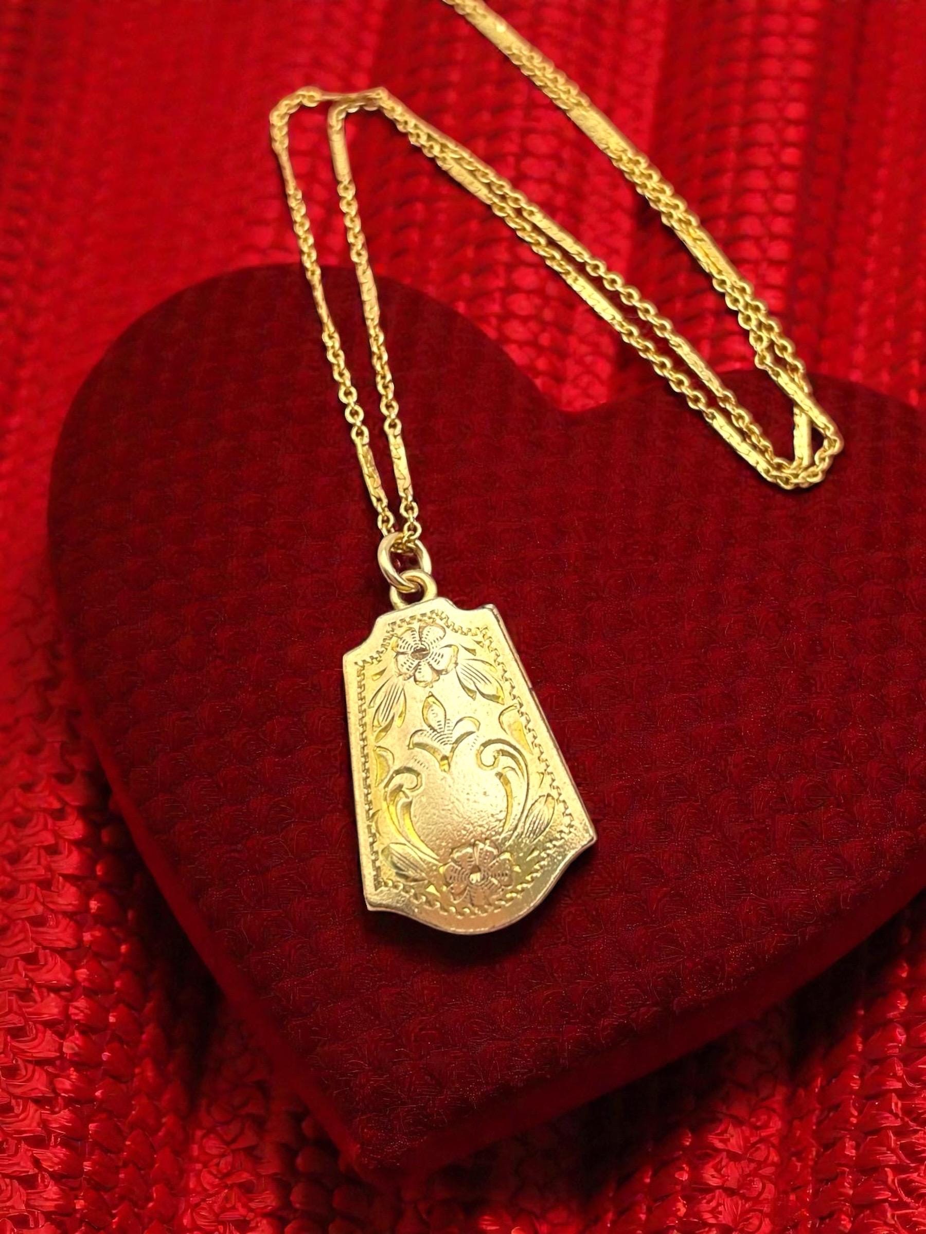 A unique yellow gold shield shaped locket necklace with a floral etched design on the front. The back of the locket is plain with no design.