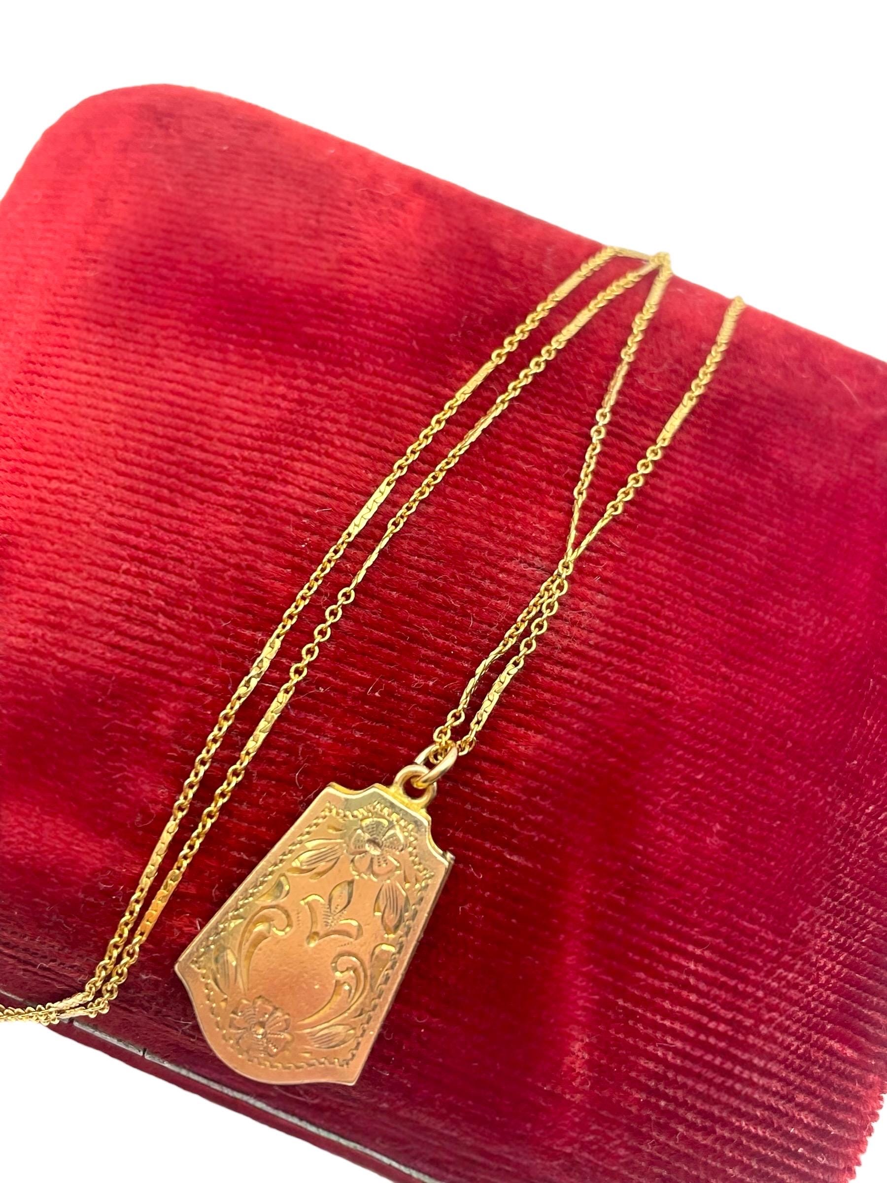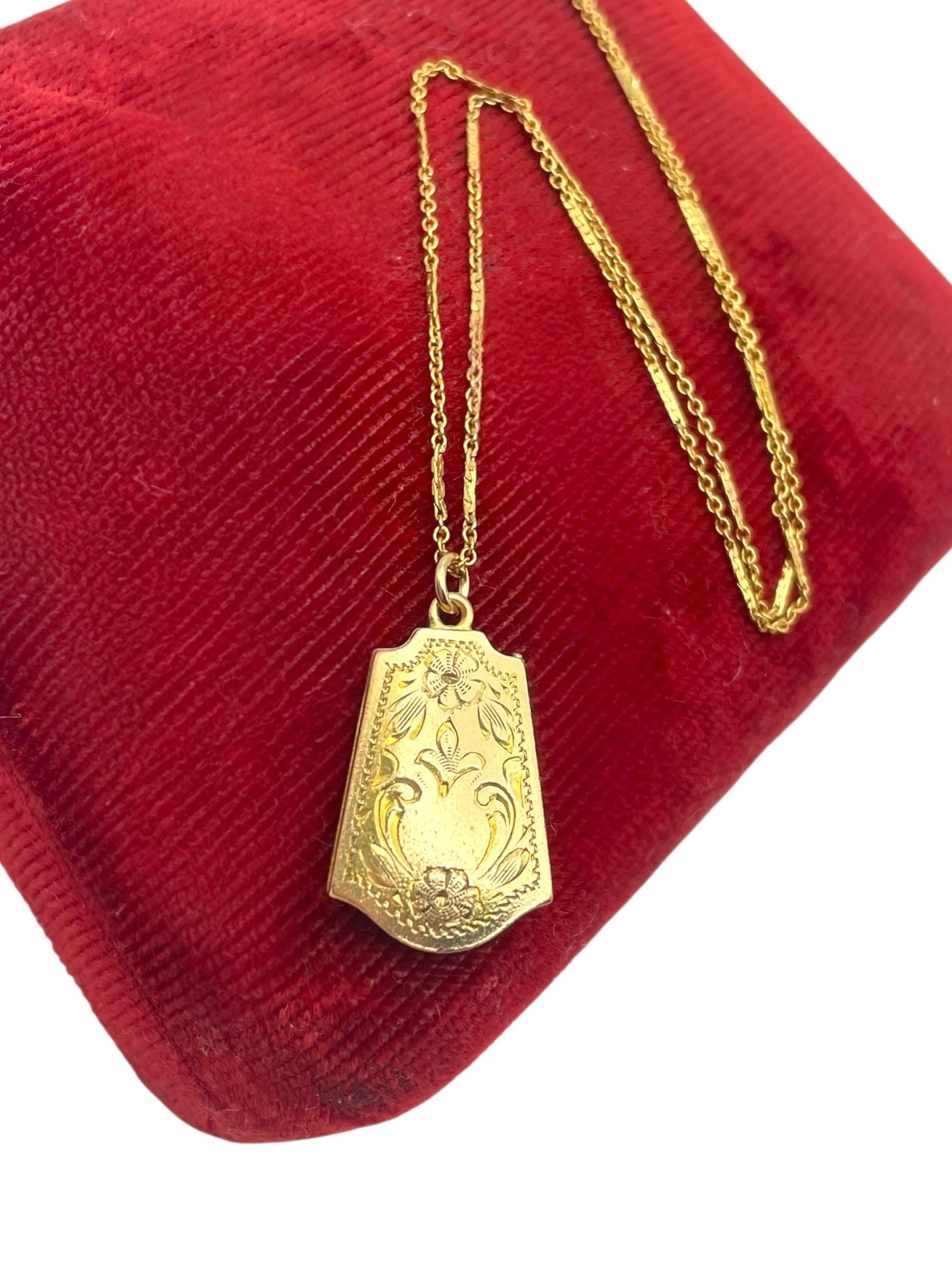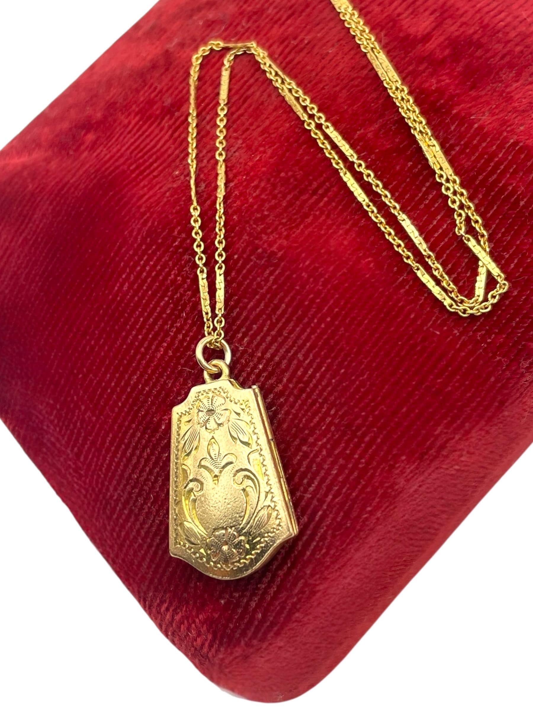 Vintage Gold Filled Locket Necklace – Floral Etched Shield, 14K GF Chain