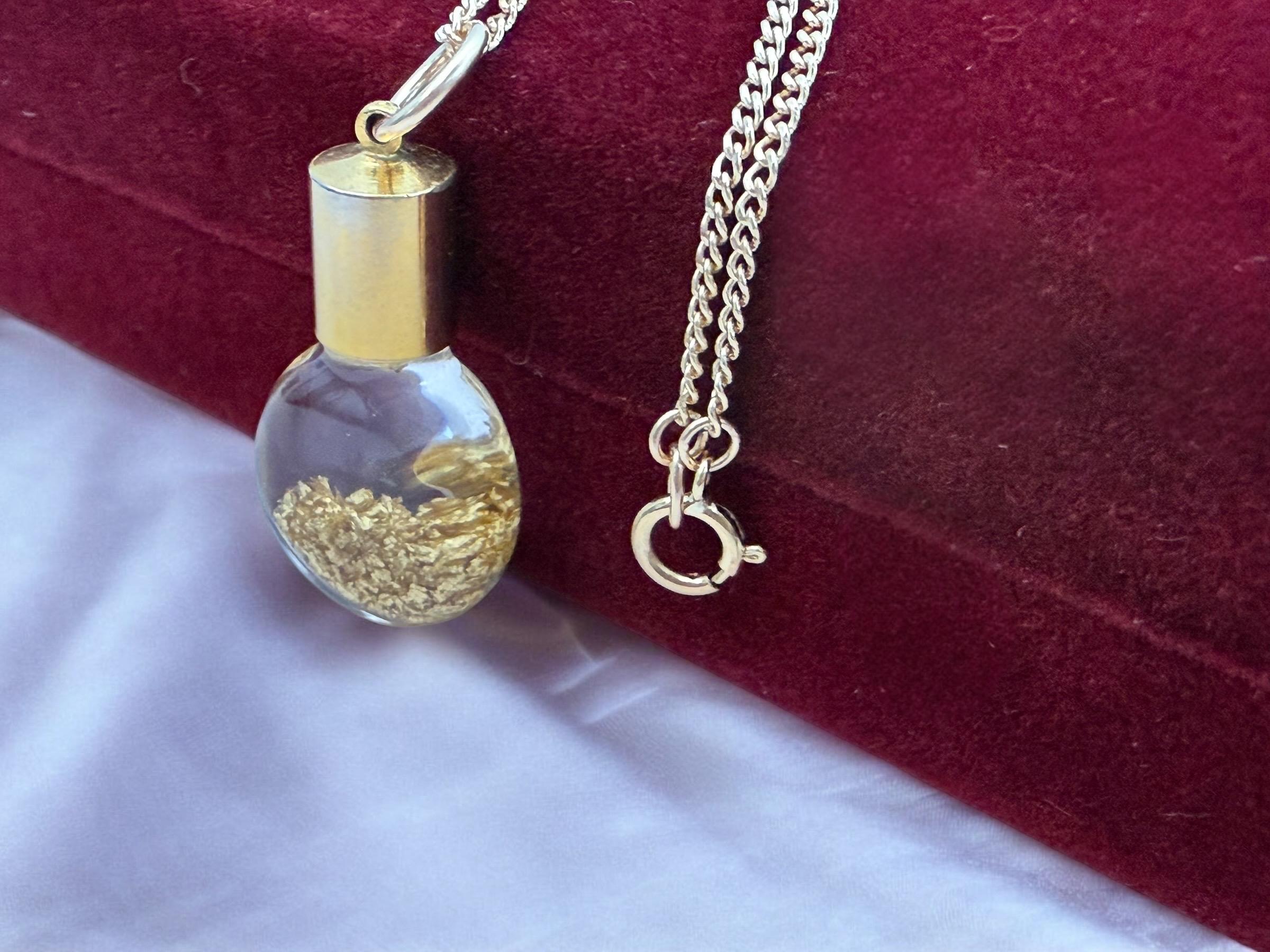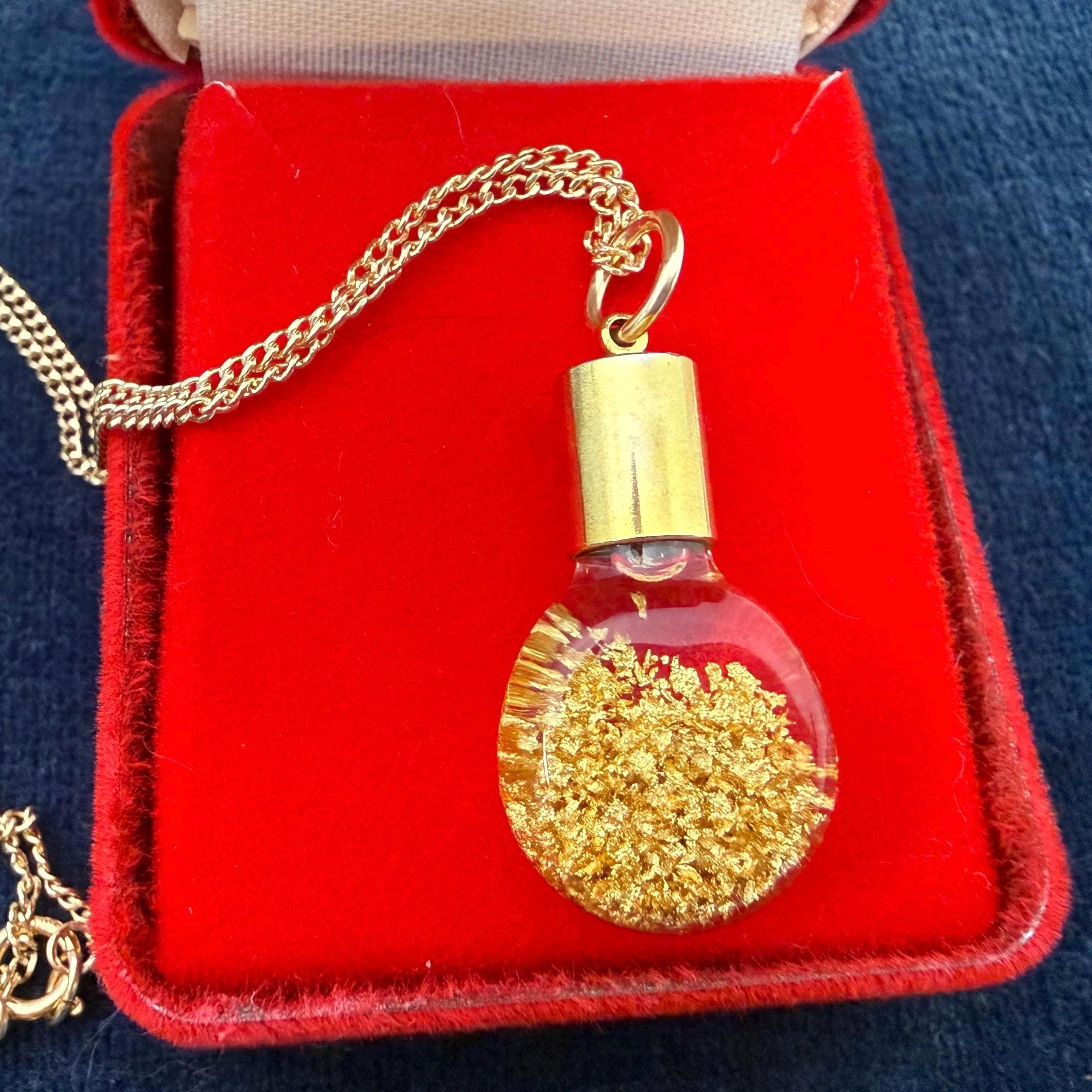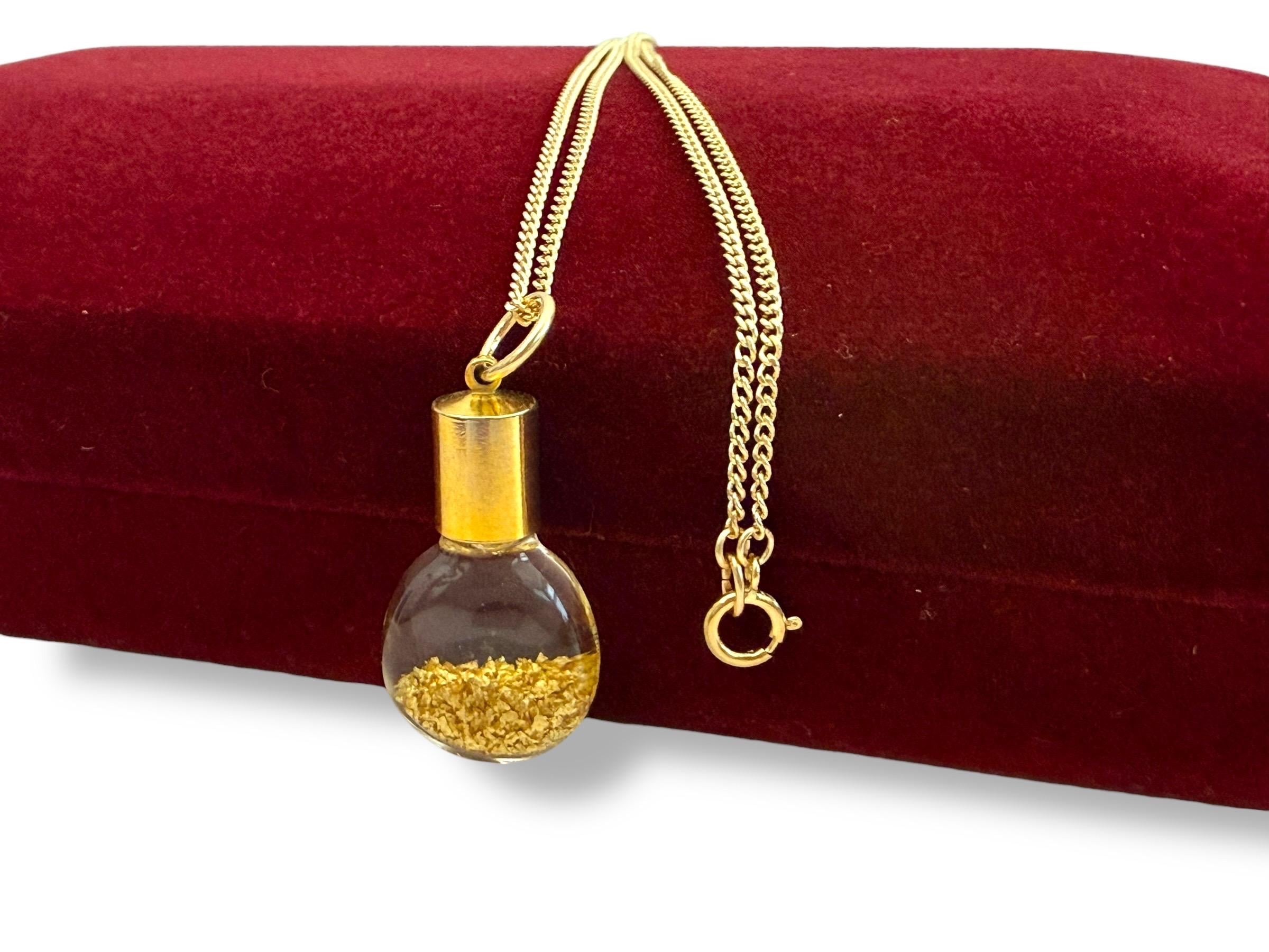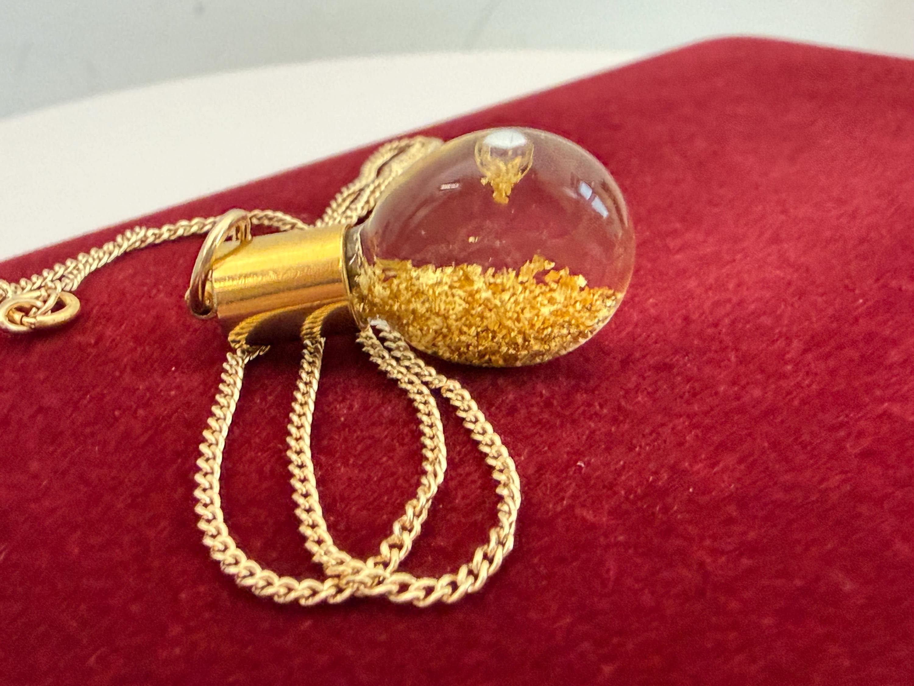 A vintage glass pendant filled with little gold flakes on a new 14K gold filled chain. This pendant is a small glass bottle with a gold metal top. Gold flakes have been placed inside floating in glycerin so as to be seen from all sides.