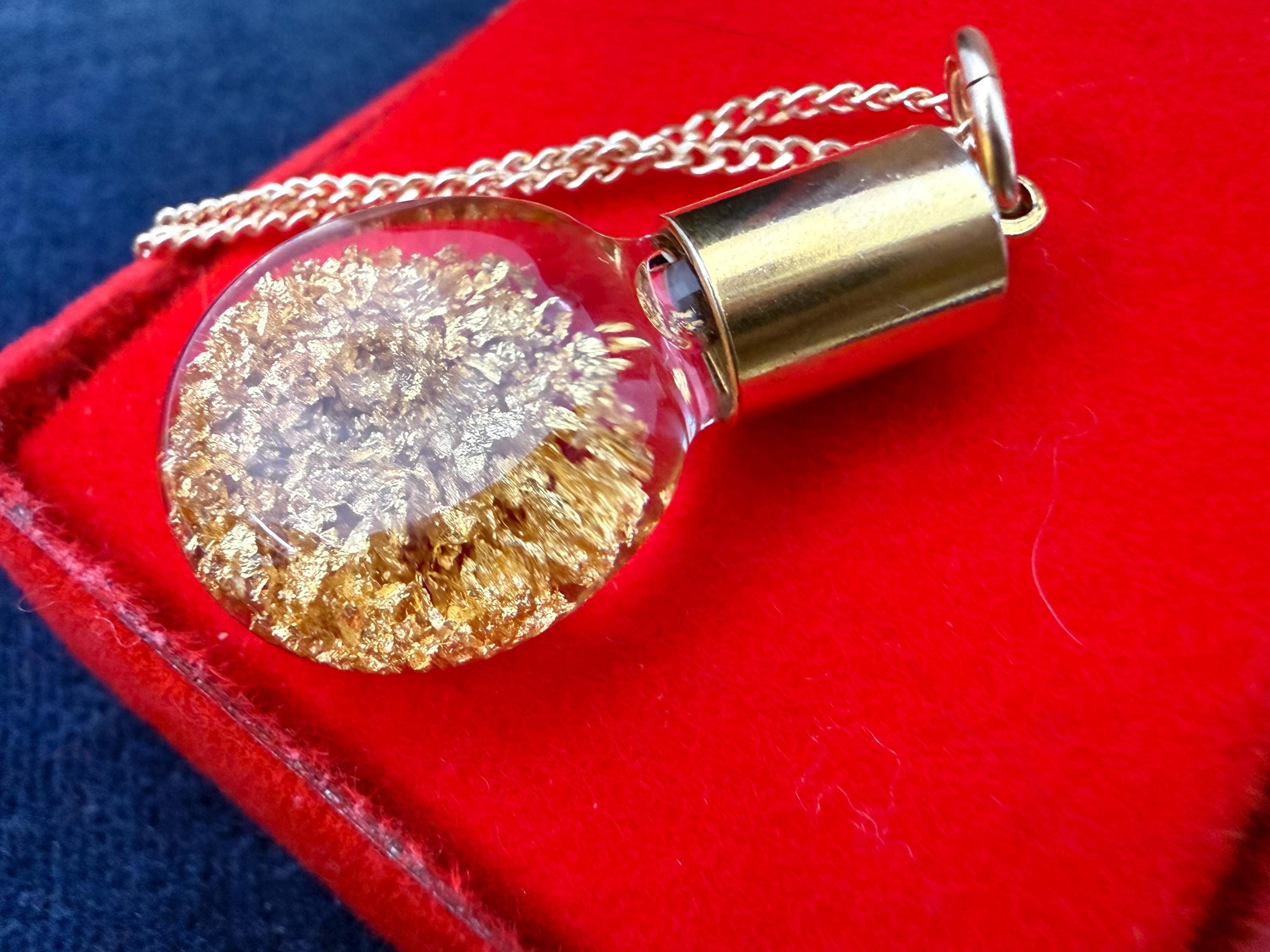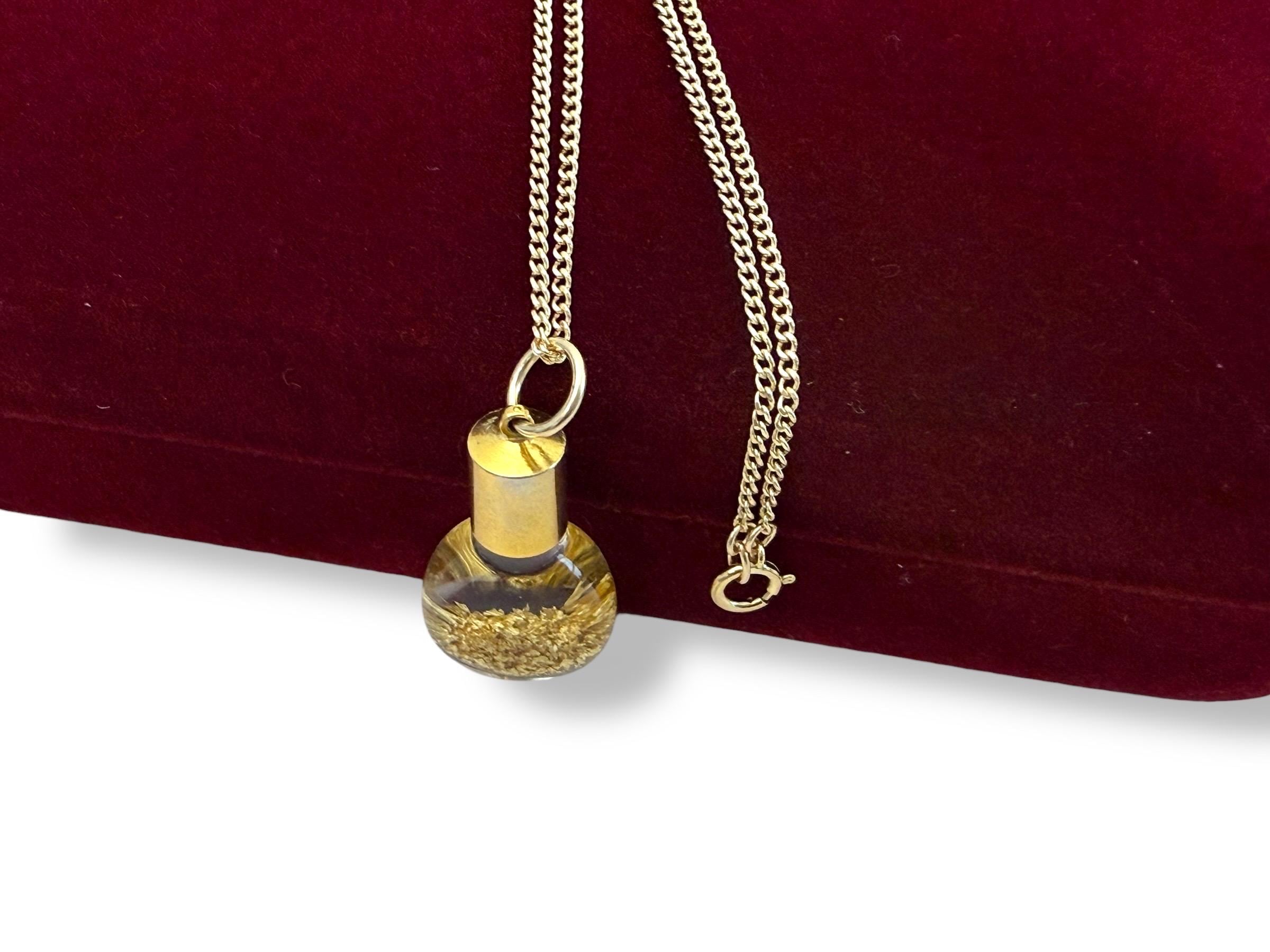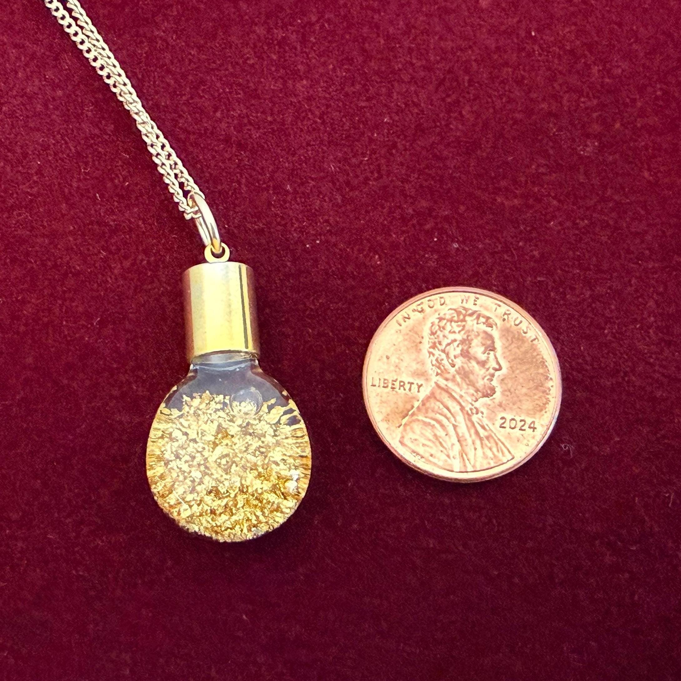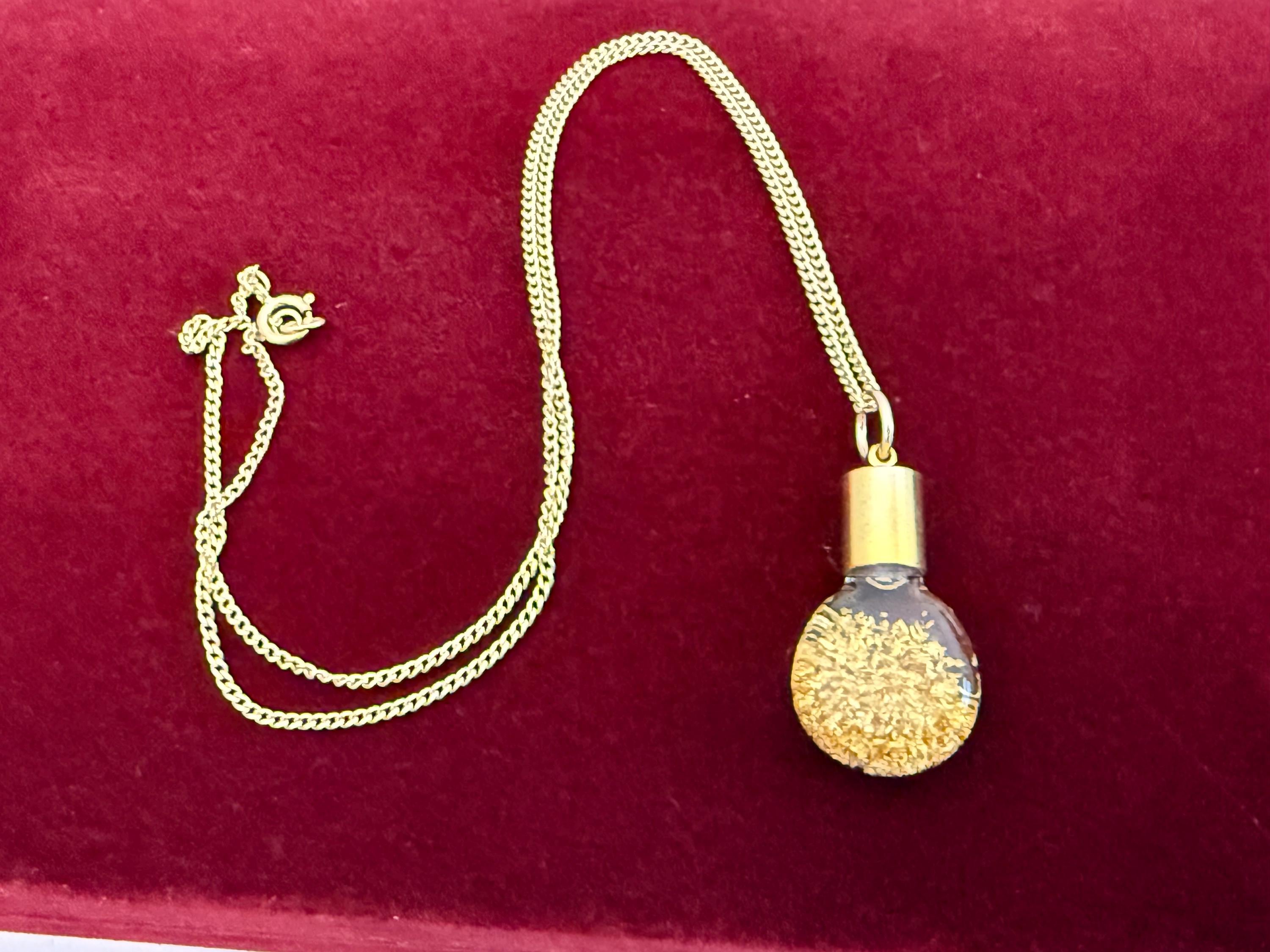 A vintage glass pendant filled with little gold flakes on a new 14K gold filled chain. This pendant is a small glass bottle with a gold metal top. Gold flakes have been placed inside floating in glycerin so as to be seen from all sides.
