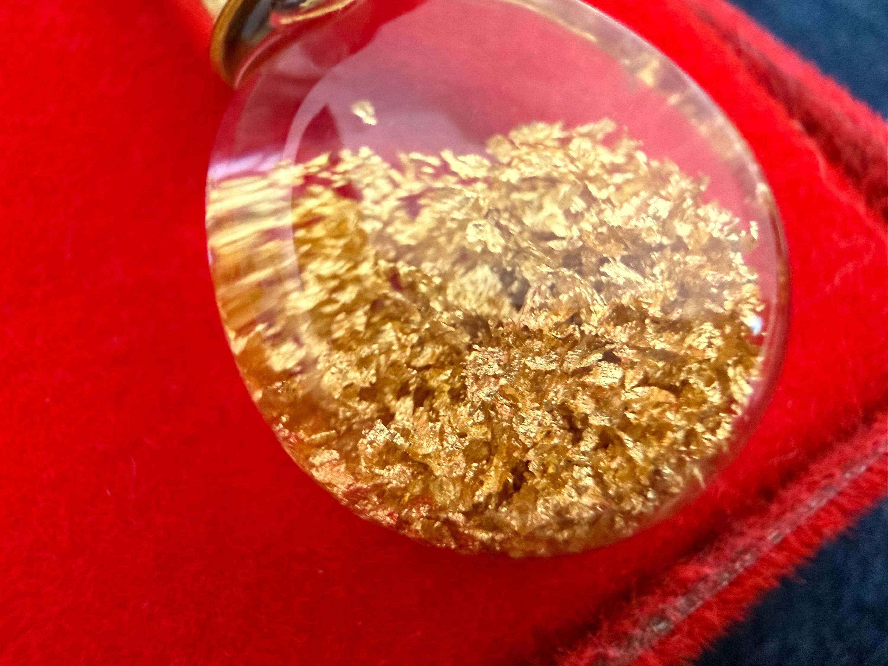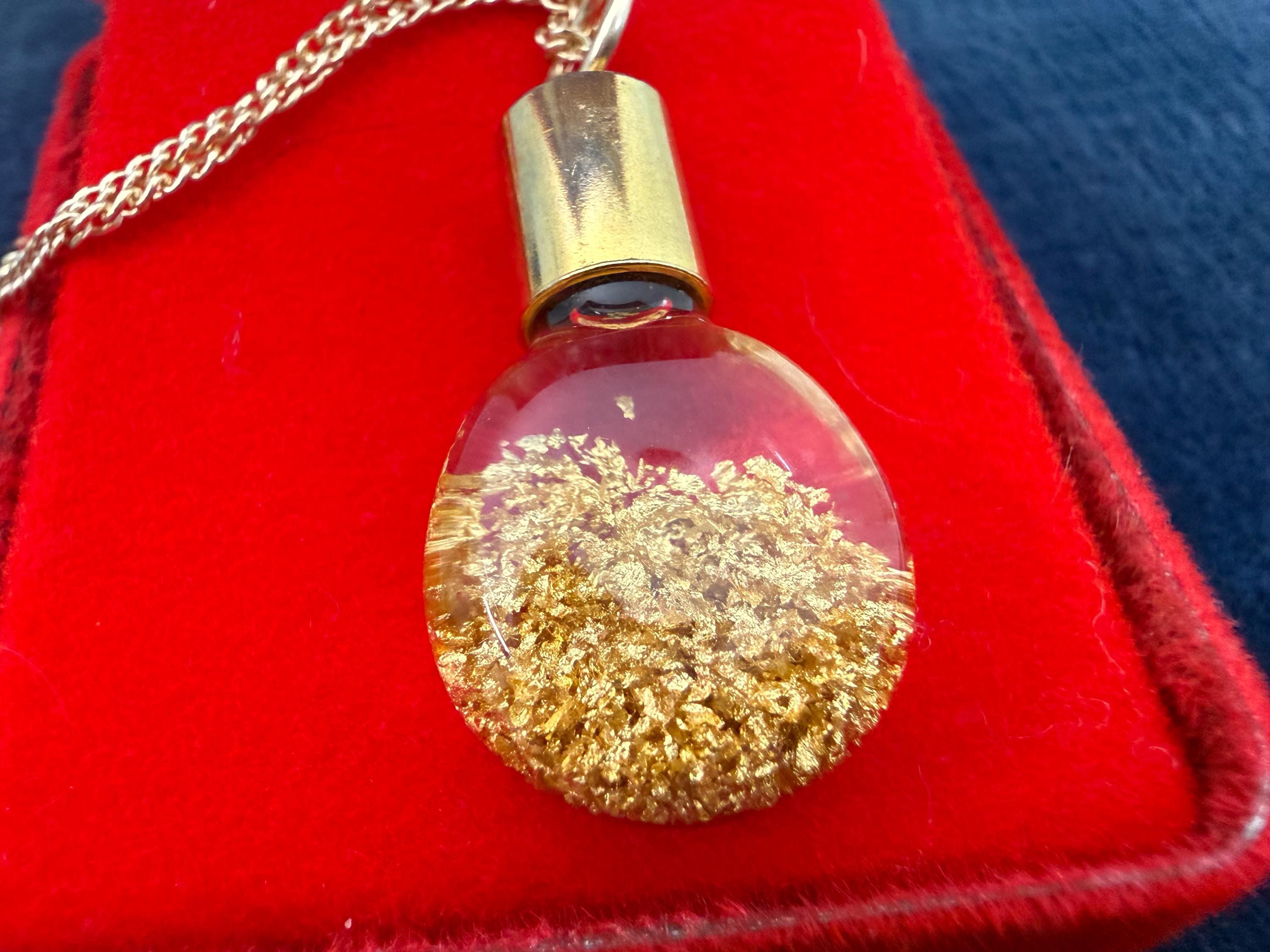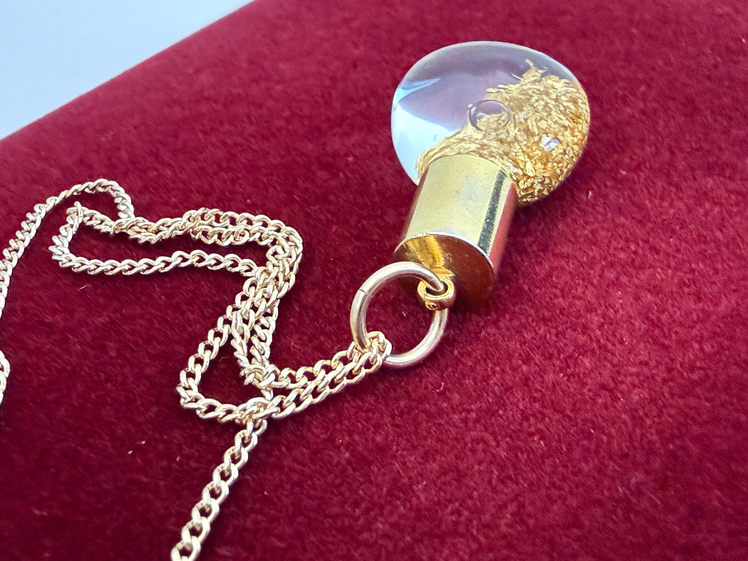 This glass charm pendant hangs on a 14K gold filled chain that is 16" long. The chain is new, the pendant is vintage and is circa 1990s. (This type of item was often a souvenir from a visit to a place where gold mining has taken place such as Alaska or Montana.)
