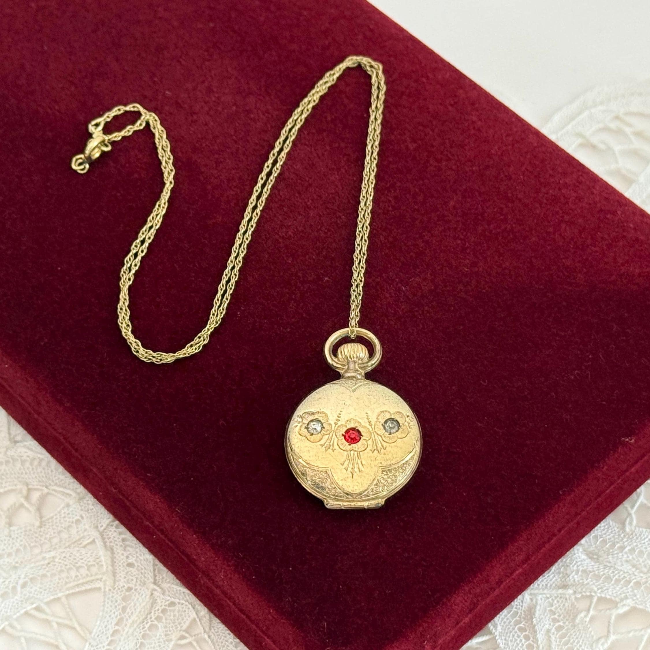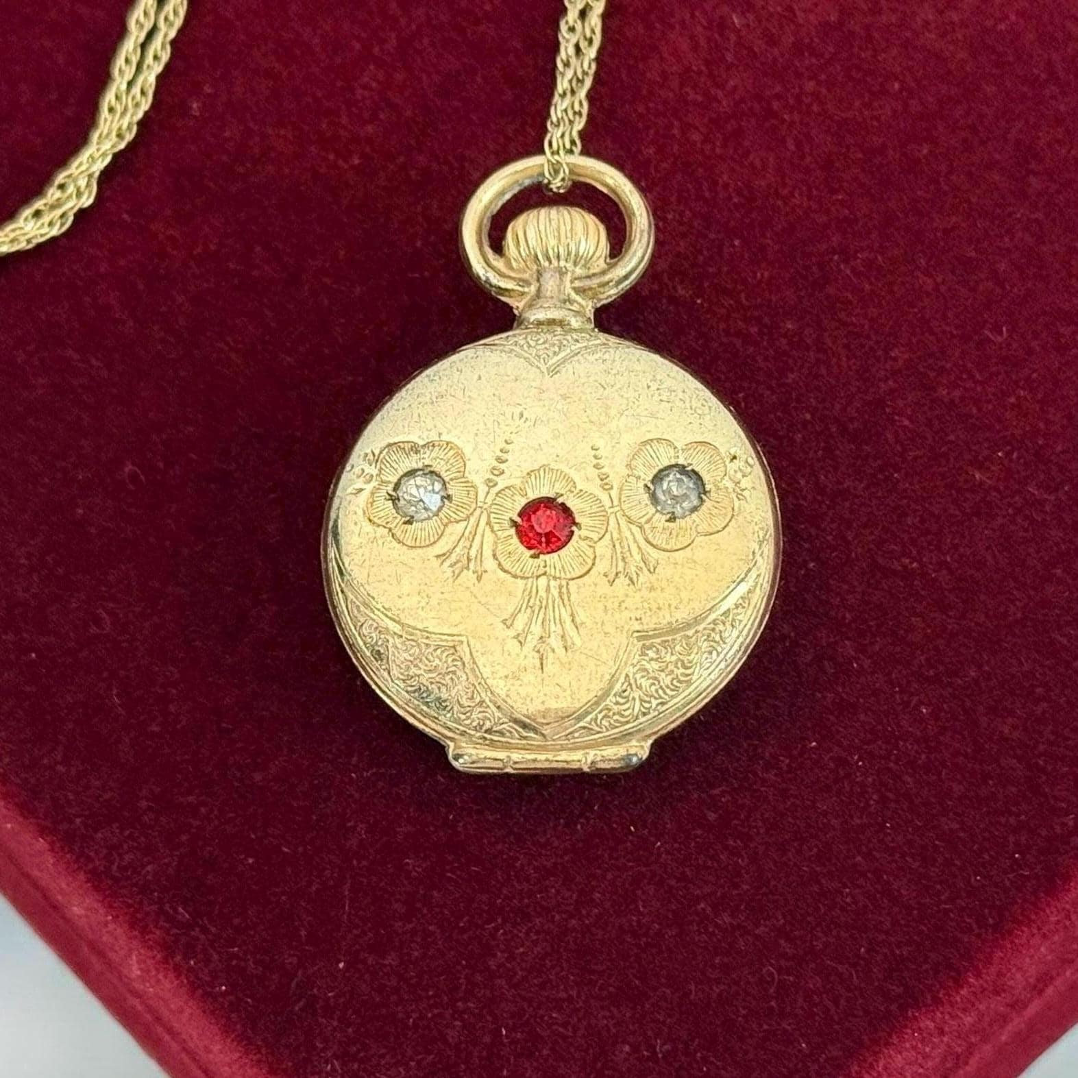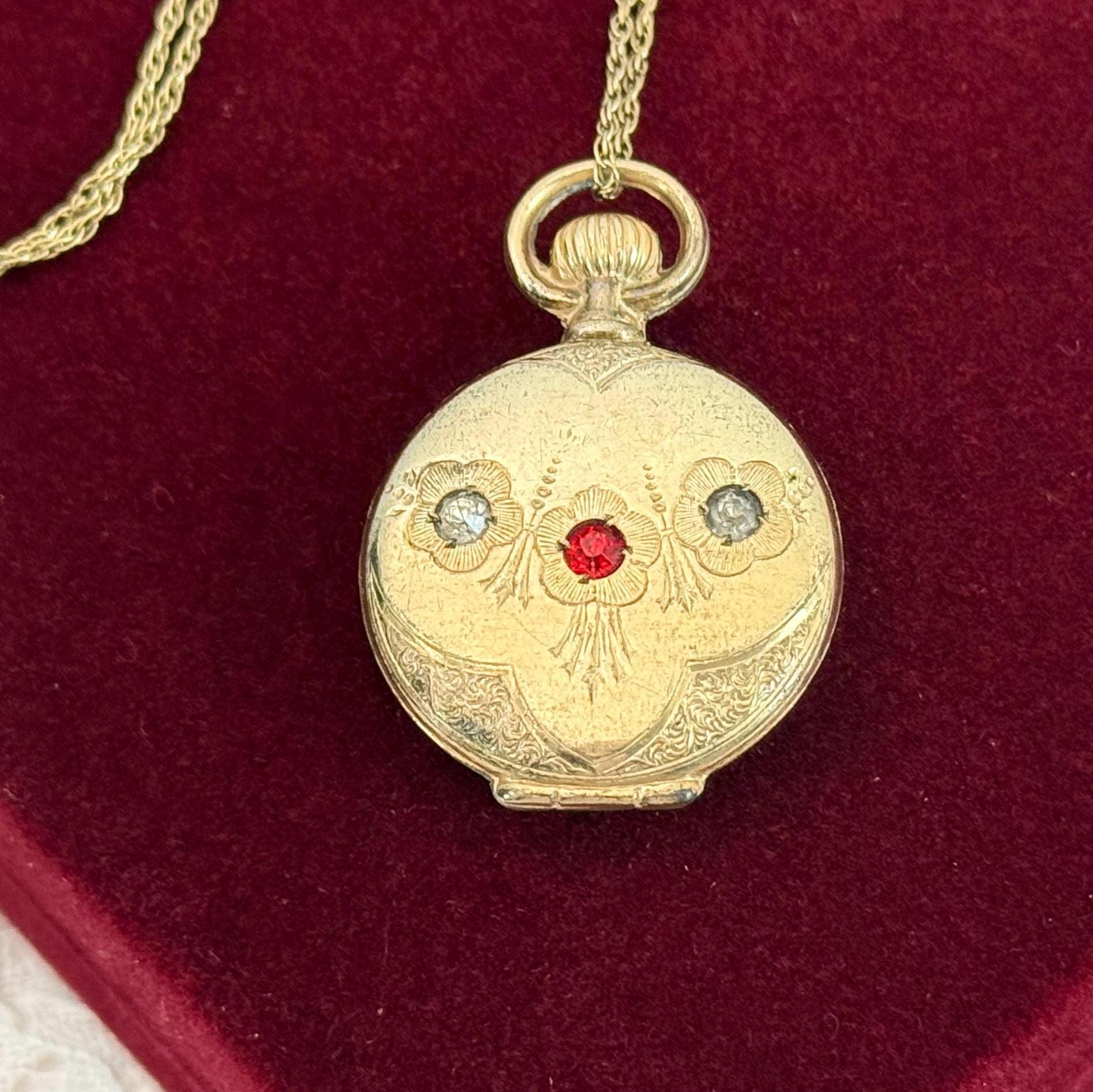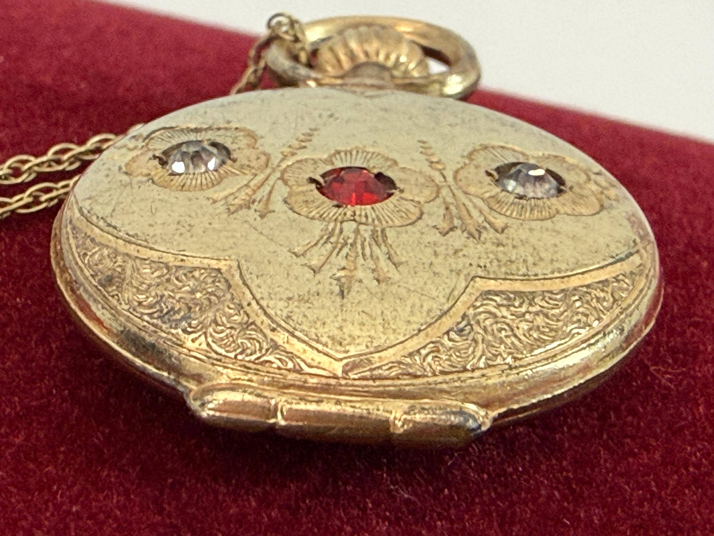 Lovely vintage necklace that looks like a pocket watch case but it is a pendant. It hangs on a vintage 12K gold filled rope chain. The gold plated round pendant features three round paste (glass) gems set on the etched front: one red gem and two clear ones. They are set inside small flowers. The back of the round pendant is plain with no design. The top has a pin and loop that one sees on a pocket watch that are purely decorative.
