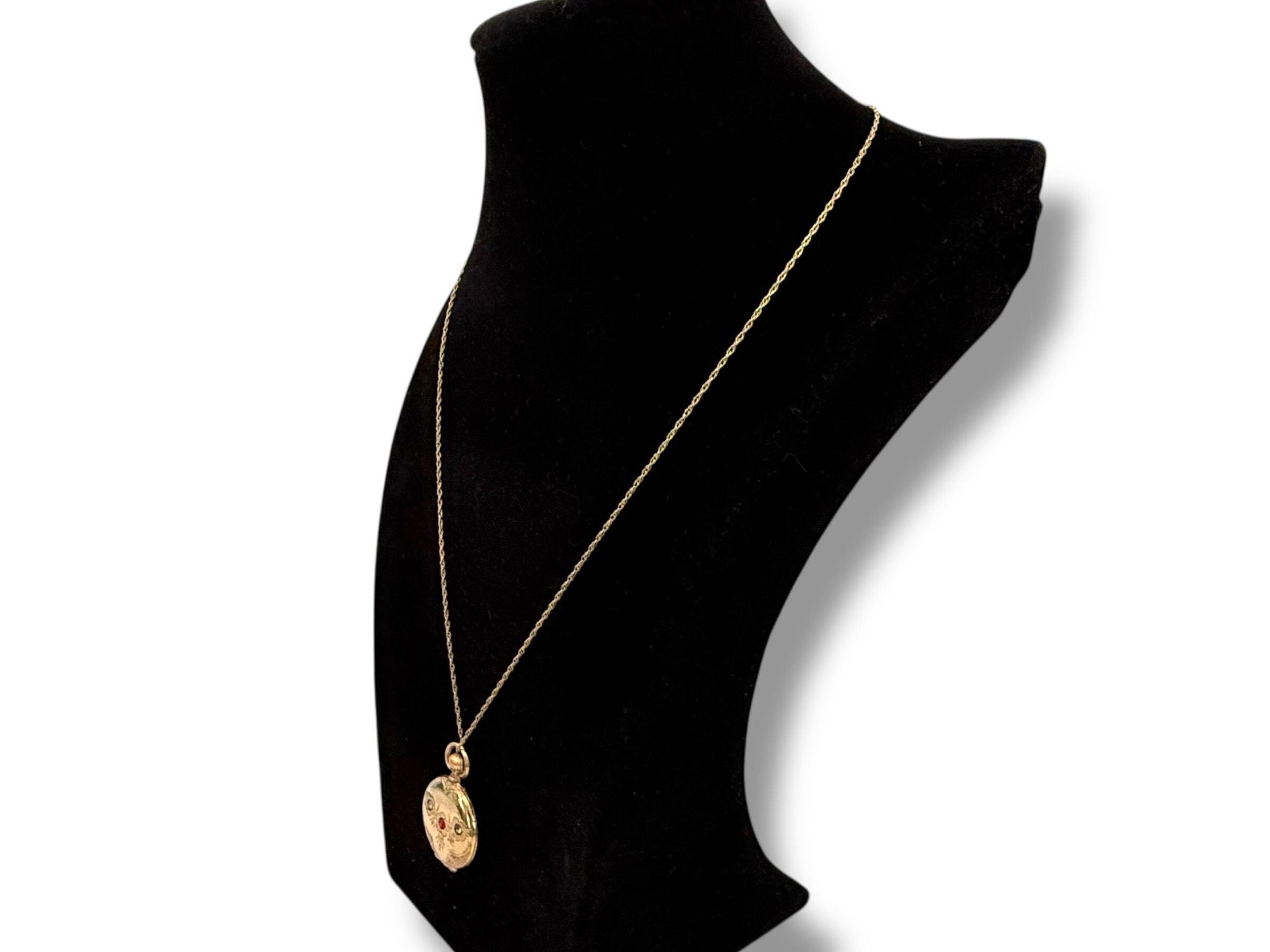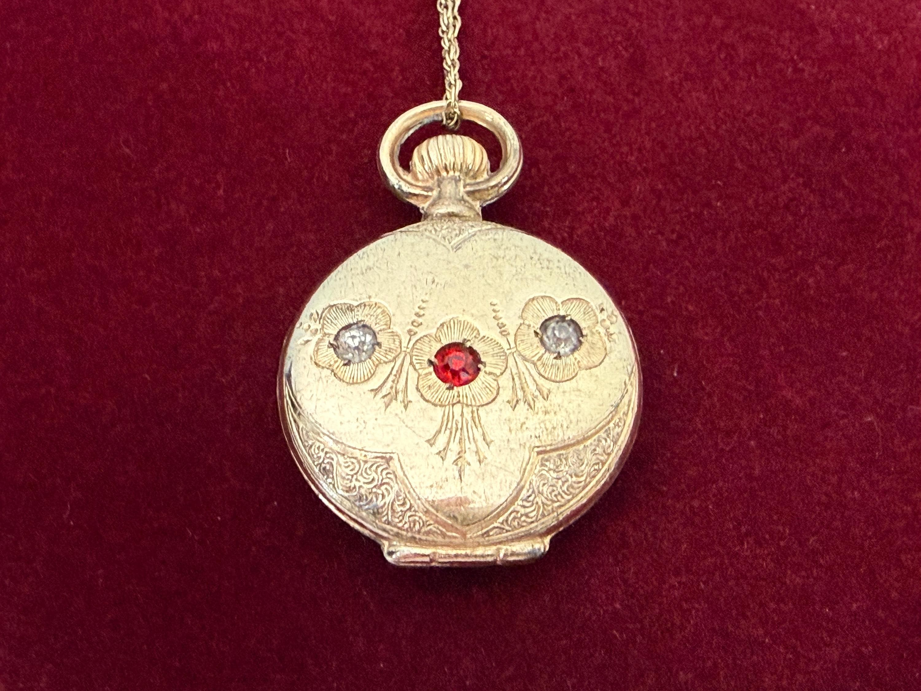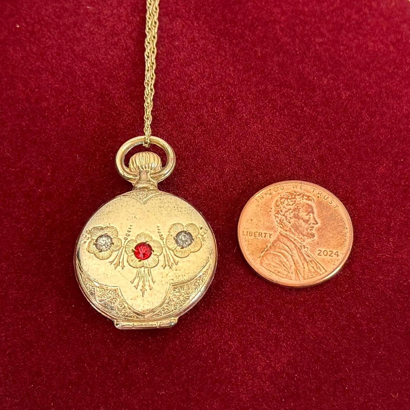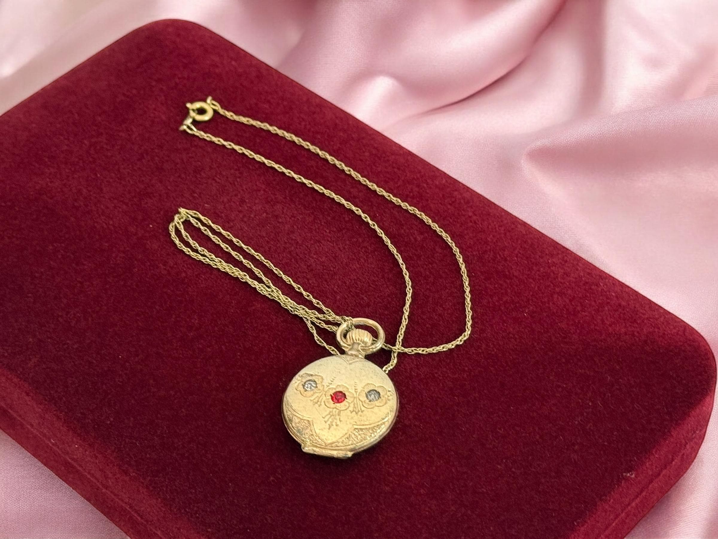 Lovely vintage necklace that looks like a pocket watch case but it is a pendant. It hangs on a vintage 12K gold filled rope chain. The gold plated round pendant features three round paste (glass) gems set on the etched front: one red gem and two clear ones. They are set inside small flowers. The back of the round pendant is plain with no design. The top has a pin and loop that one sees on a pocket watch that are purely decorative.