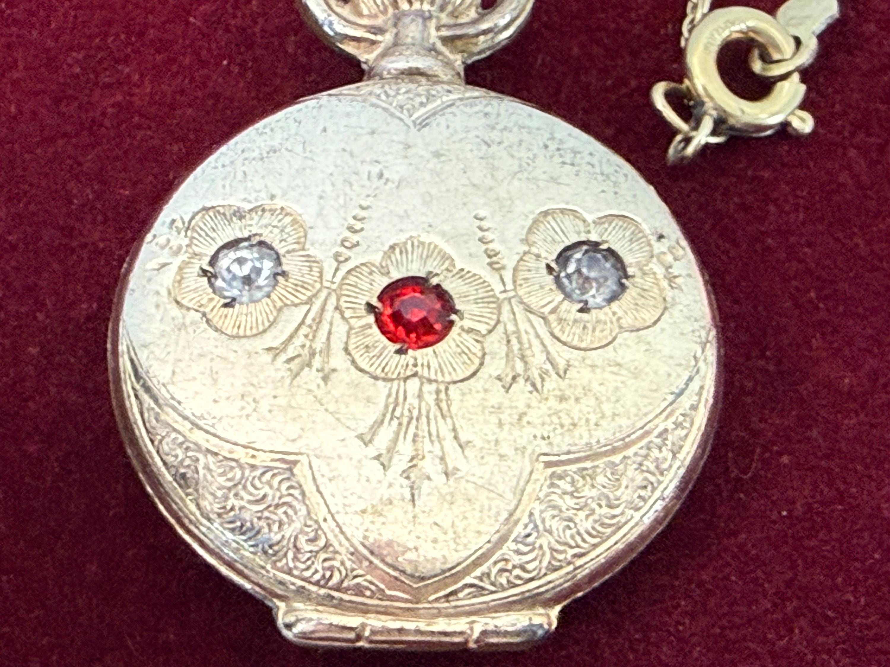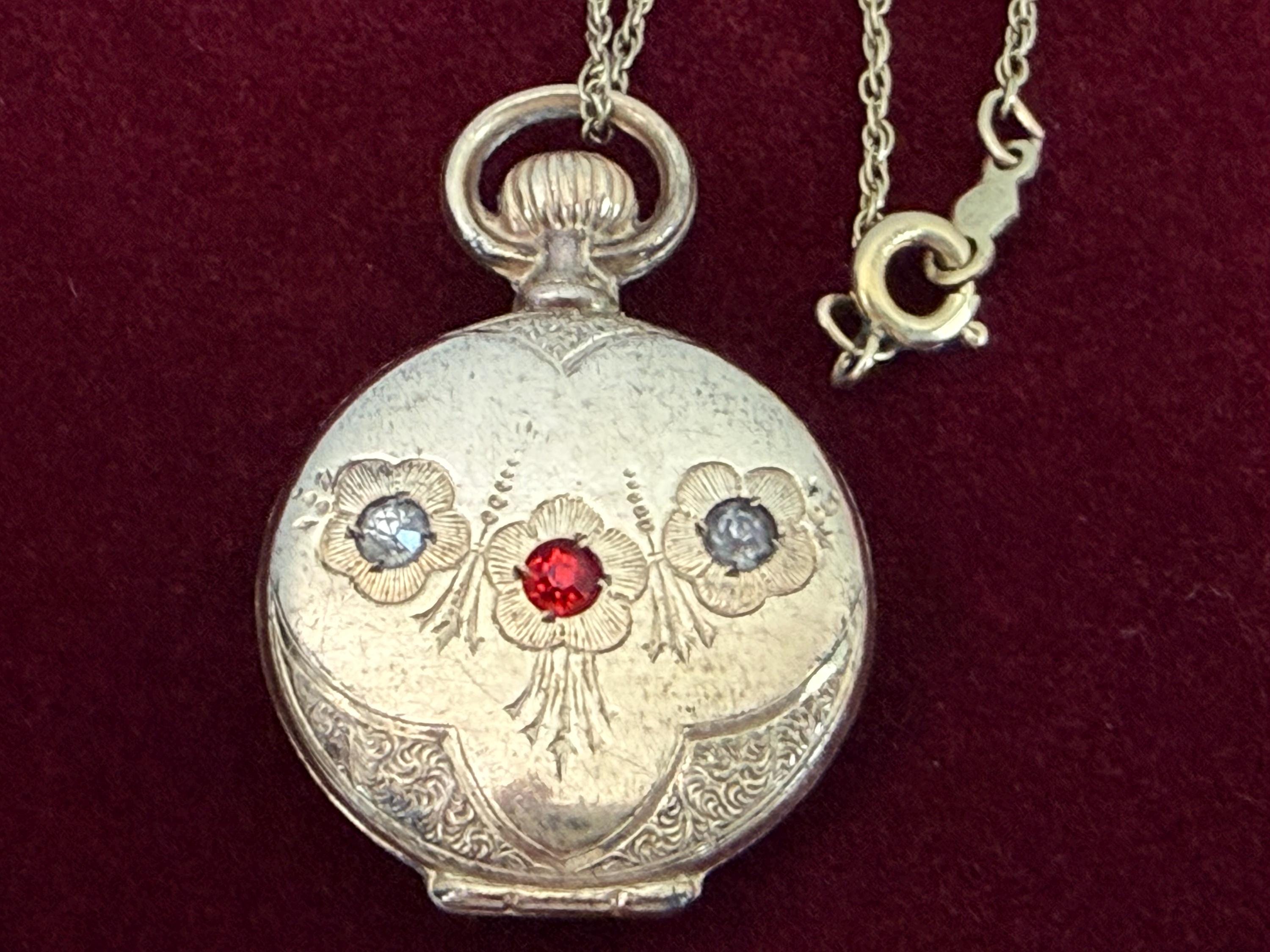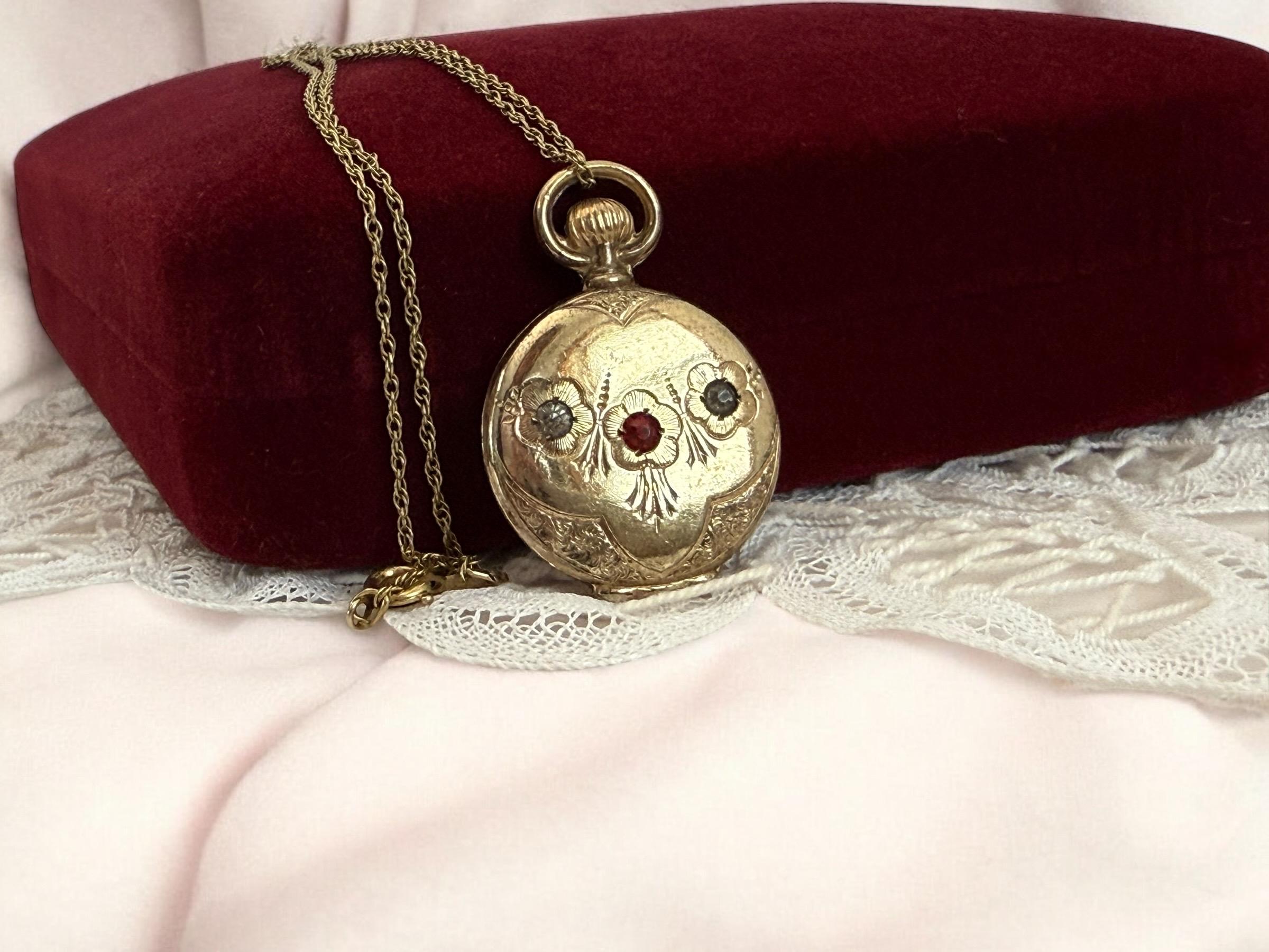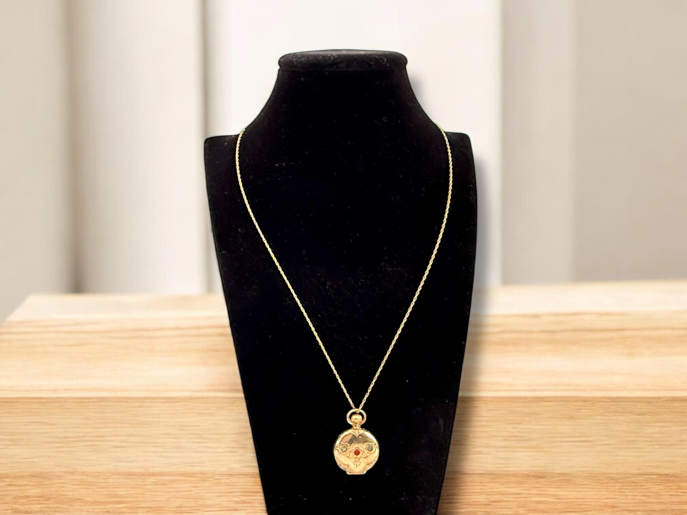 Lovely vintage necklace that looks like a pocket watch case but it is a pendant. It hangs on a vintage 12K gold filled rope chain. The gold plated round pendant features three round paste (glass) gems set on the etched front: one red gem and two clear ones. They are set inside small flowers. The back of the round pendant is plain with no design. The top has a pin and loop that one sees on a pocket watch that are purely decorative.