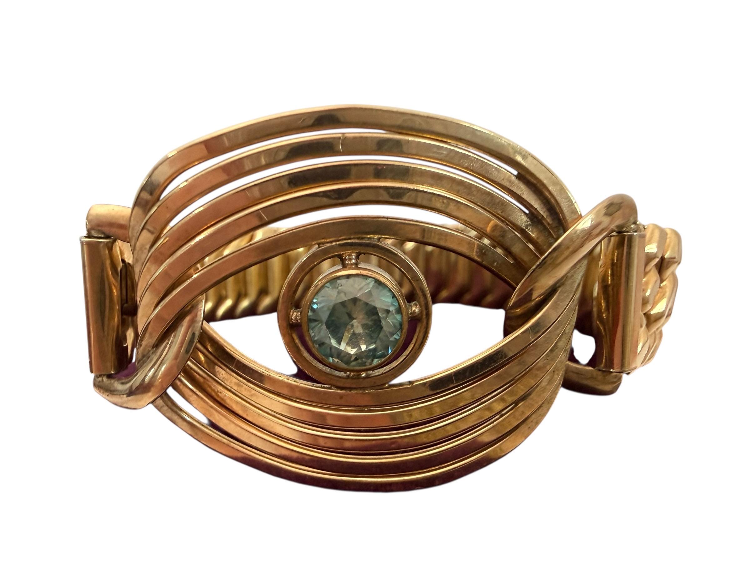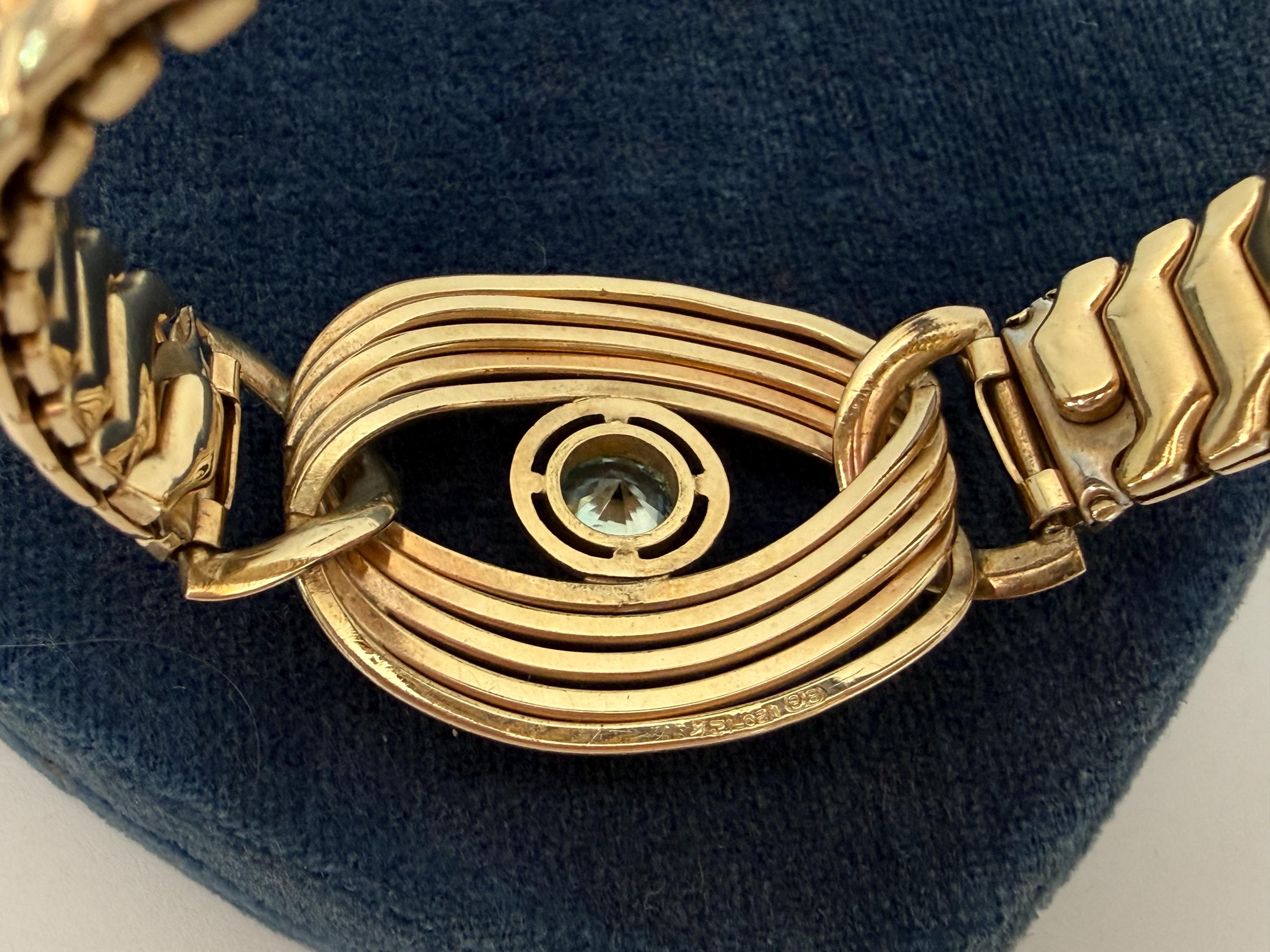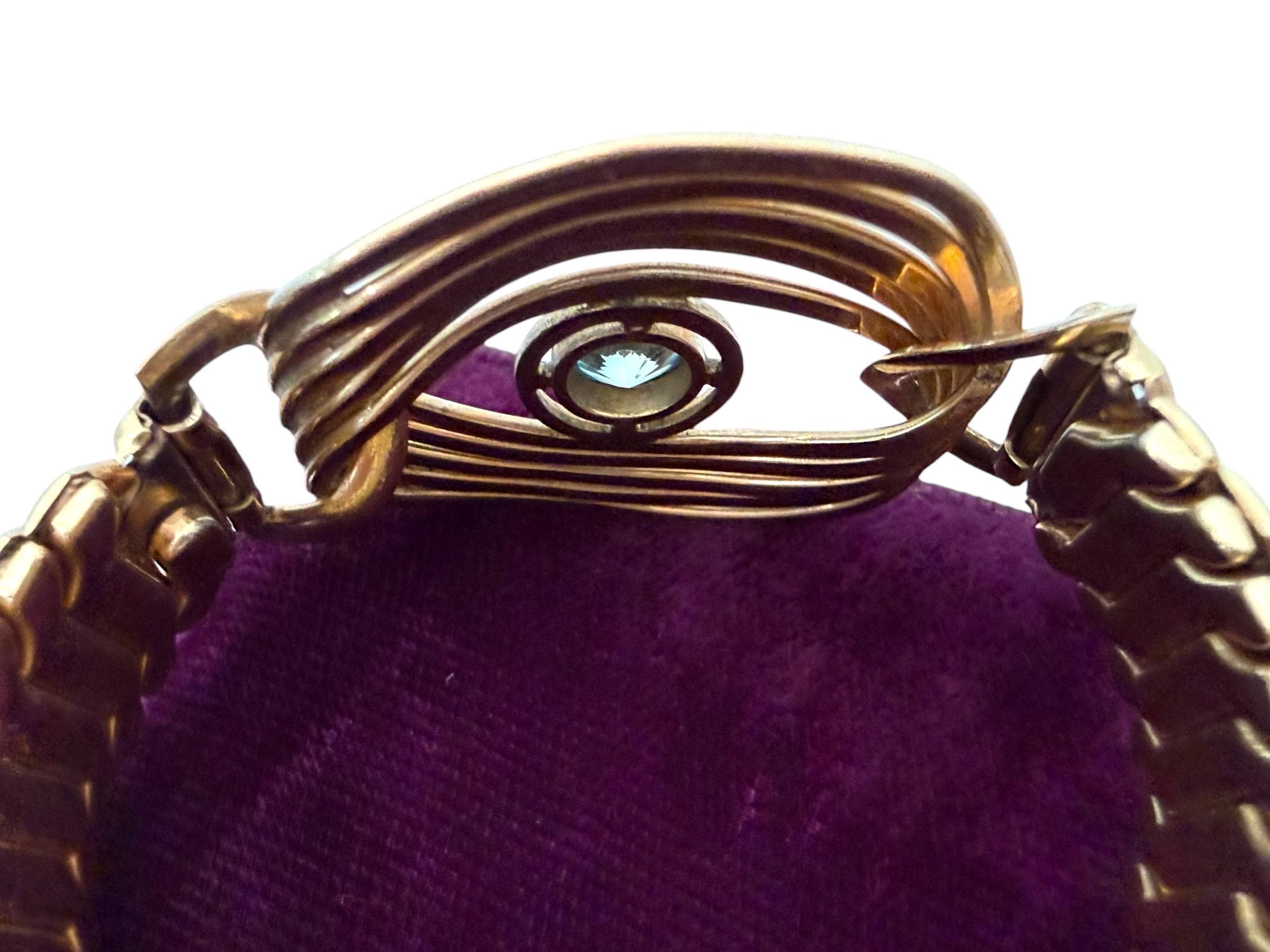 Lovely and striking 12K gold filled and blue topaz expansion bracelet made by Binder Brothers Jewelers. This expansion bracelet is a classic piece of mid century jewelry, and features an oval open design set with a round faceted light blue topaz on the front.