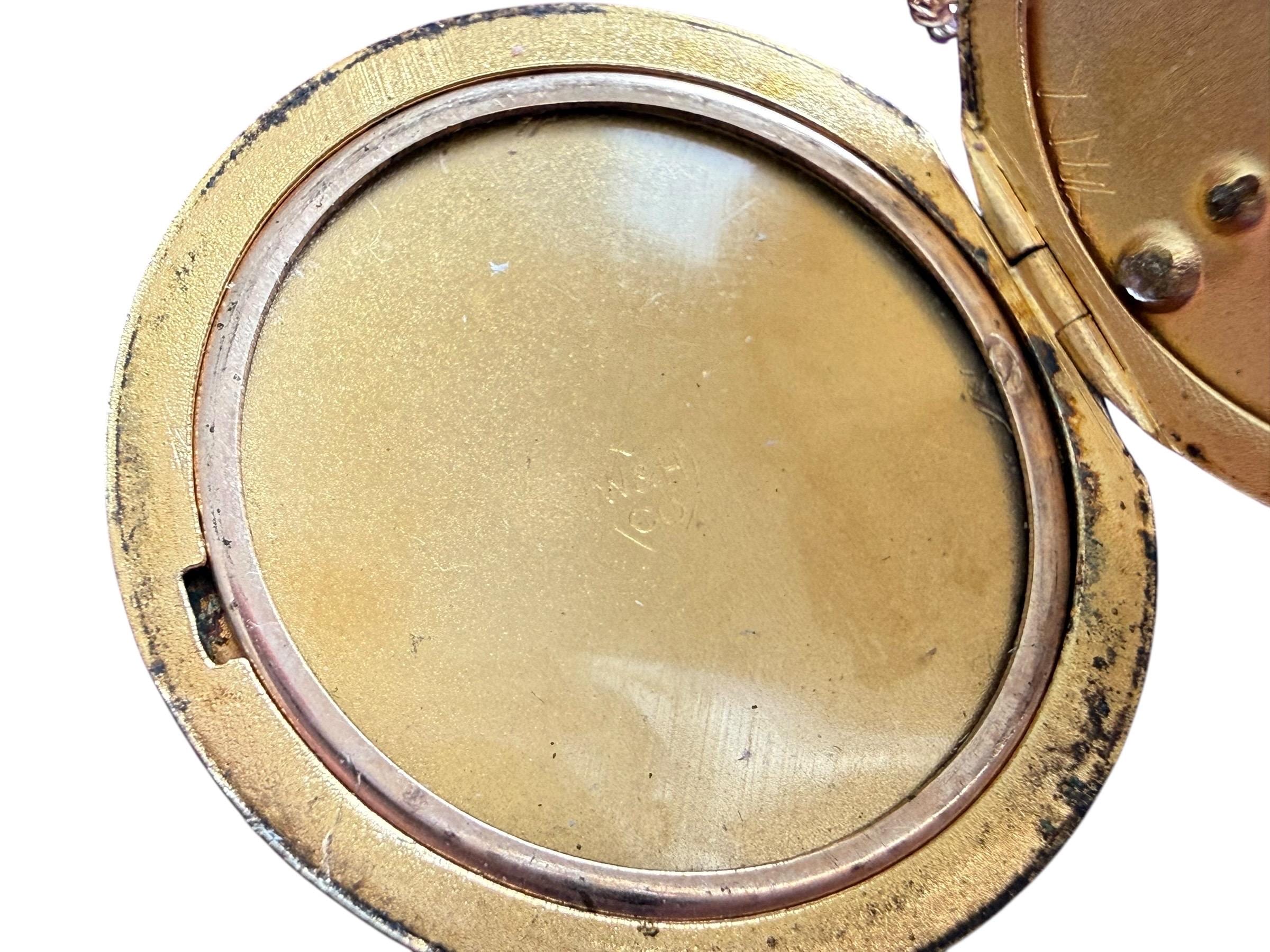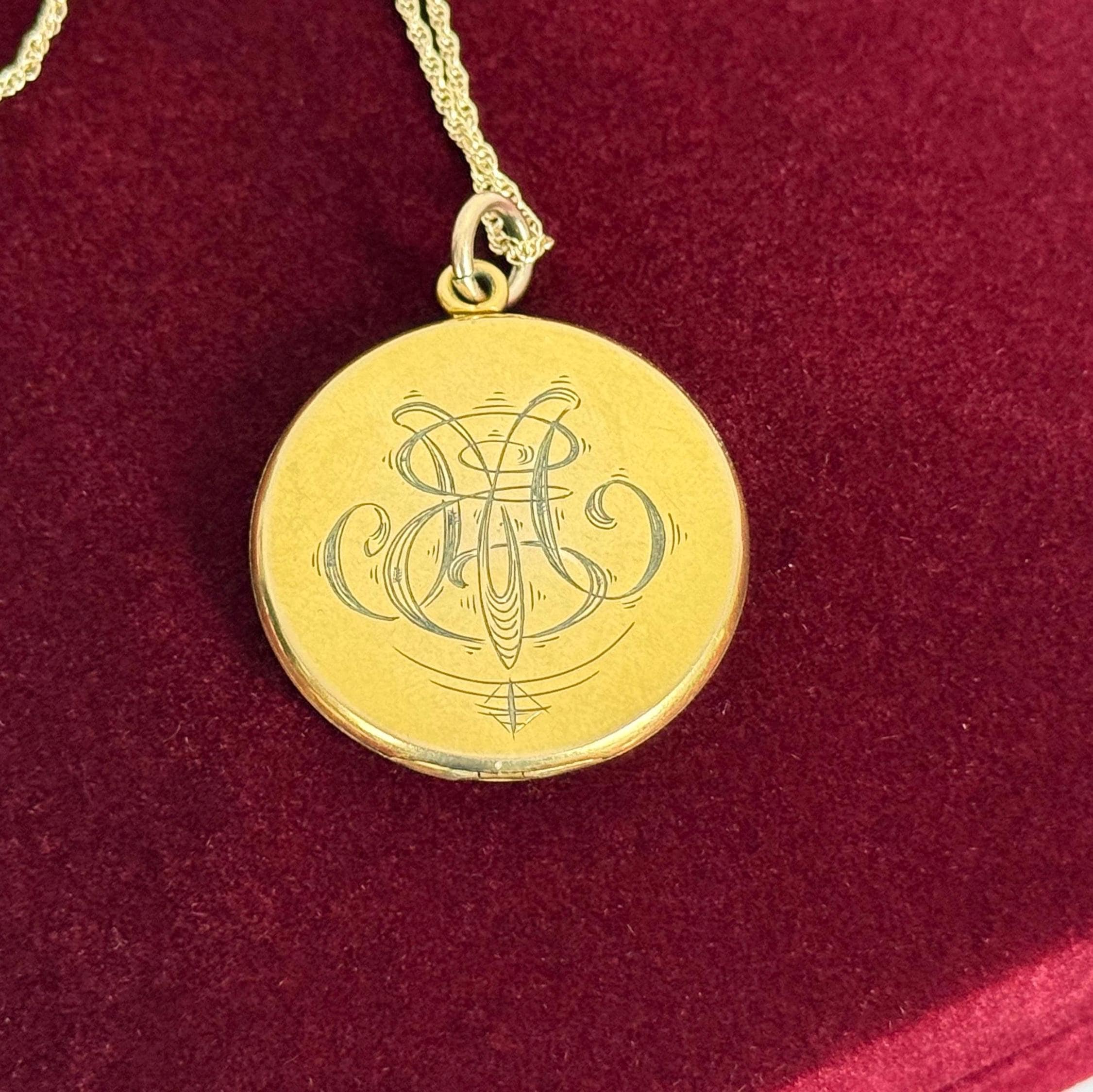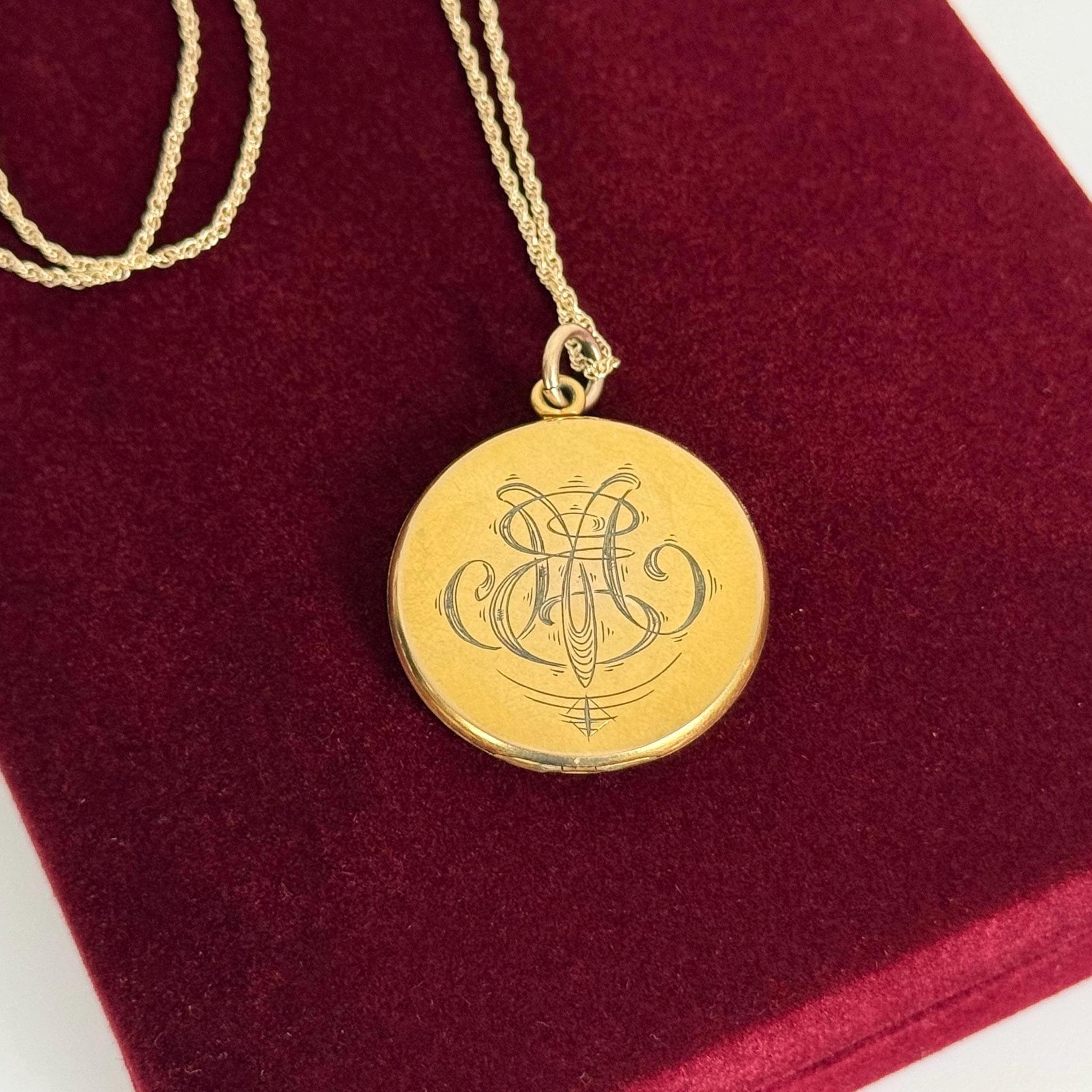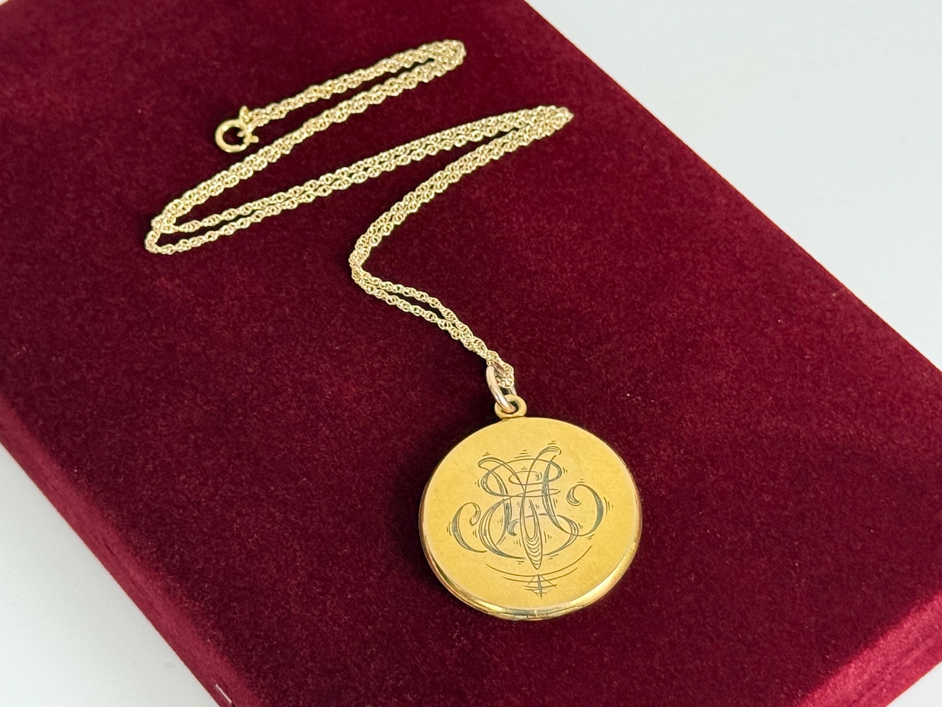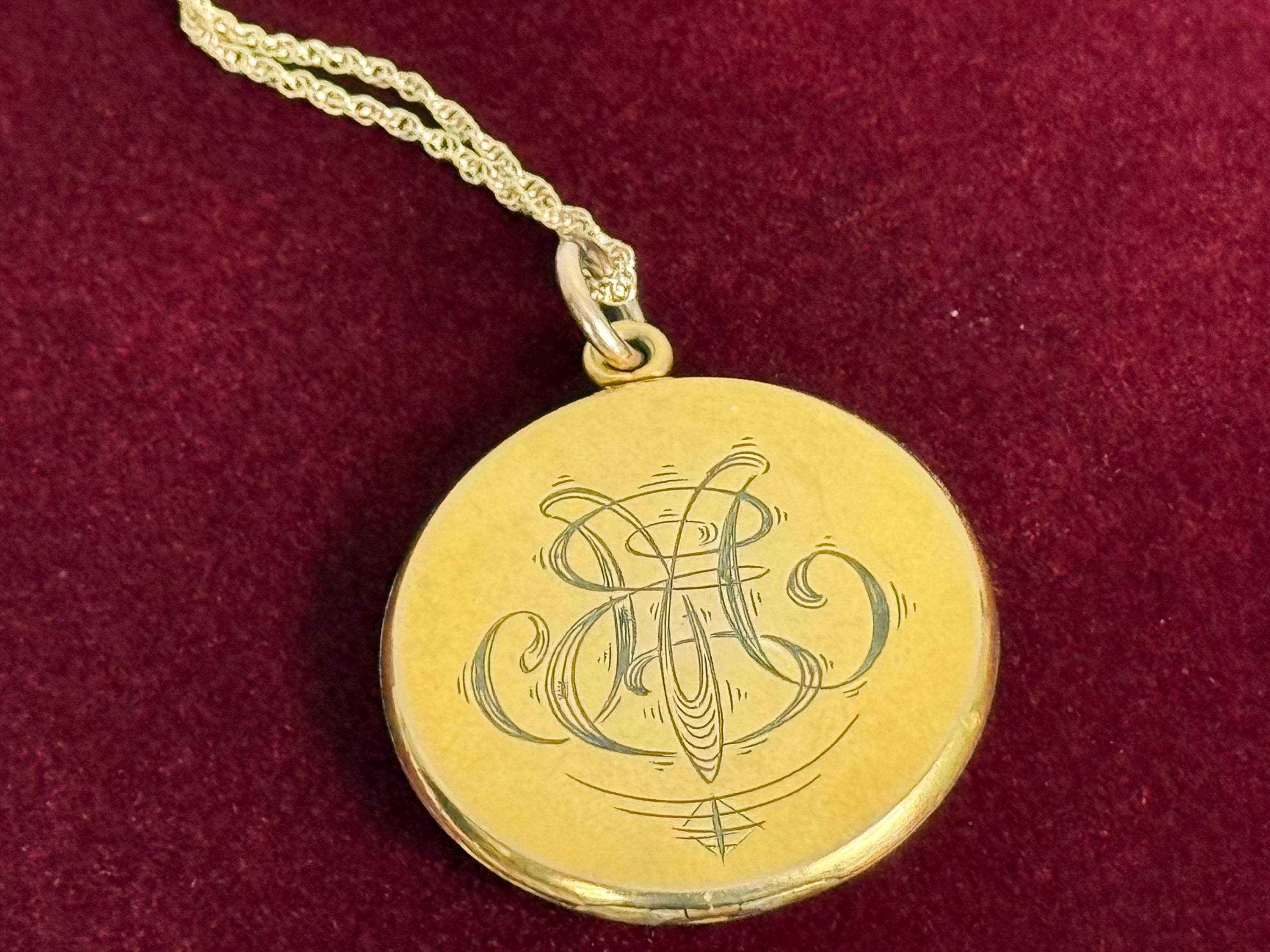 Art Nouveau around Gold Filled Locket: Stylized “M” Initial, 14K GF Chain
