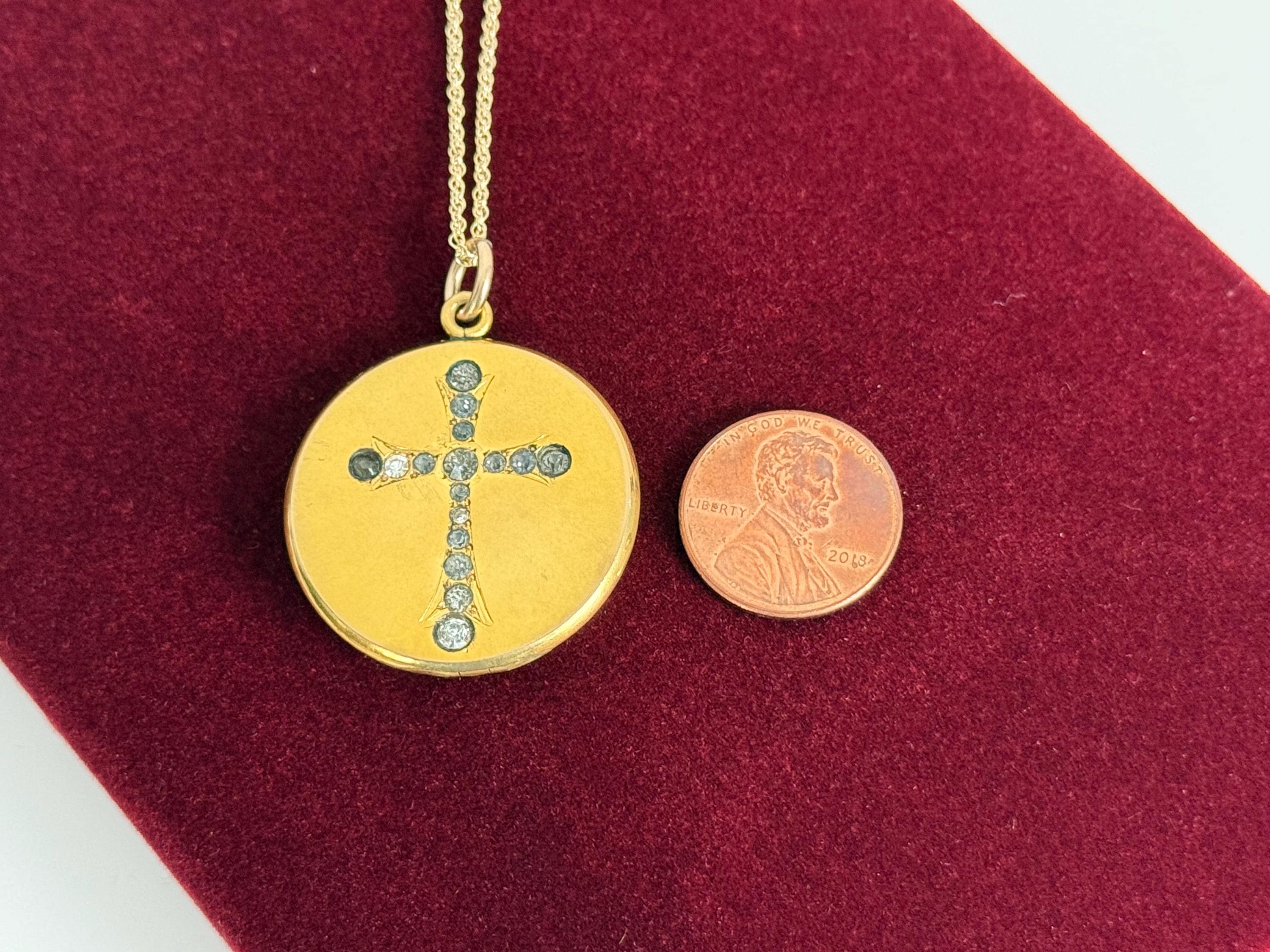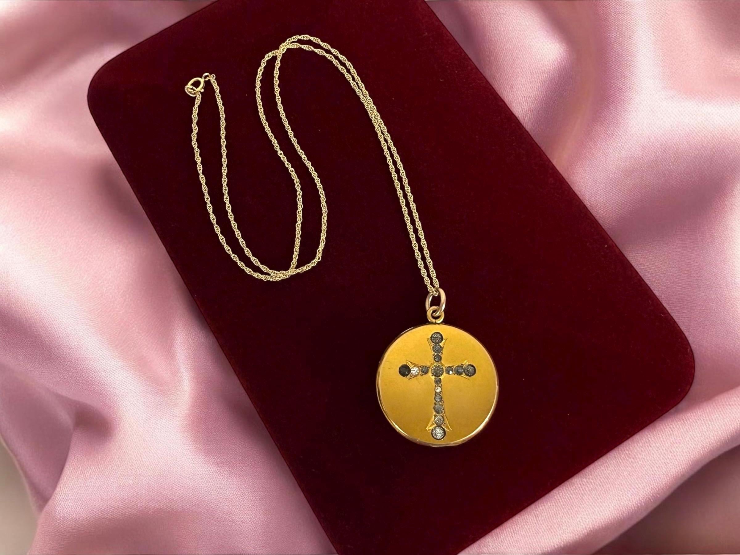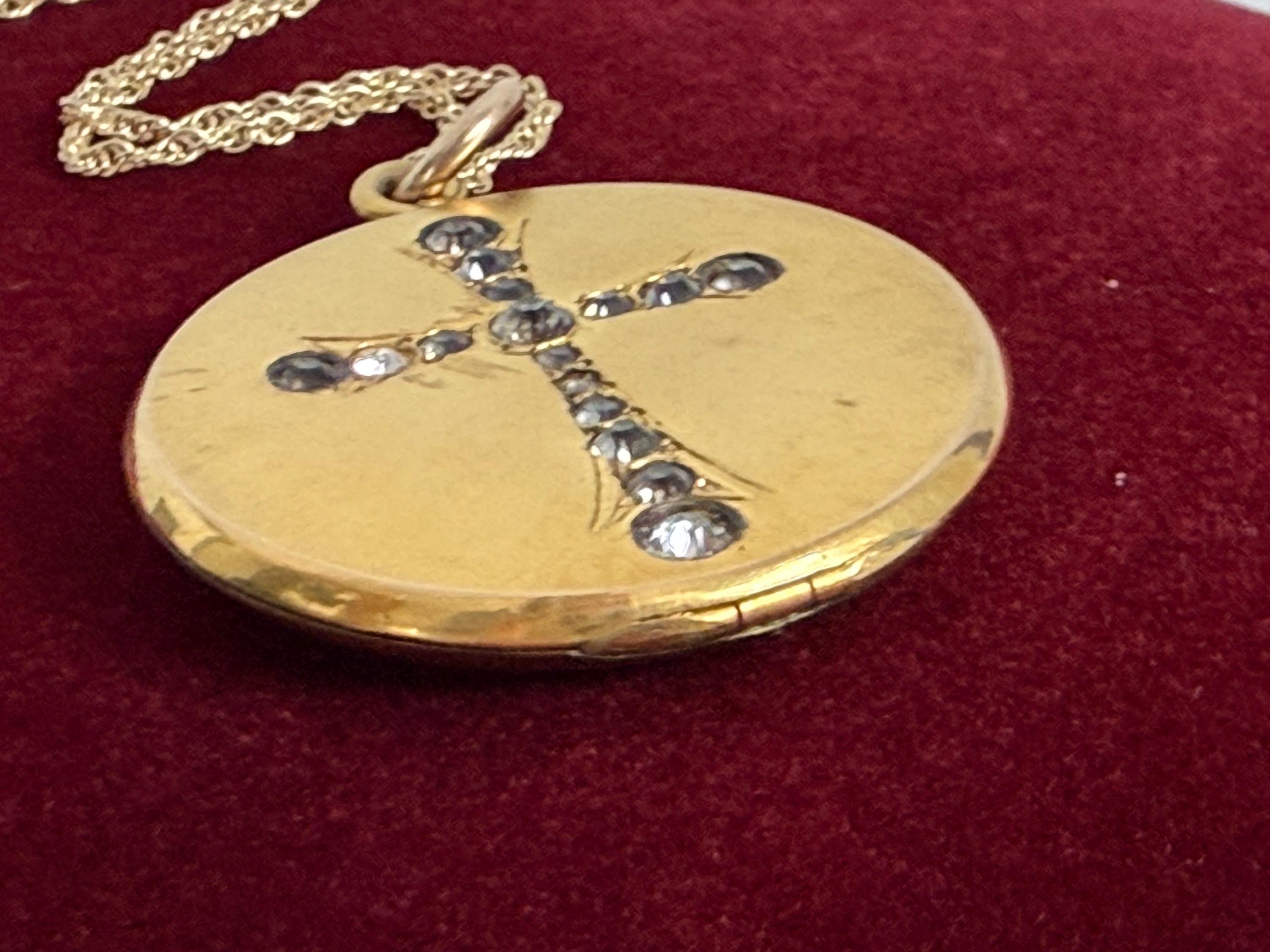 Lovely antique Art Nouveau gold filled round photo locket on a new gold filled chain with a religious theme. Beautiful and ornate, this locket was from the early to mid 1900s. The locket front features a paste studded cross. The cross is set with 16 paste stones. They vary in size as they are graduated from small to a bit larger art the ends, and some have darkened with age - see photos.