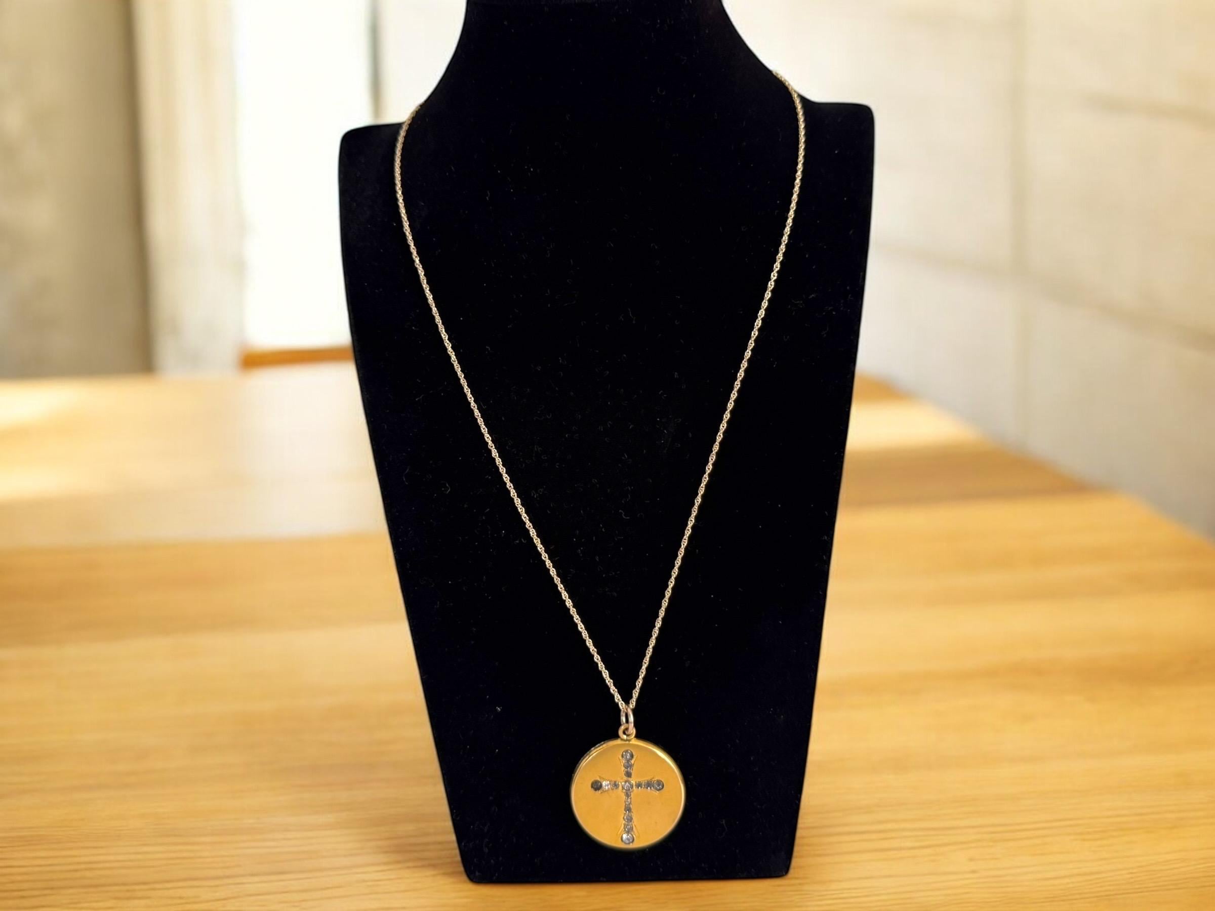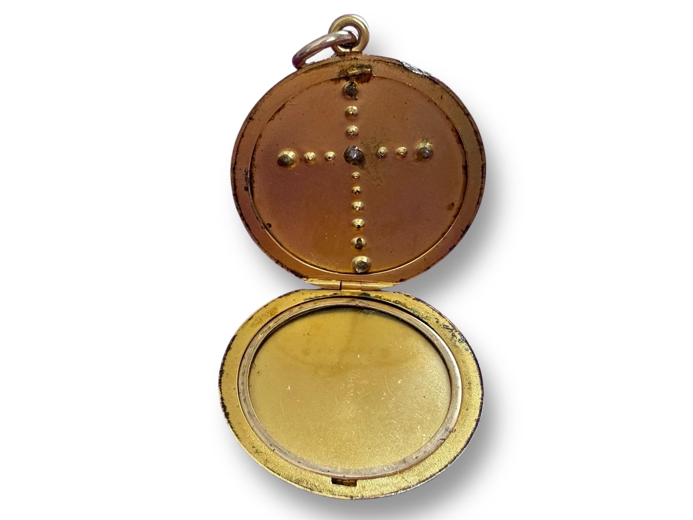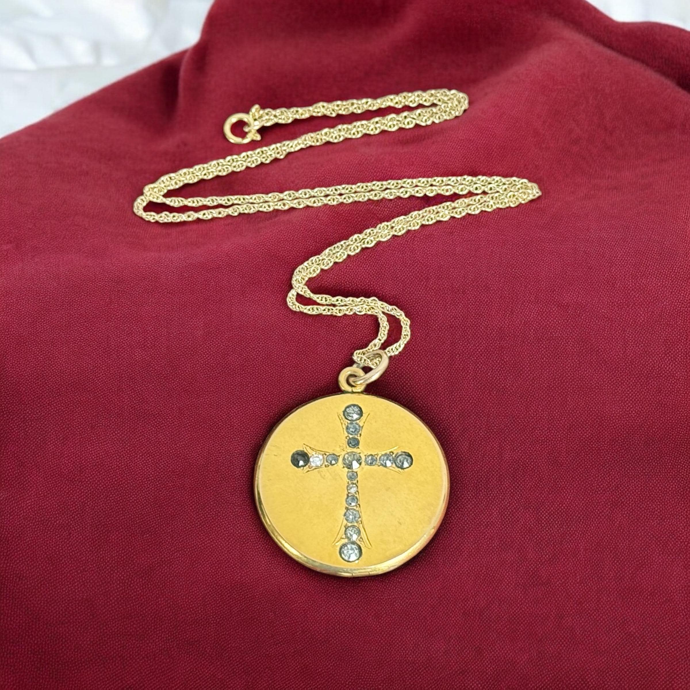 Lovely antique Art Nouveau gold filled round photo locket on a new gold filled chain with a religious theme. Beautiful and ornate, this locket was from the early to mid 1900s. The locket front features a paste studded cross. The cross is set with 16 paste stones. They vary in size as they are graduated from small to a bit larger art the ends, and some have darkened with age - see photos.