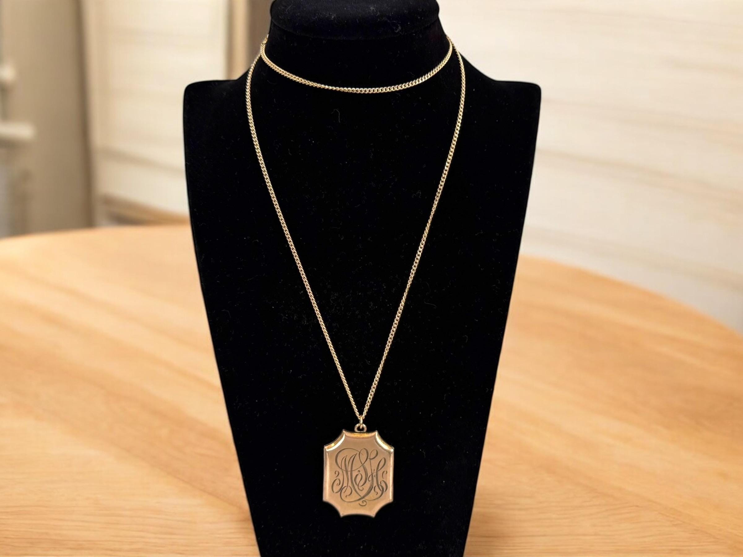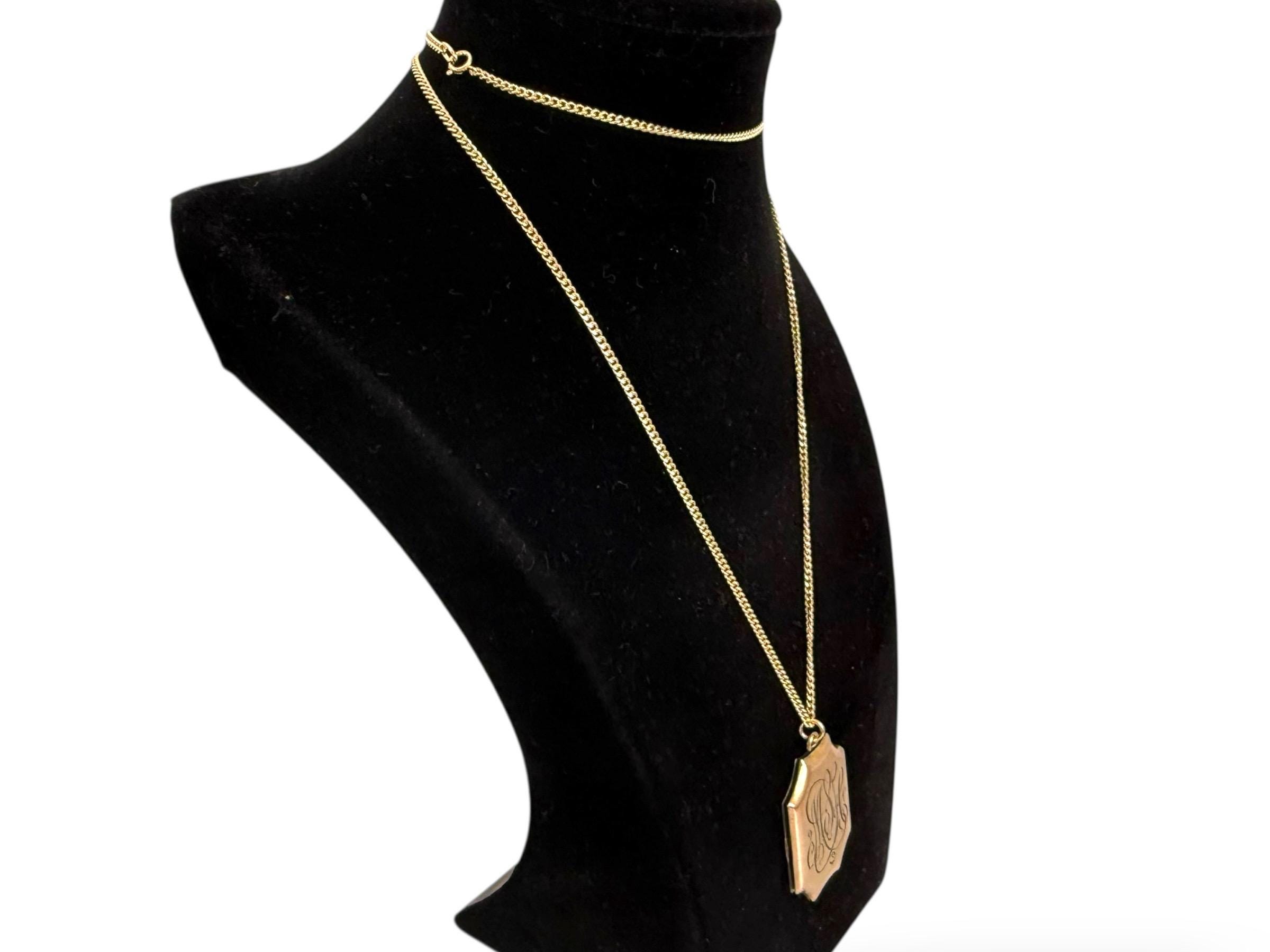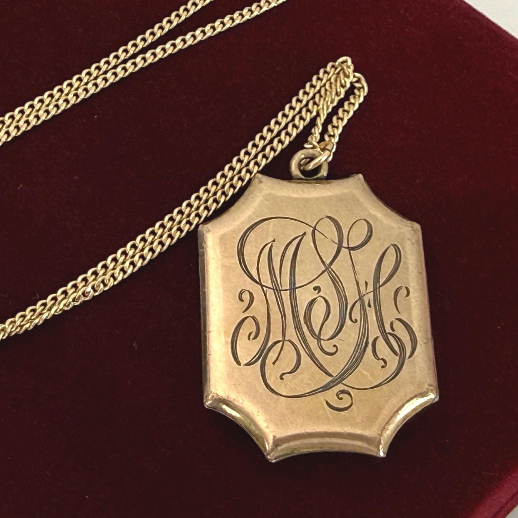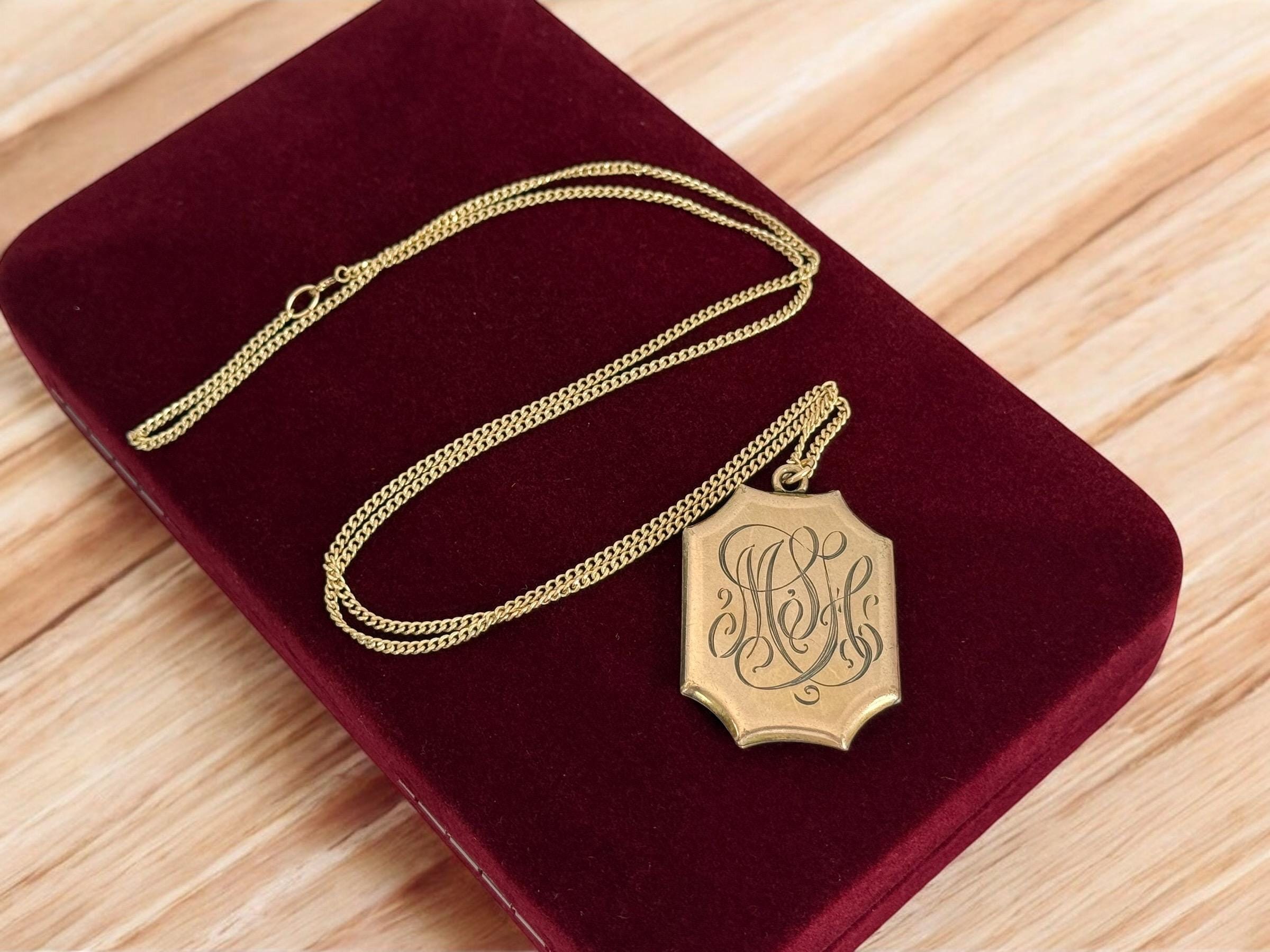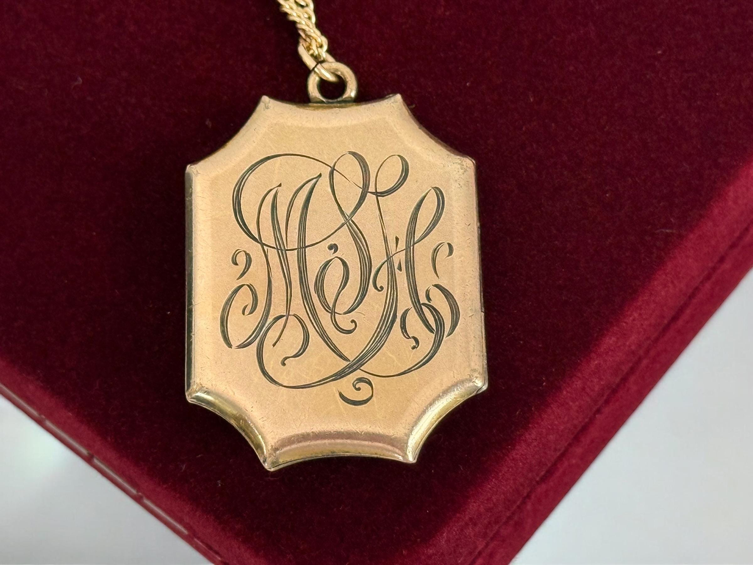 A vintage and uniquely shaped Gold Filled rectangular 8 sided locket that hangs from a new 14K gold filled chain that its 26" long. The shape is a scalloped rectangular one. The front of this locket features a subtly etched fleur de lis in the center. Around it is a very light and almost indescribable design around it. The back of the locket has an engraved monogram with initials (MSH or MLH) in an old cursive font. The locket closes securely with a snap. The locket was made by the SKM Company manufactured jewelry from 1871-1915.