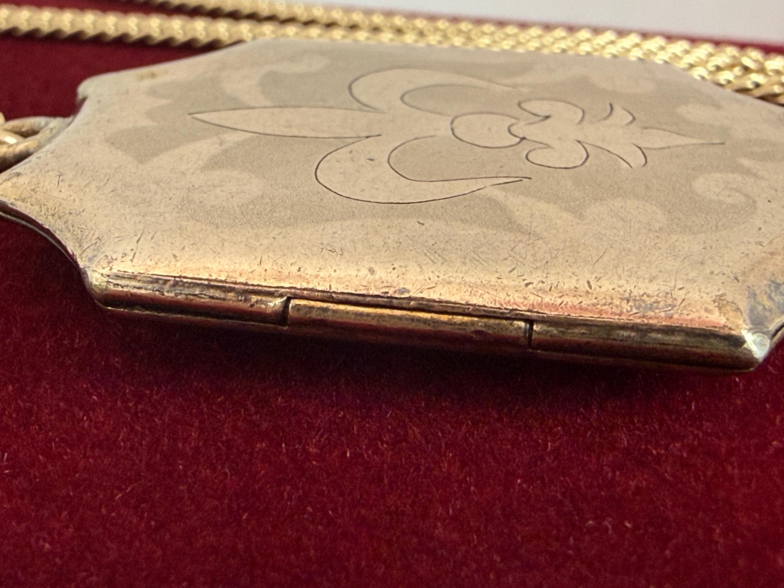 In fair to nice antique condition with wear and patina inside as would be expected with an item of this age - early 1900s. The fleur de lis design on the front center is faint, and the outer section that frames this fleur de lis is very, very faded. Some small dents on the front of the locket at the bottom right. The side with the monogram is in good condition. Generally there is light wear all over - see photos for details.