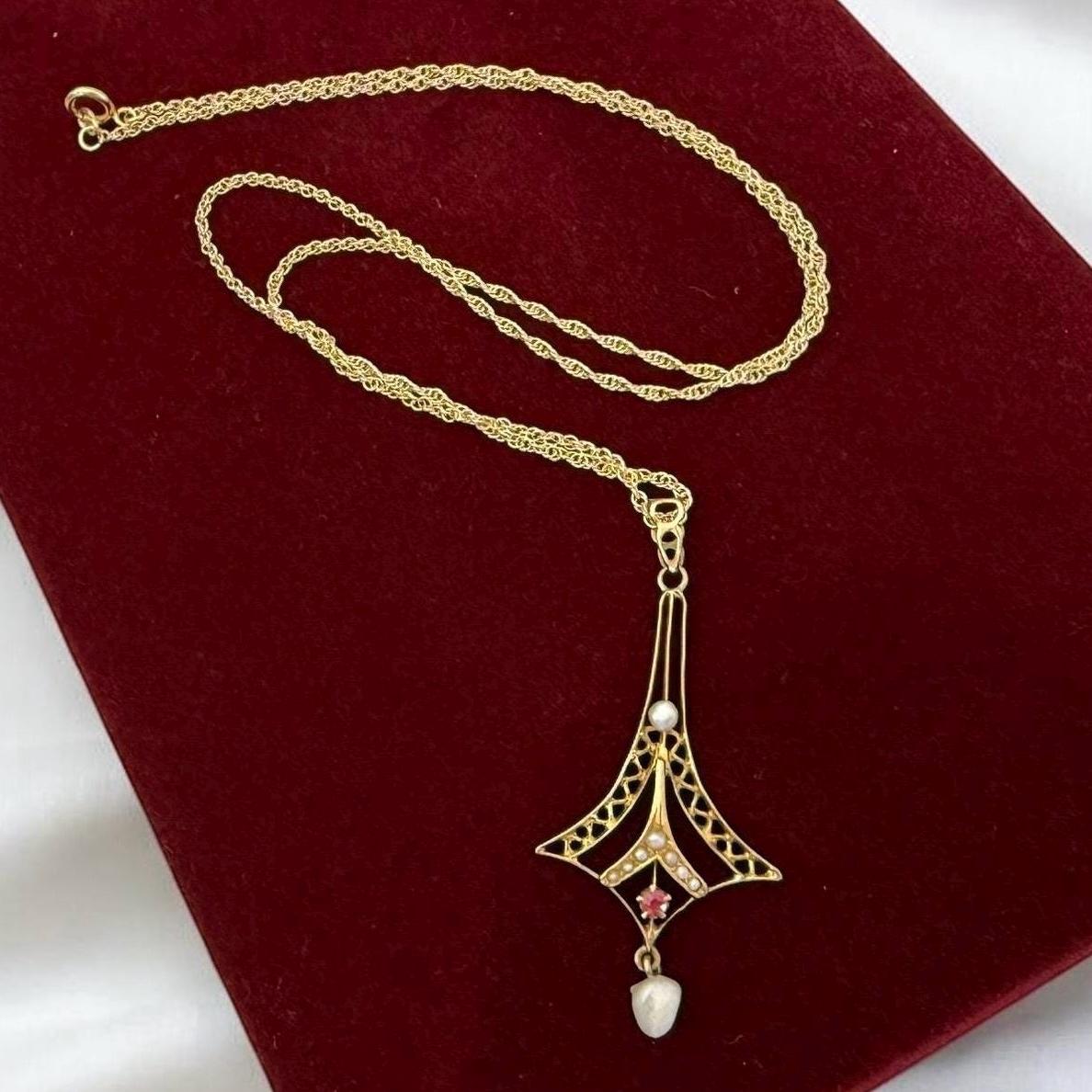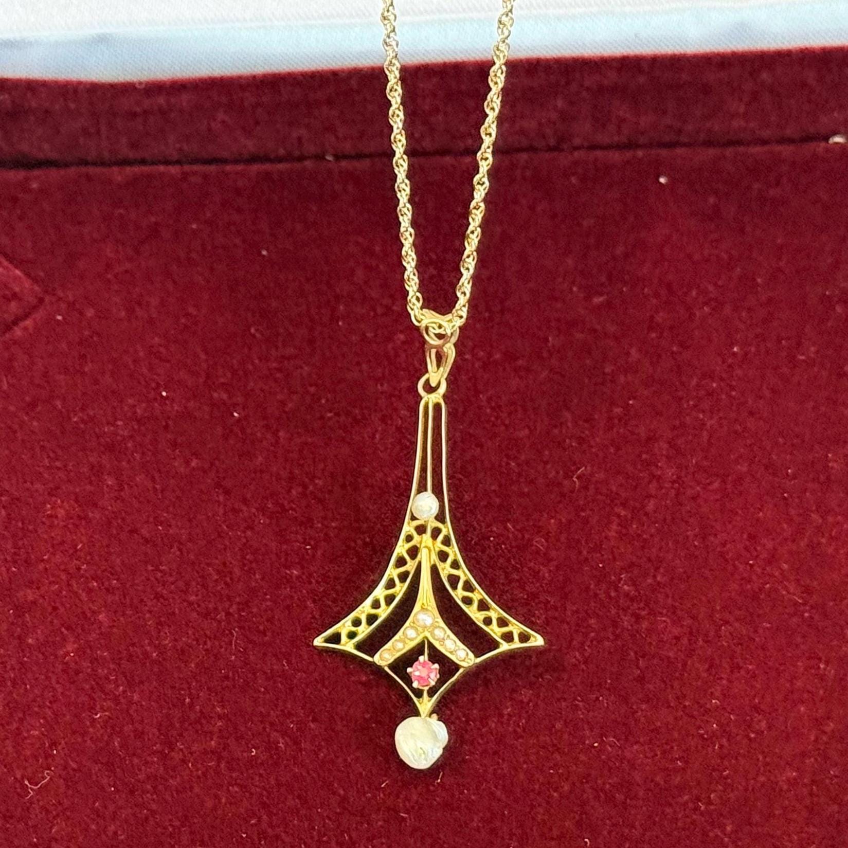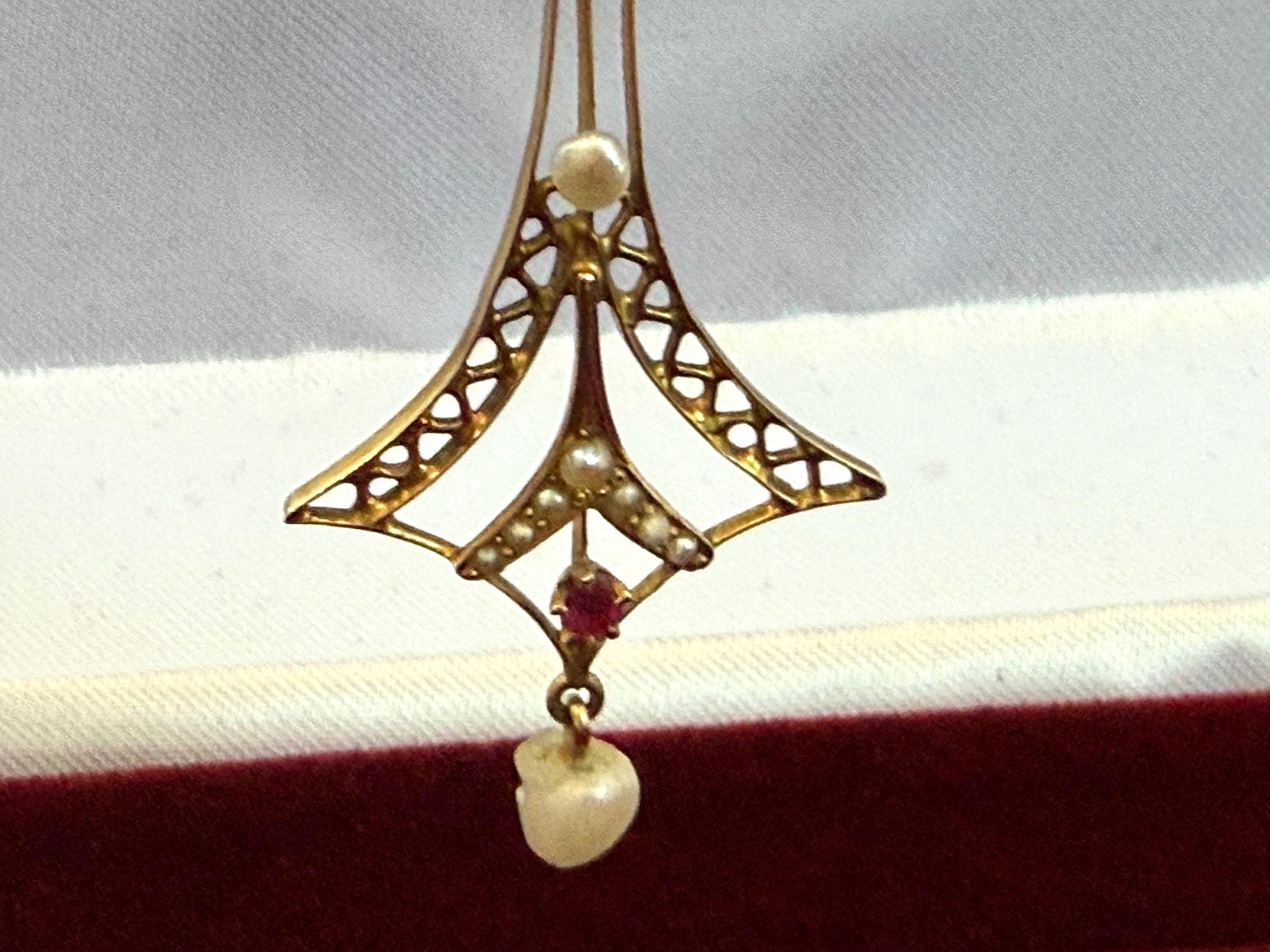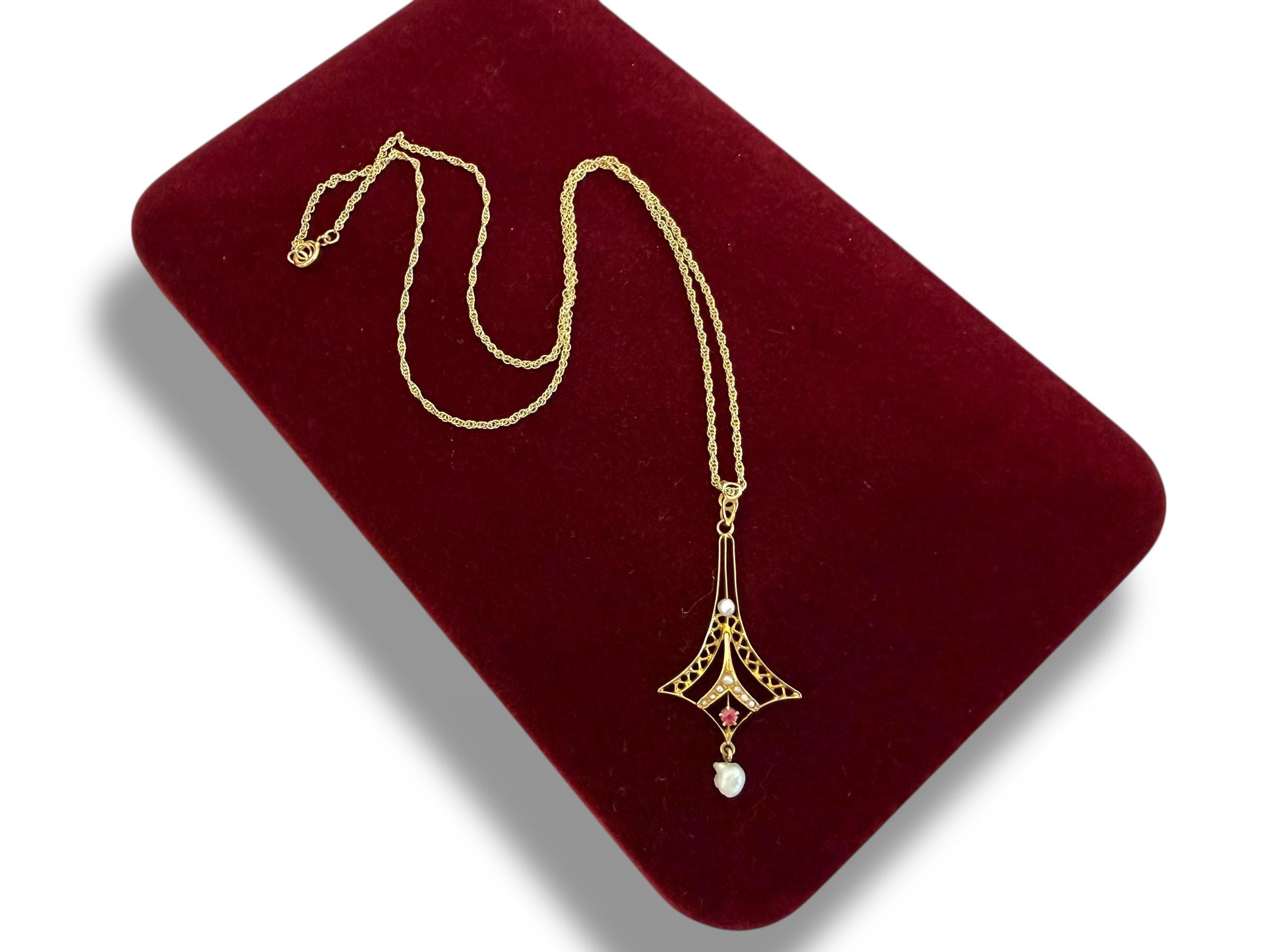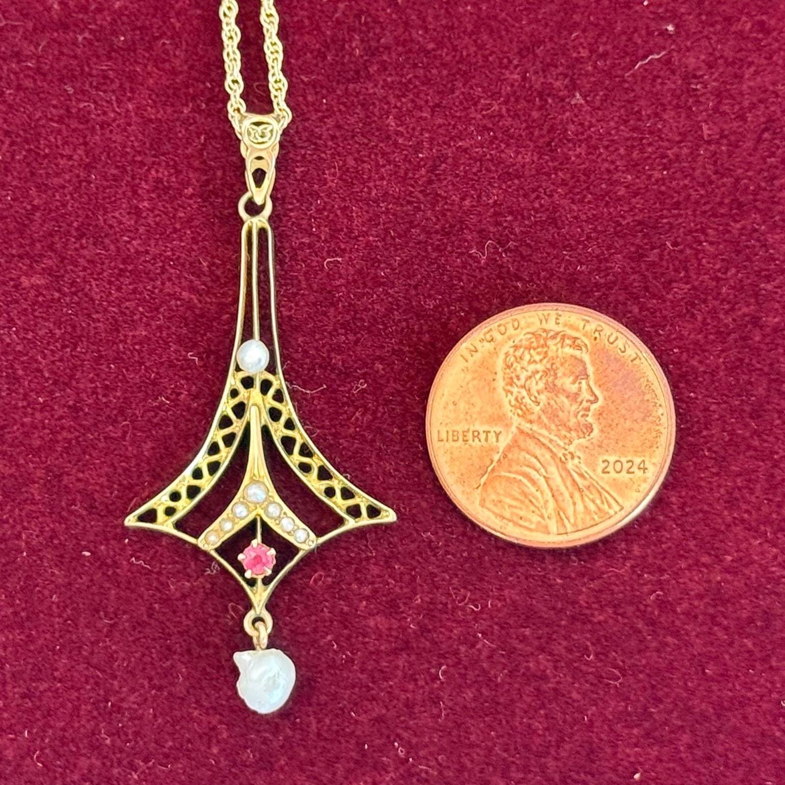 Edwardian 10K Gold Lavaliere Pendant – Red Paste Gem, Seed Pearl, Baroque Pearl