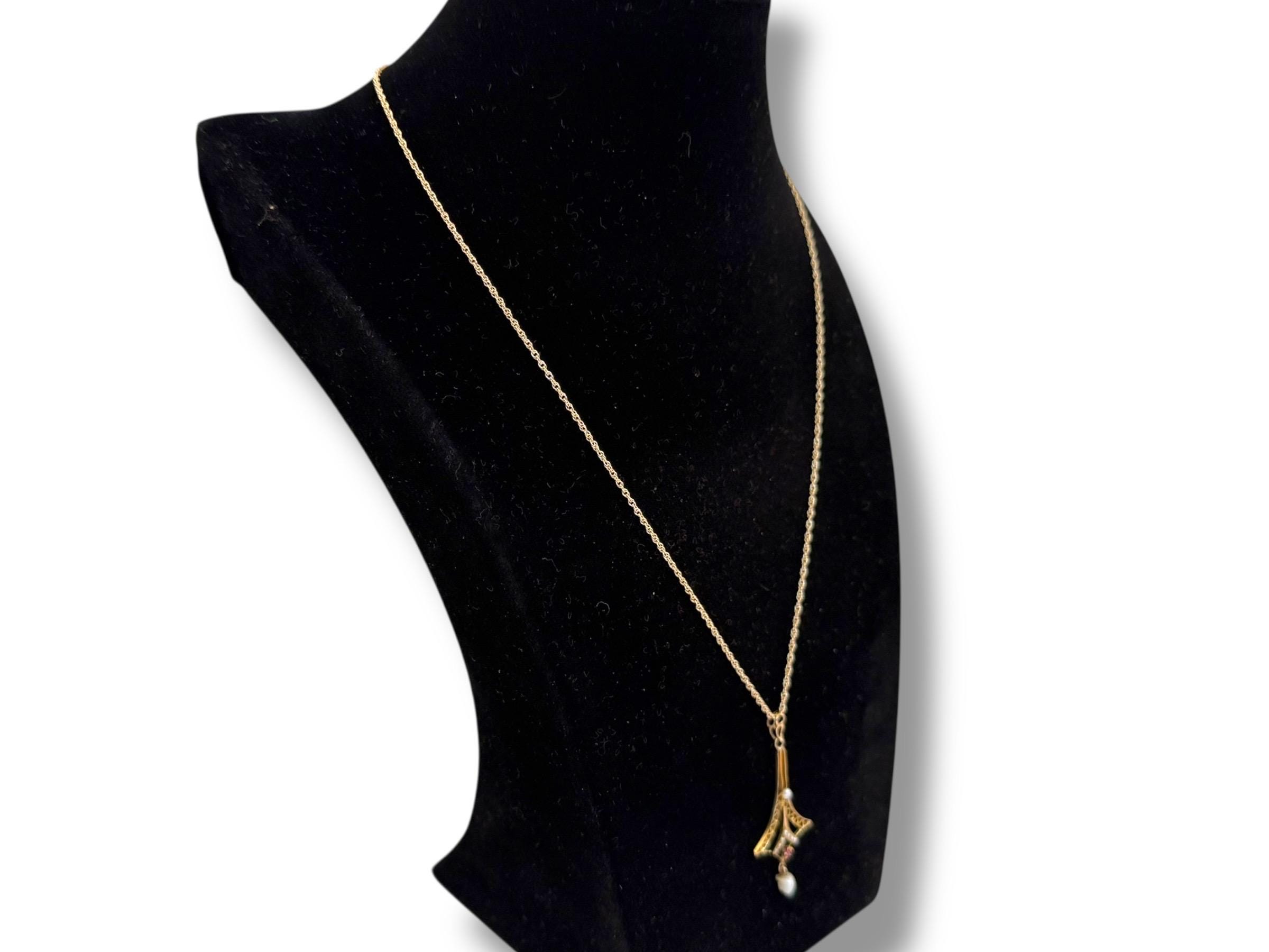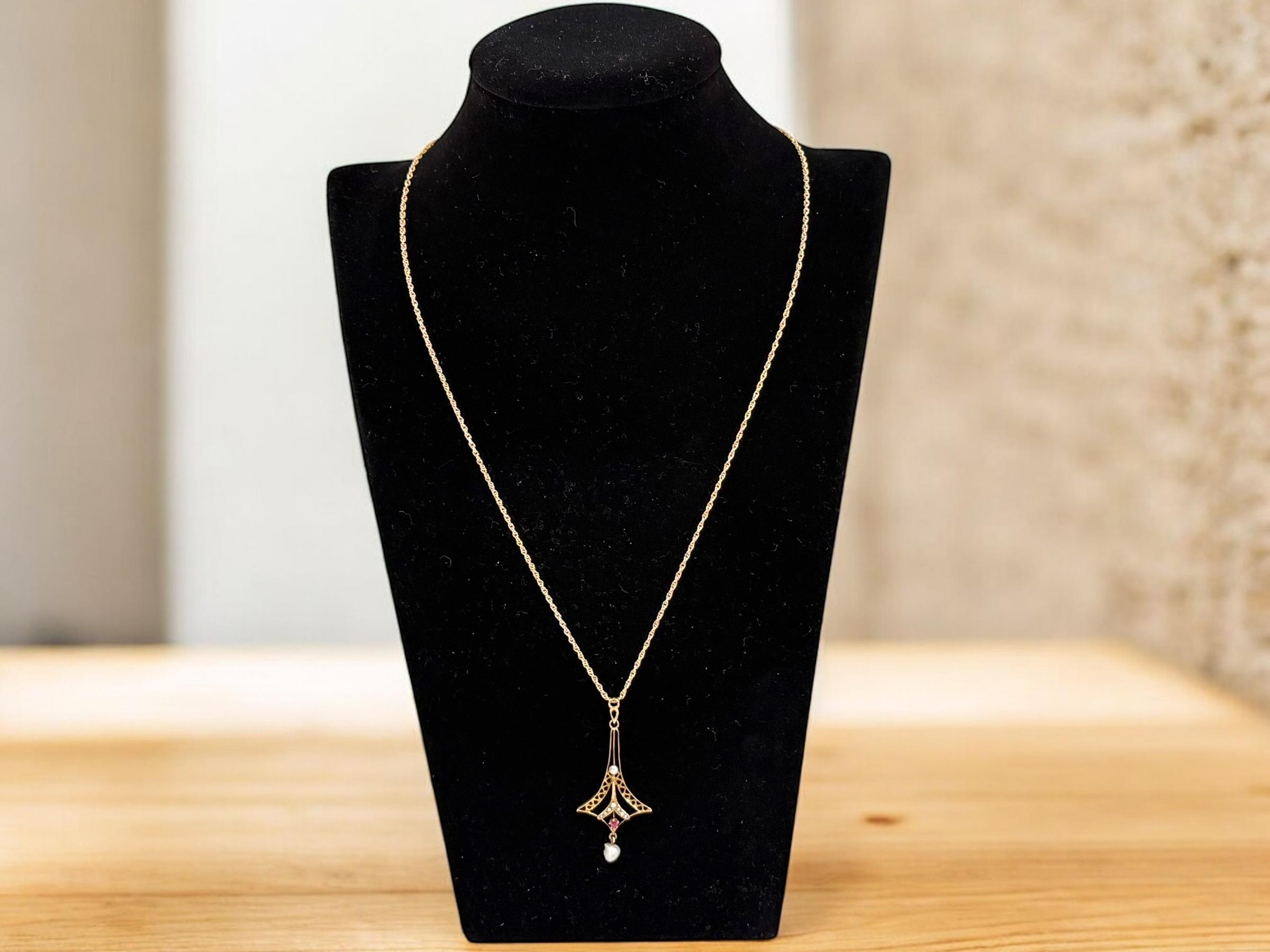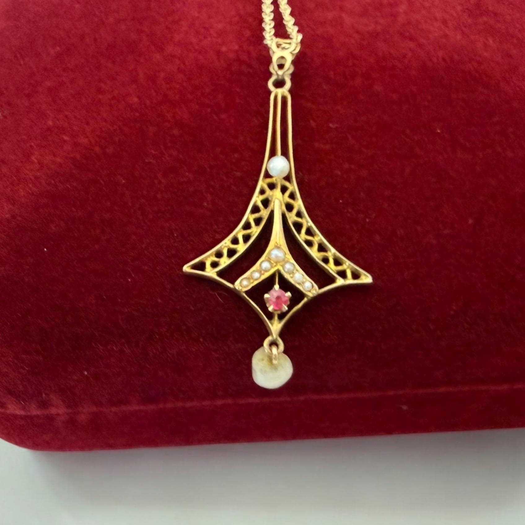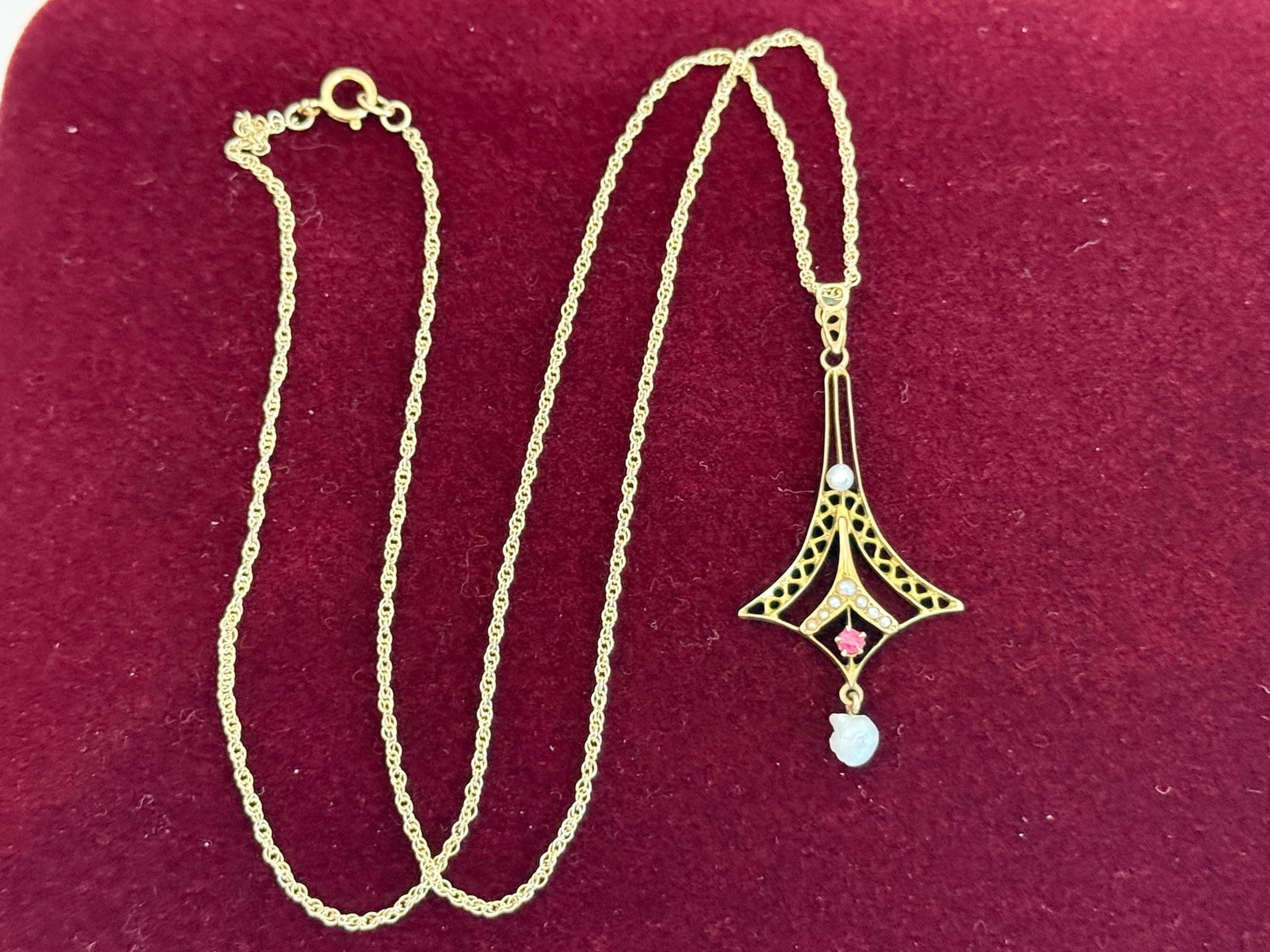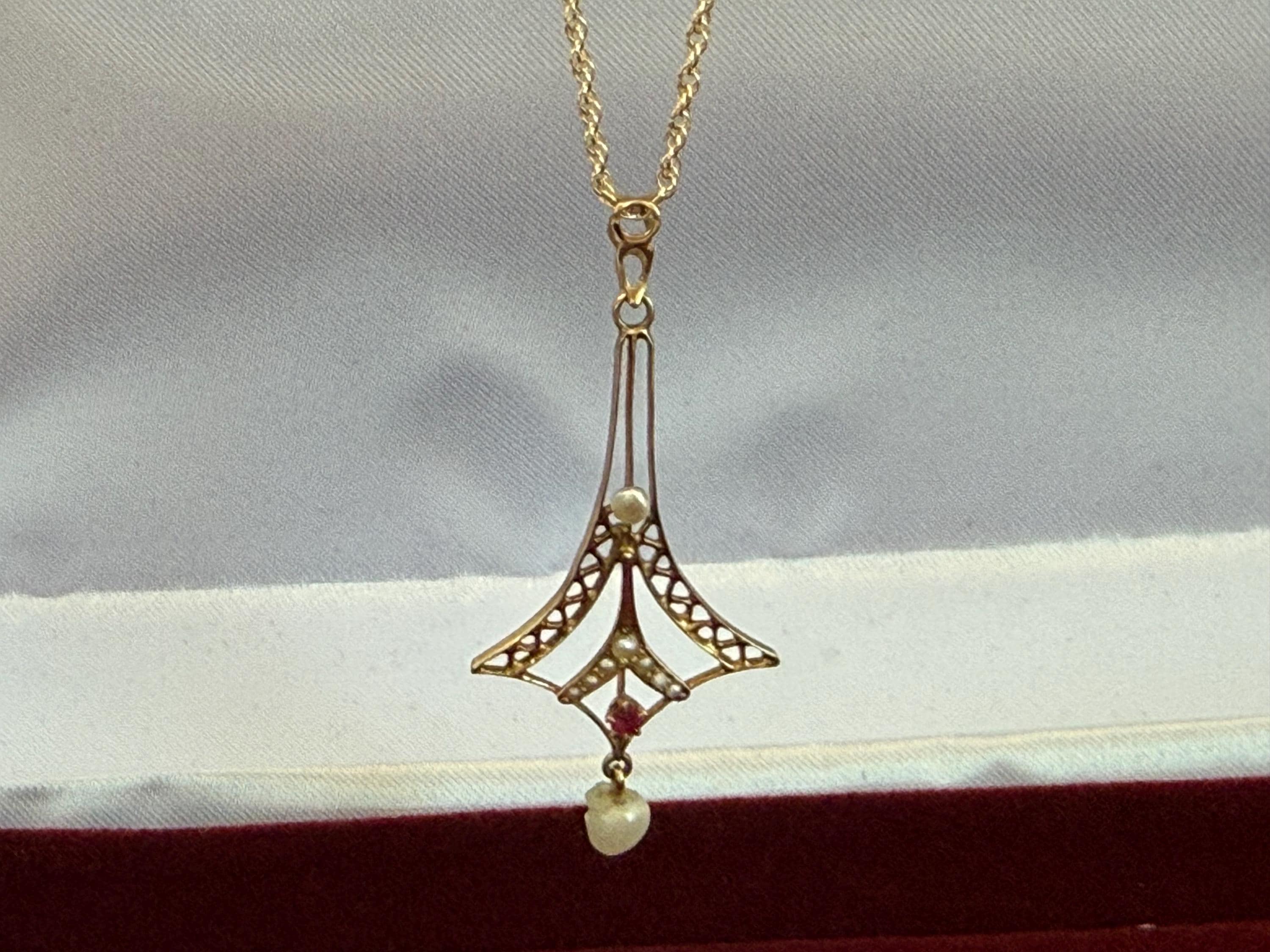 Edwardian 10K Gold Lavaliere Pendant – Red Paste Gem, Seed Pearl, Baroque Pearl
