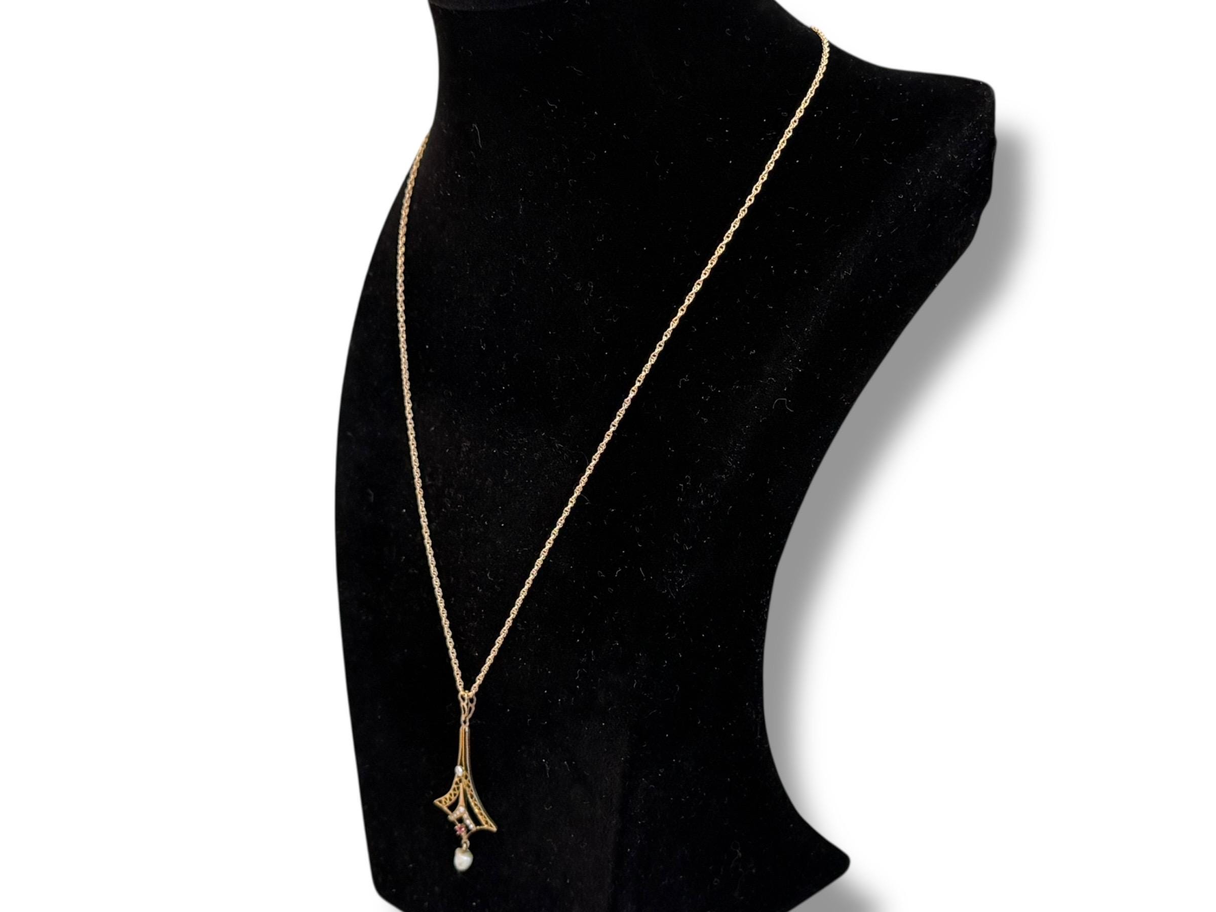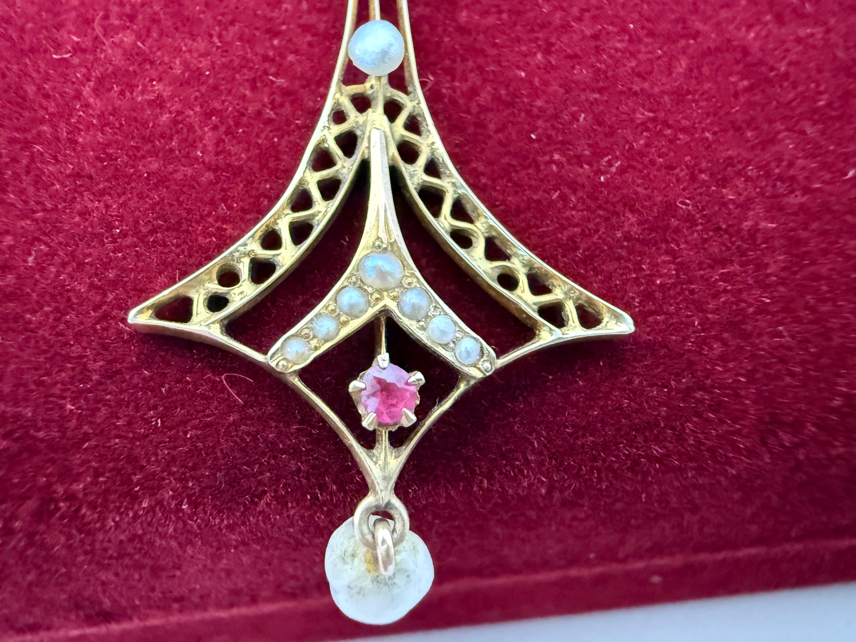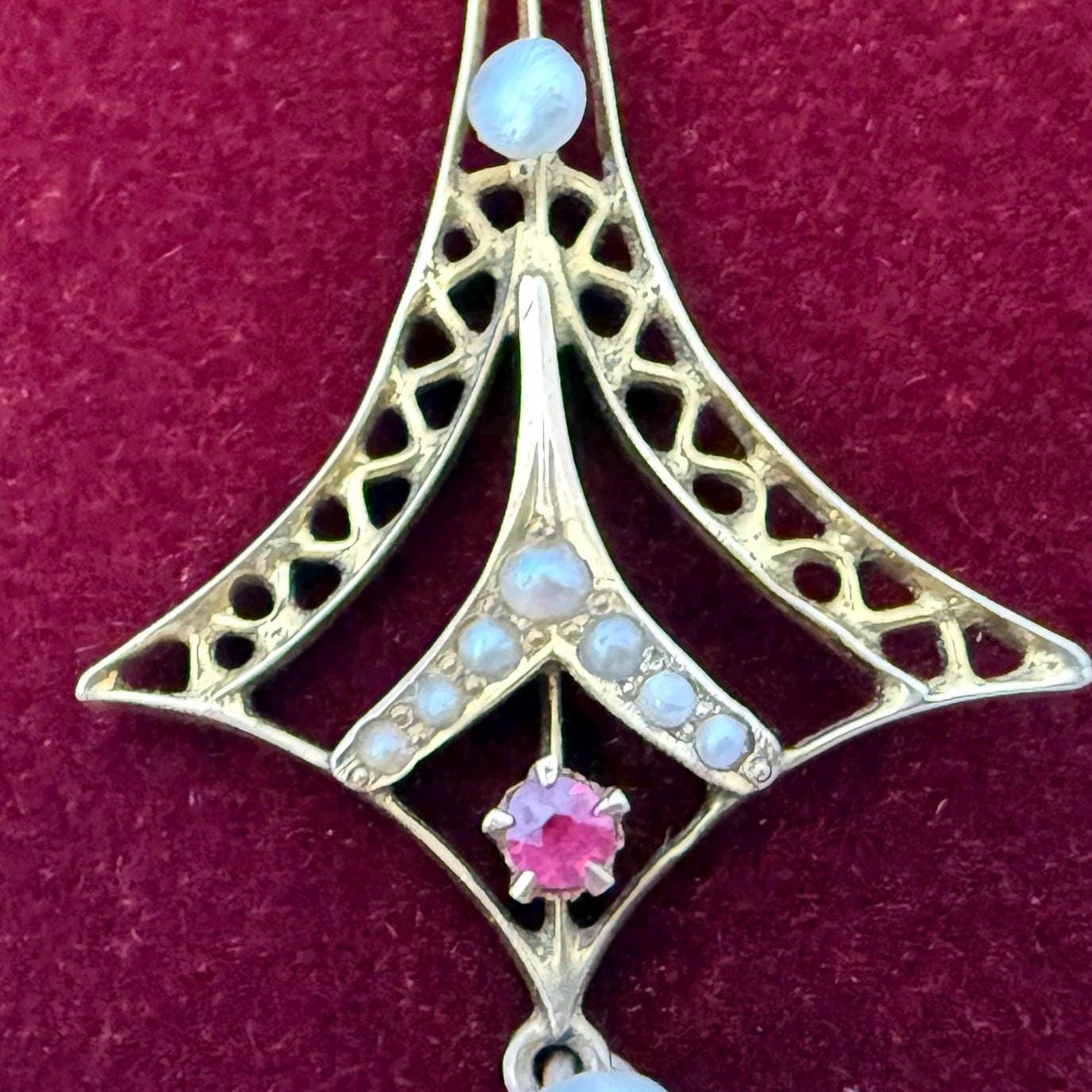 This feminine pendant features a round faceted reddish pink glass gem that is prong sett in its center. There is an inverted V shaped piece above the round faceted paste gem that is set with 7 small seed pearls. There is also a pearl set above it and one dangling baroque pearl at the bottom. The lovely design surrounded by an intricate openwork frame. This Edwardian Era piece is very fine and lightweight - very feminine.