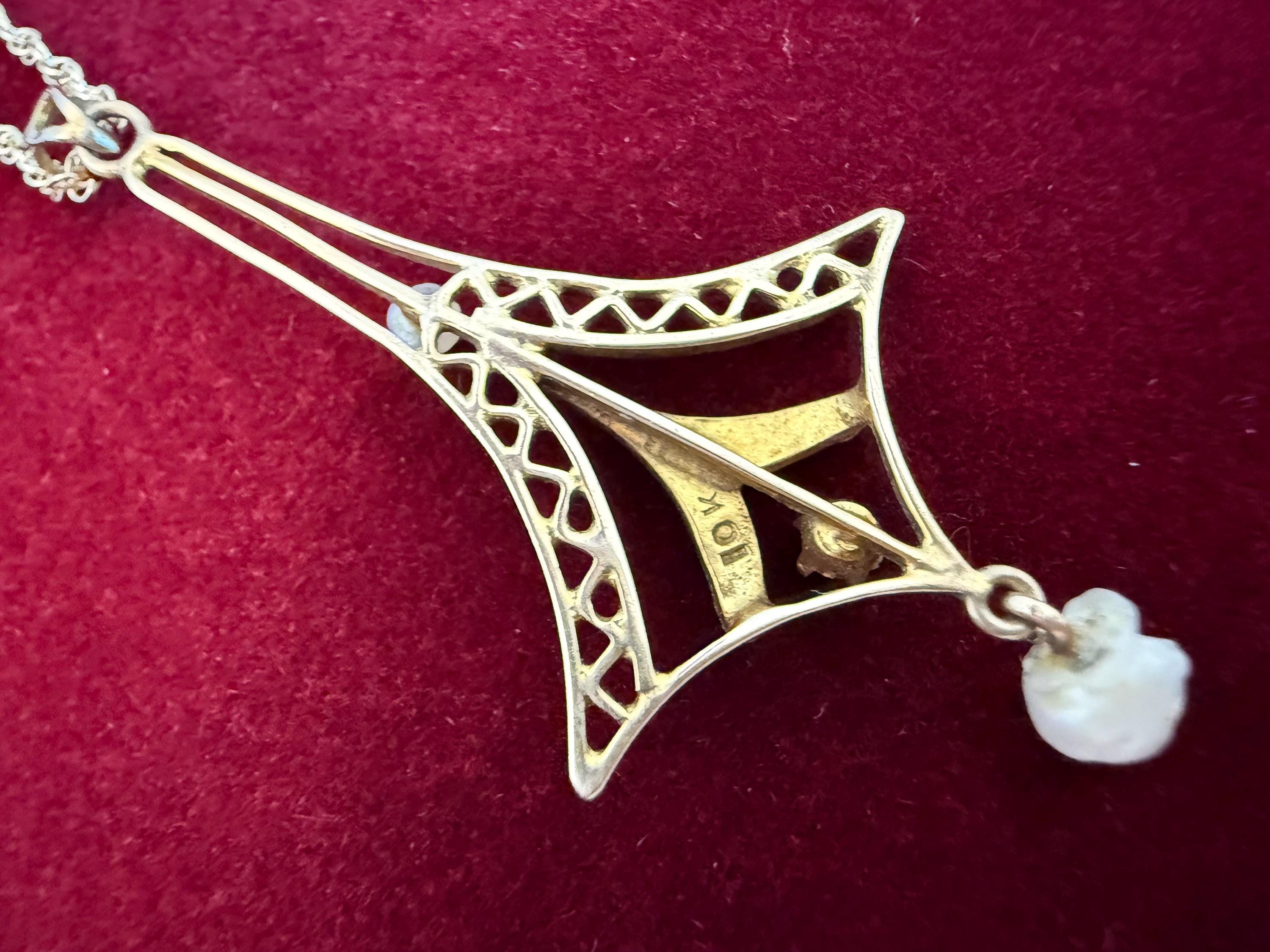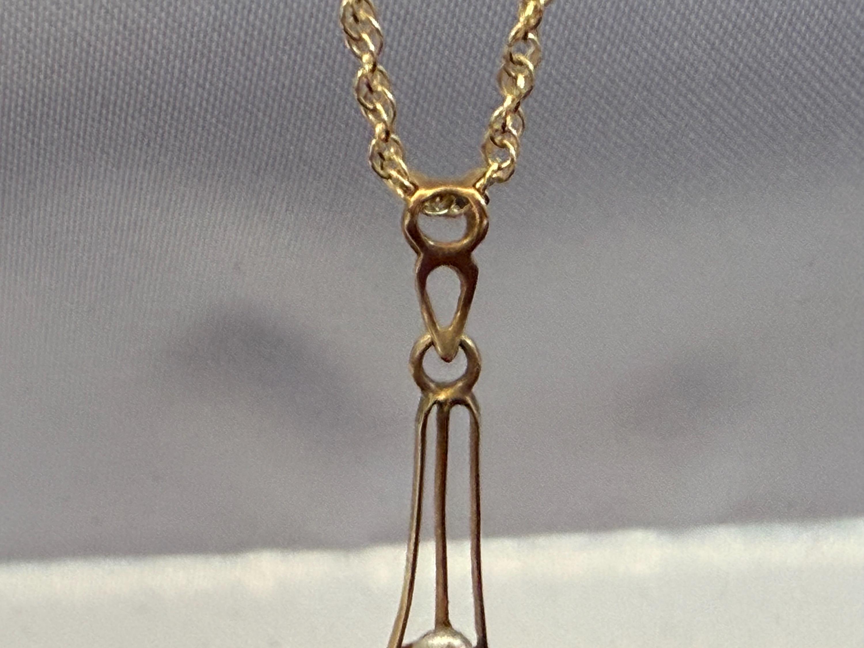 An antique and very dainty 10K gold lavaliere pendant on a new 14K yellow gold filled chain. The 10K gold pendant can be purchased with or without the gold filled chain.