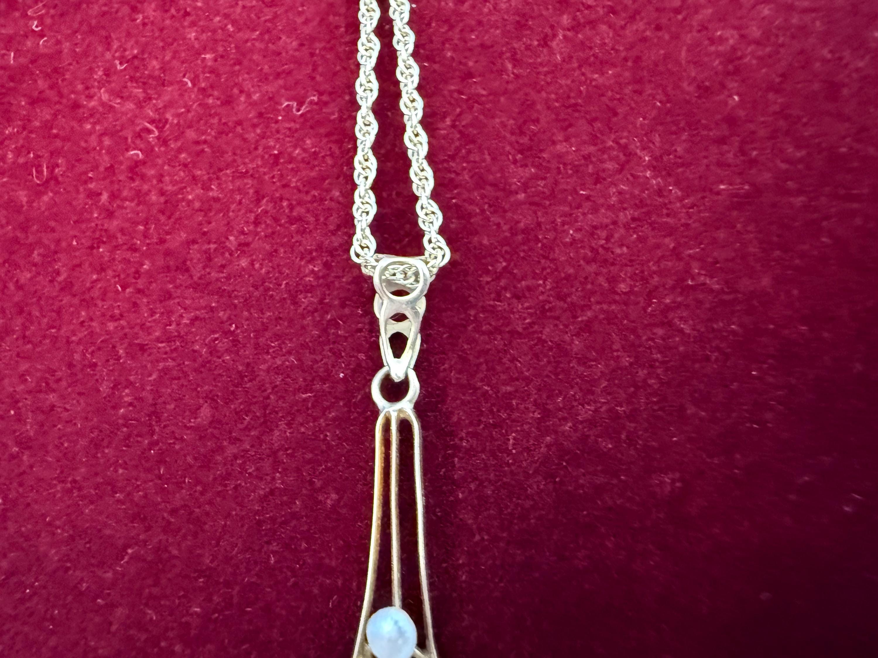 The 10K gold pendant is in nice antique condition with wear commensurate with antique age. Two of the seed pearls have been replaced. The chain is new and in good condition.