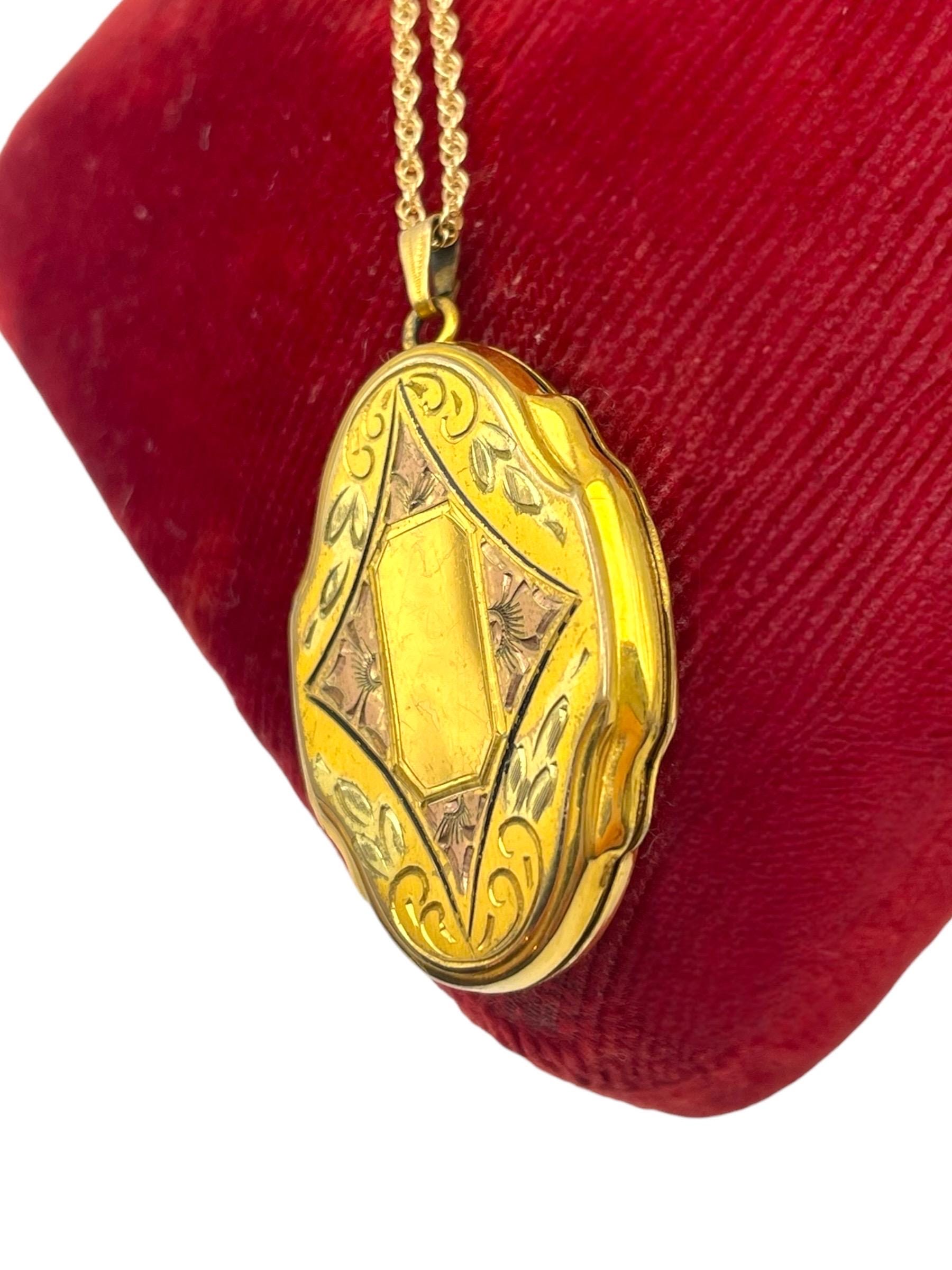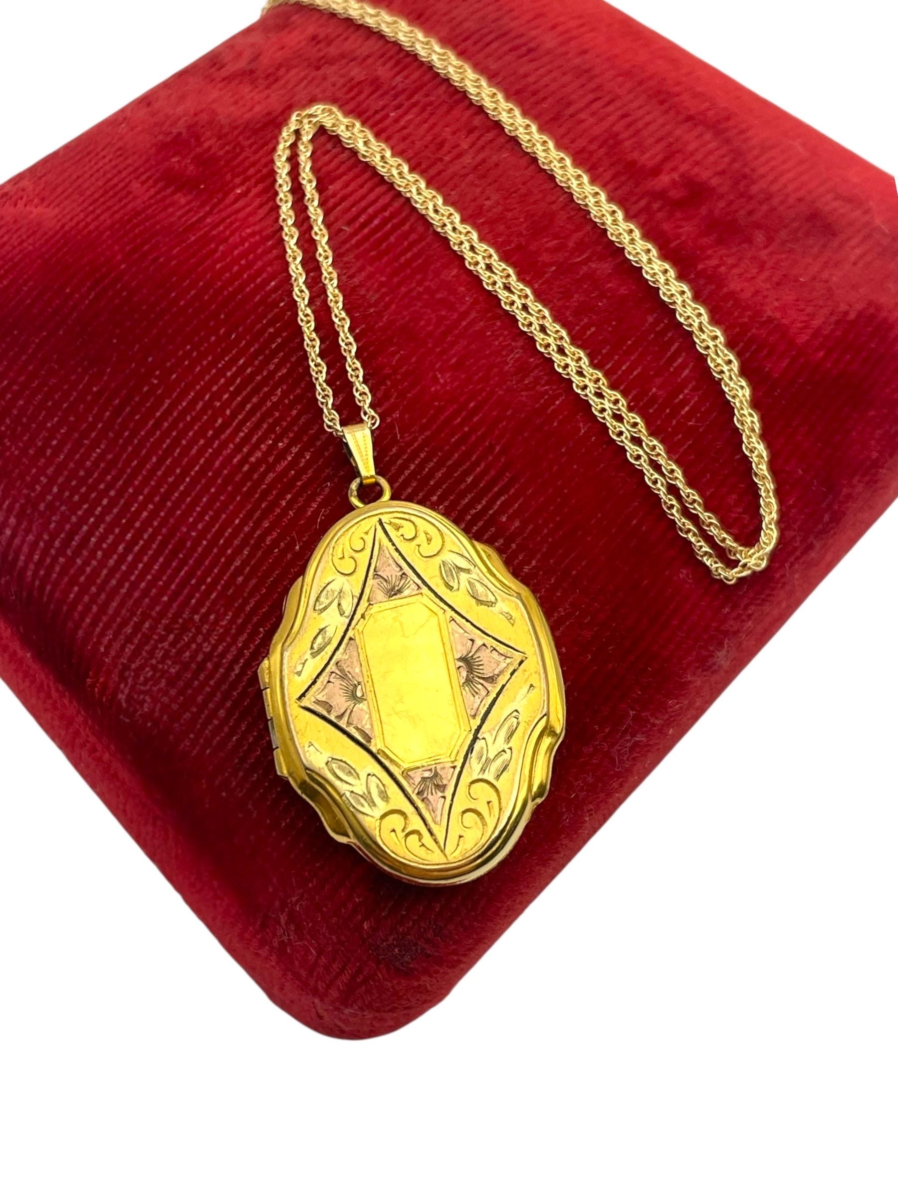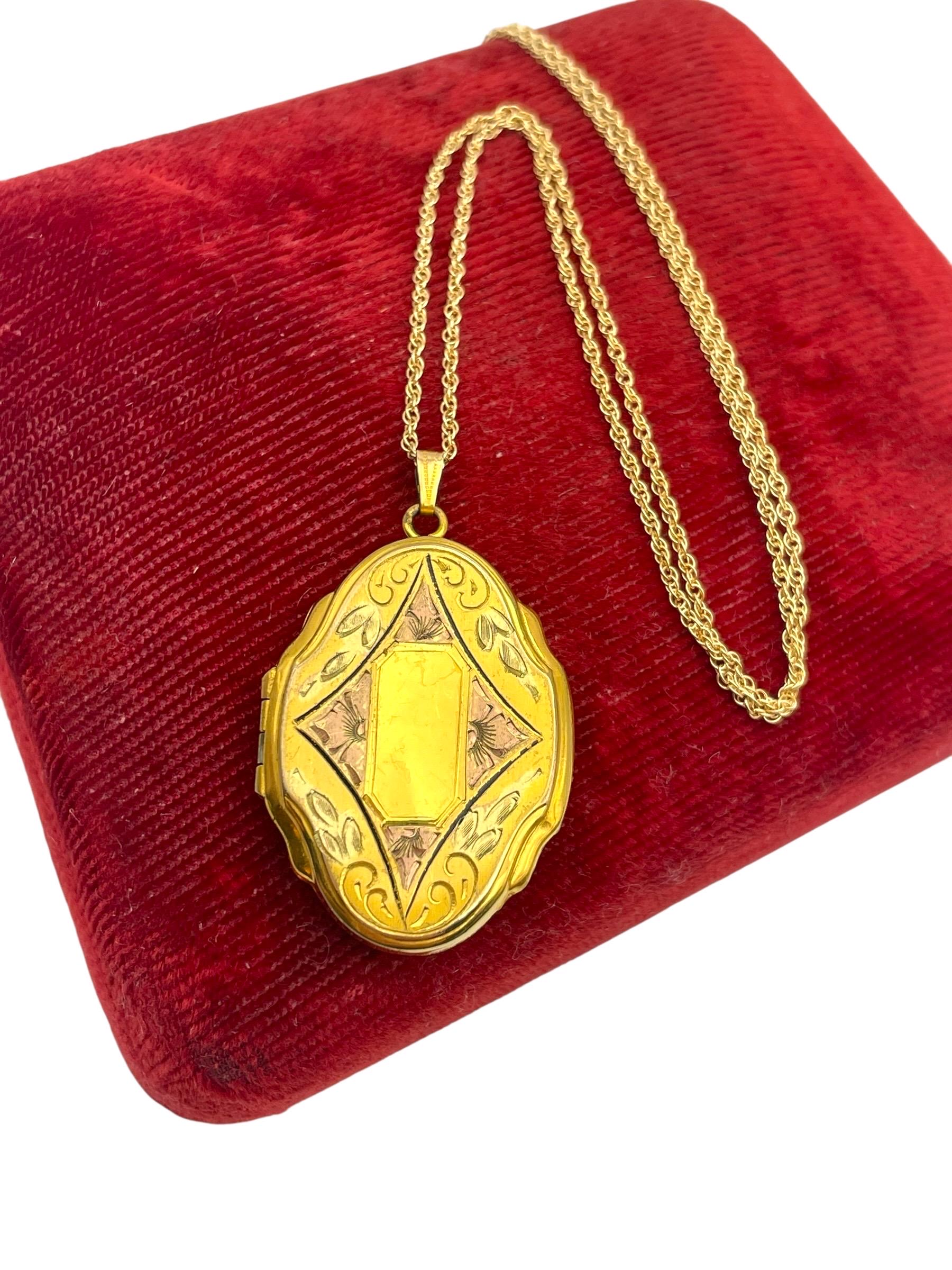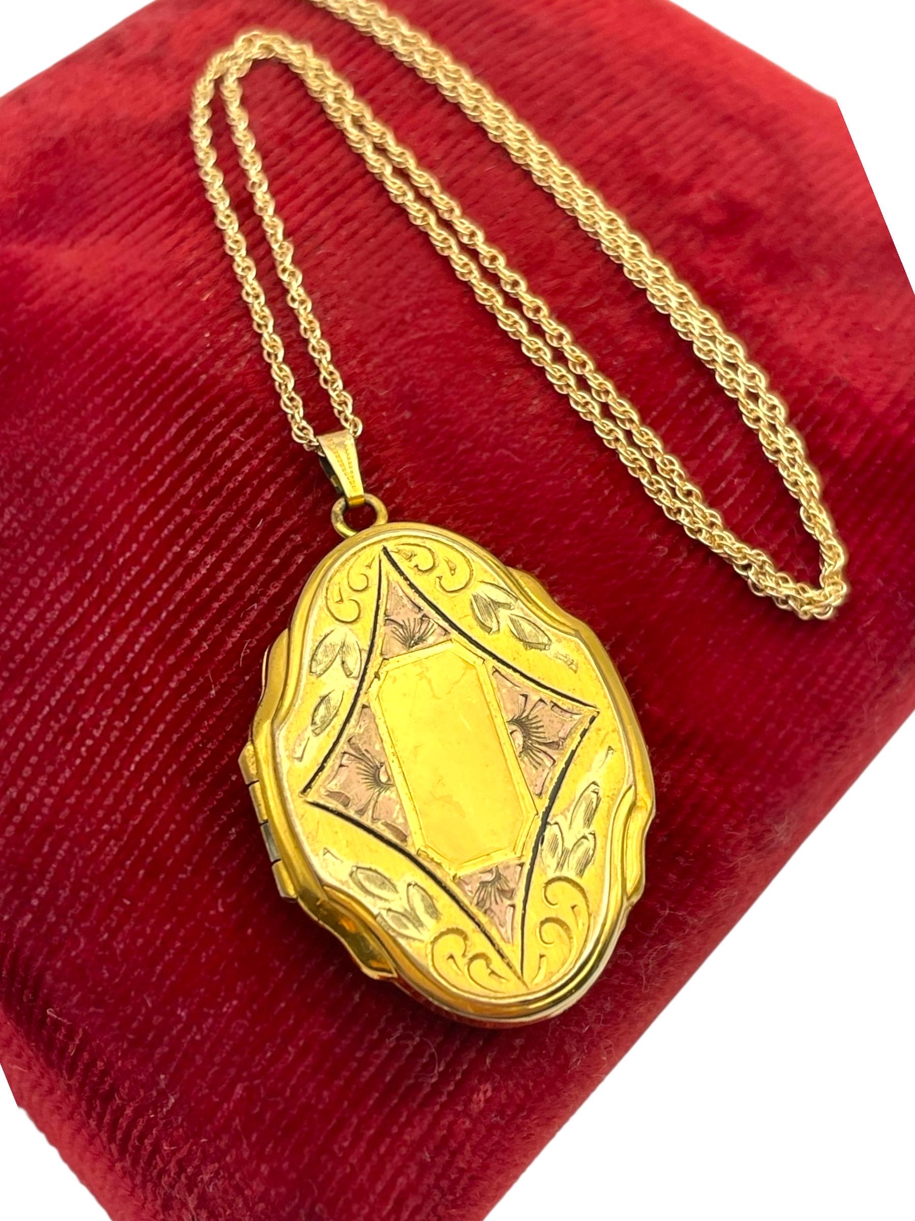 A mid century 12K yellow gold oval or shield shaped locket necklace with a tricolored etched design on the front. The back of the locket has a pinstripe design.