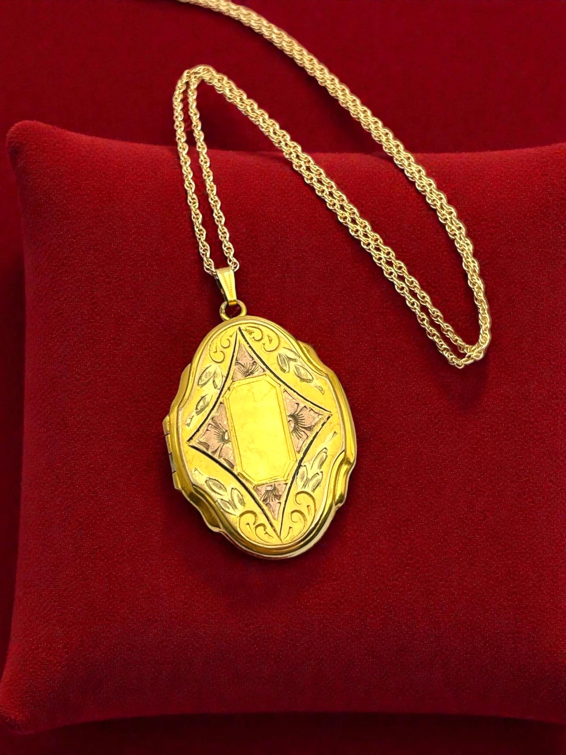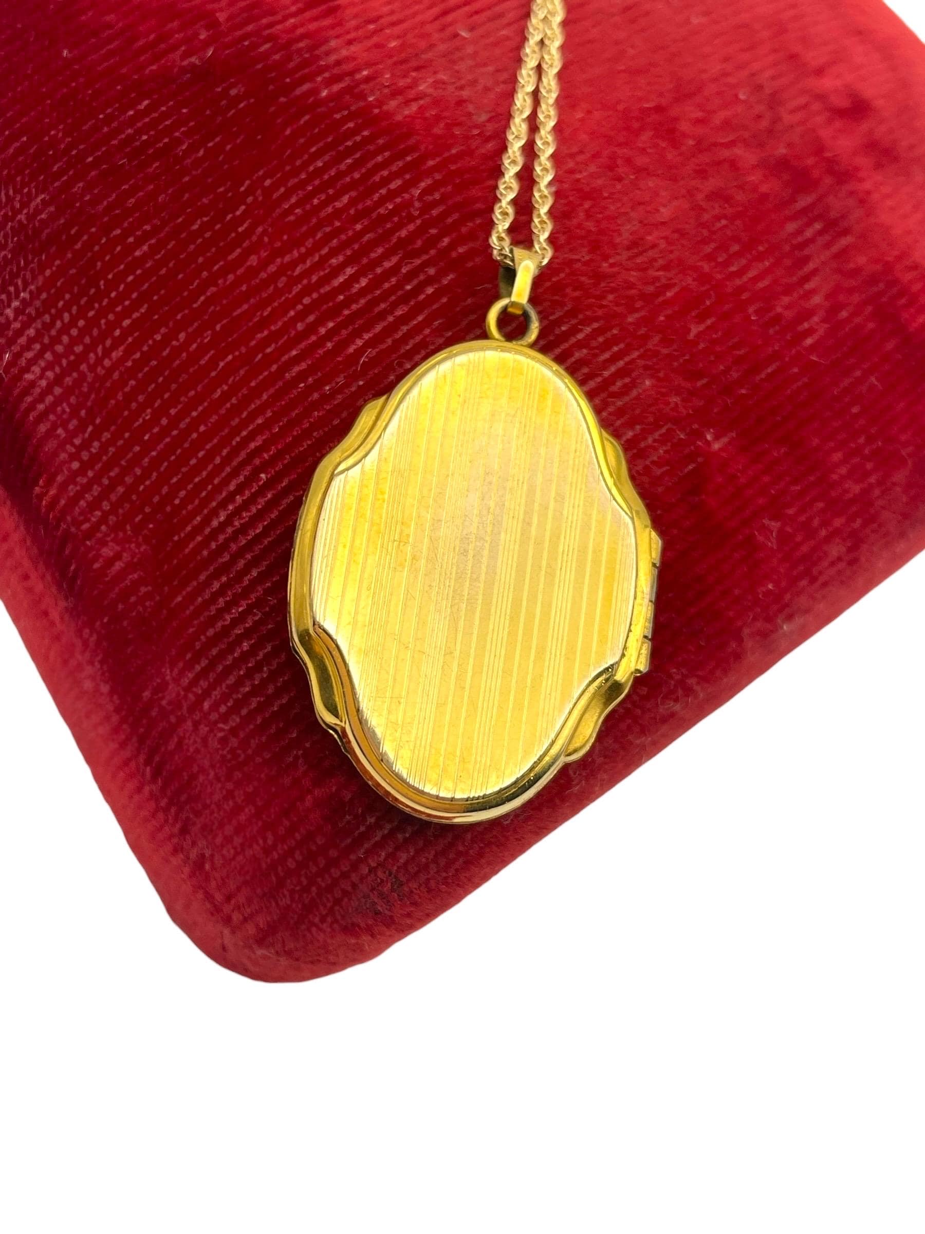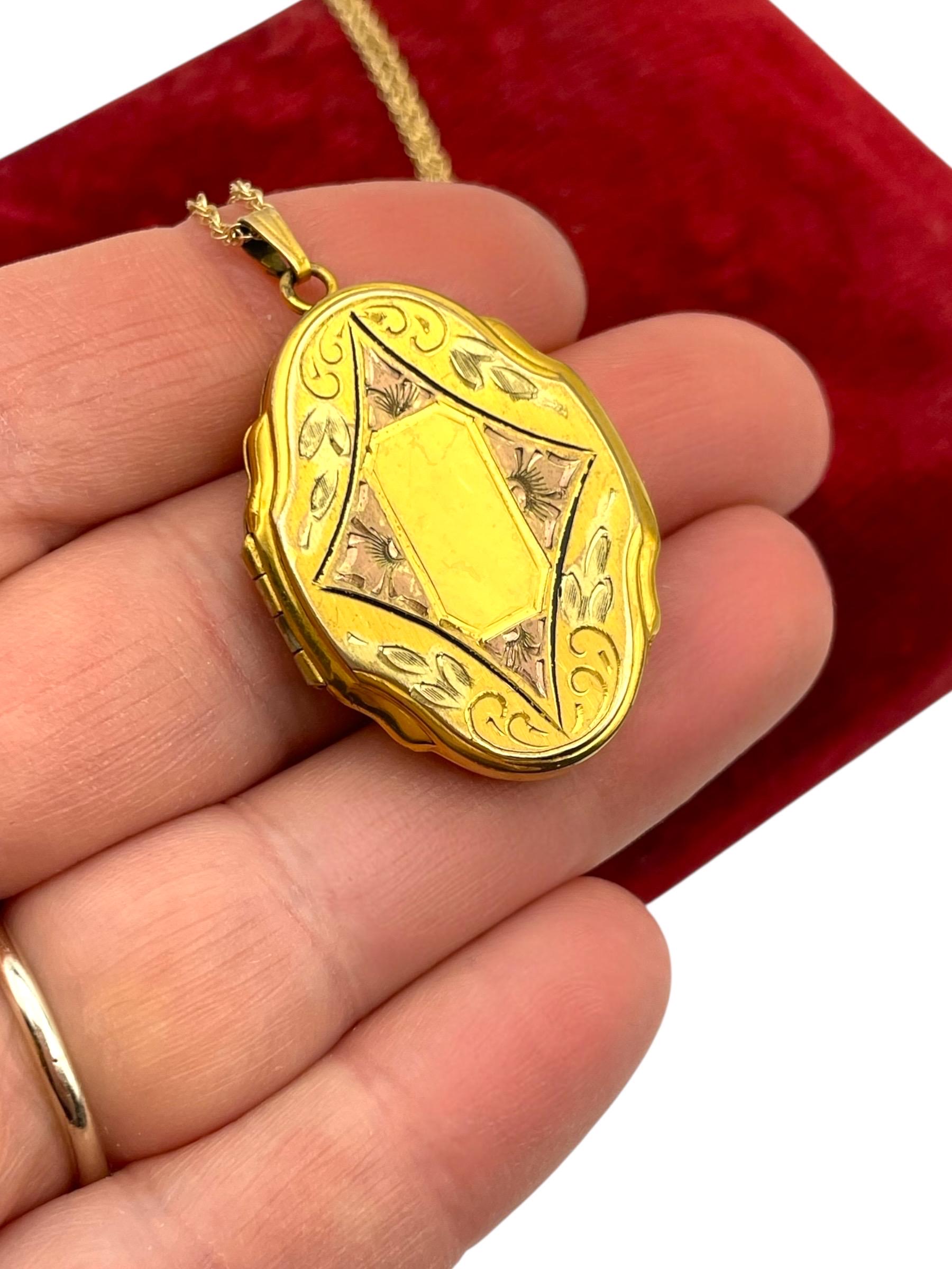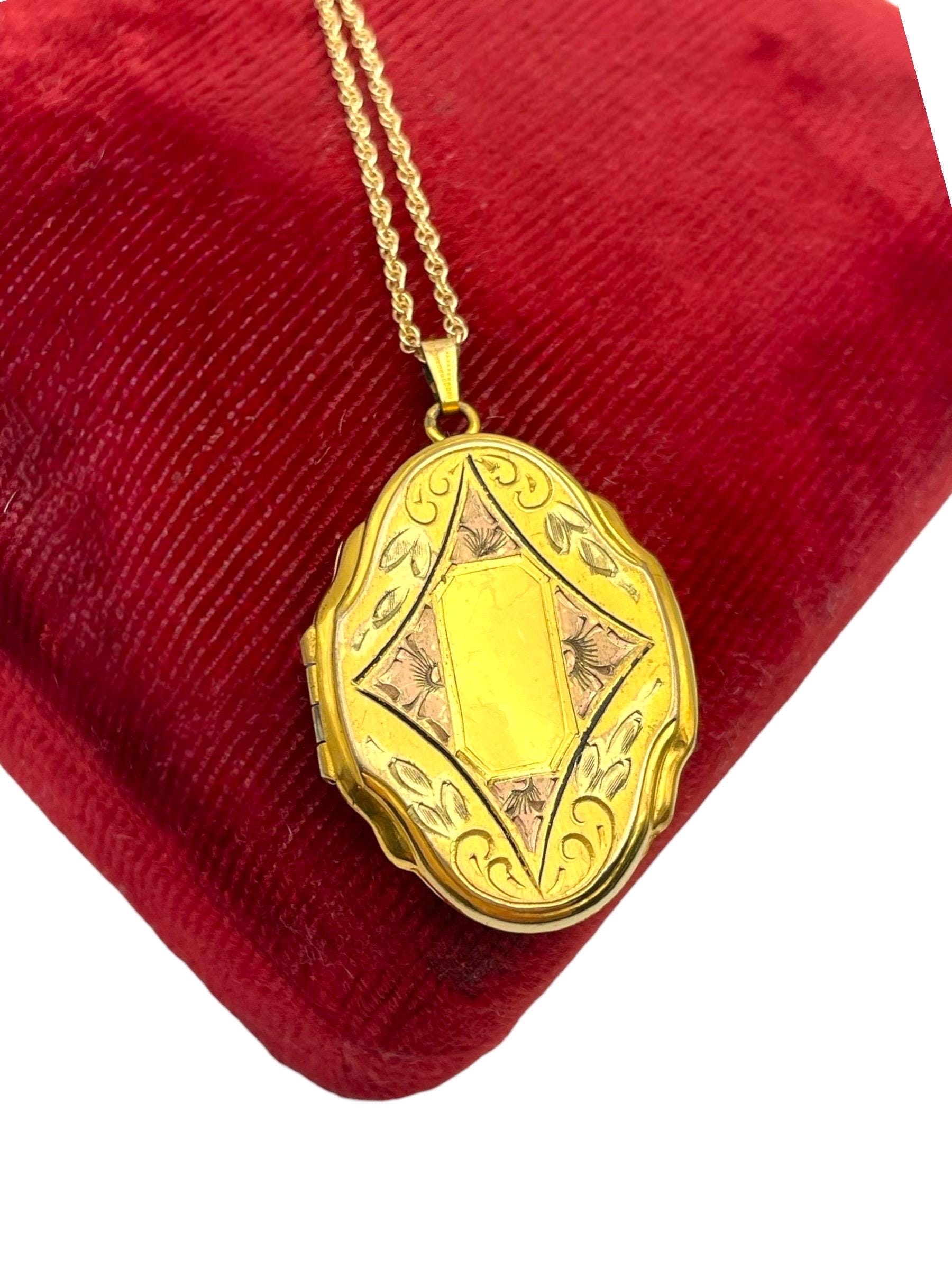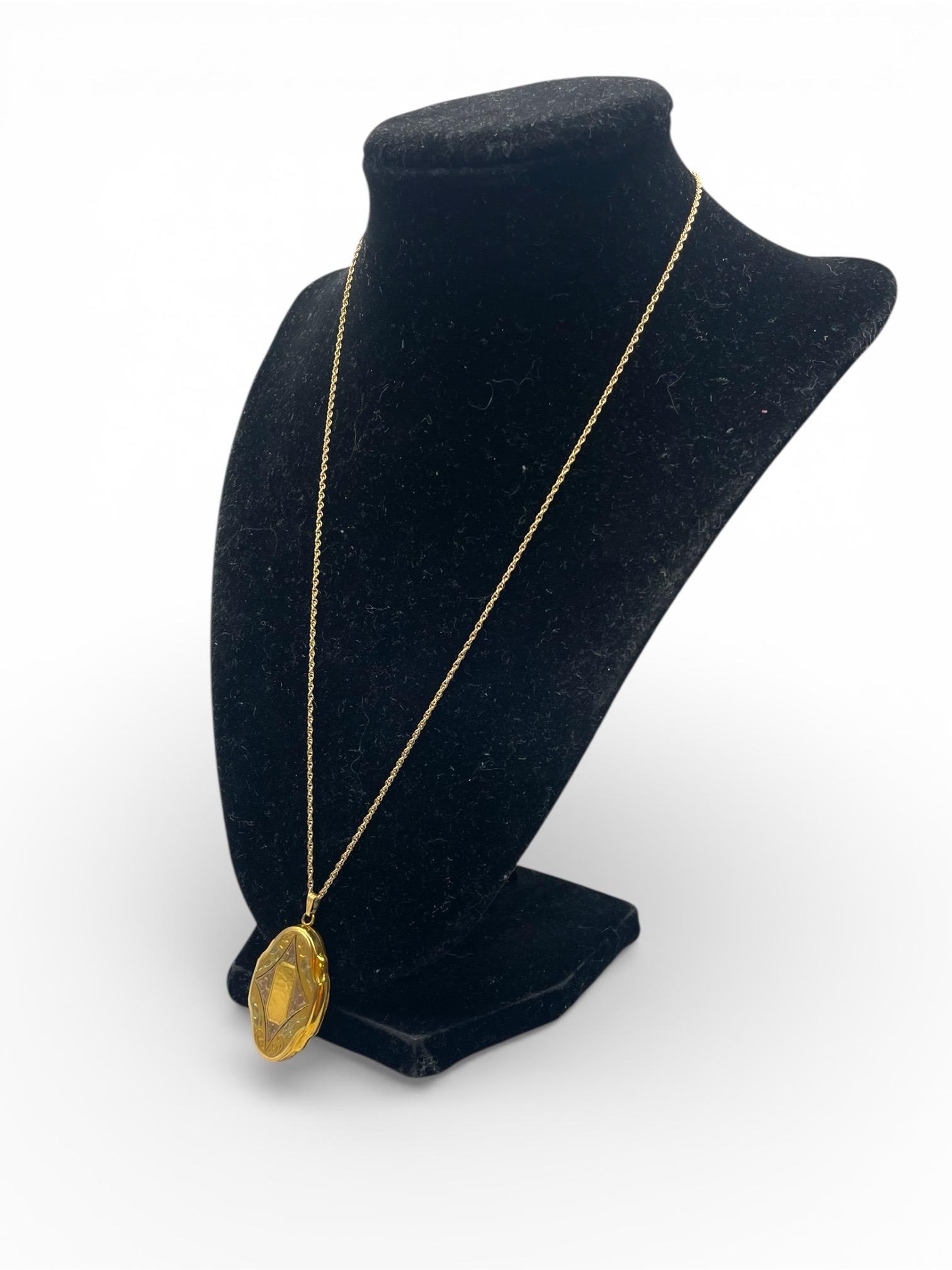 A mid century 12K yellow gold oval or shield shaped locket necklace with a tricolored etched design on the front. The back of the locket has a pinstripe design.