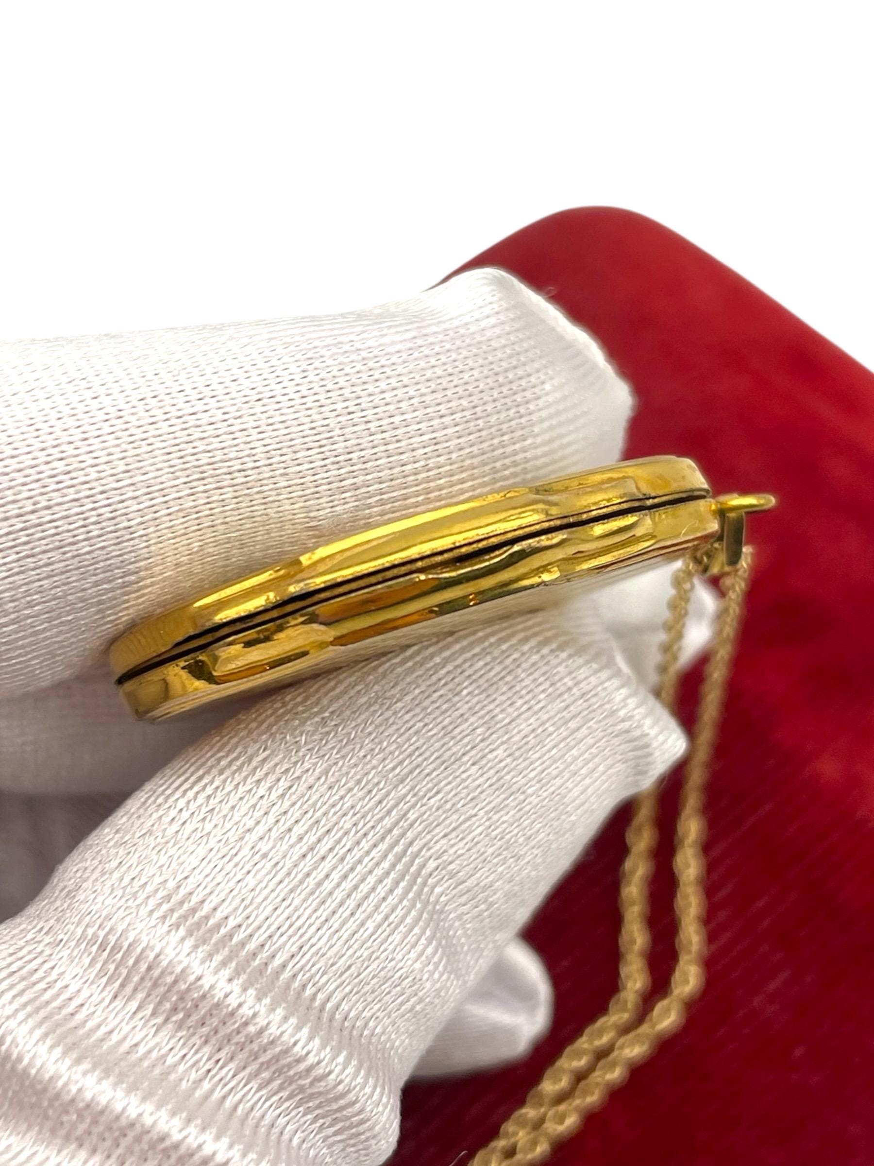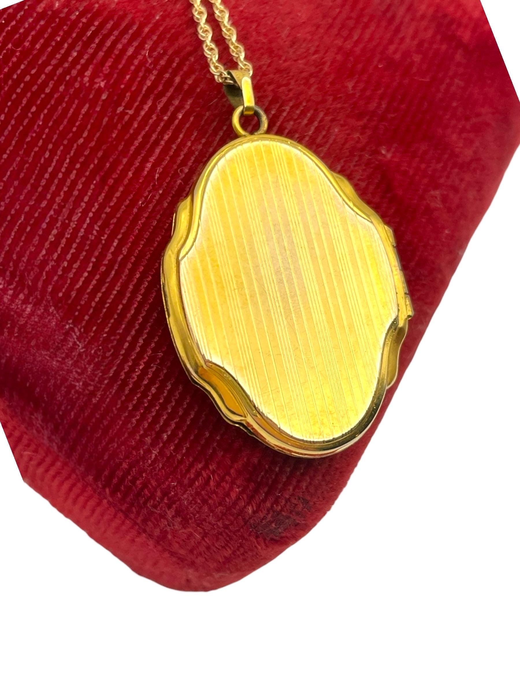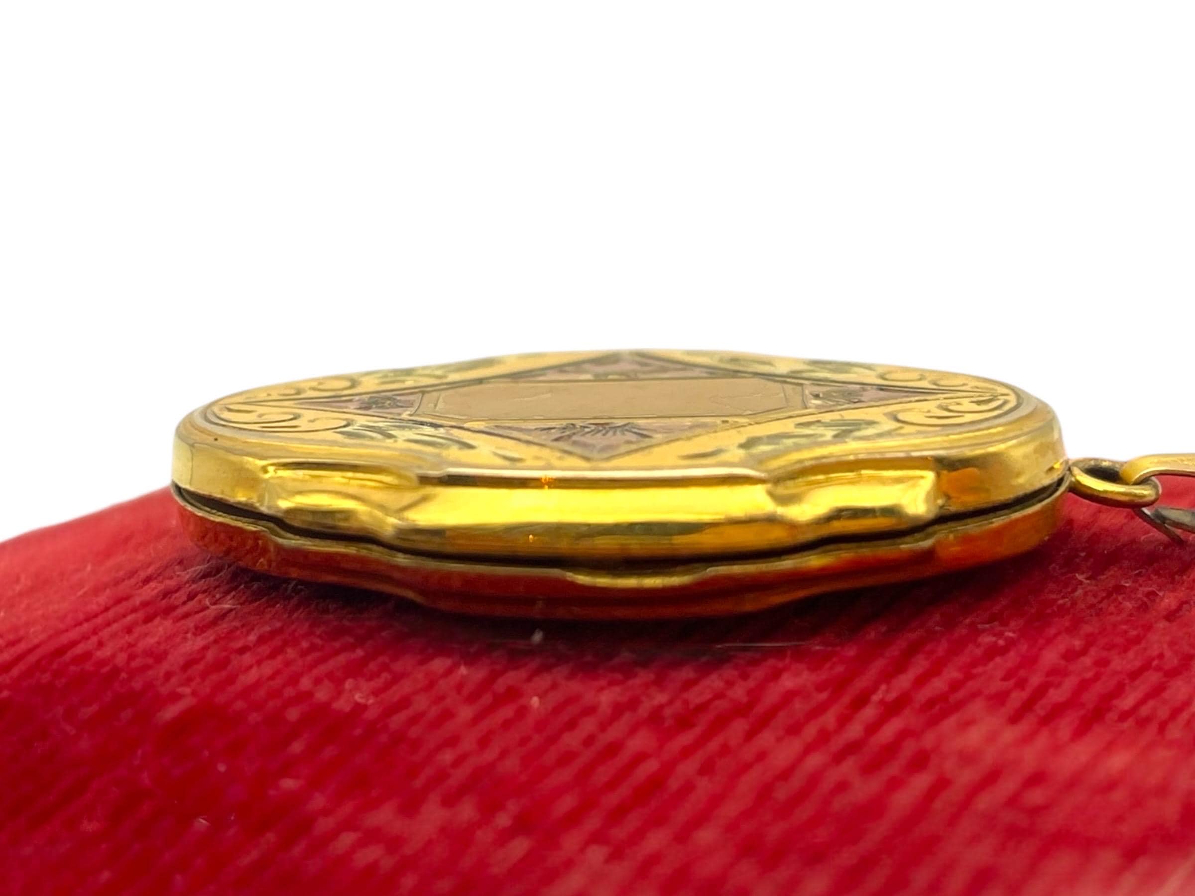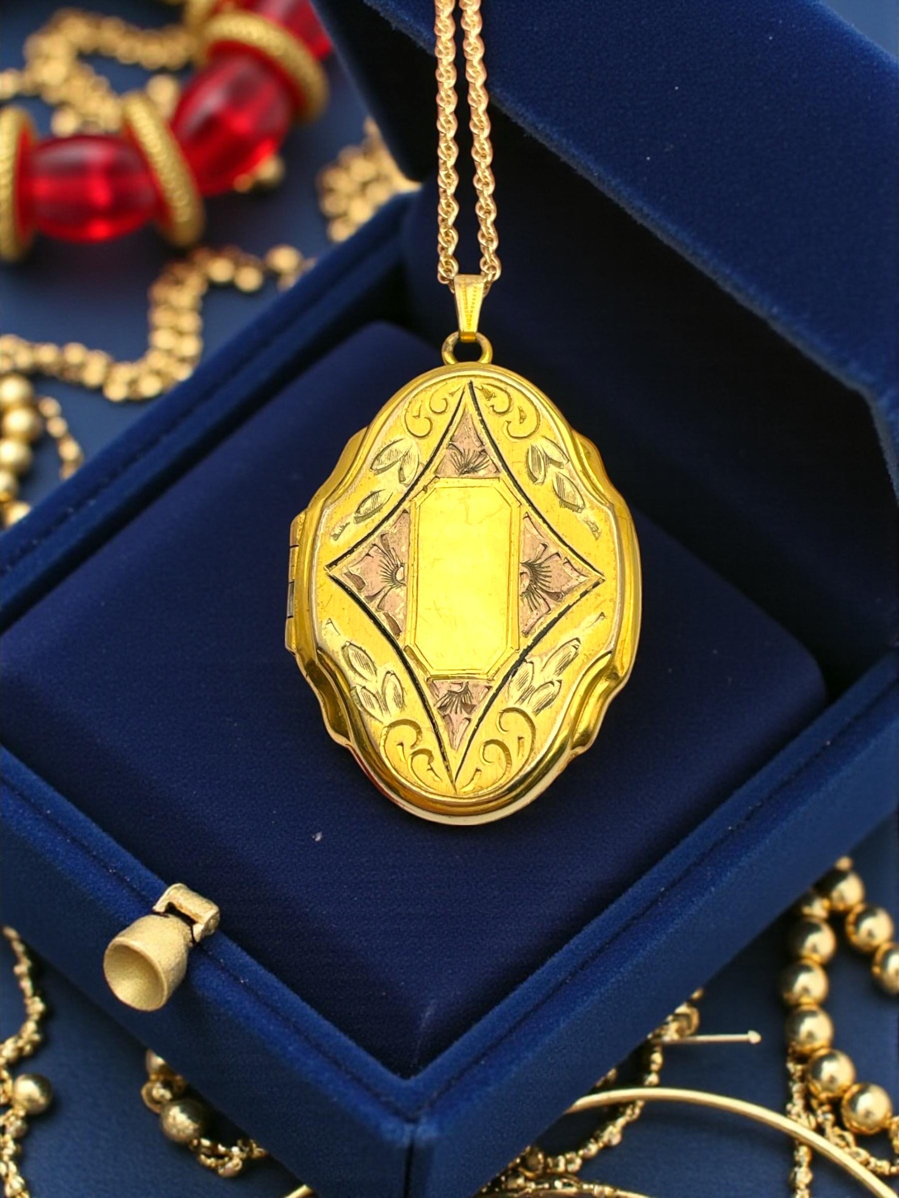 A mid century 12K yellow gold oval or shield shaped locket necklace with a tricolored etched design on the front. The back of the locket has a pinstripe design.