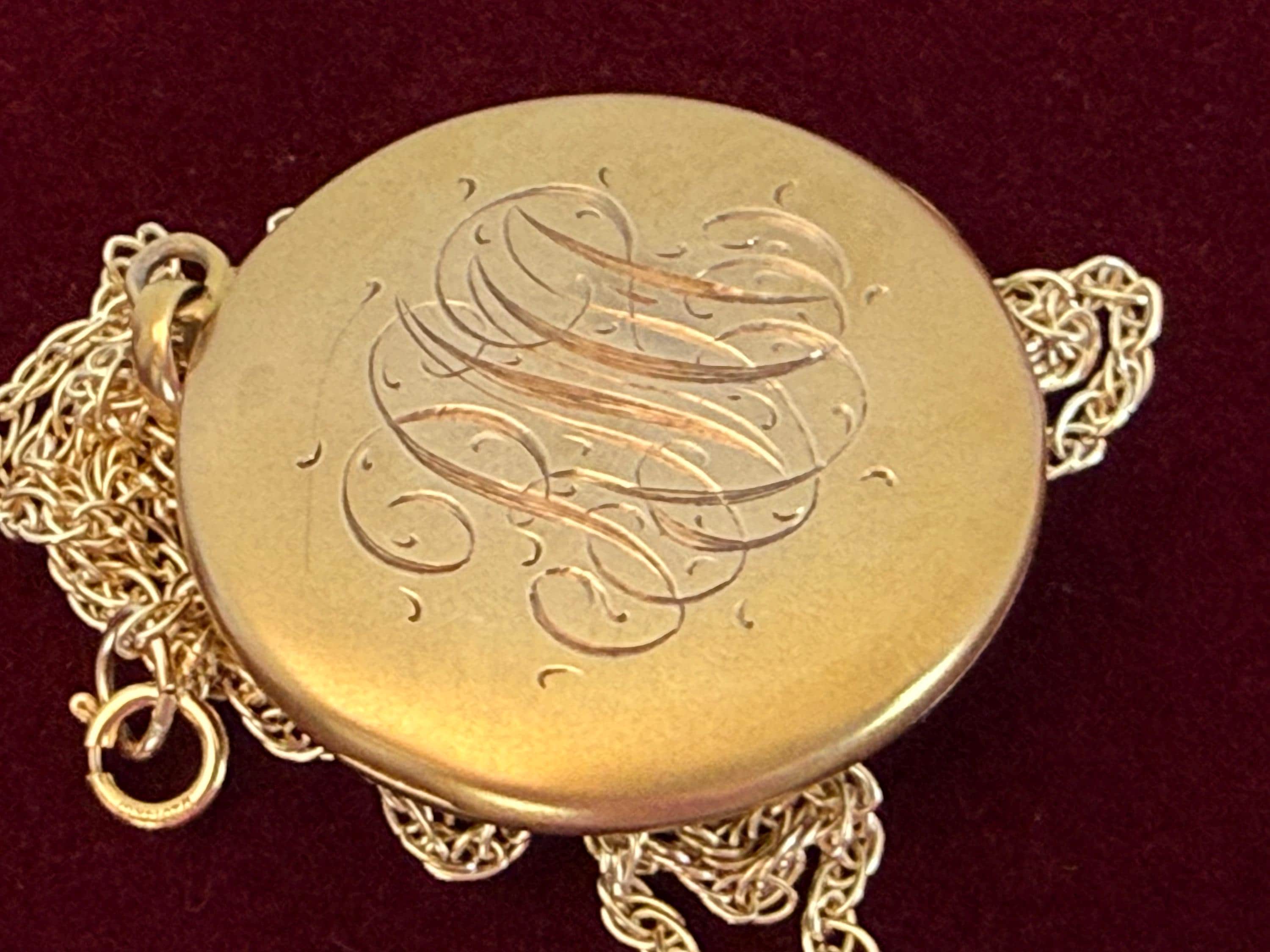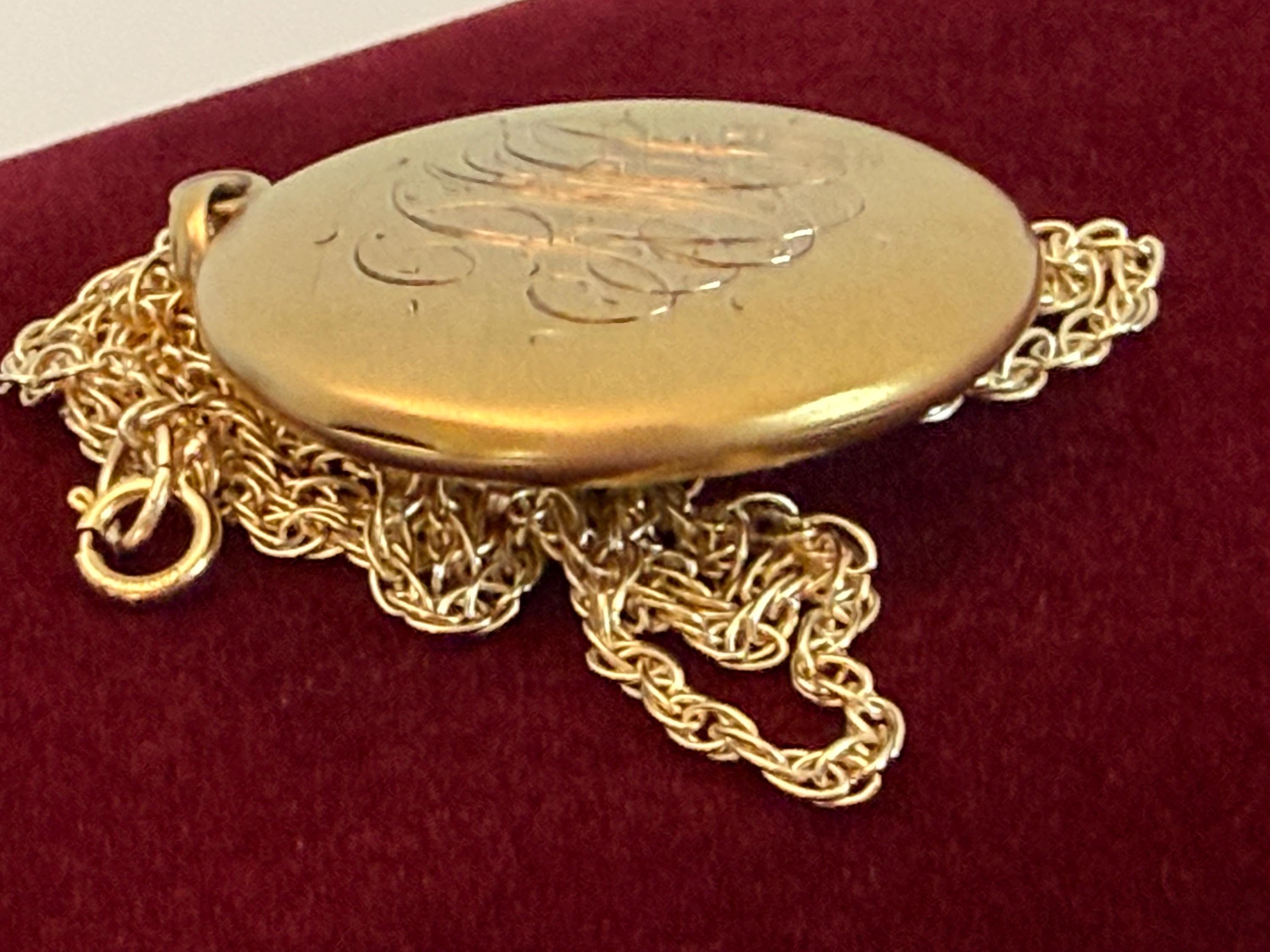 The vintage locket hangs from a new 14K yellow gold filled rope chain that secures with a spring ring clasp.
