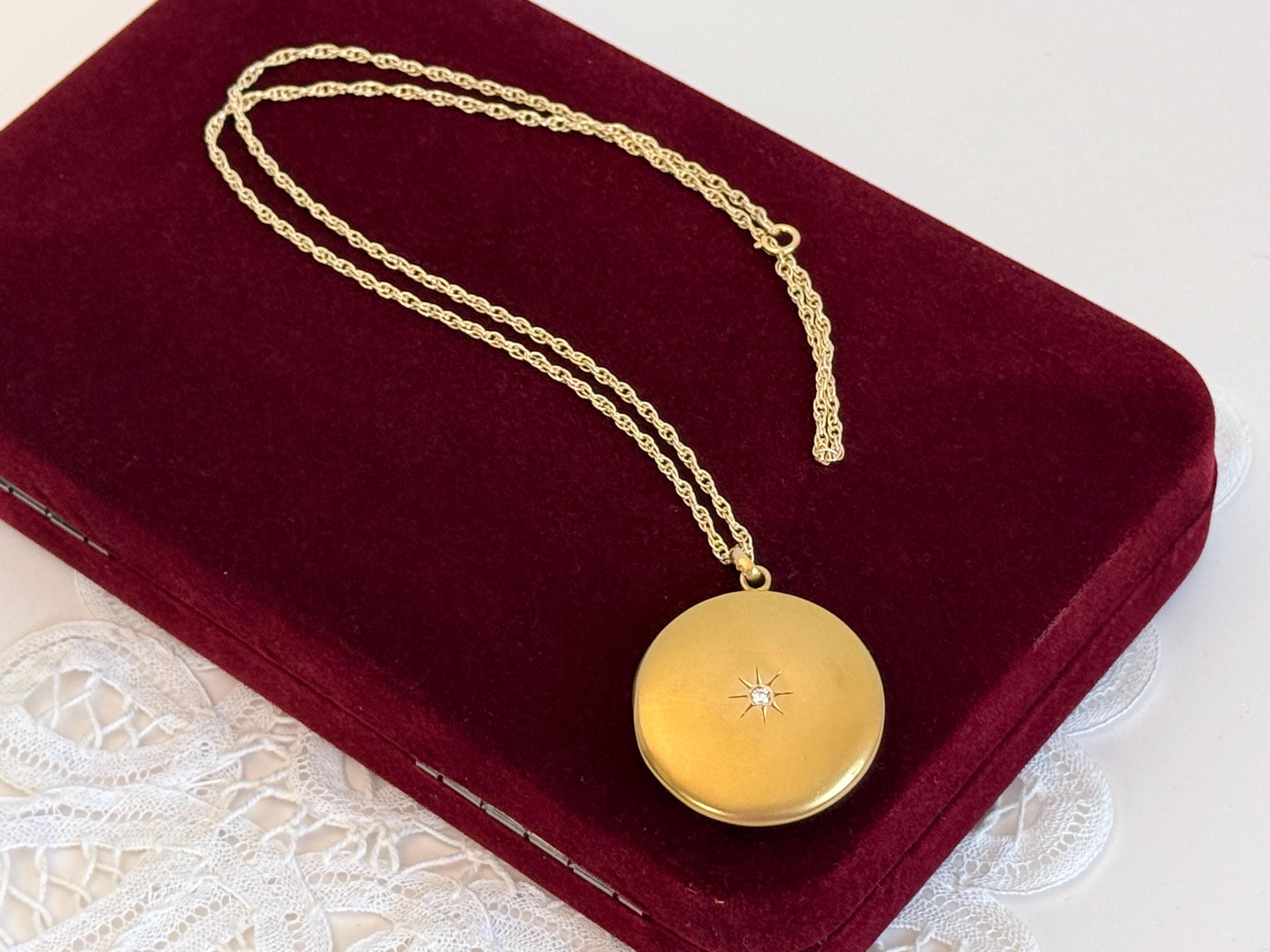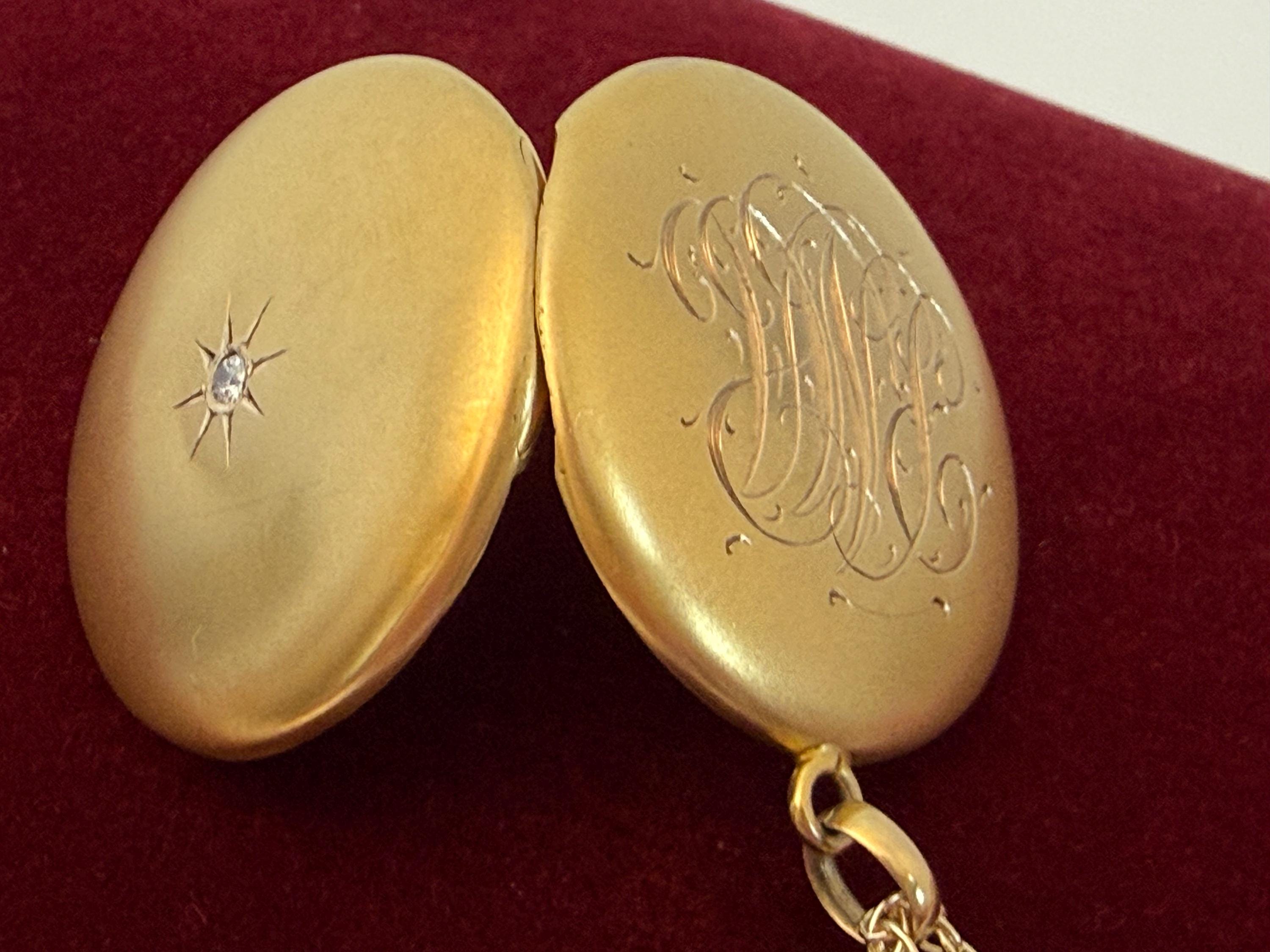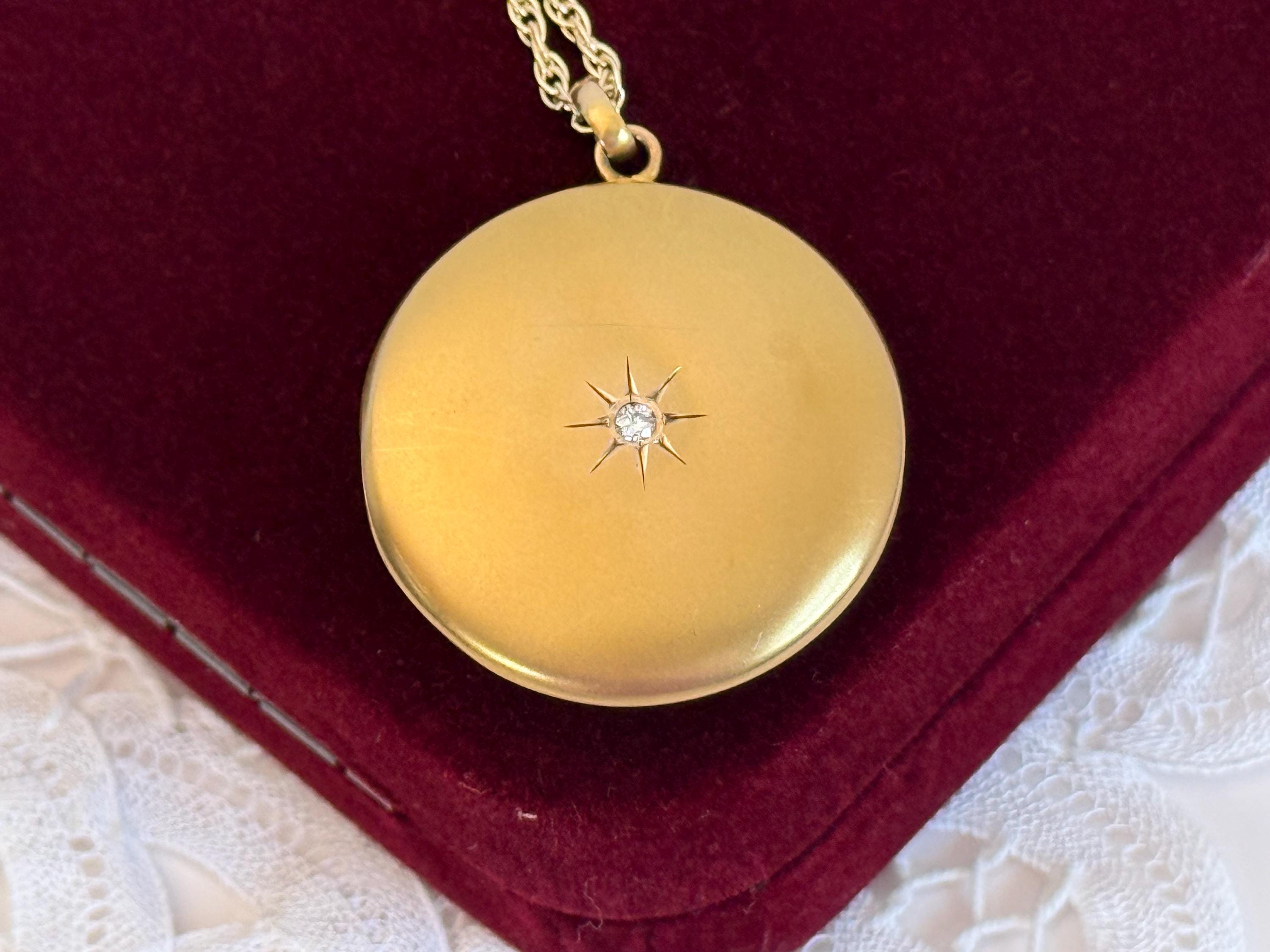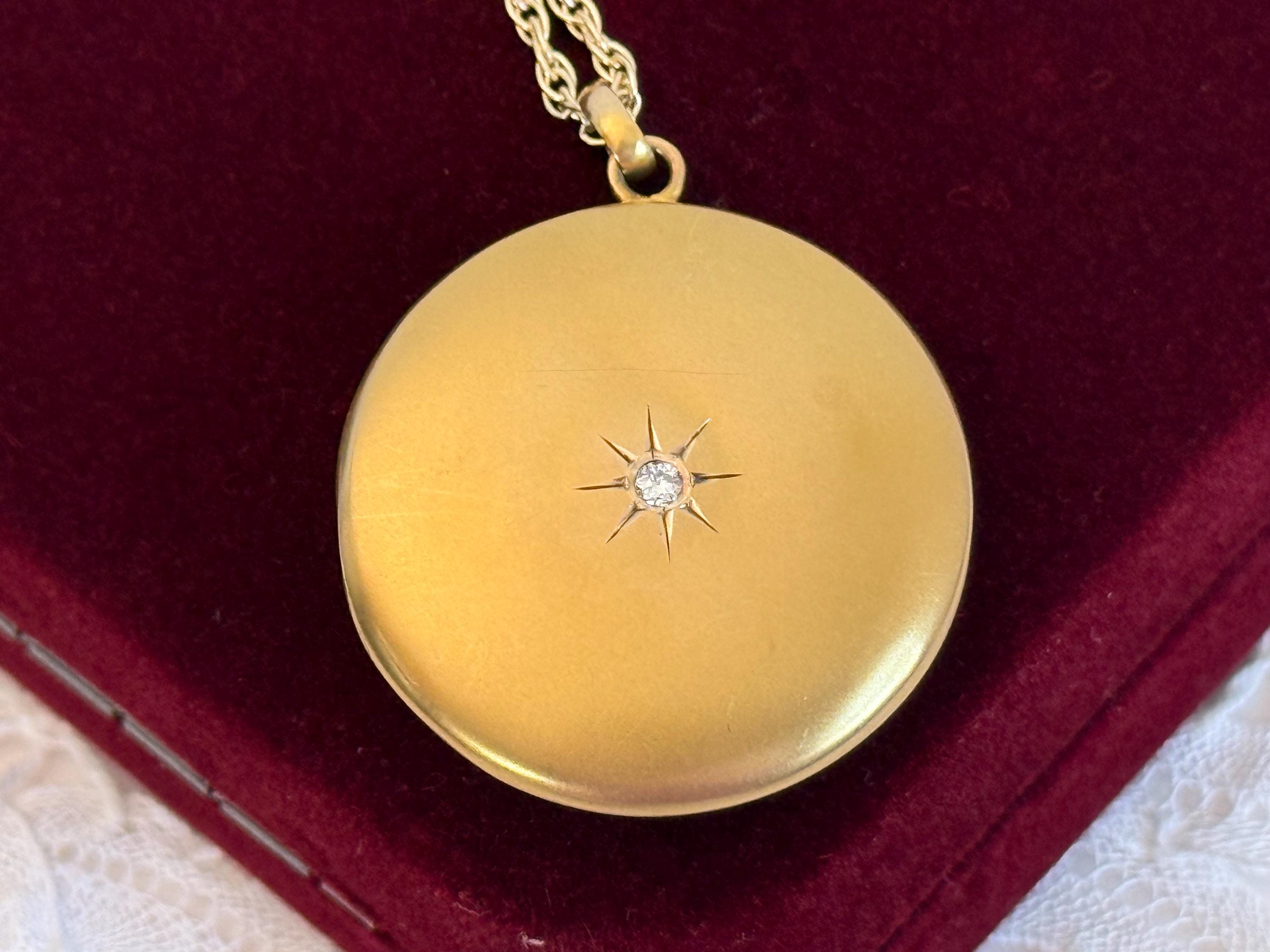 The locket is in nice antique condition with some patina and wear / scratching commensurate with age - circa early 1900s. Around the center diamond / etched starburst shape is a slight round depression that can be seen upon close inspection - see photos for detail. Price reflects condition.