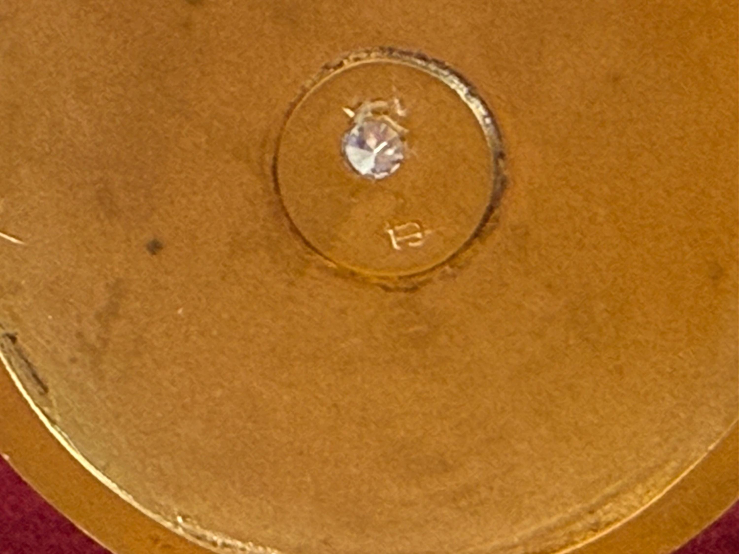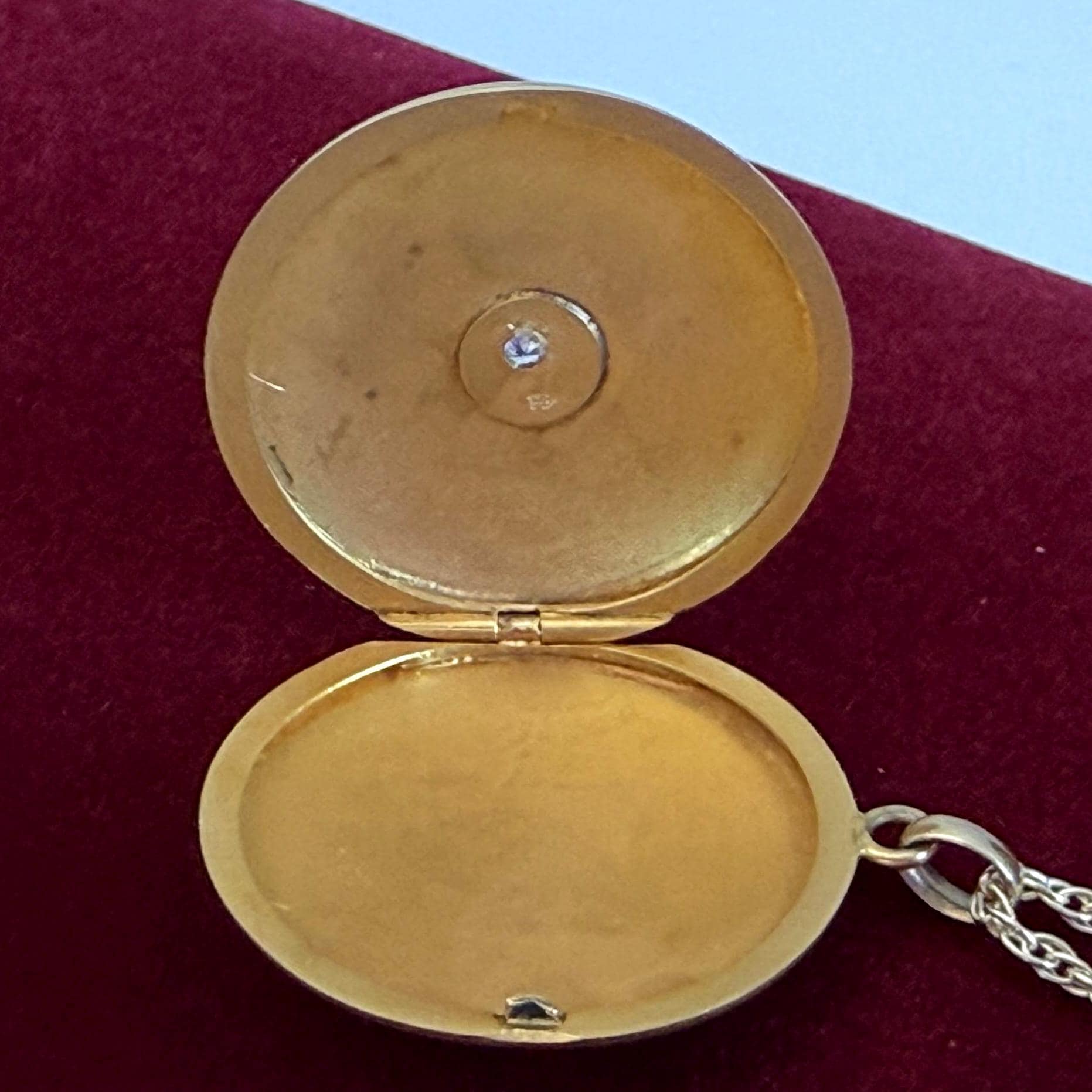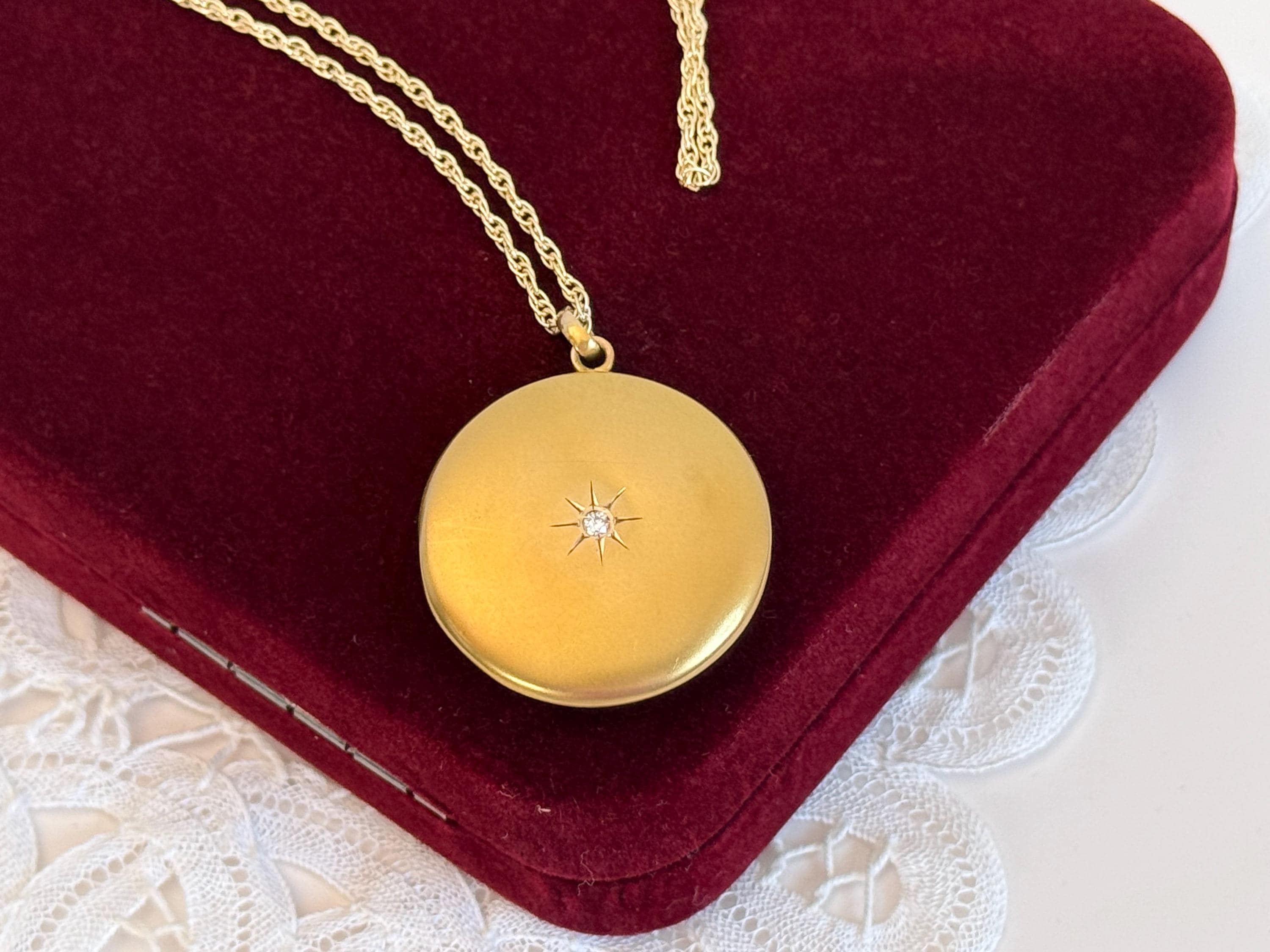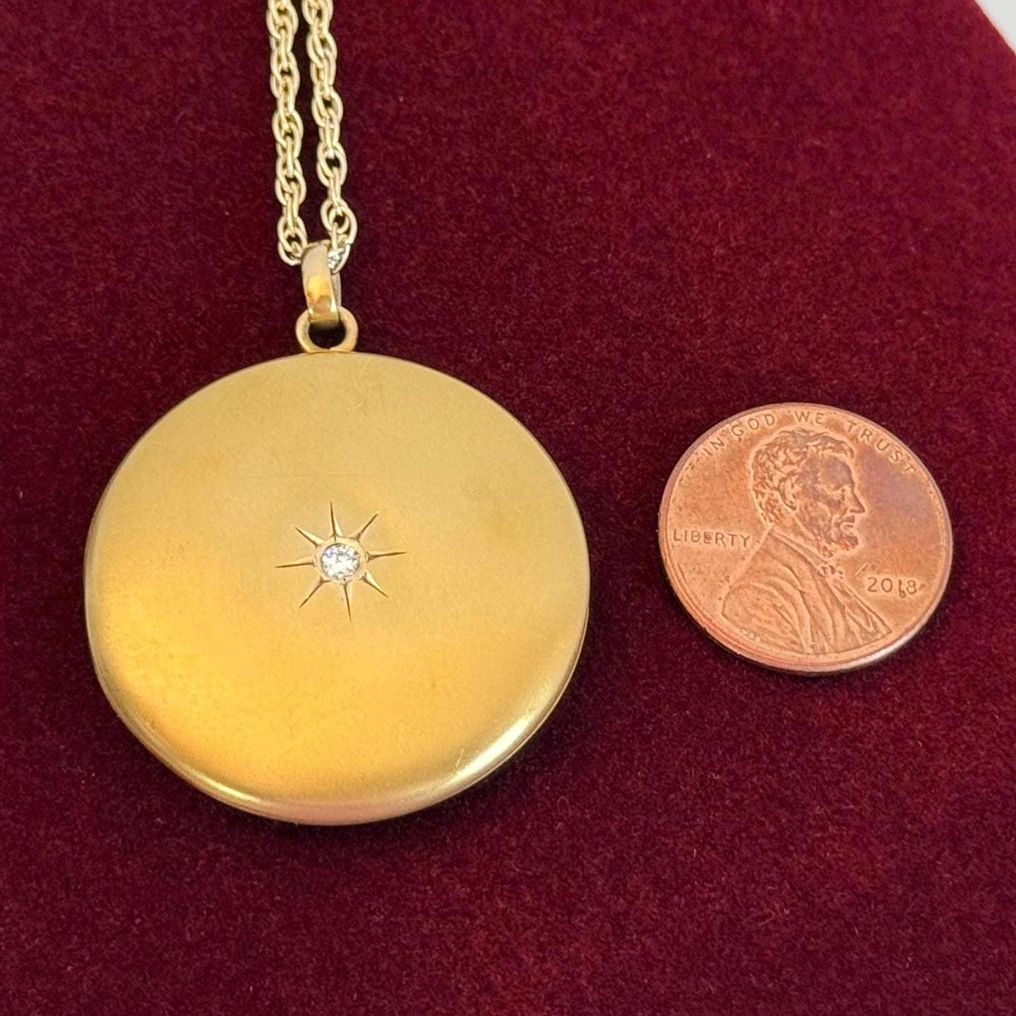The locket is in nice antique condition with some patina and wear / scratching commensurate with age - circa early 1900s. Around the center diamond / etched starburst shape is a slight round depression that can be seen upon close inspection - see photos for detail. Price reflects condition.