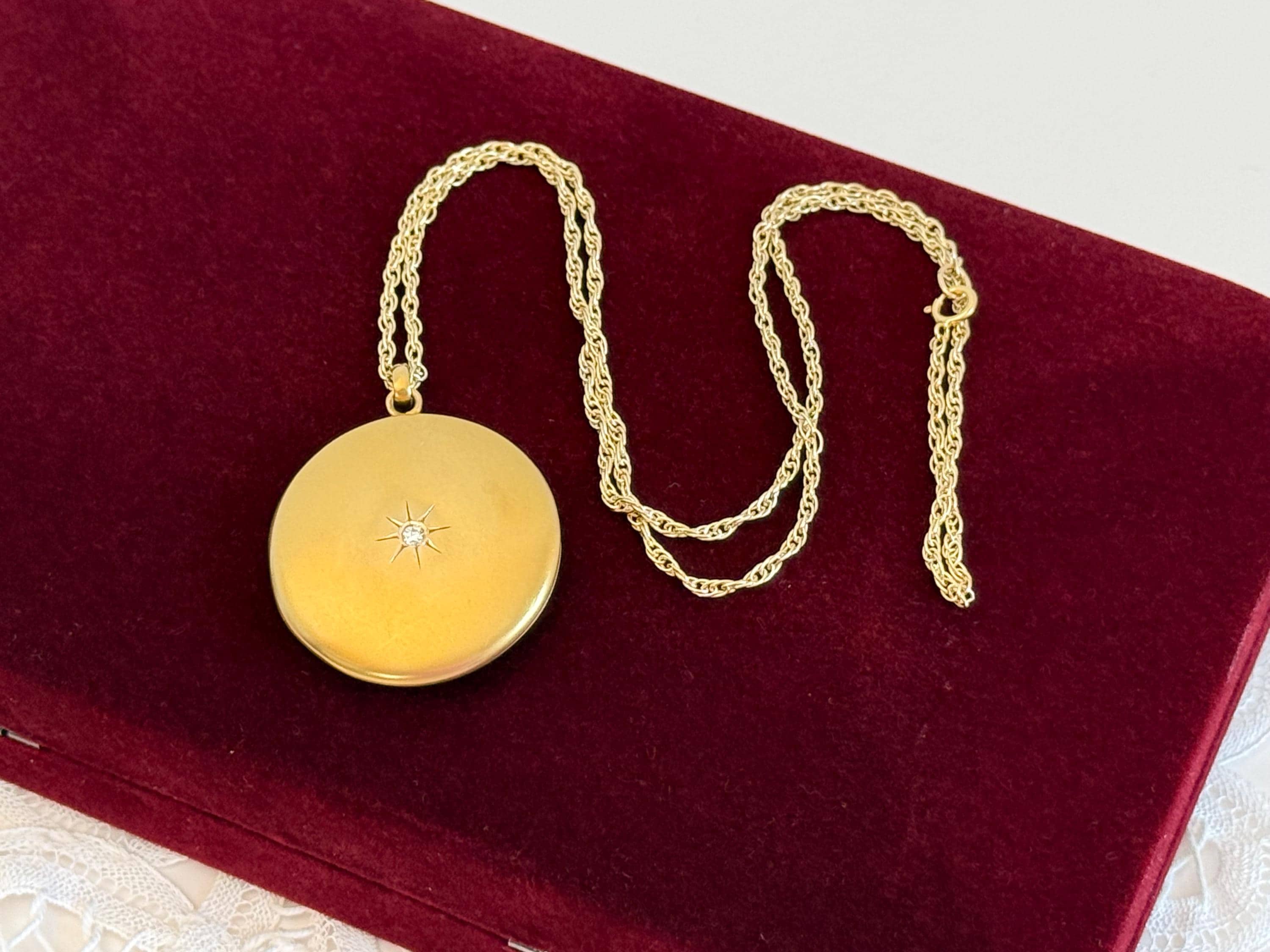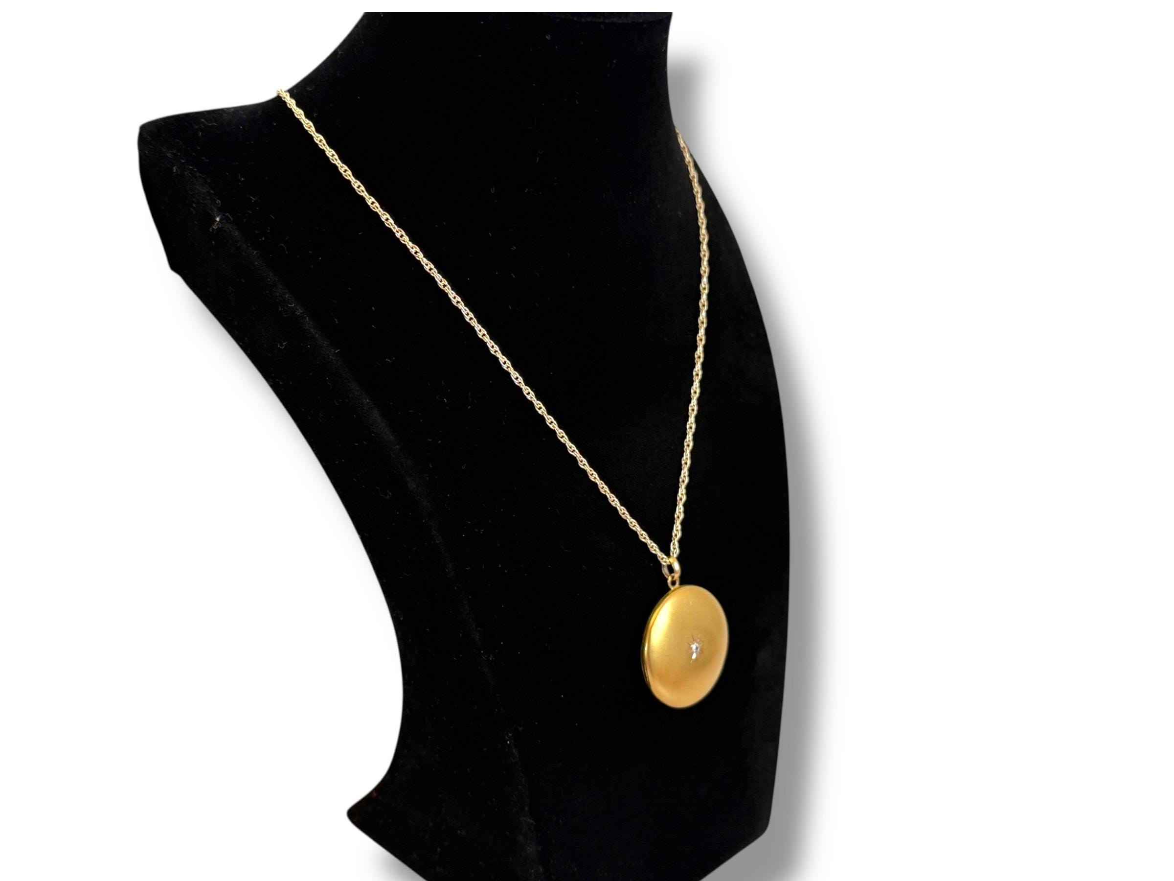 A gorgeous vintage 10K gold round locket necklace that features a round faceted diamond set in the center on the one side and the engraved monogram with the initials RMA on the other side. This larger sized Edwardian Era locket hangs in a 14K gold filled rope chain with a spring ring clasp that is 20" long. One side (the front) of this locket has a diamond in the center that is approximately 2 1/2mm in diameter. The diamond is set in the middle of a round starburst shape.
