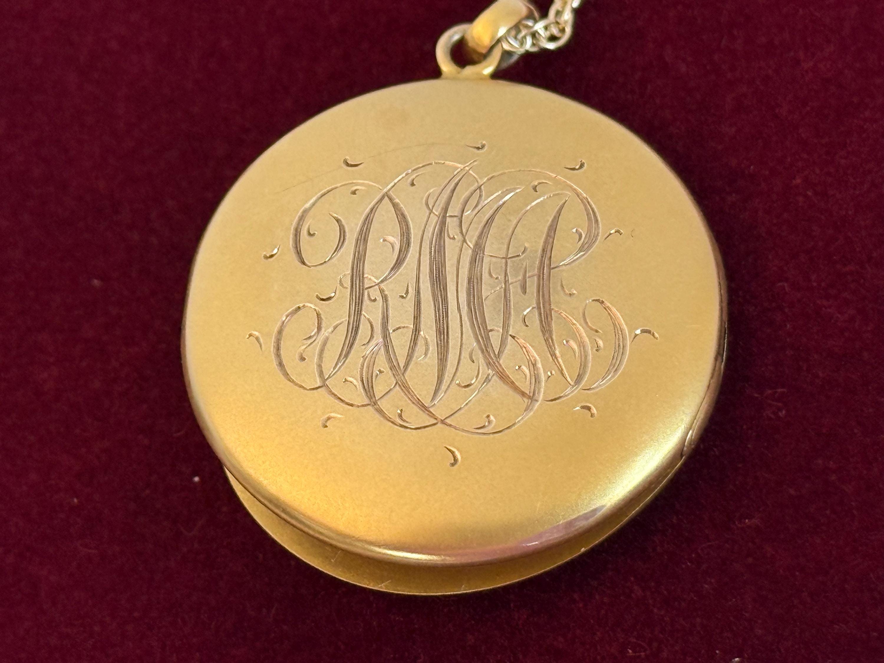 The other side of this locket features the monogram with the initials "RMA". The cursive, swirling letters have a detailed and lovely ornate script.