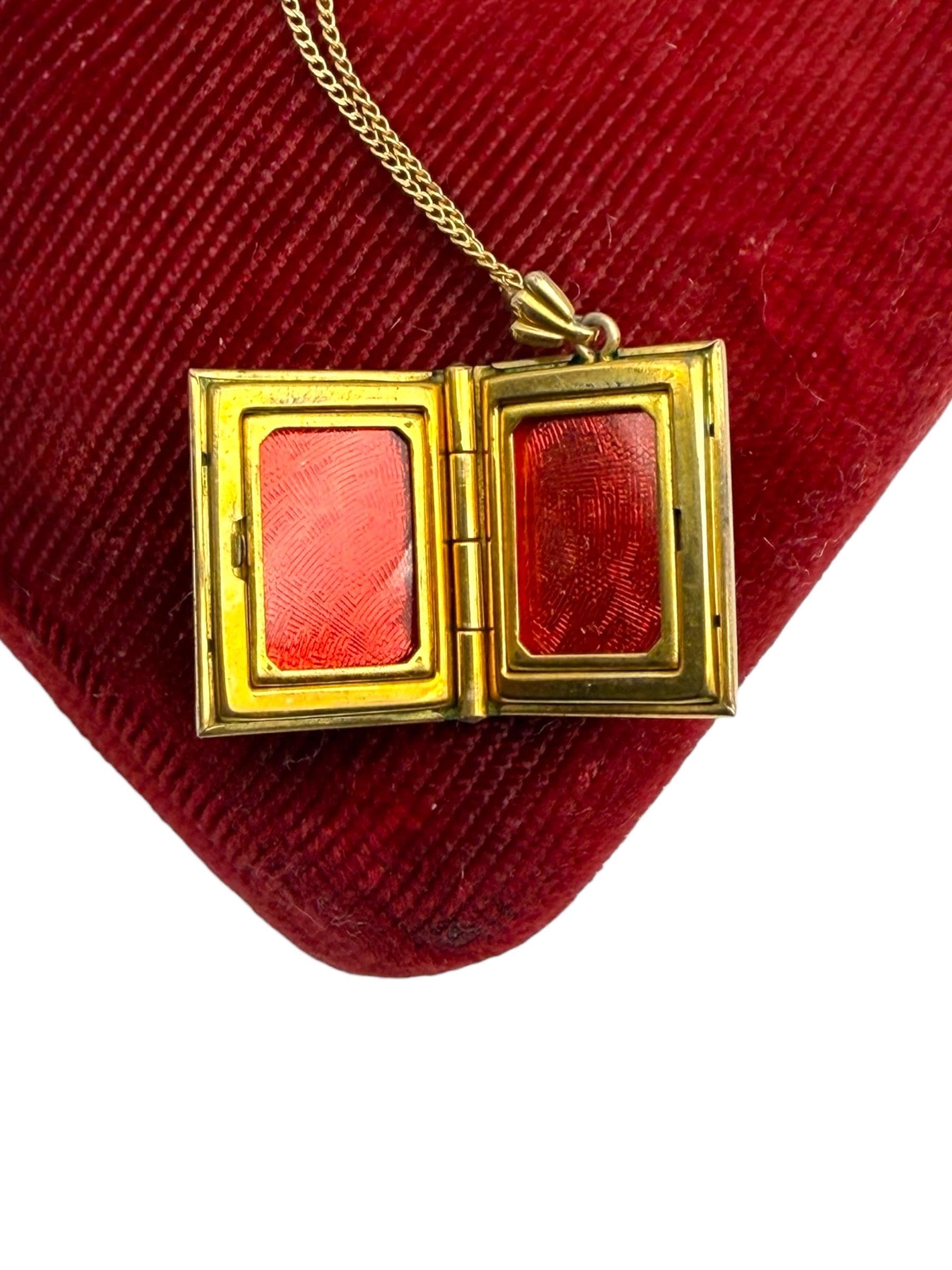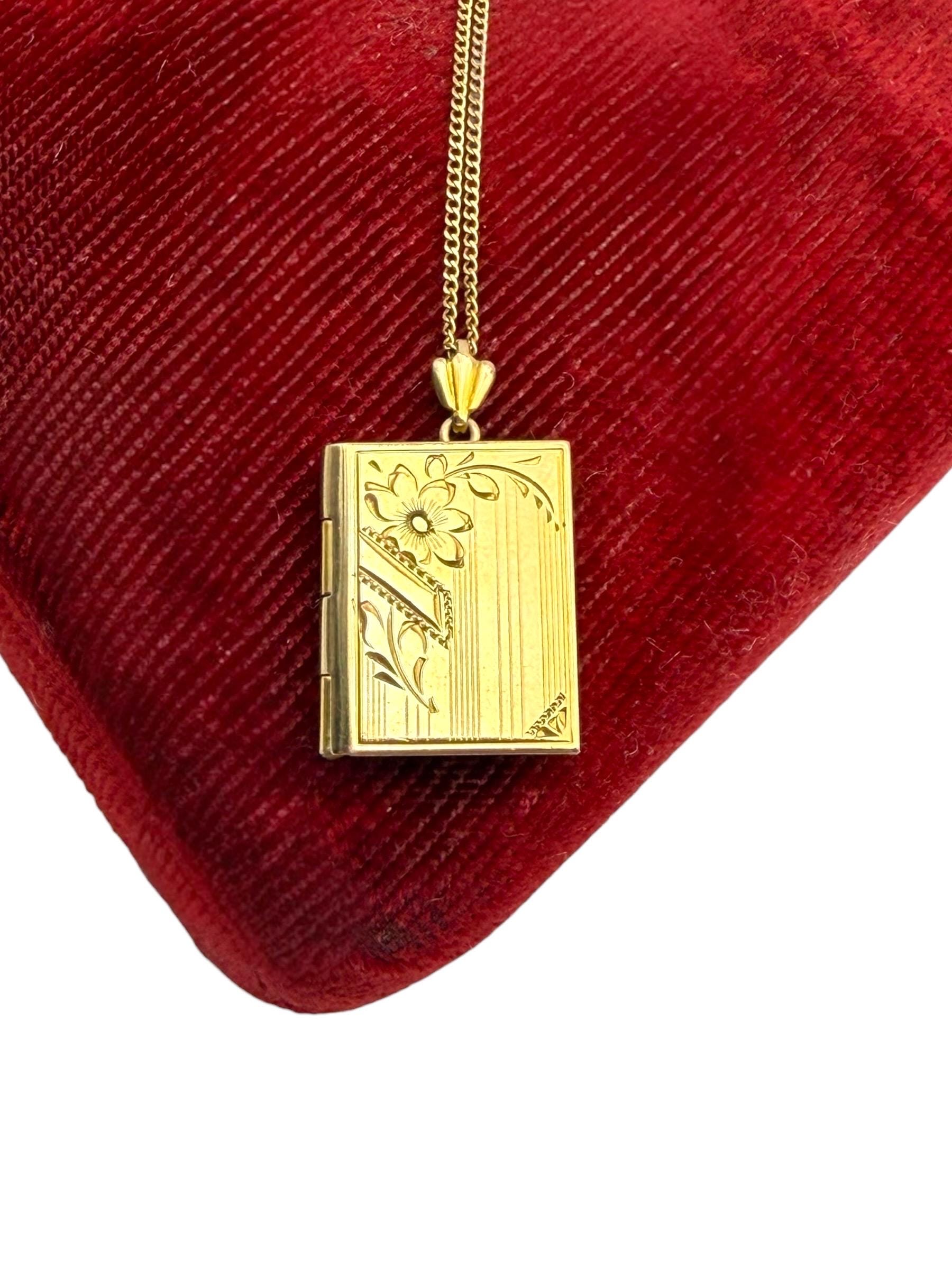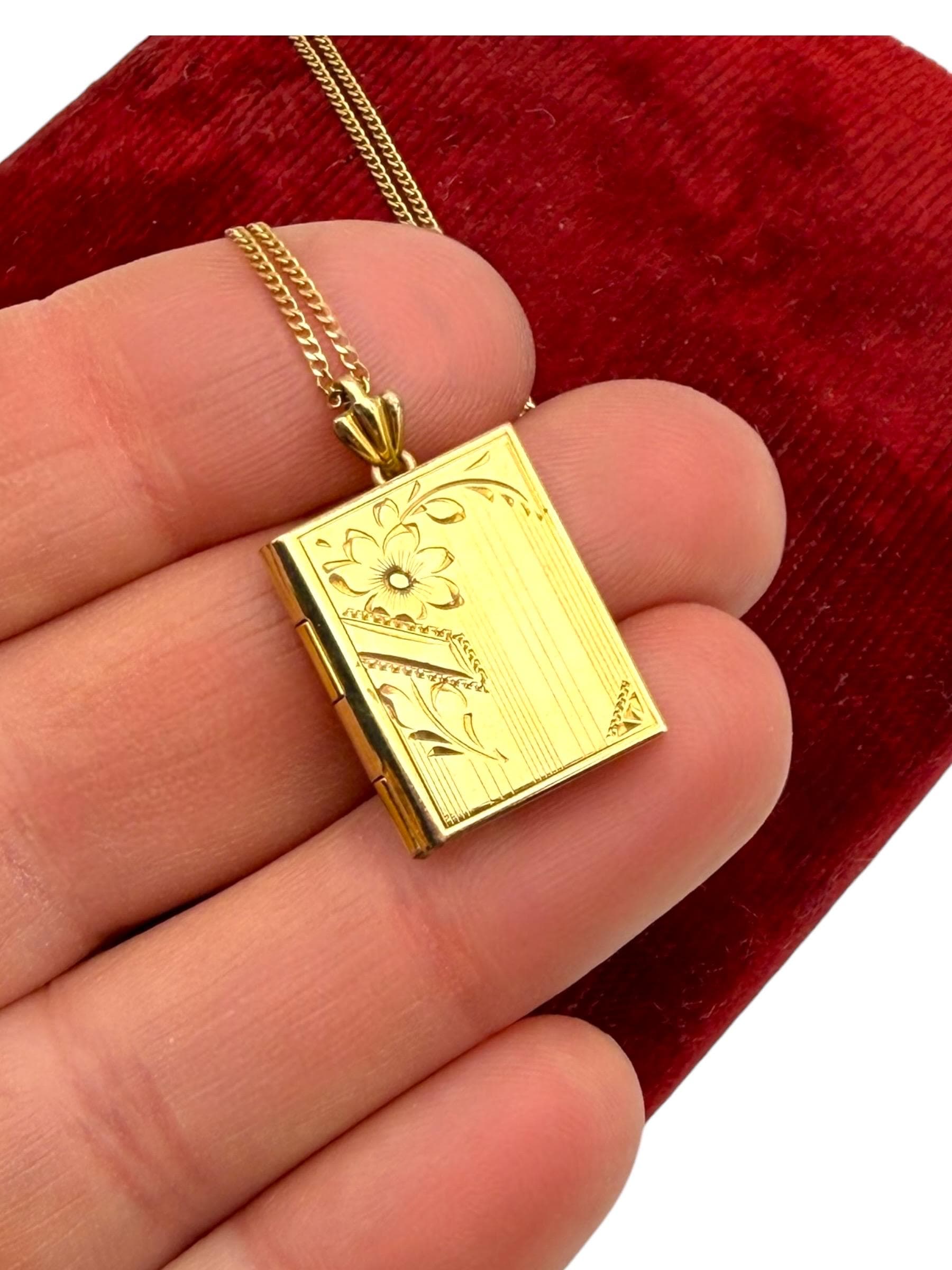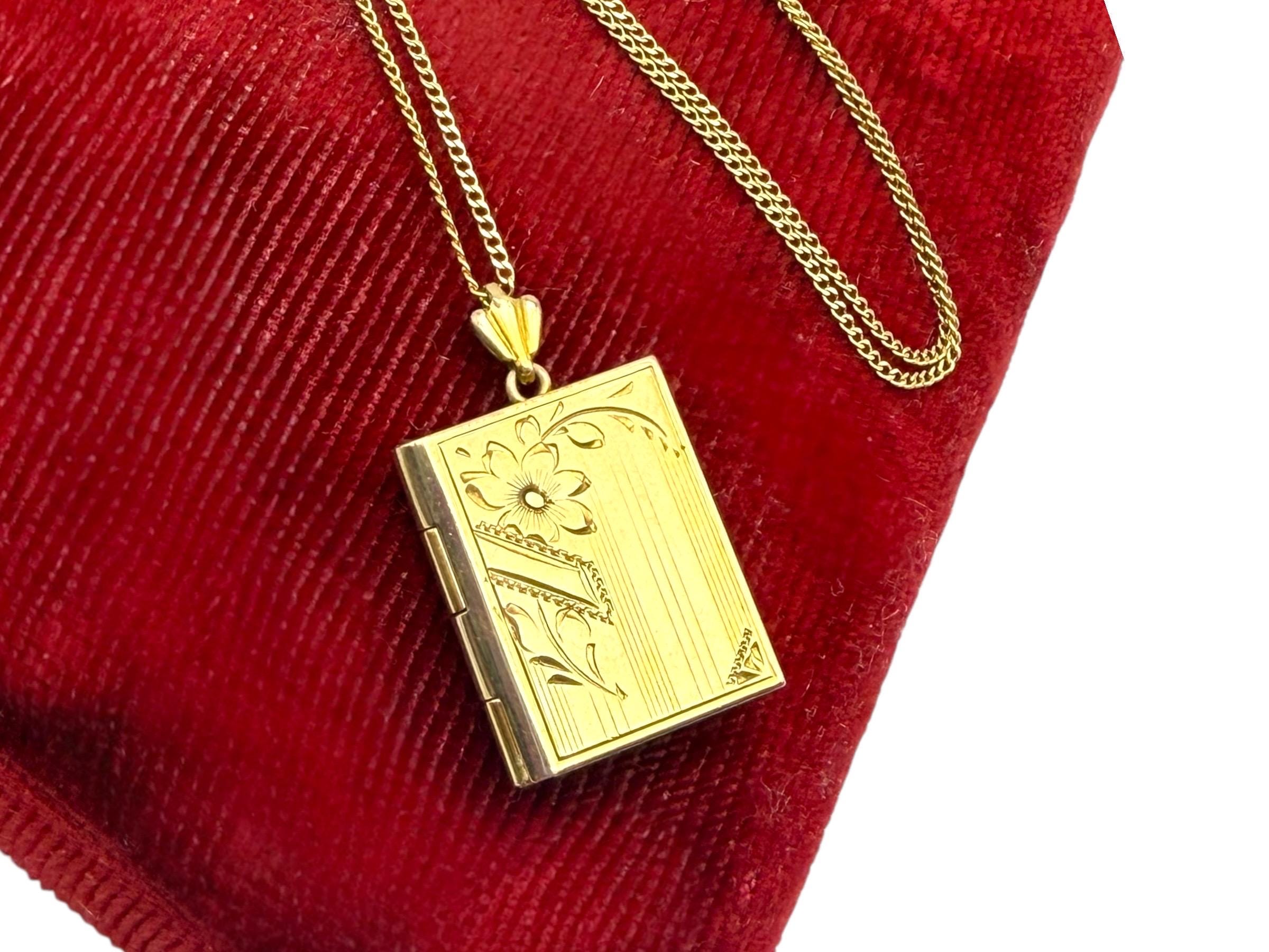 Beautiful gold filled book shaped locket with an etched design on the front. The Inside of the locket remains empty, and is ready to hold your photographs. There are two rectangles on the interior for photos. Original photo frames, plastic covers and red foil backings remain.