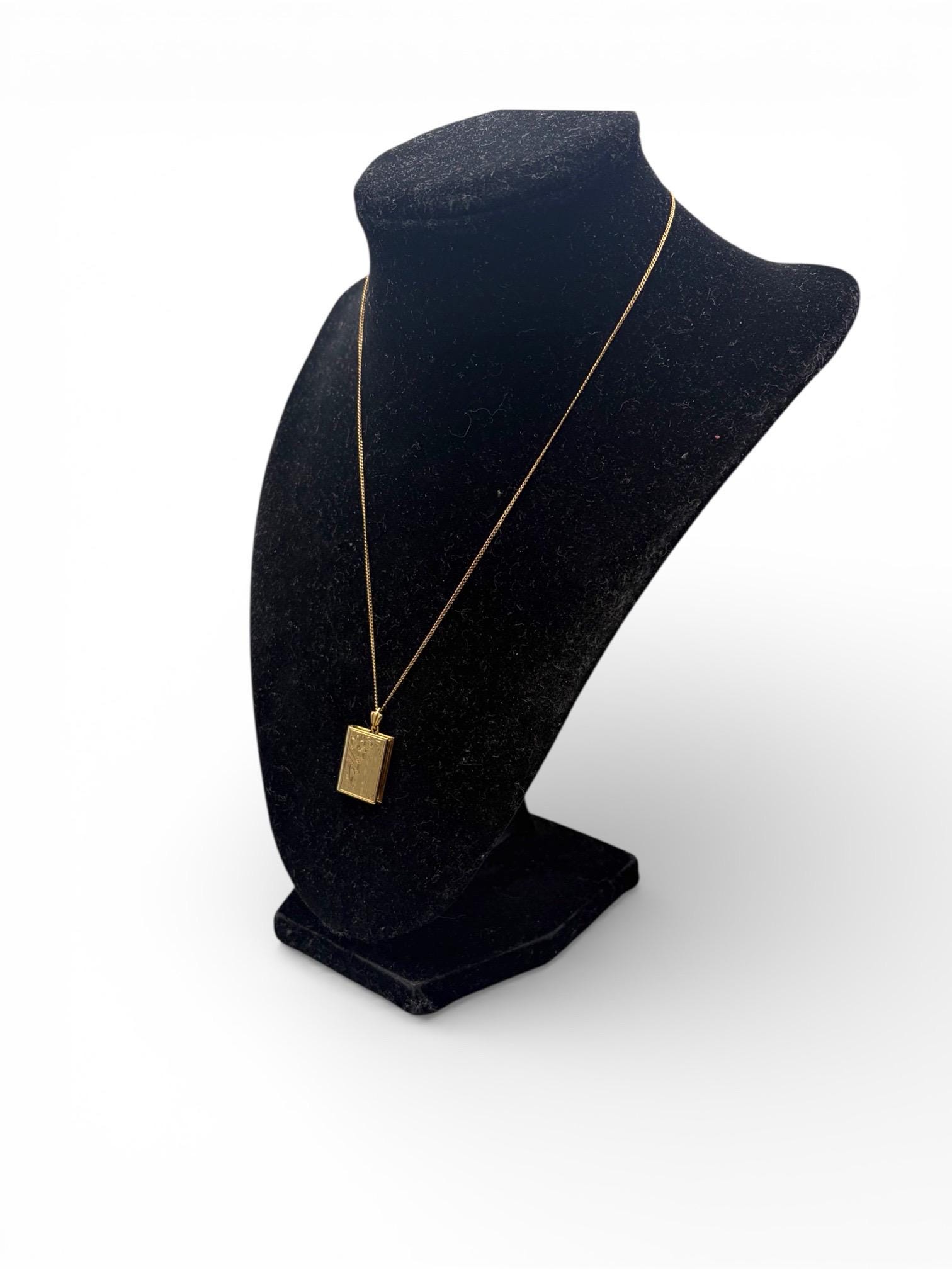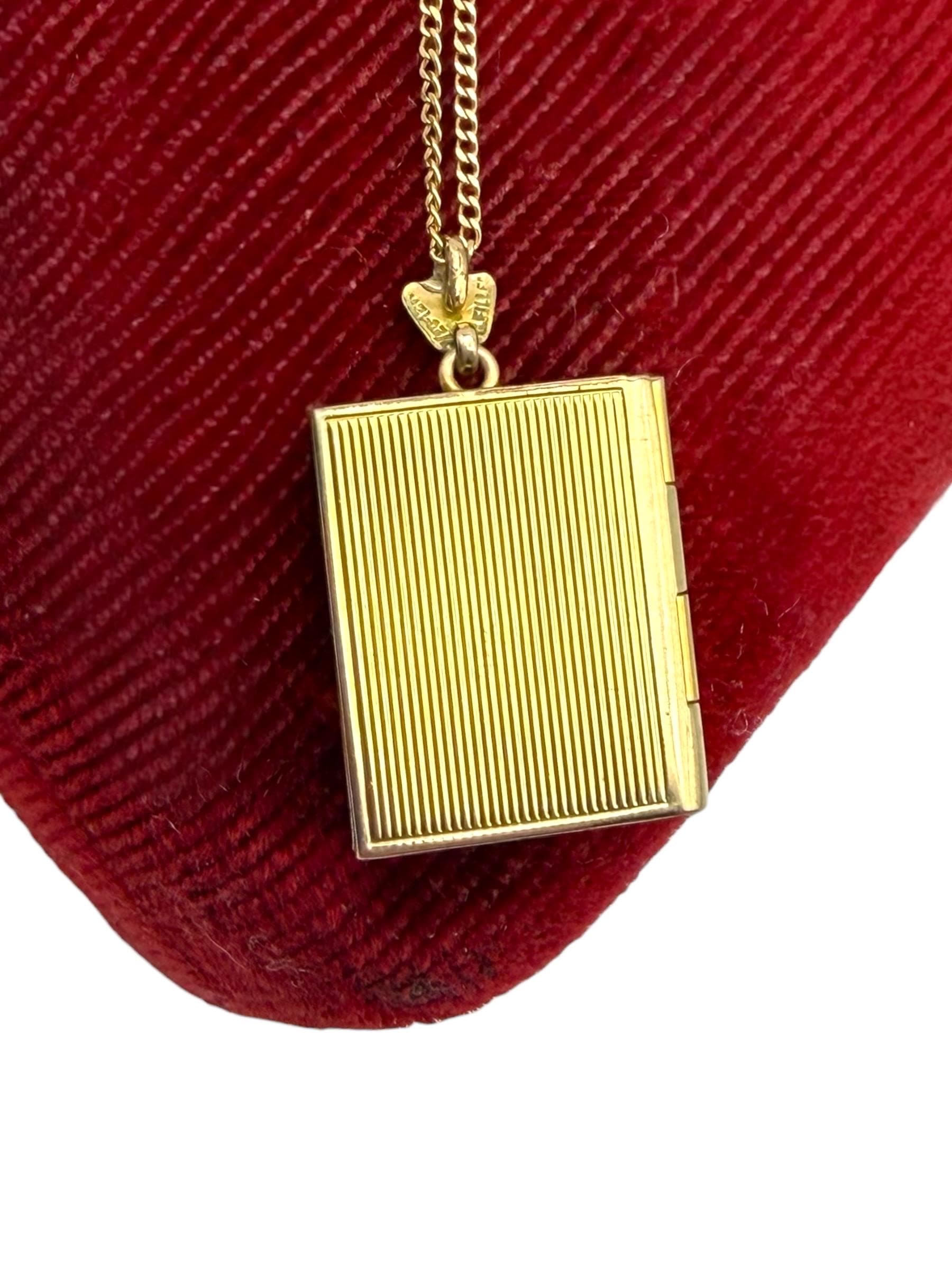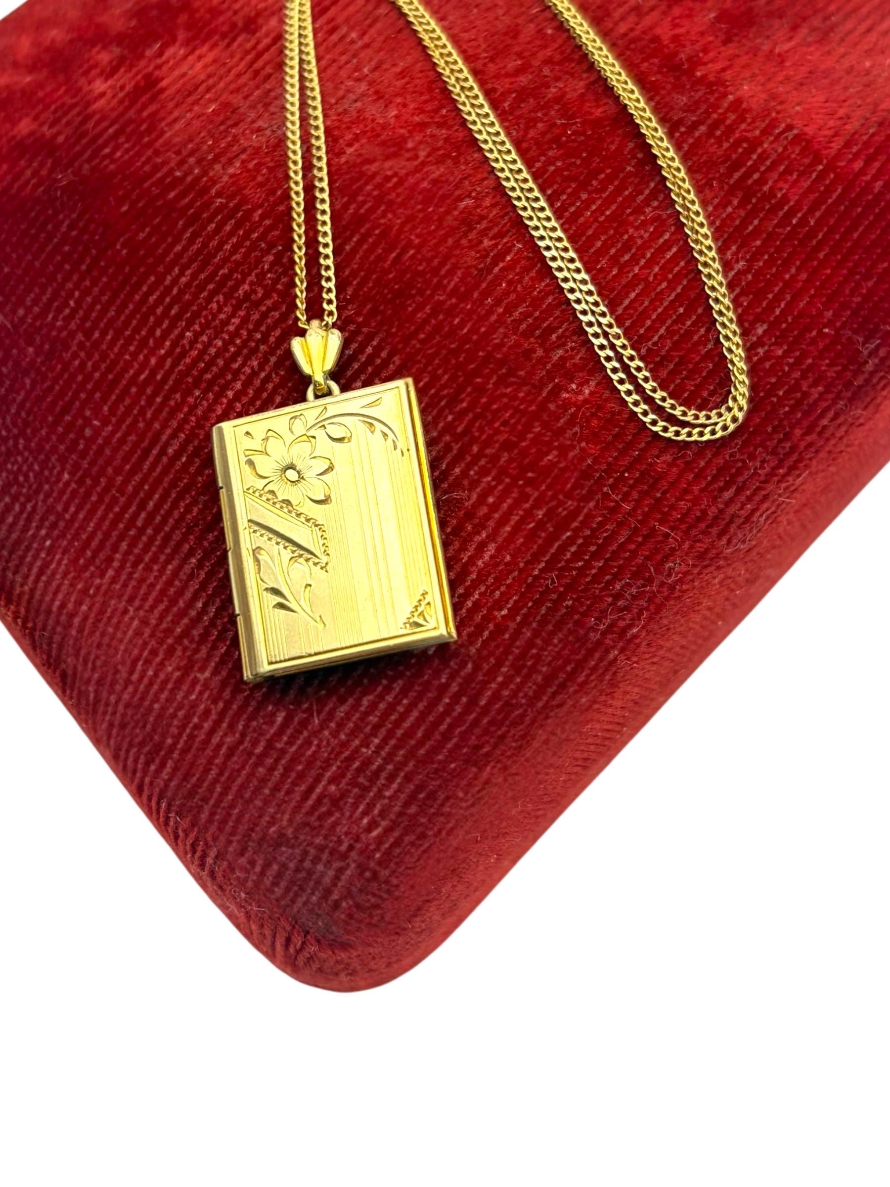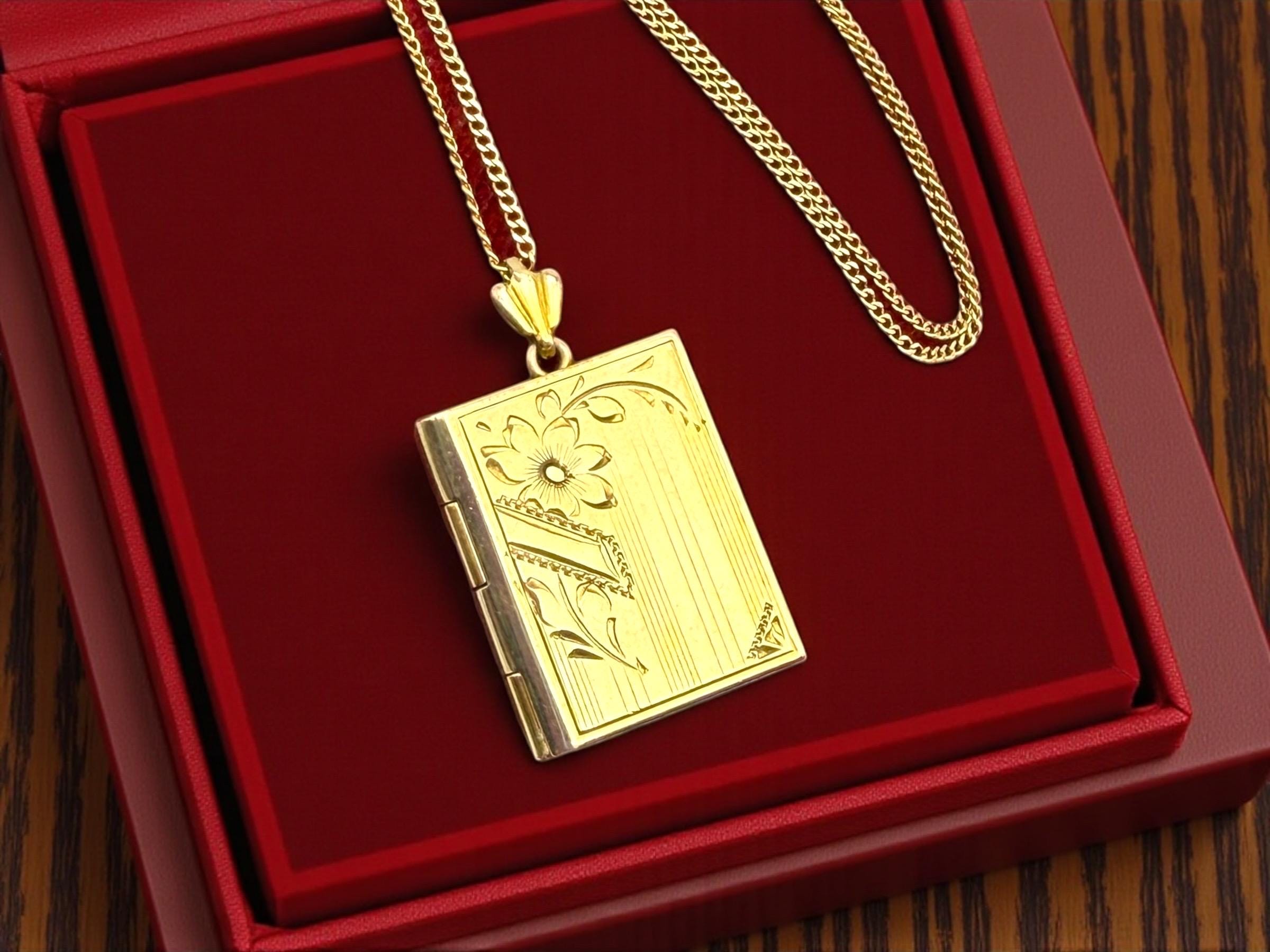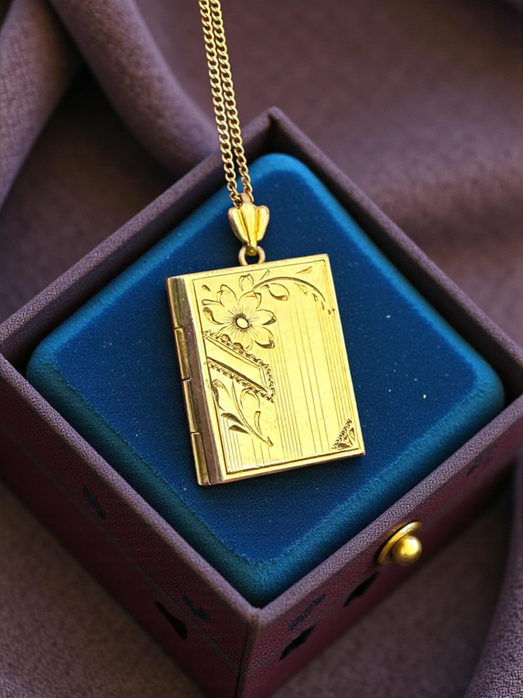 Beautiful gold filled book shaped locket with an etched design on the front. The Inside of the locket remains empty, and is ready to hold your photographs. There are two rectangles on the interior for photos. Original photo frames, plastic covers and red foil backings remain.