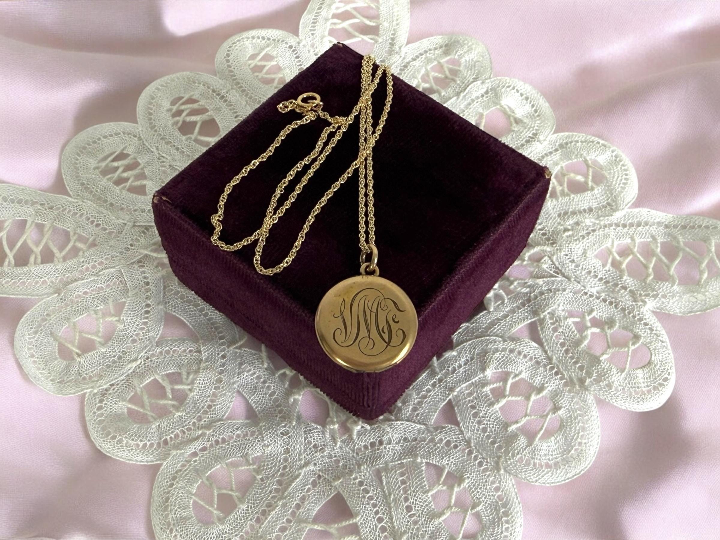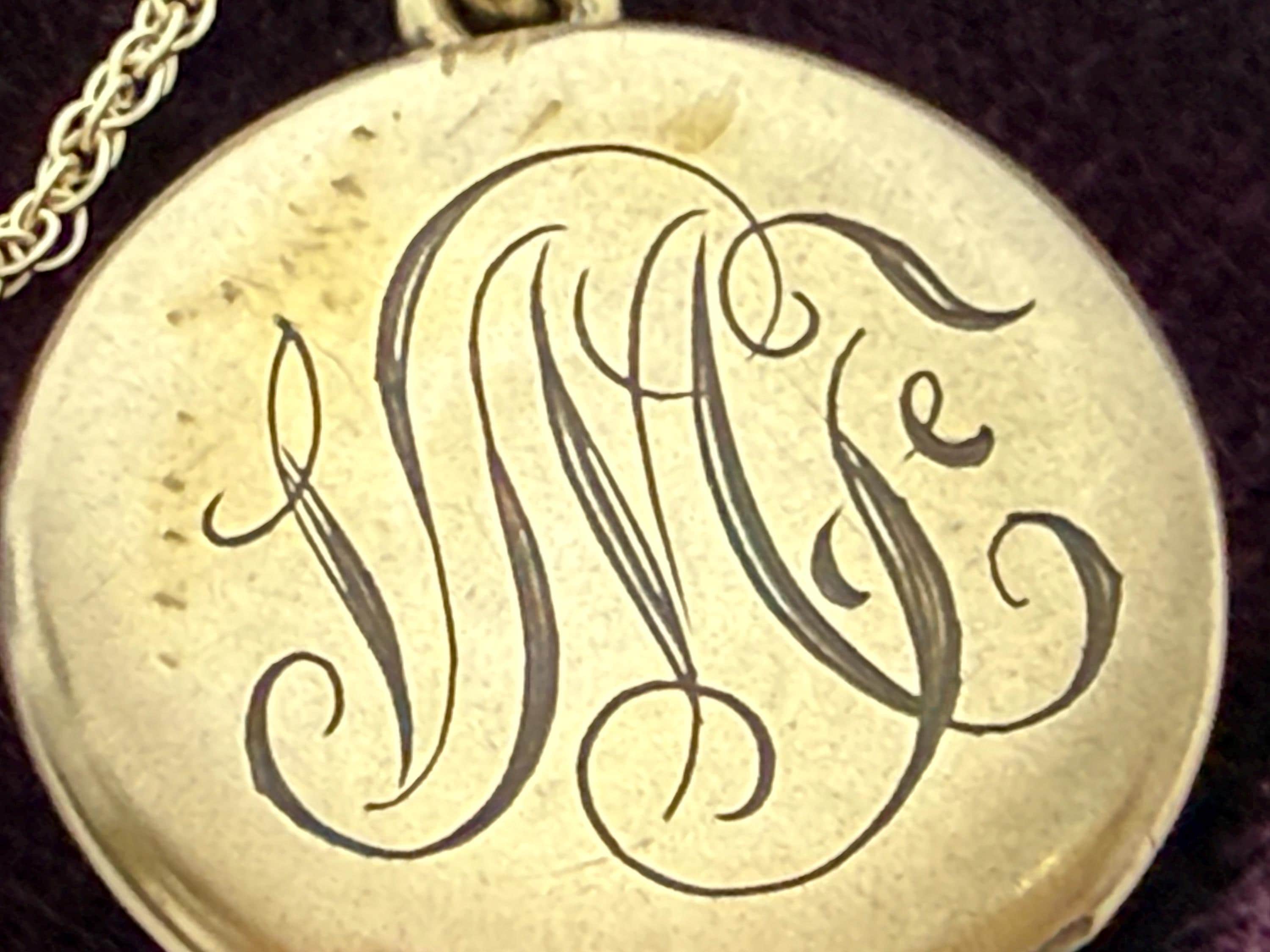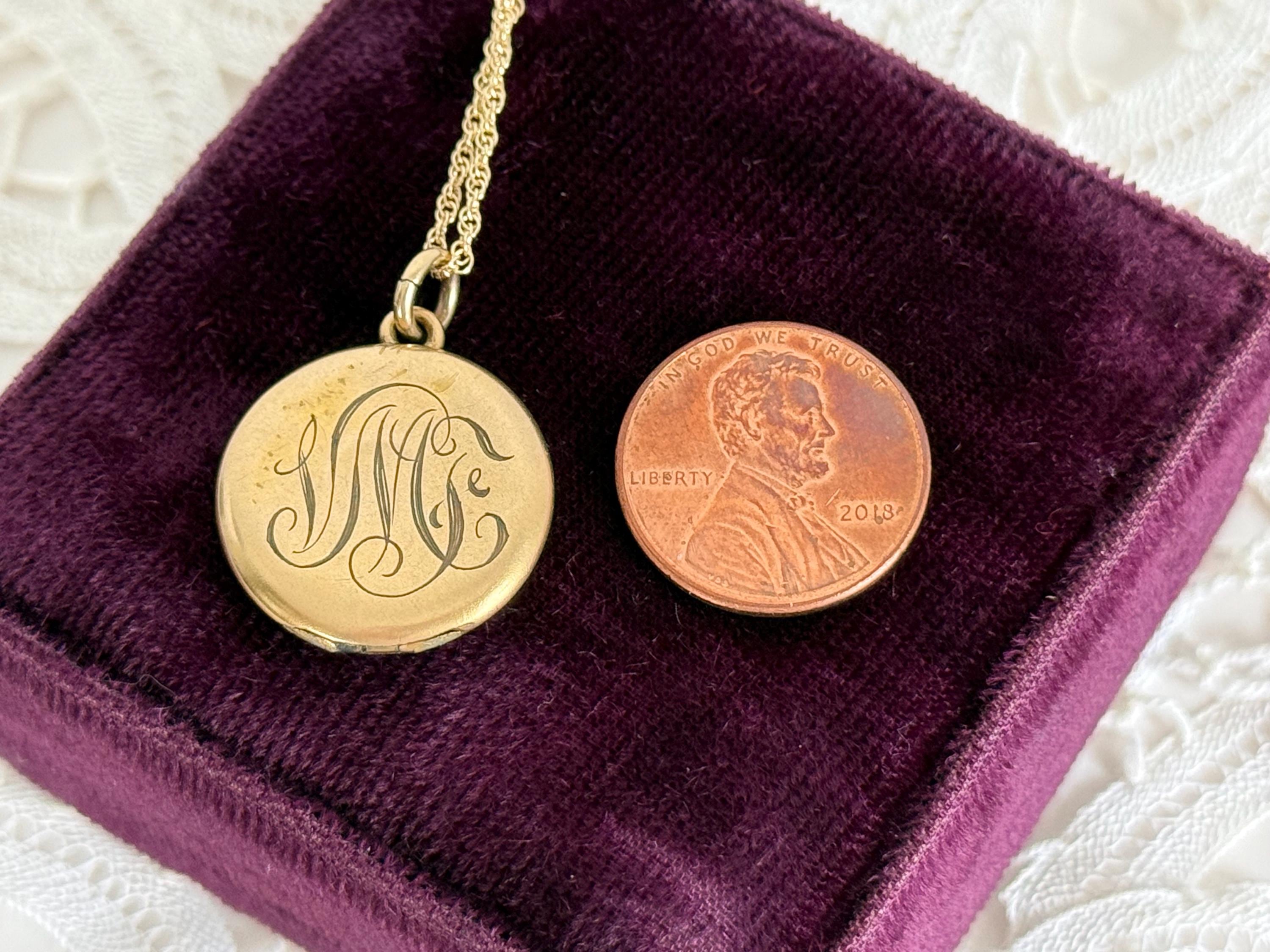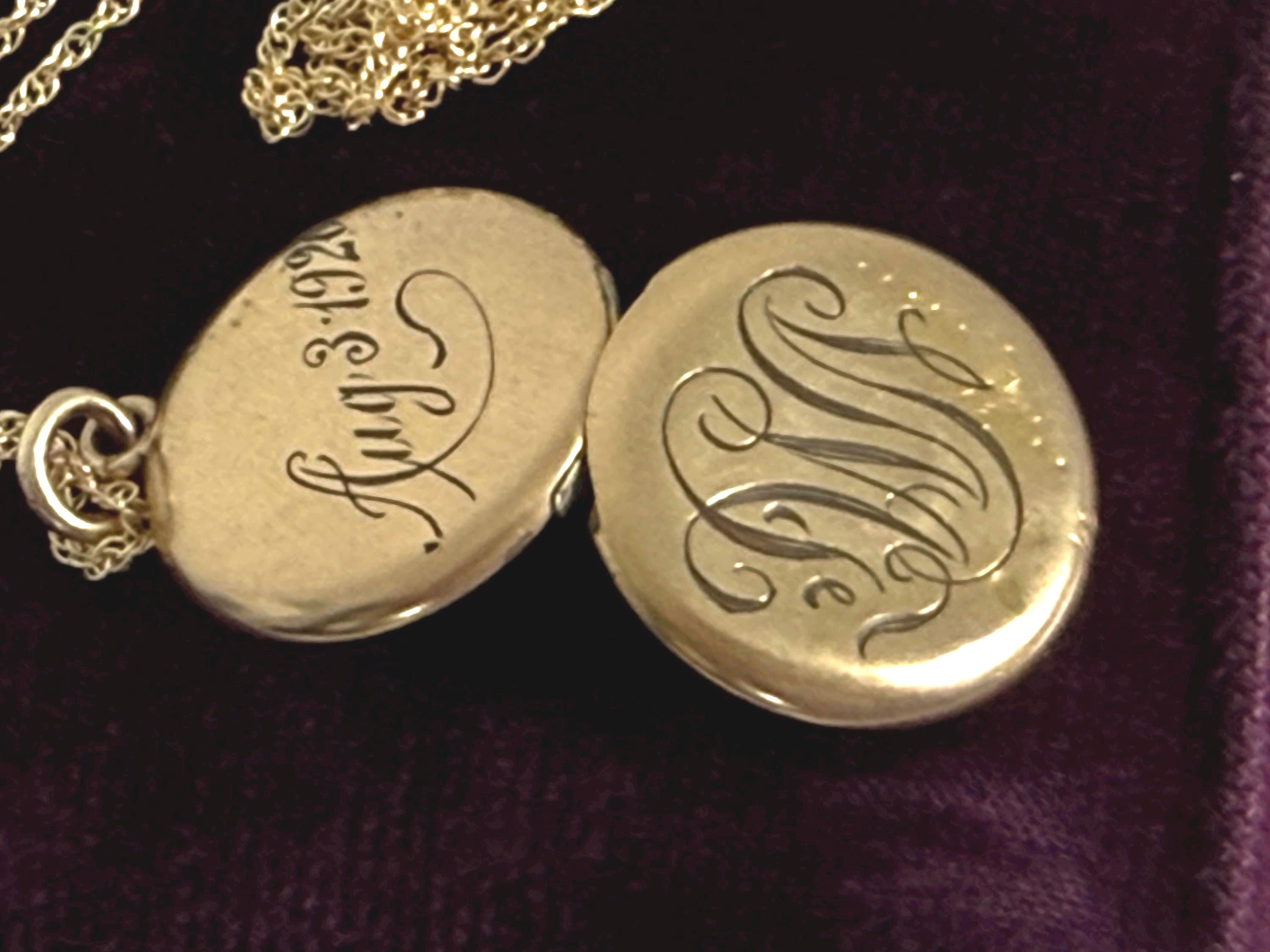 This locket necklace is in fair antique condition with wear commensurate with age, dated 1920. The monogrammed side has some indentations at the top and center. There is the faint outline of a circle from the inner well (from the raised maker’s mark inside) that can be seen on the monogrammed side. See photos for details. While it has signs of wear, this antique locket still looks very sweet!