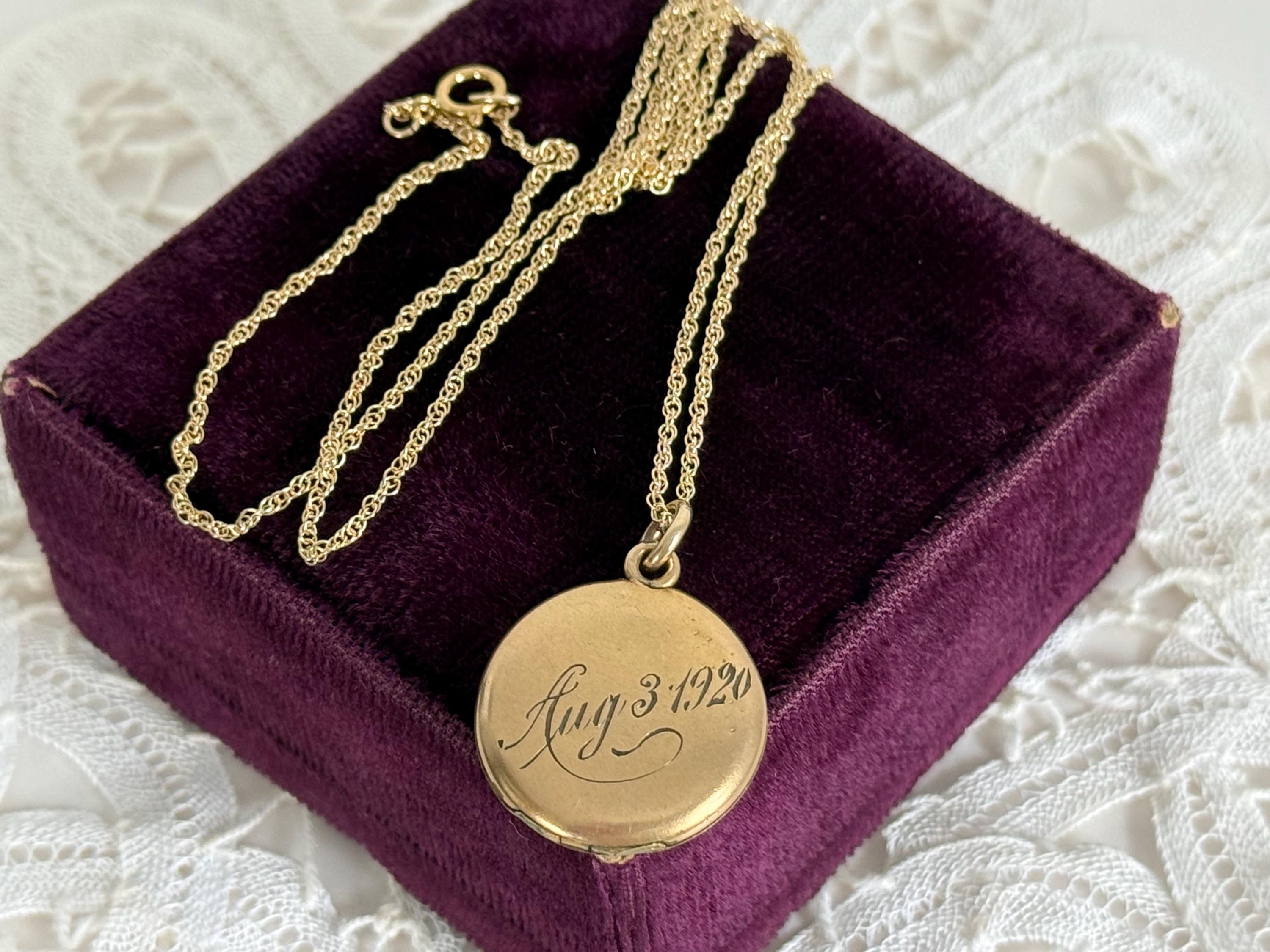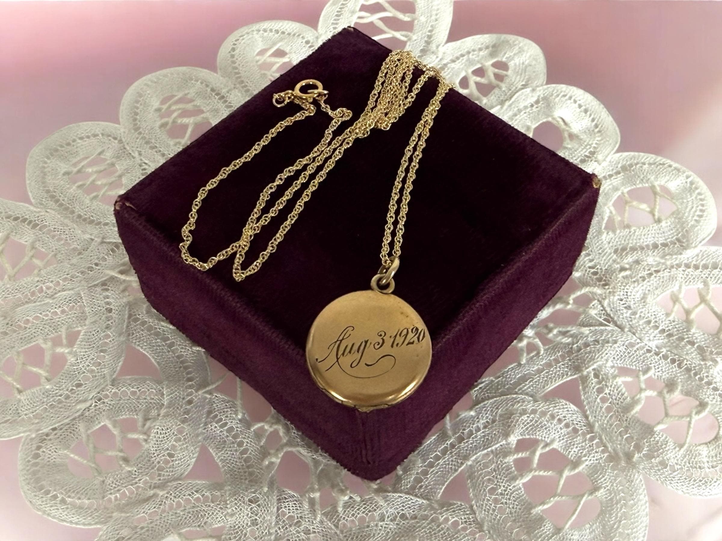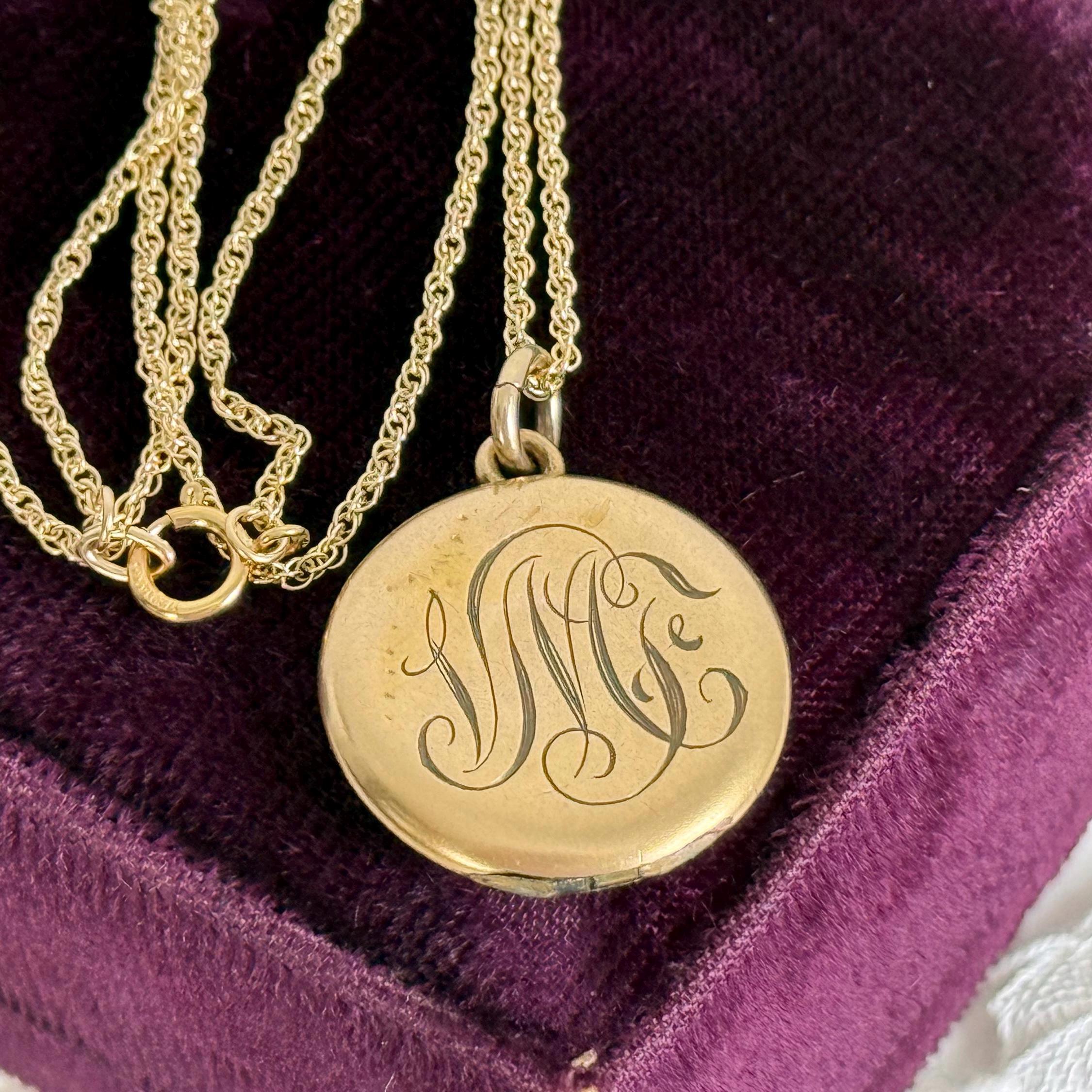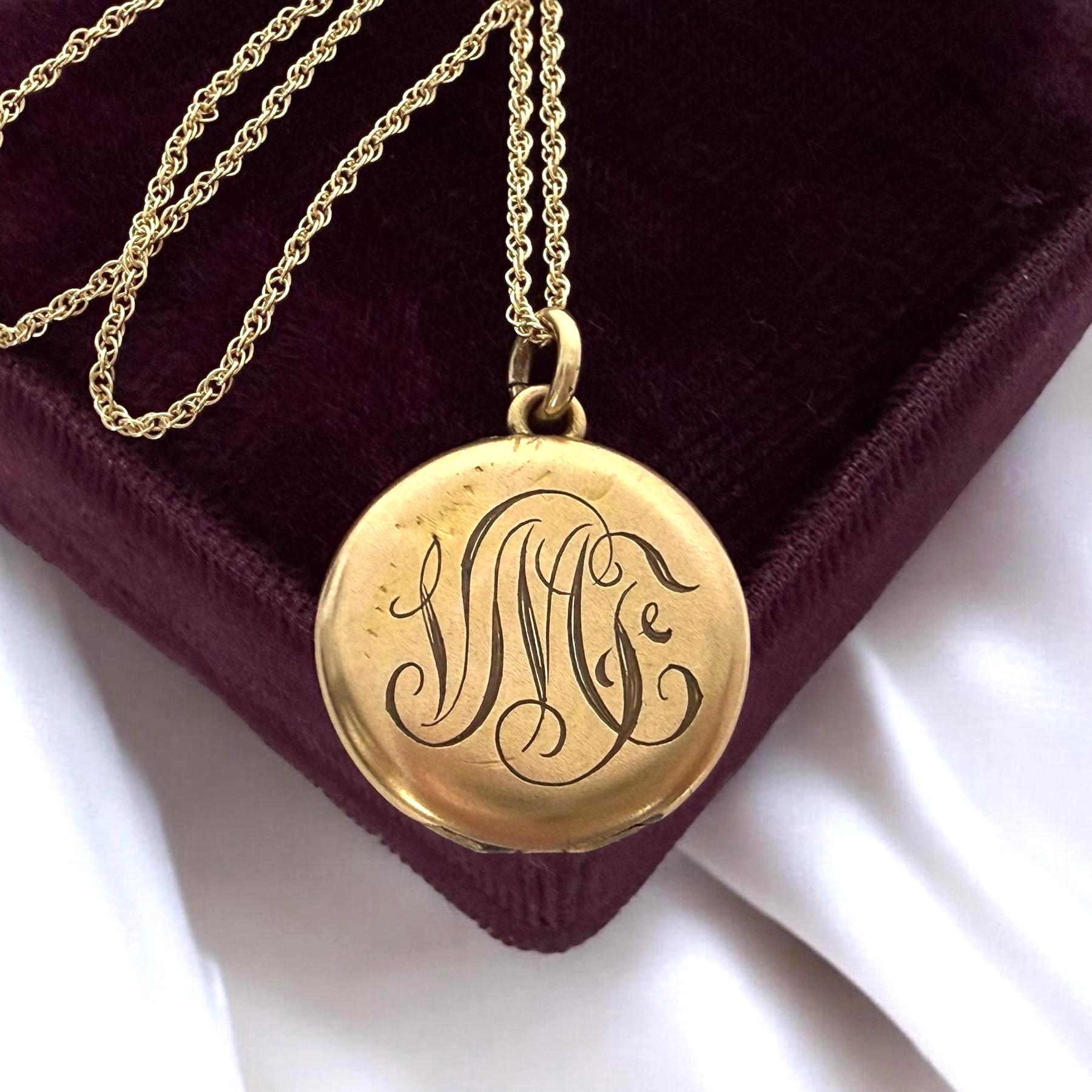 This locket necklace is in fair antique condition with wear commensurate with age, dated 1920. The monogrammed side has some indentations at the top and center. There is the faint outline of a circle from the inner well (from the raised maker’s mark inside) that can be seen on the monogrammed side. See photos for details. While it has signs of wear, this antique locket still looks very sweet!