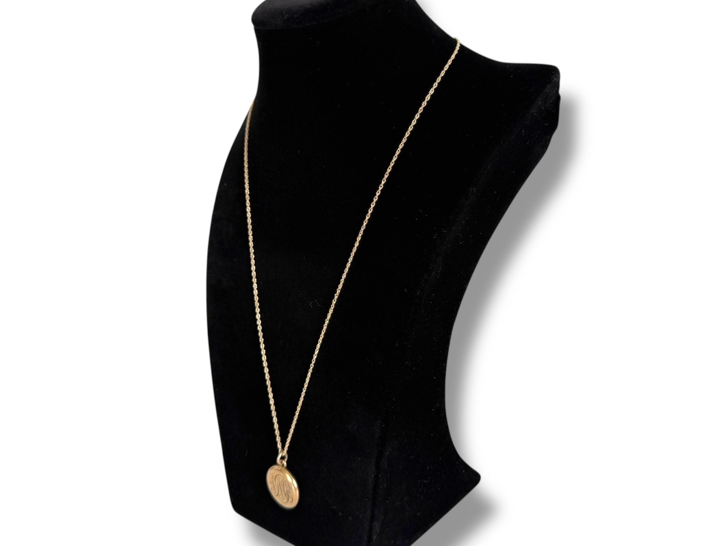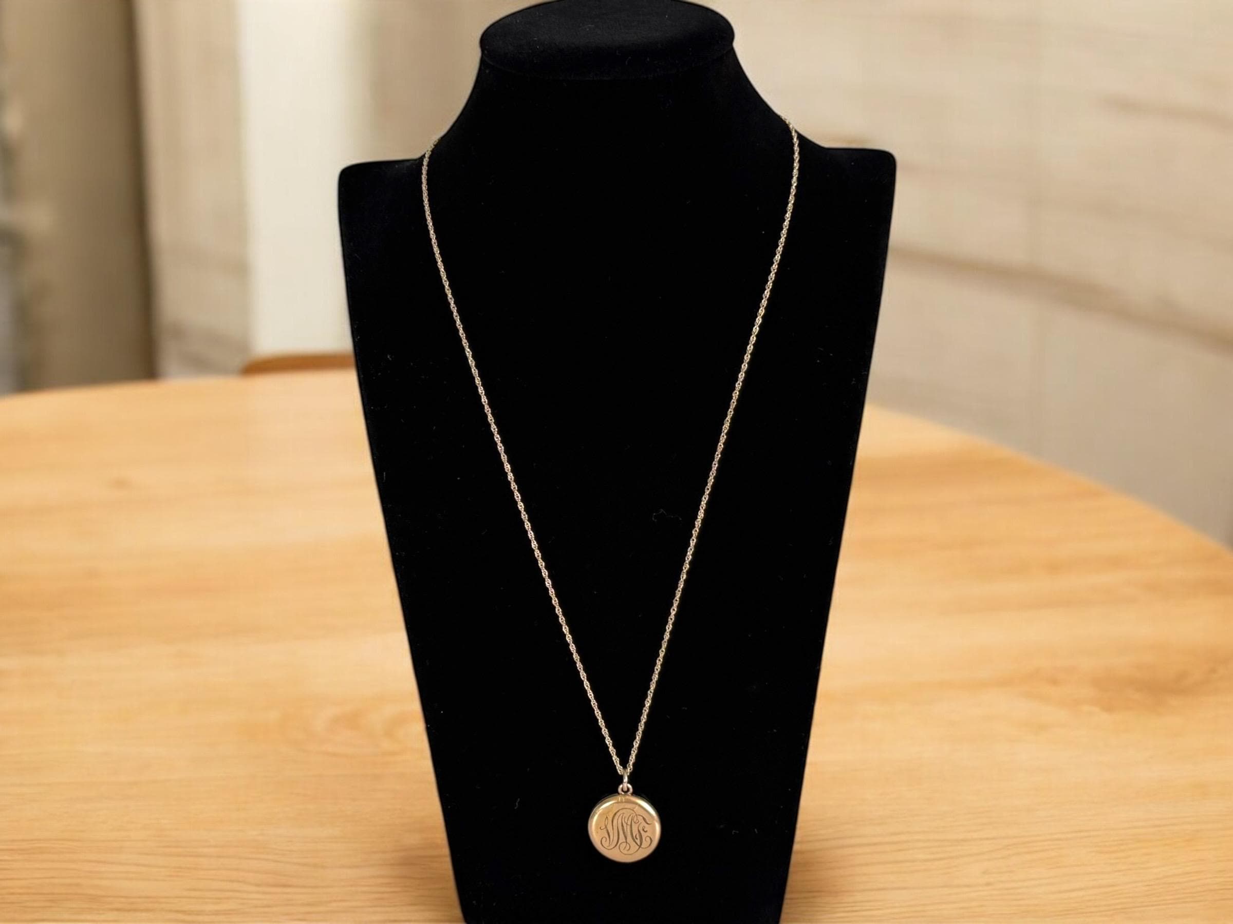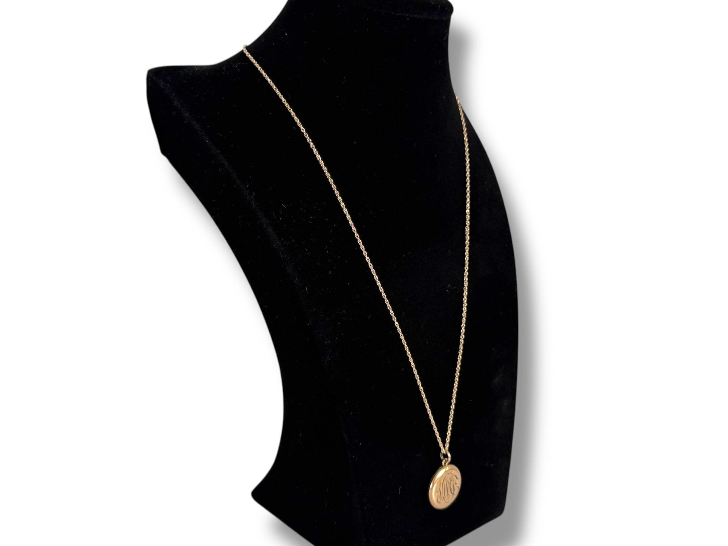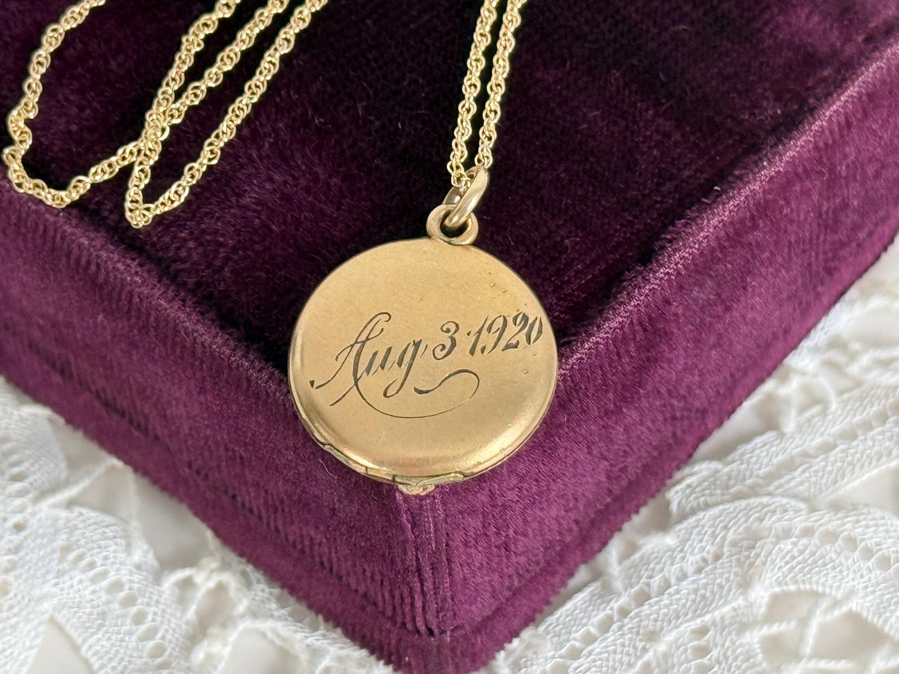 This locket necklace is in fair antique condition with wear commensurate with age, dated 1920. The monogrammed side has some indentations at the top and center. There is the faint outline of a circle from the inner well (from the raised maker’s mark inside) that can be seen on the monogrammed side. See photos for details. While it has signs of wear, this antique locket still looks very sweet!