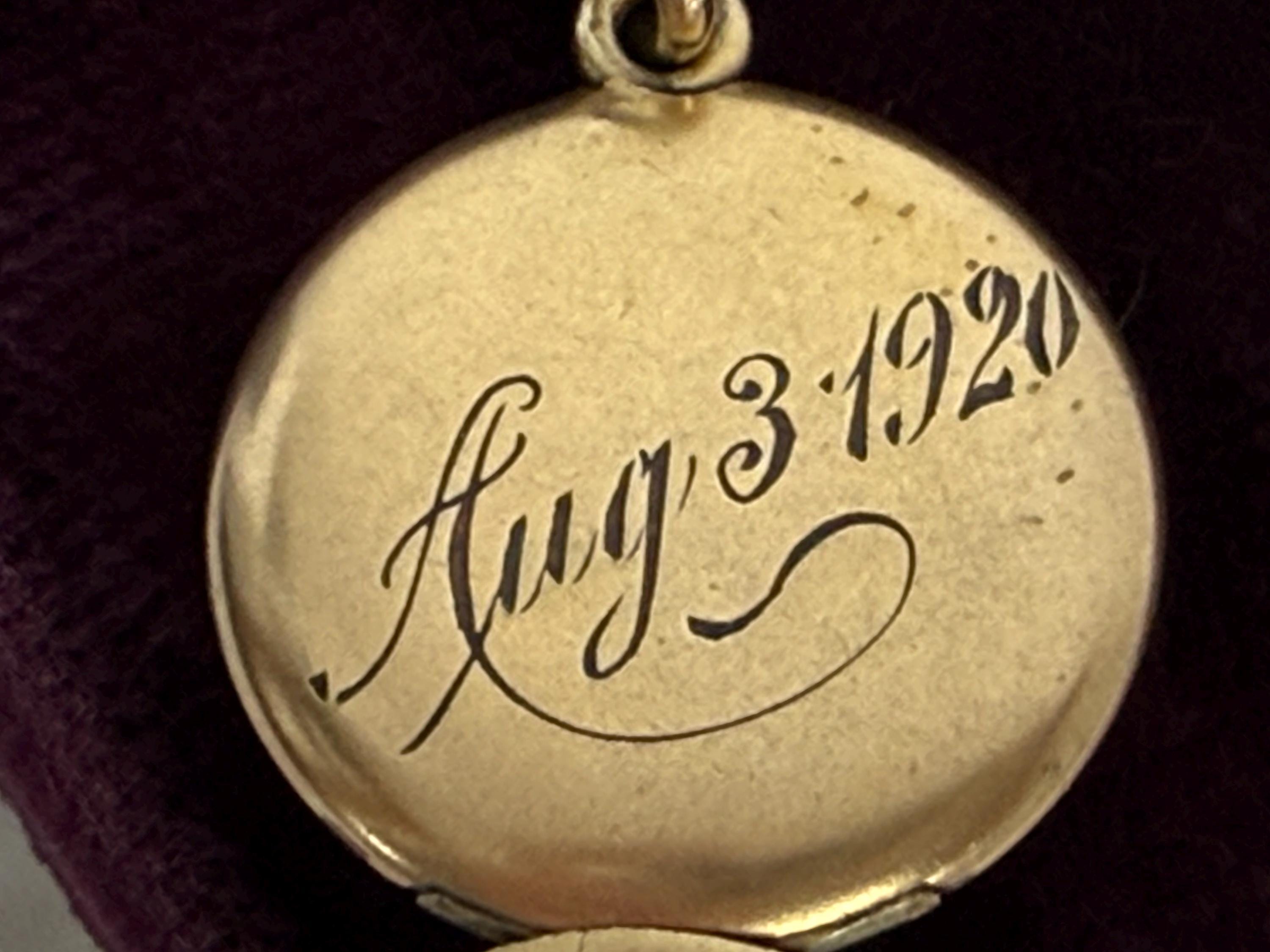 The front of this small round antique locket features the date Aug 3 1920 in an old cursive font. The other side, the back, has the engraved initials VMF in an old cursive font.