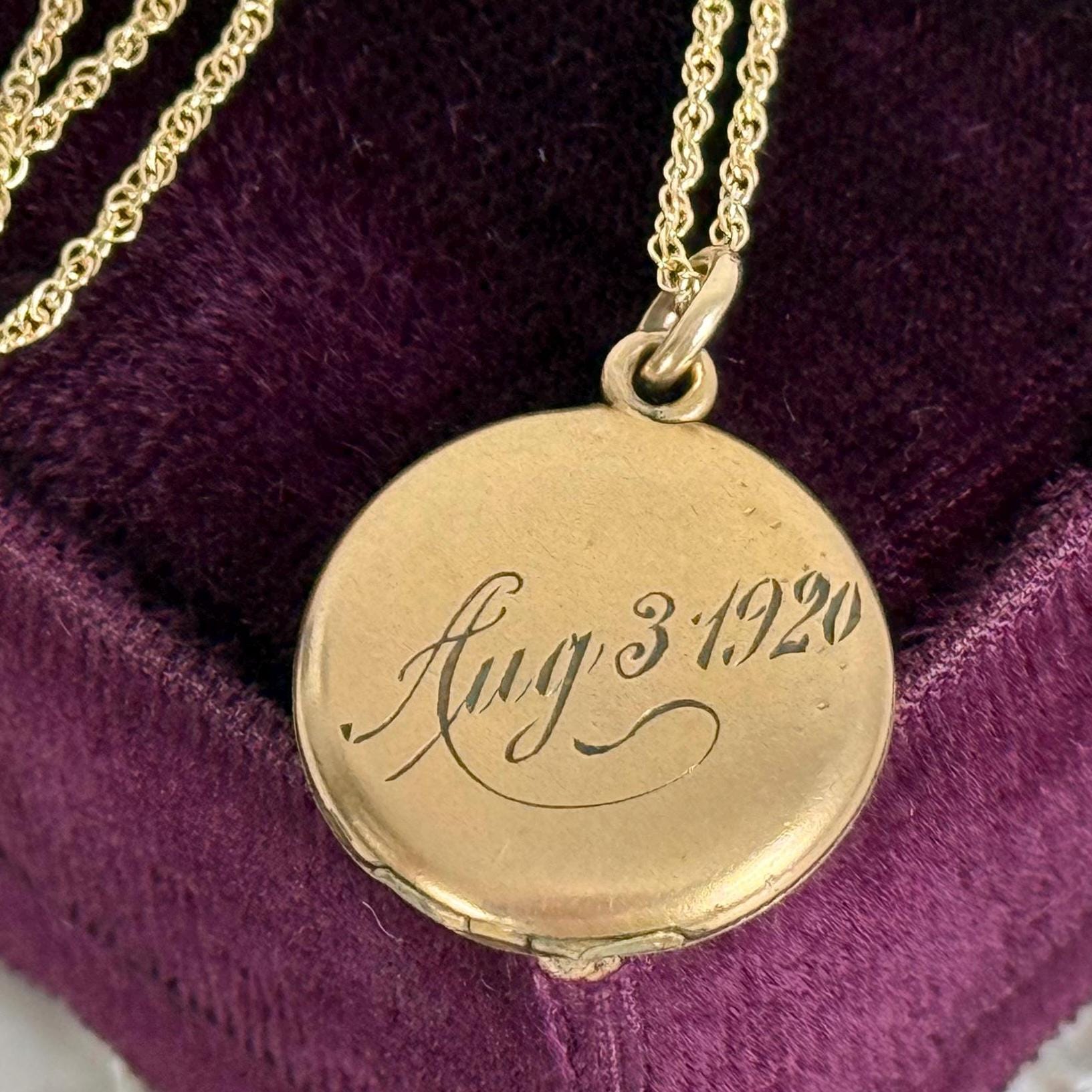 Beautiful and petite round gold filled locket featuring the date Aug 3 1920 date on one side, and an etched monogram of VMF on the other side. We call this a "Timeworn Treasure" as it shows wear from the past but still has charm for the wear in the present.