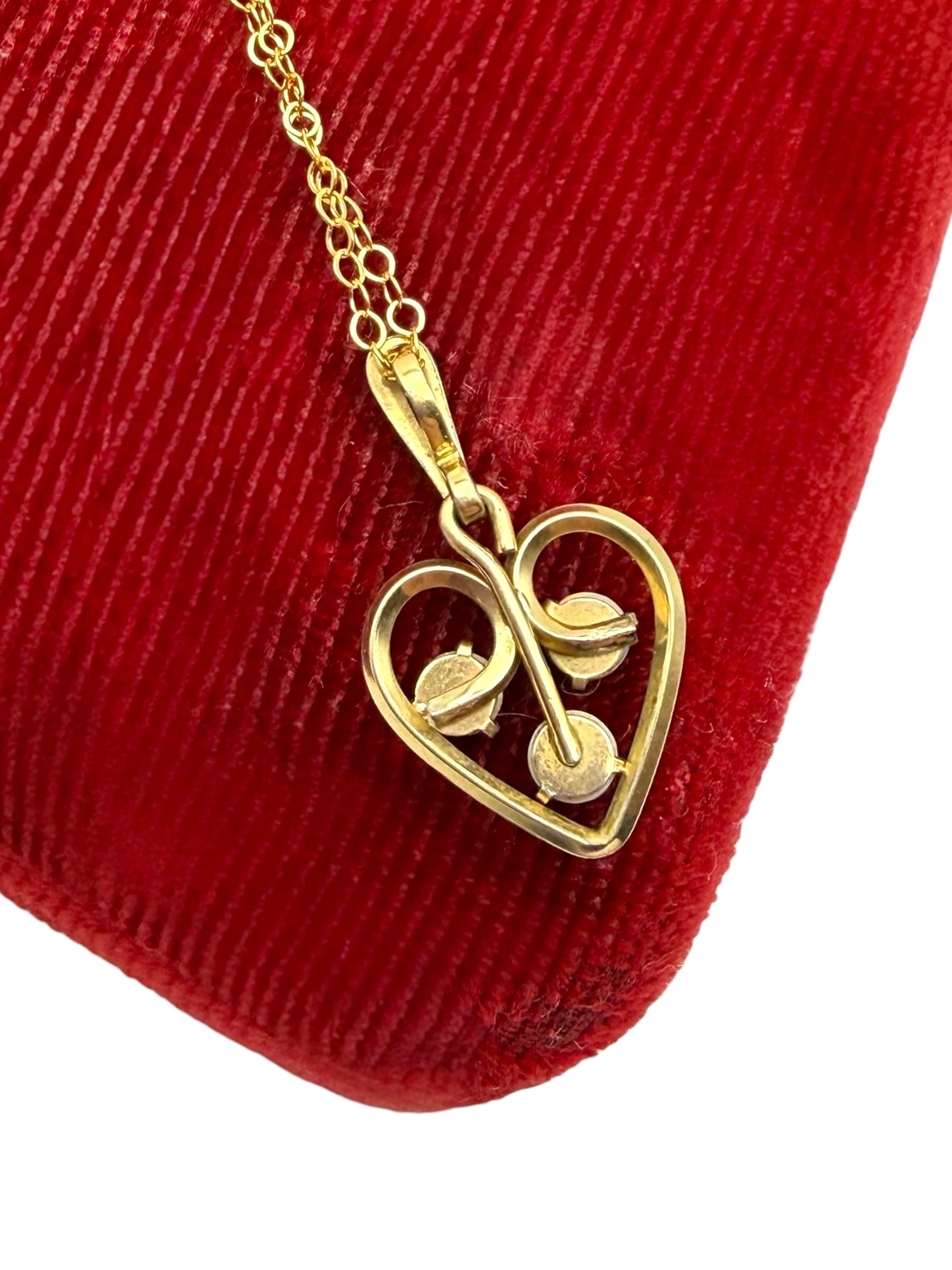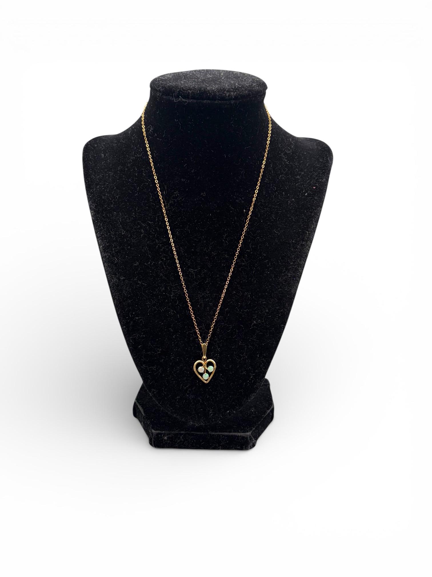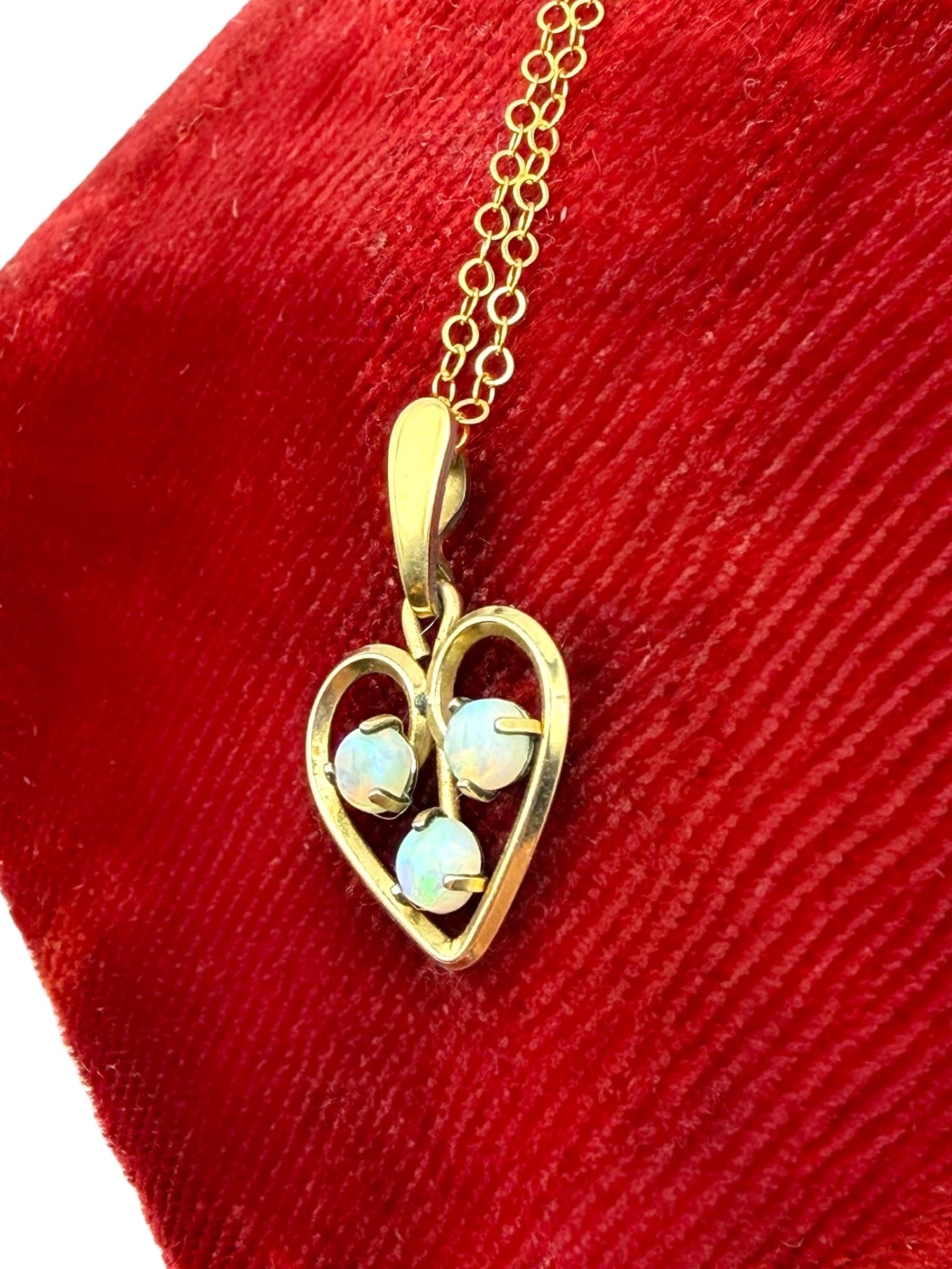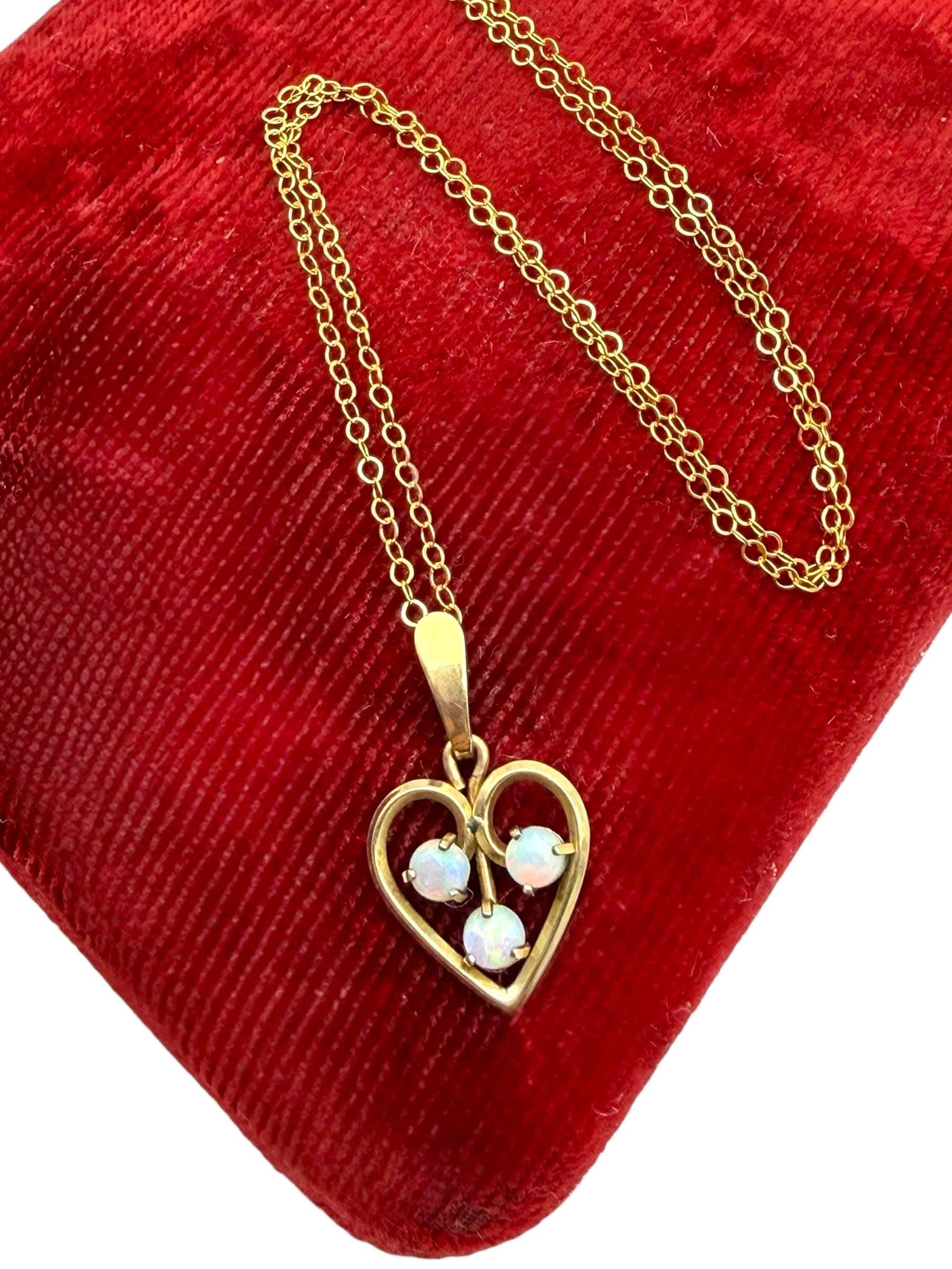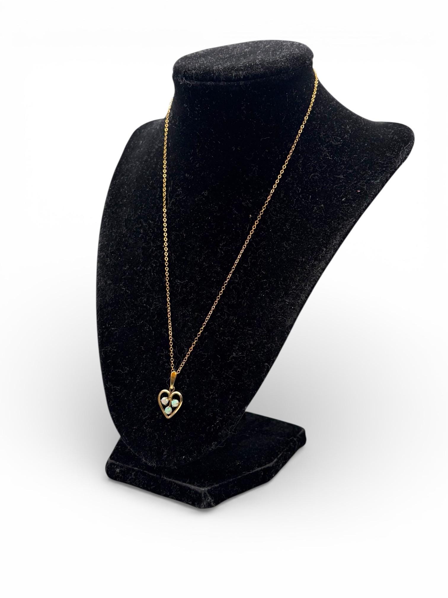 A sweet gold tone heart pendant with three opal cabachons. This adorable necklace comes on a dainty 18'' long 14K GF chain.