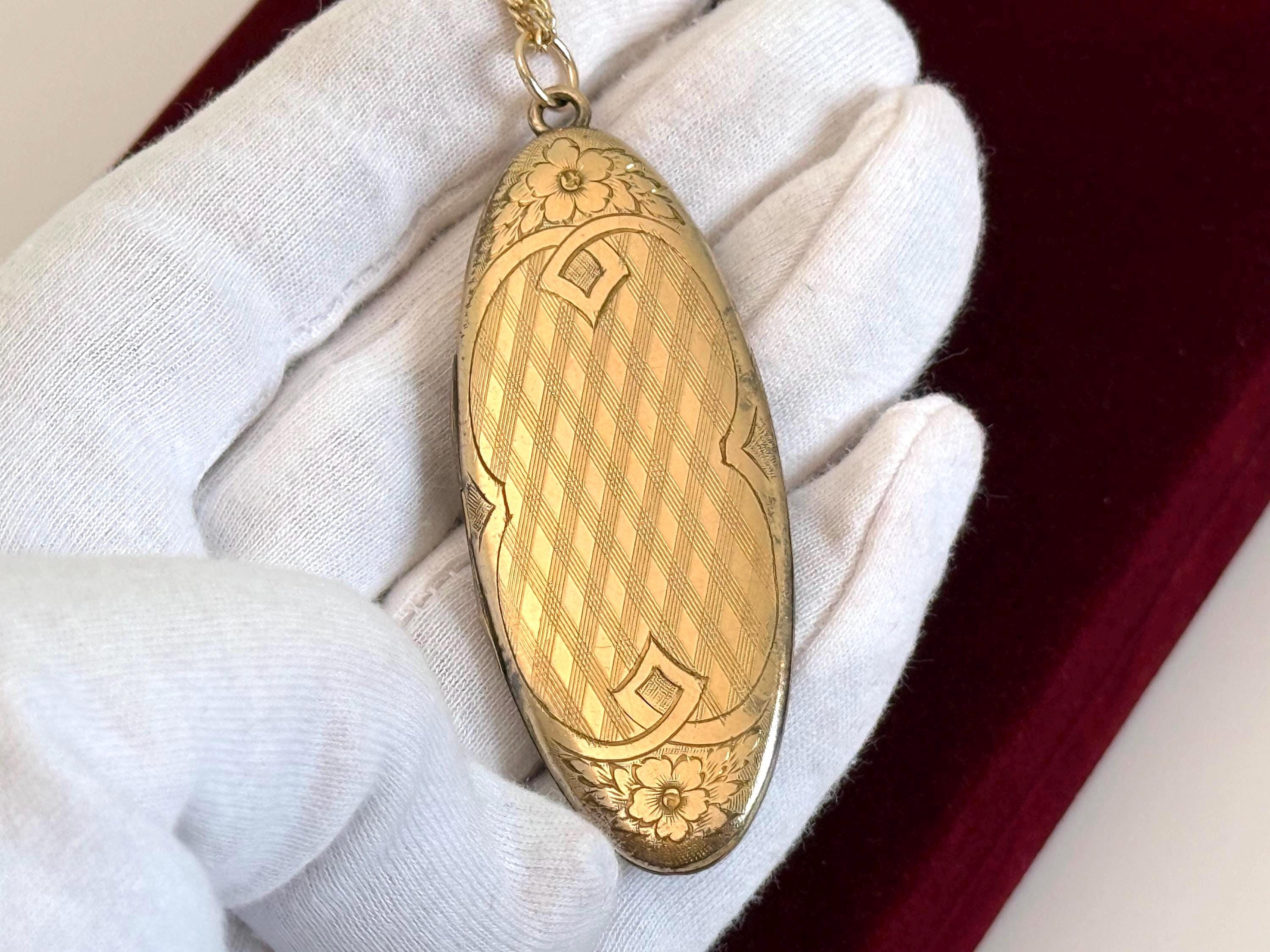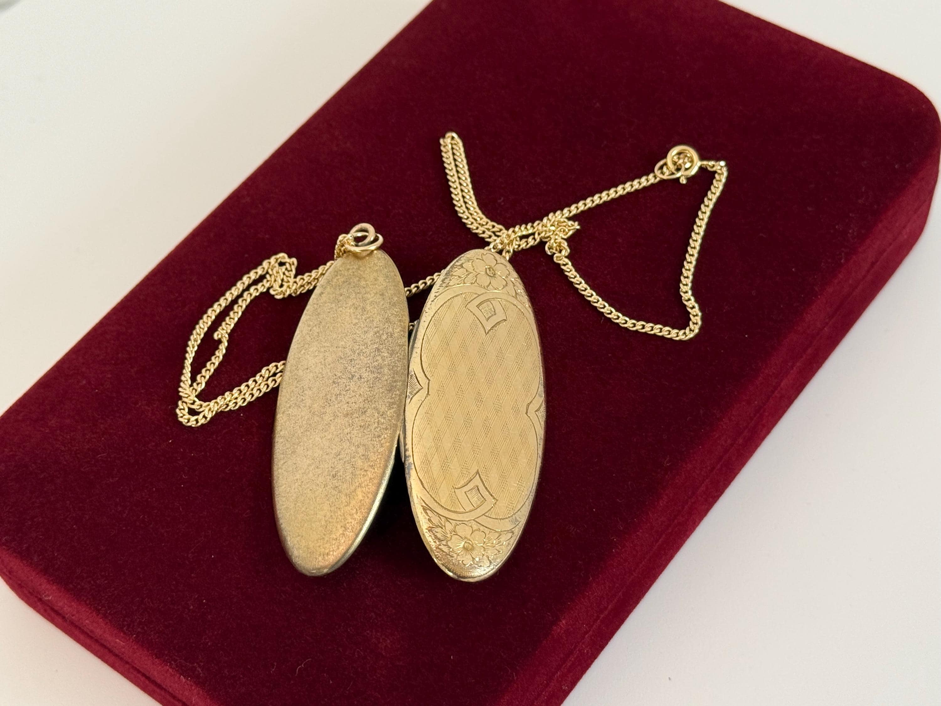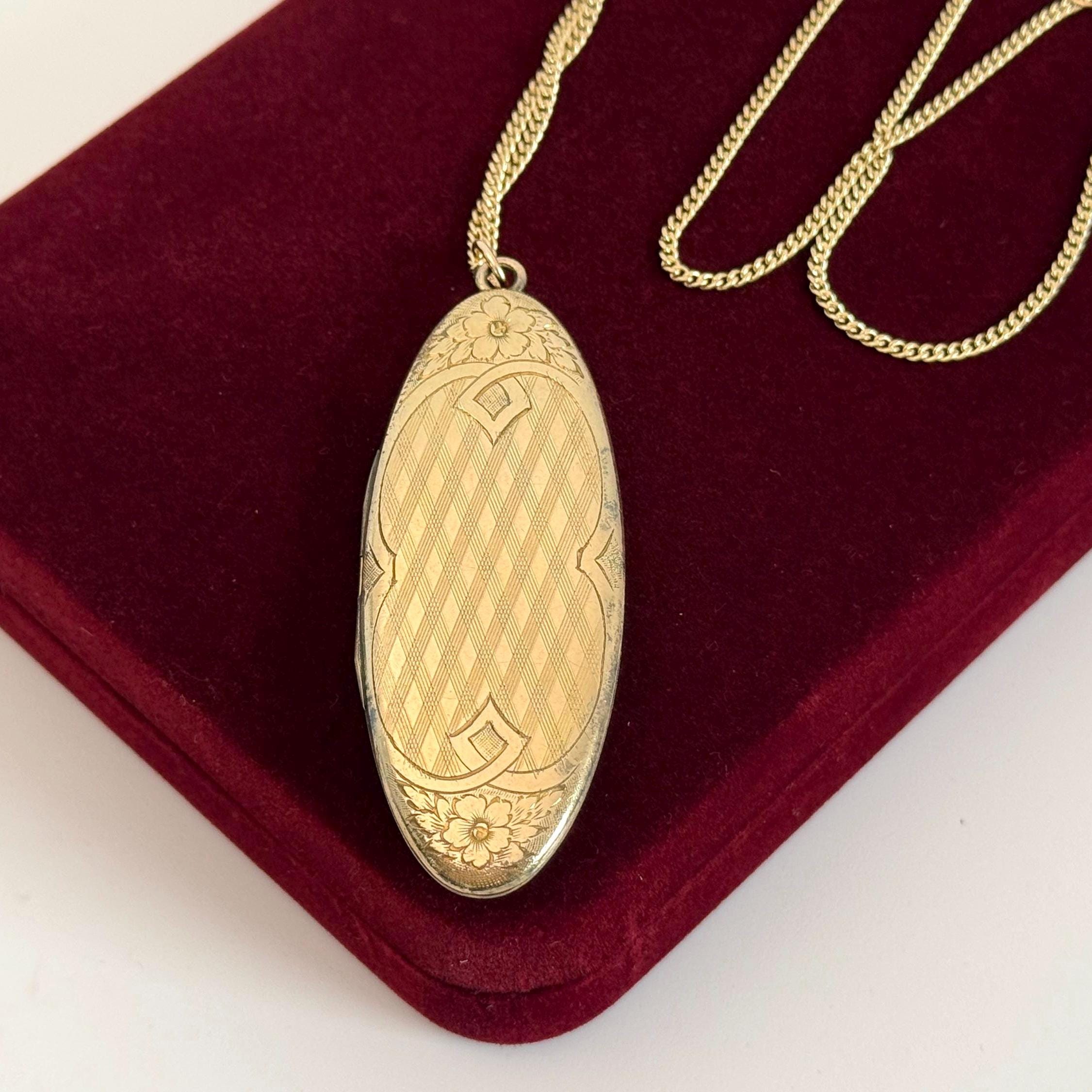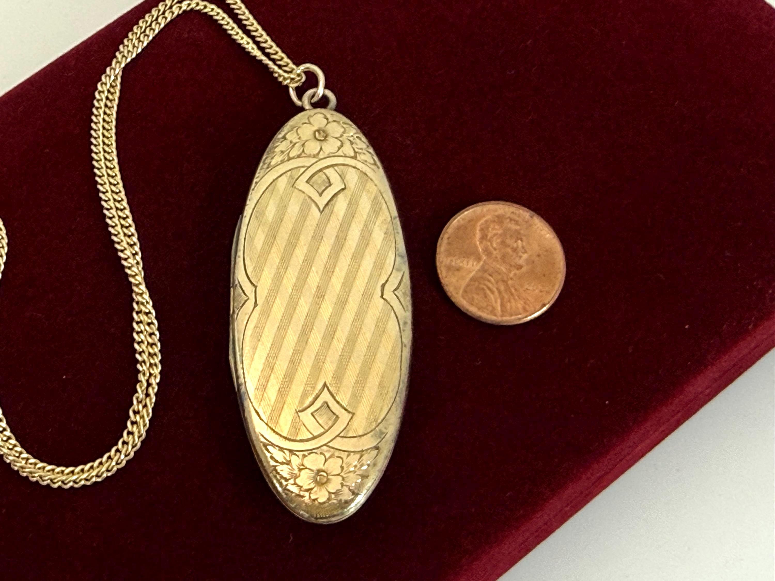 Antique LARGE Oval Gold Filled Floral Locket Necklace, Etched Design, 2 Photo Wells