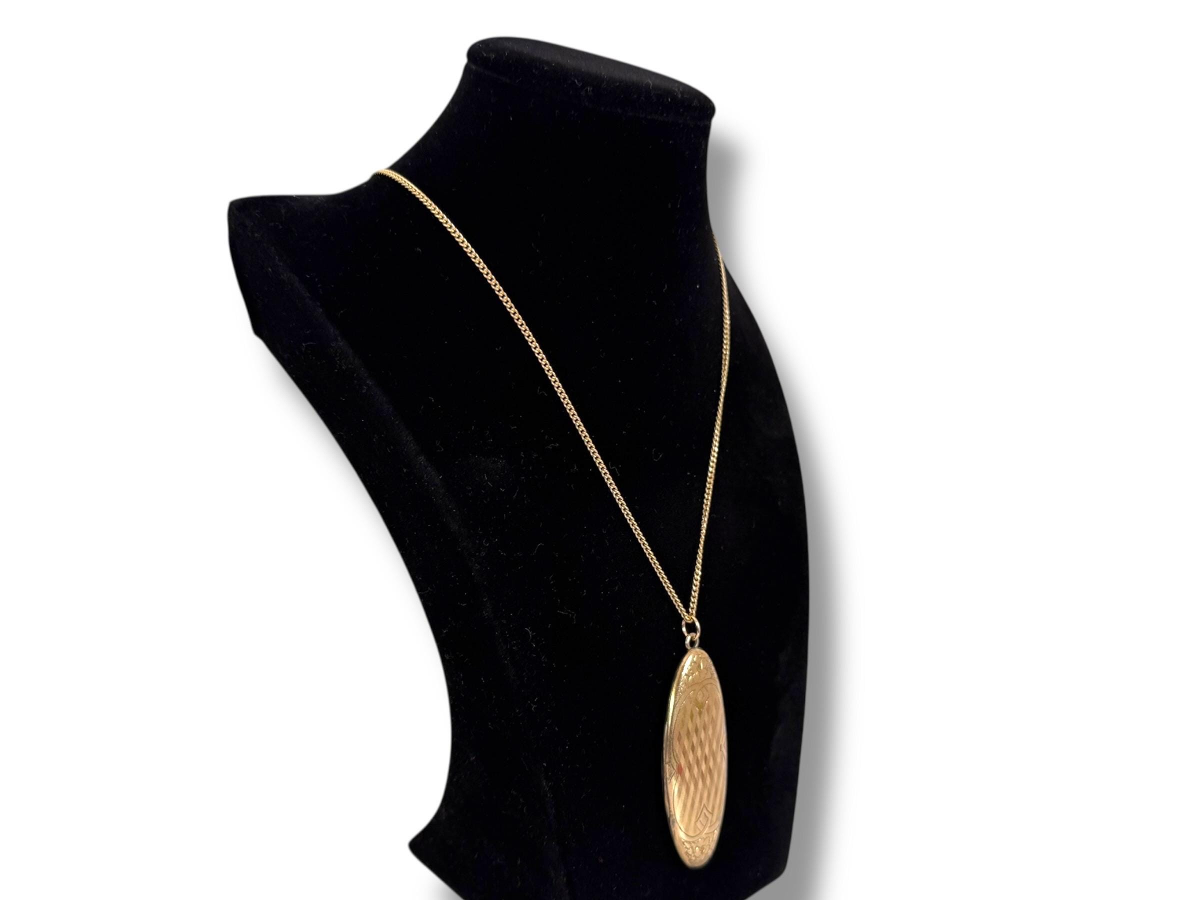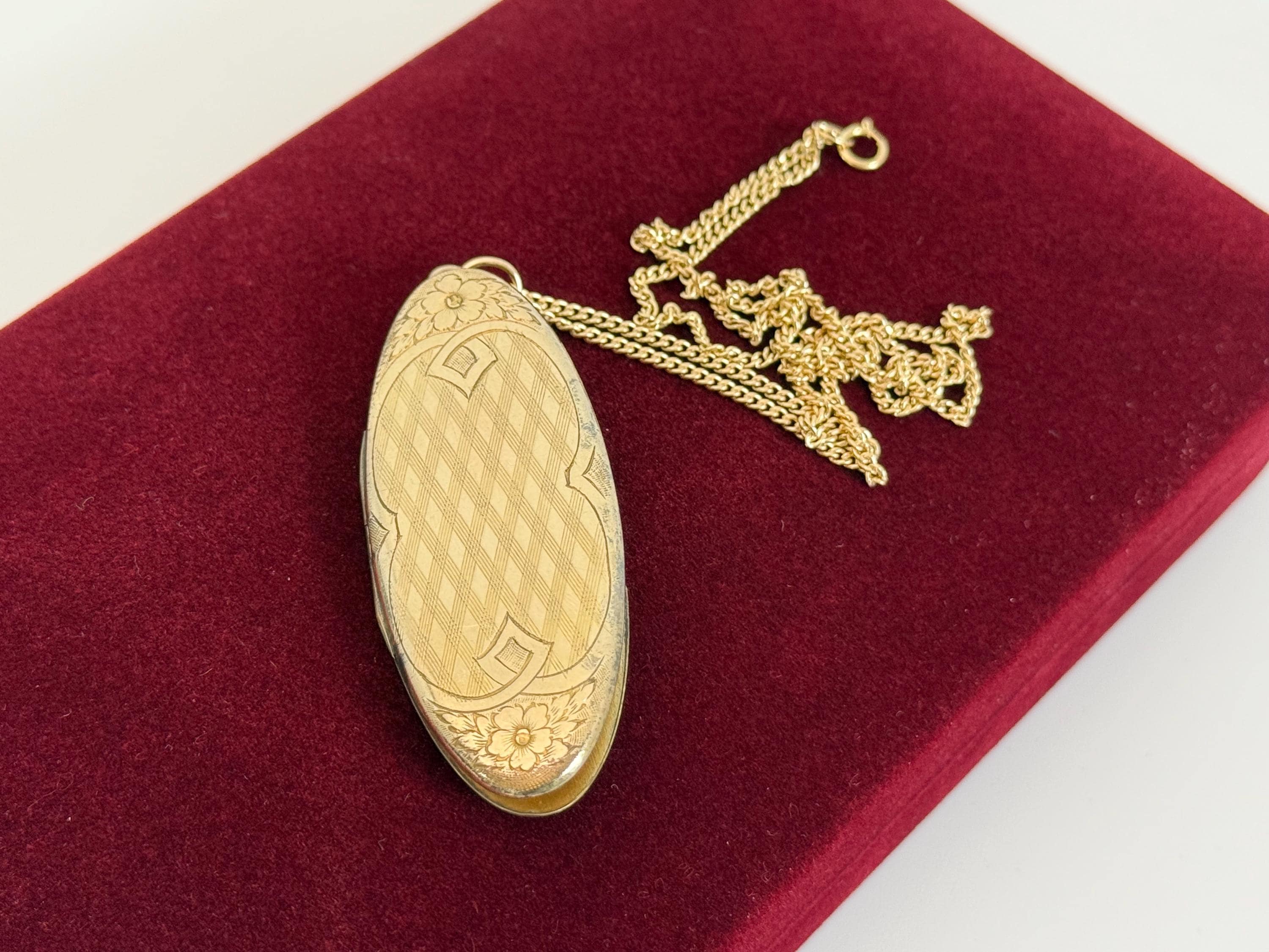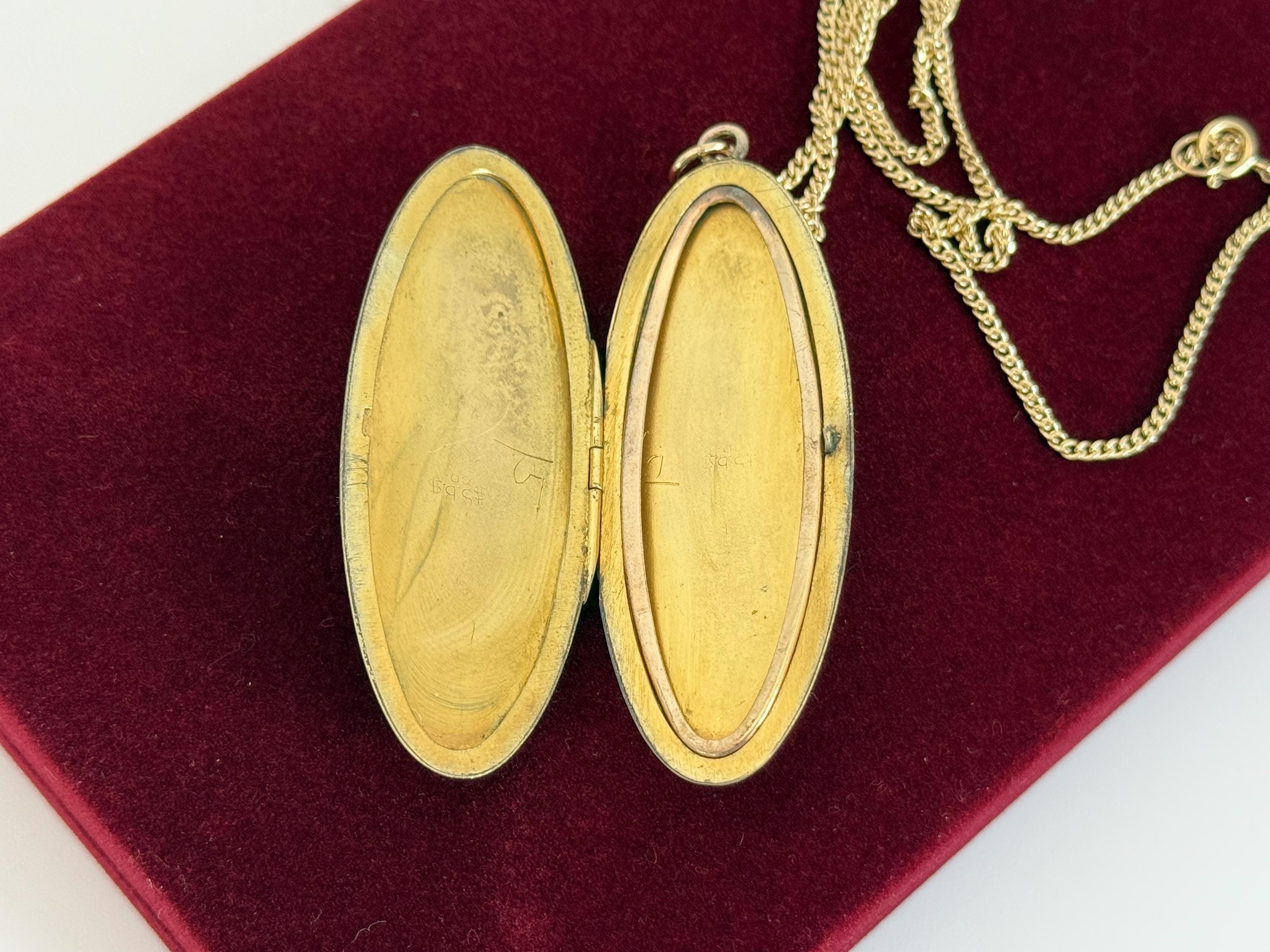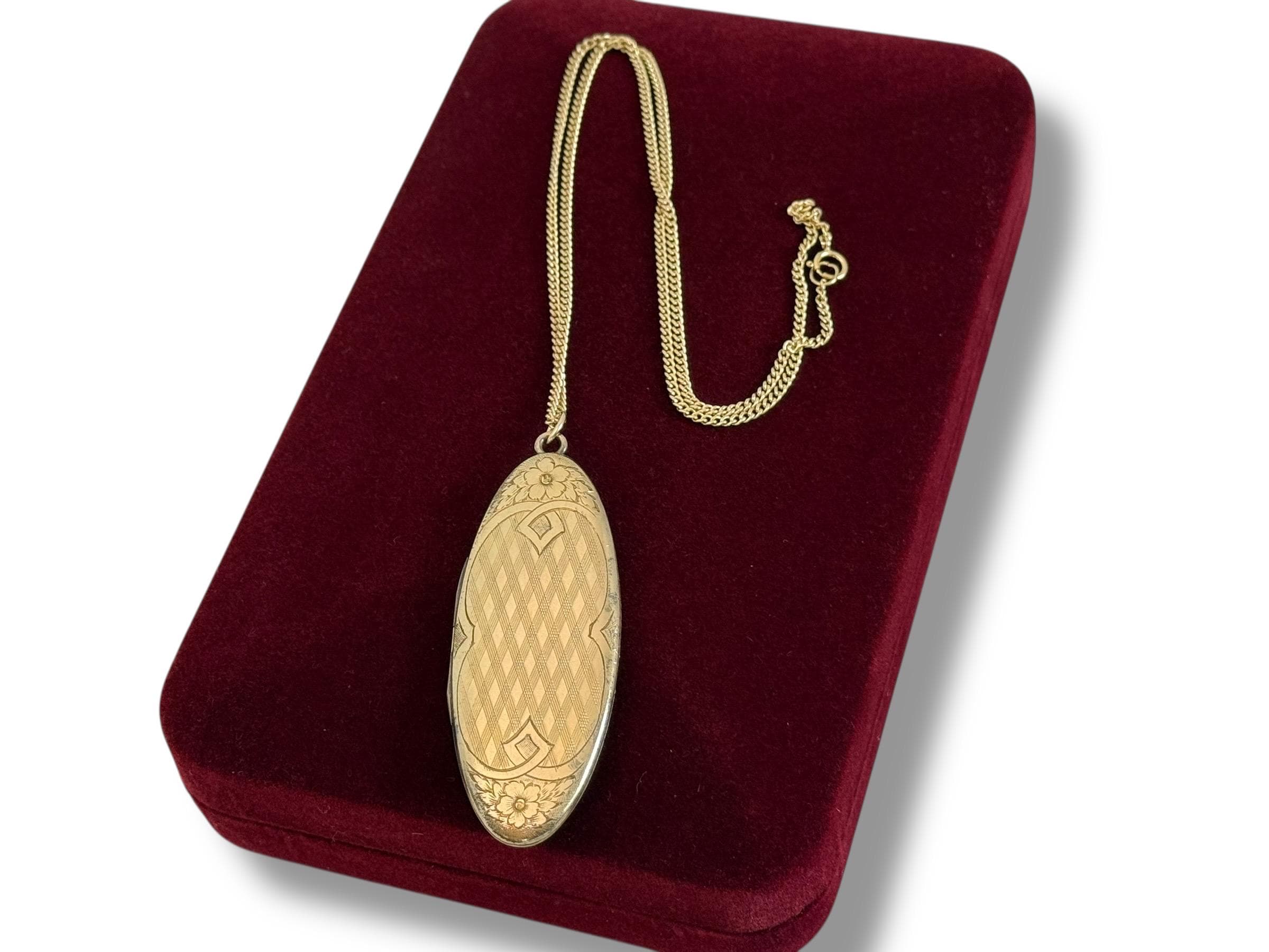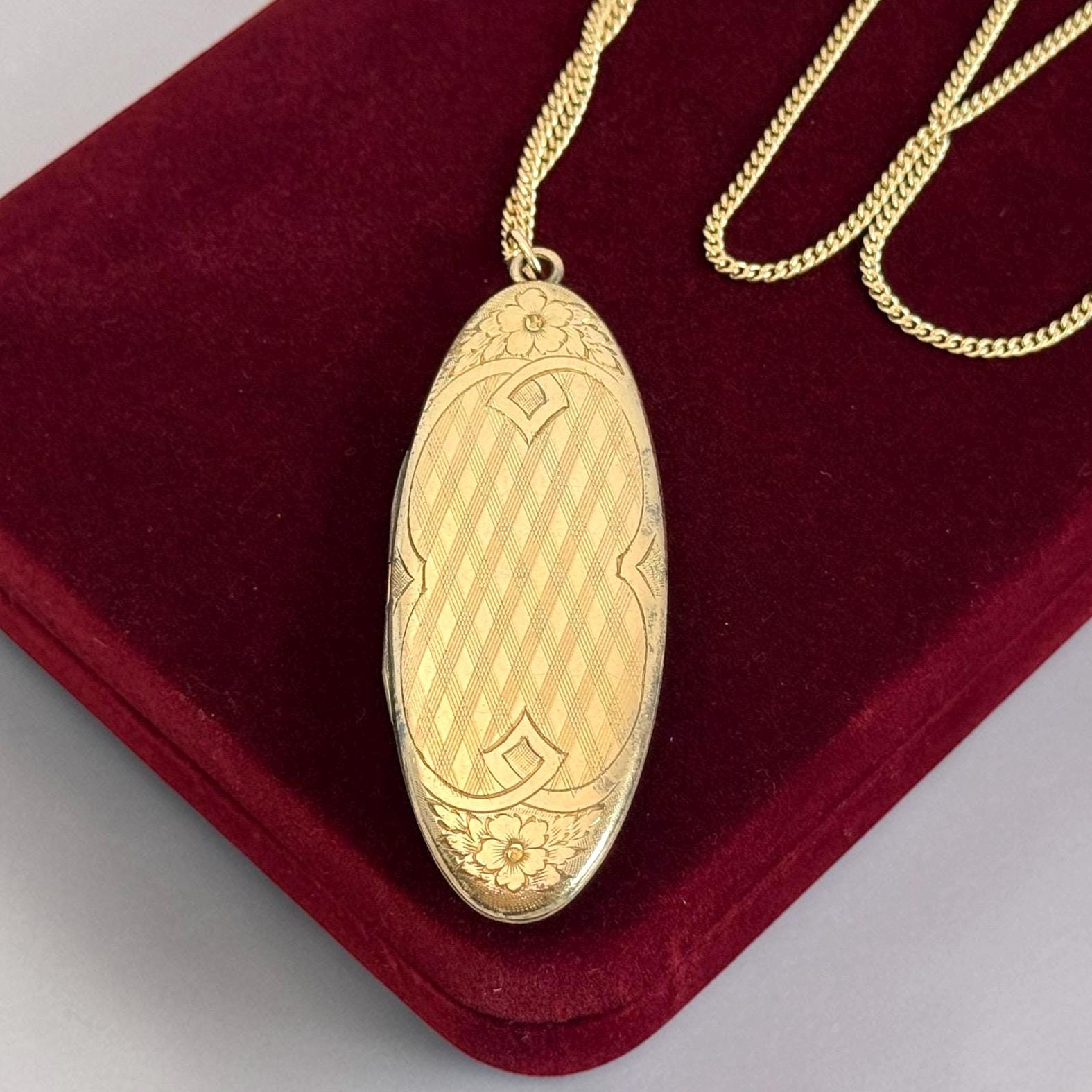 Antique LARGE Oval Gold Filled Floral Locket Necklace, Etched Design, 2 Photo Wells