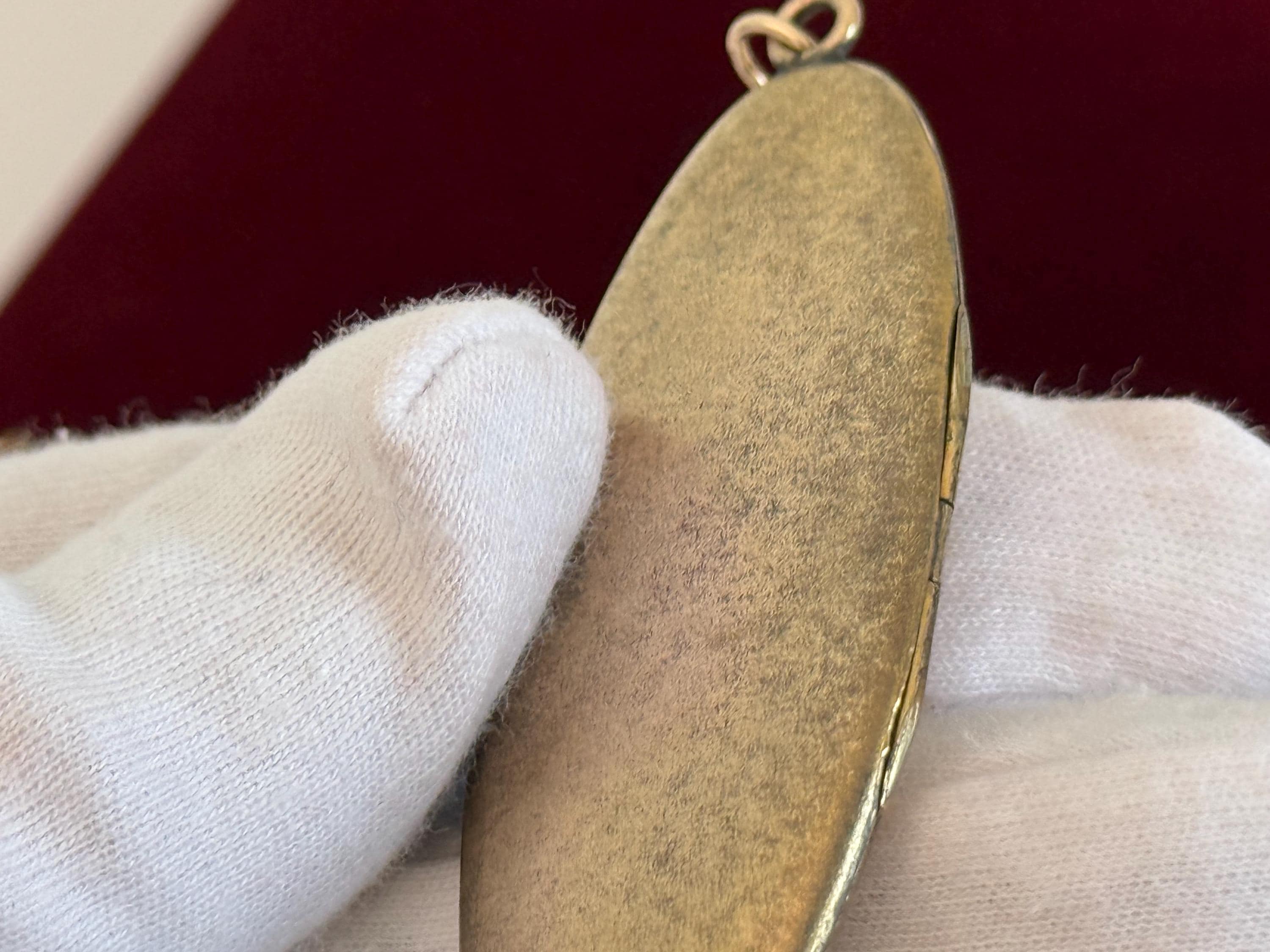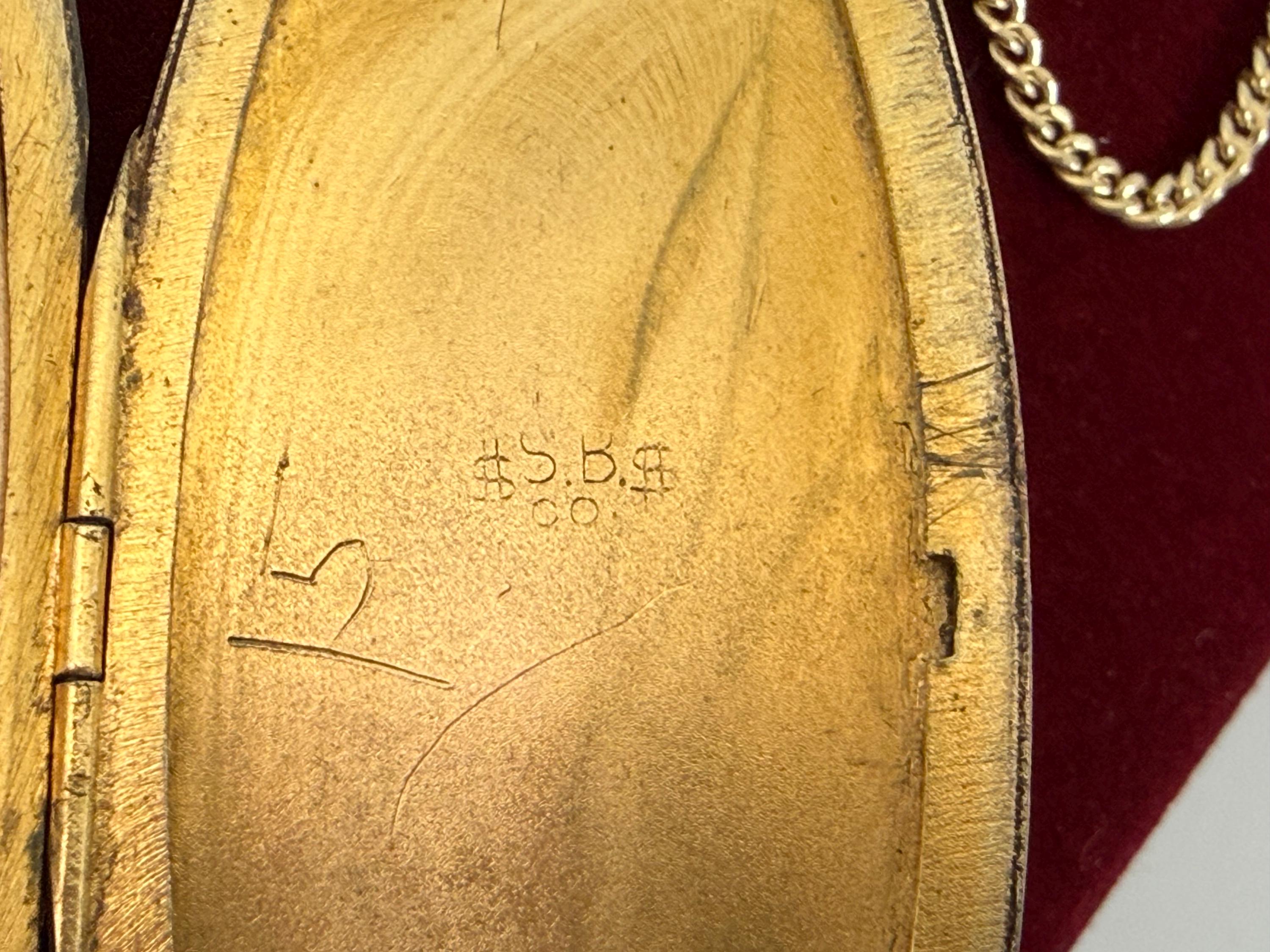 The locket is marked with a hallmark of $ SB CO $ in the inner wells.