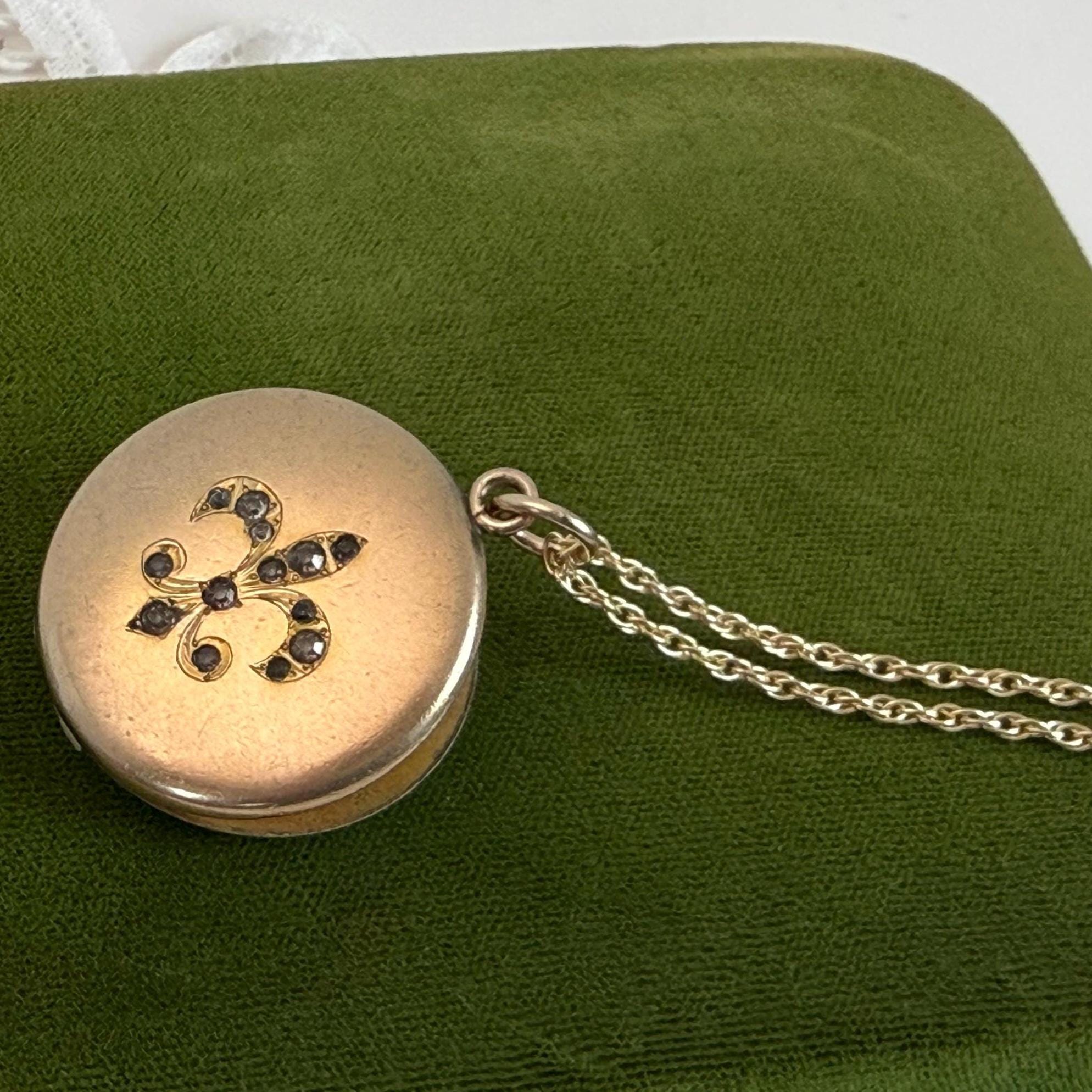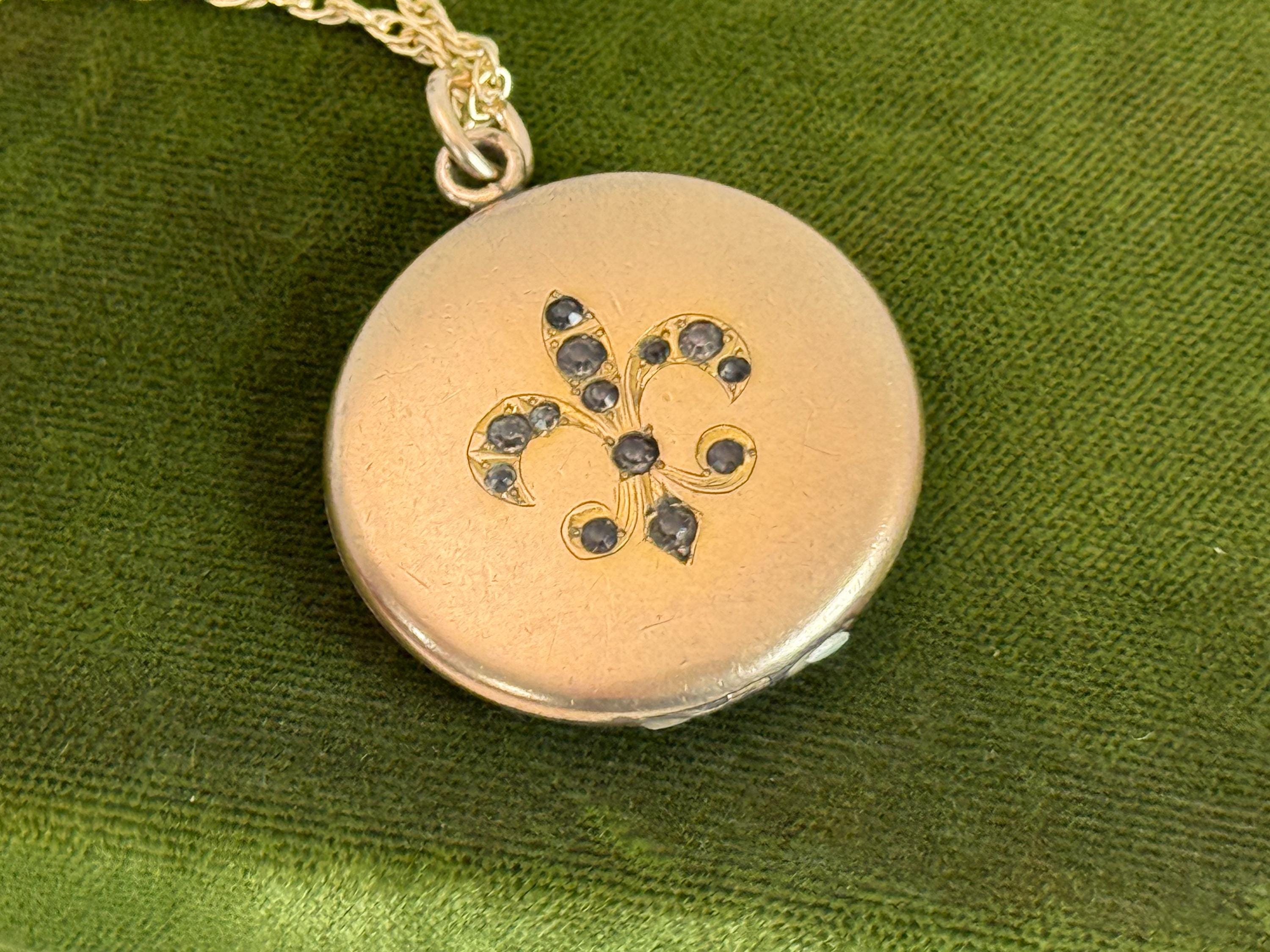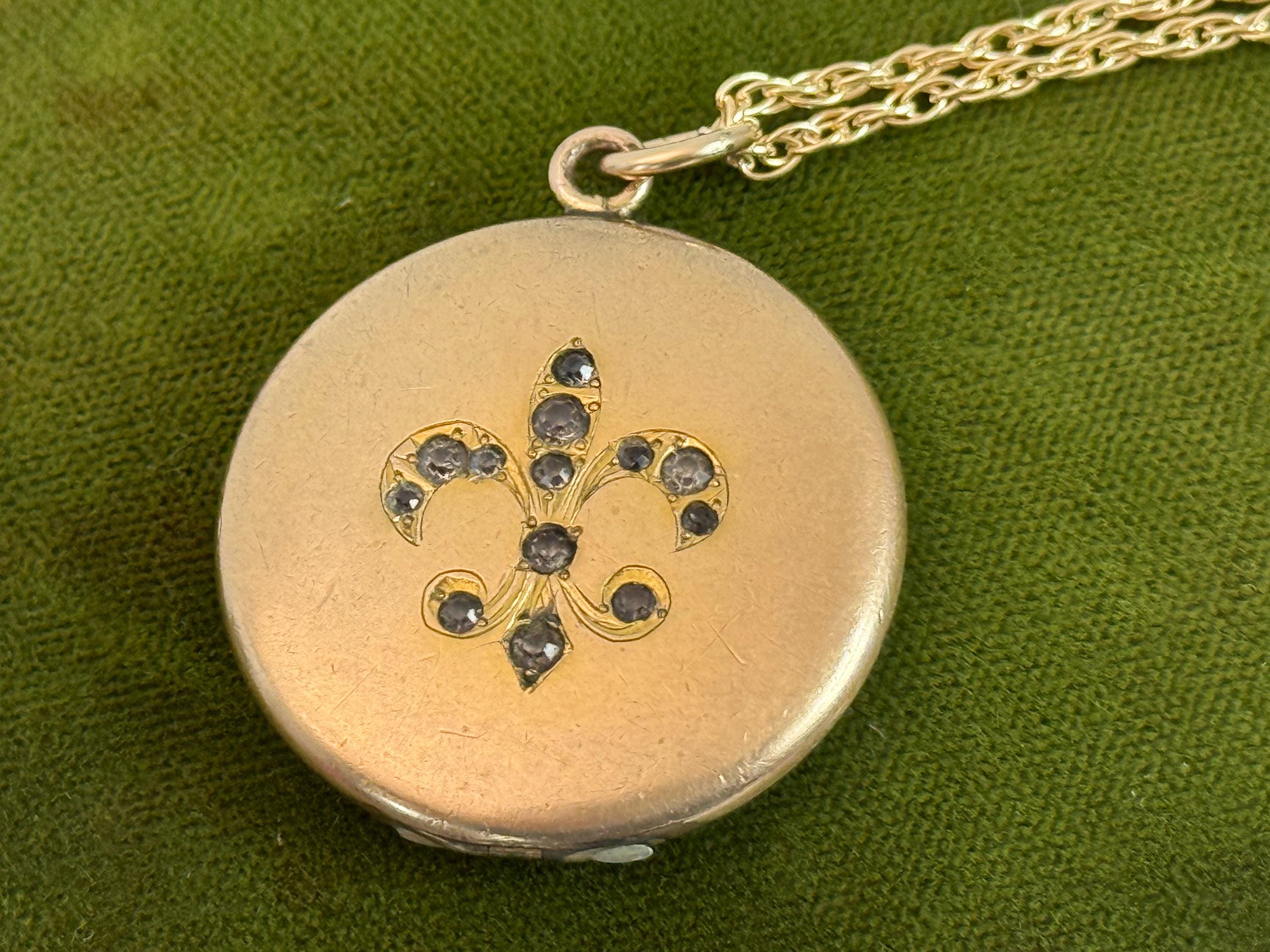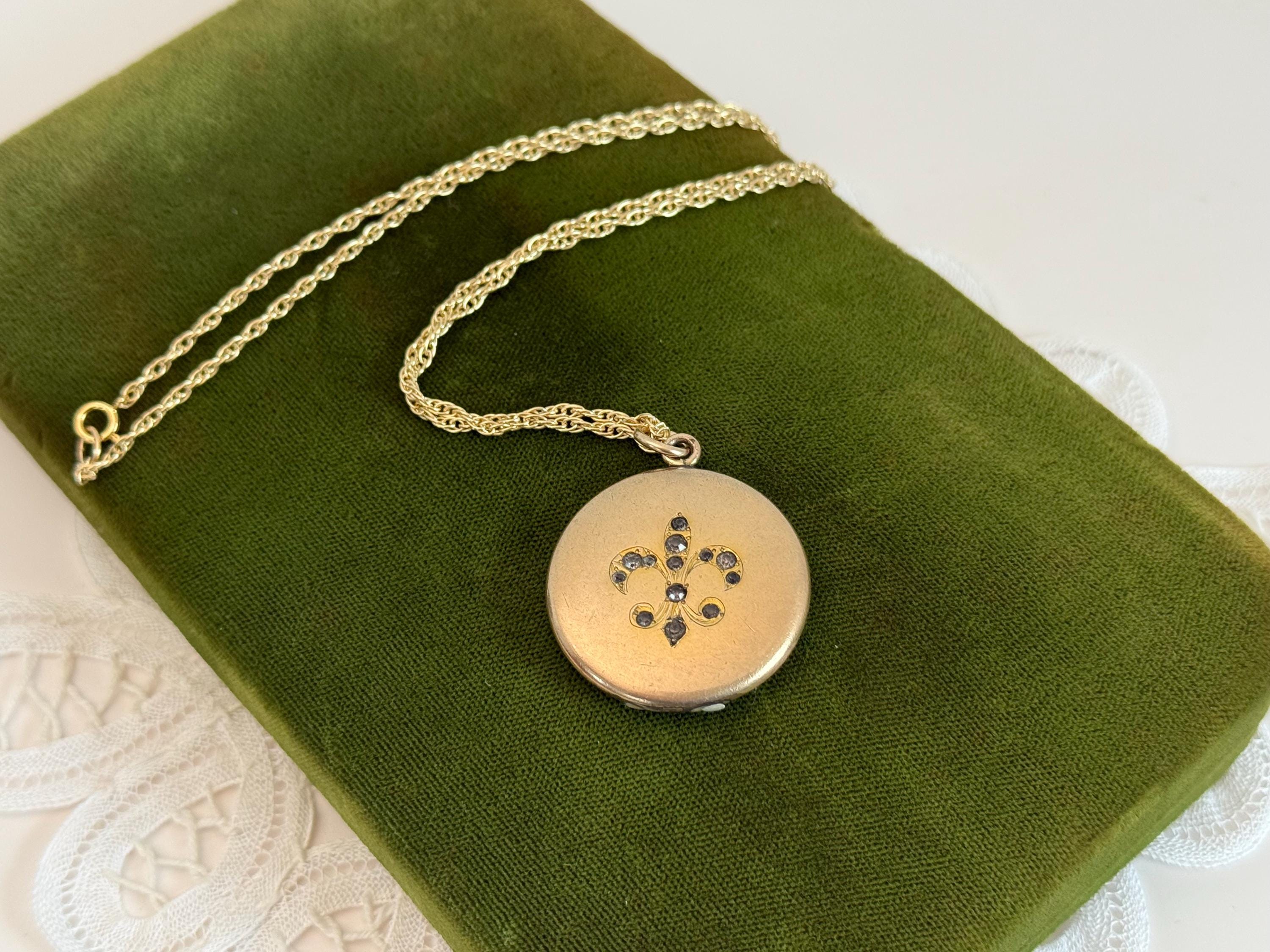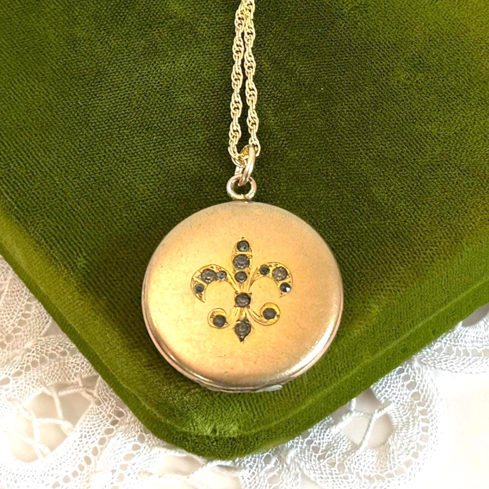 Vintage Gold Filled Locket – Fleur de Lis Paste Stones, 14K GF Chain