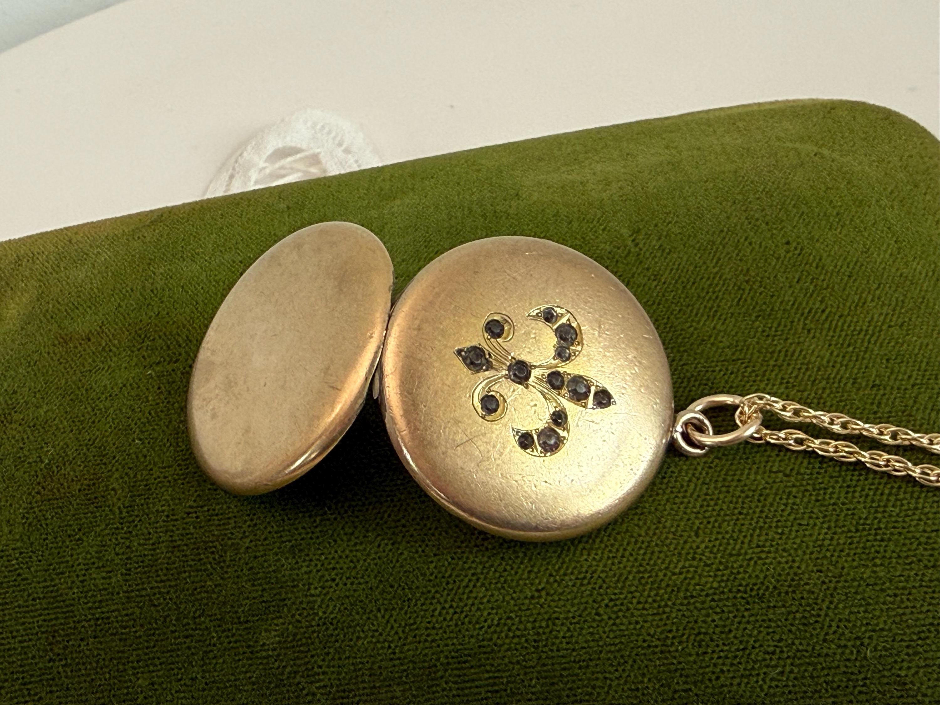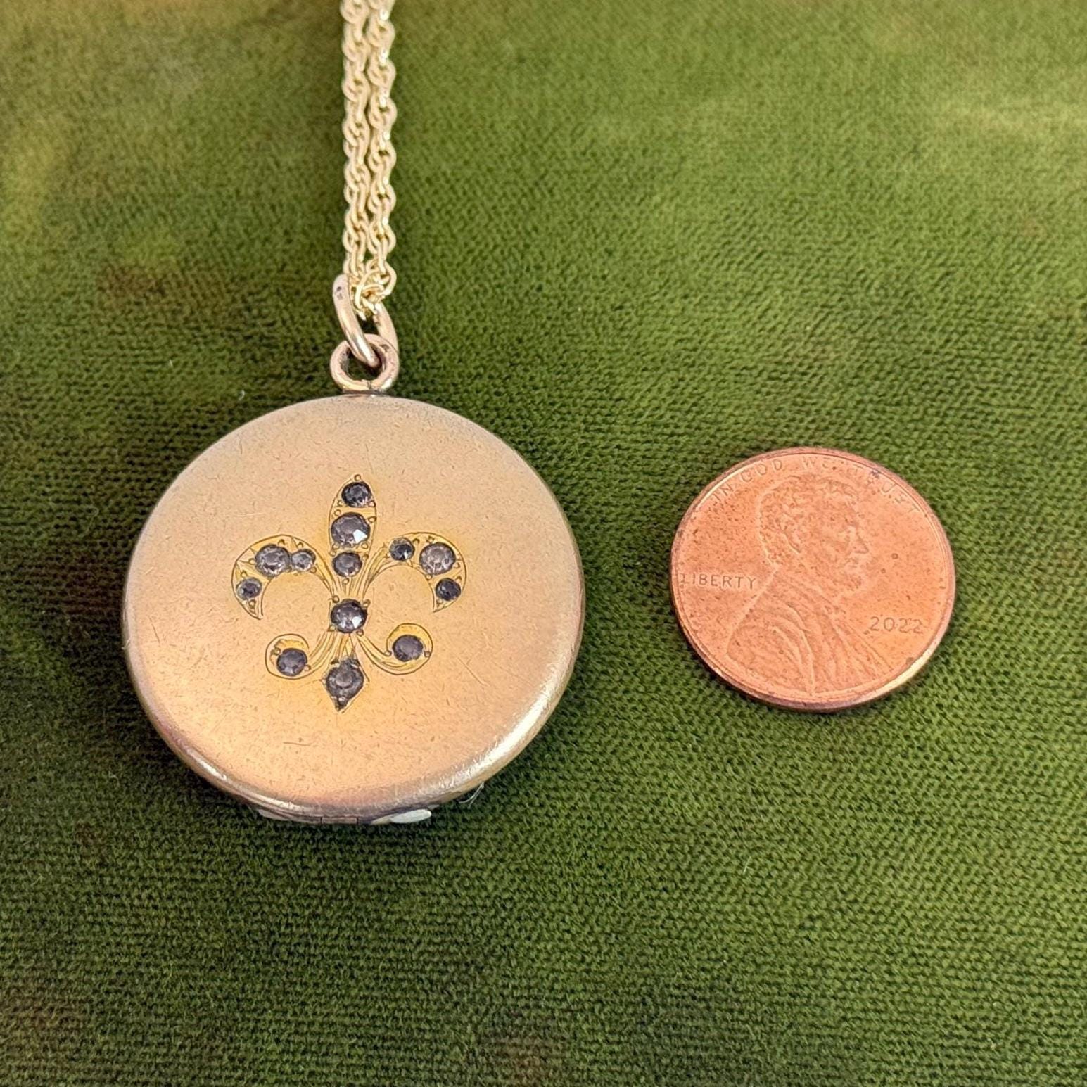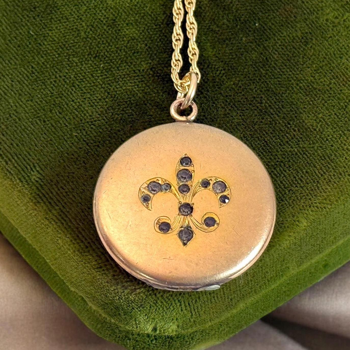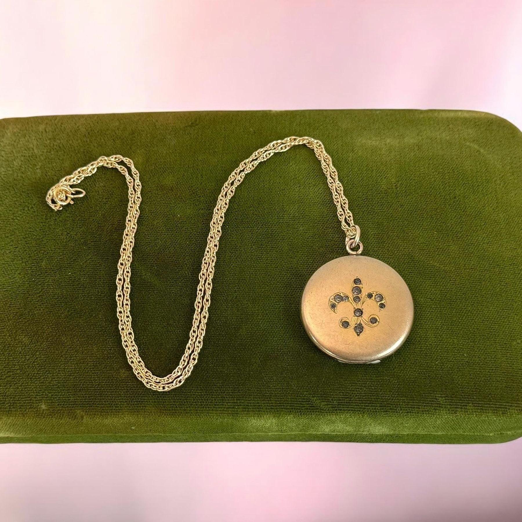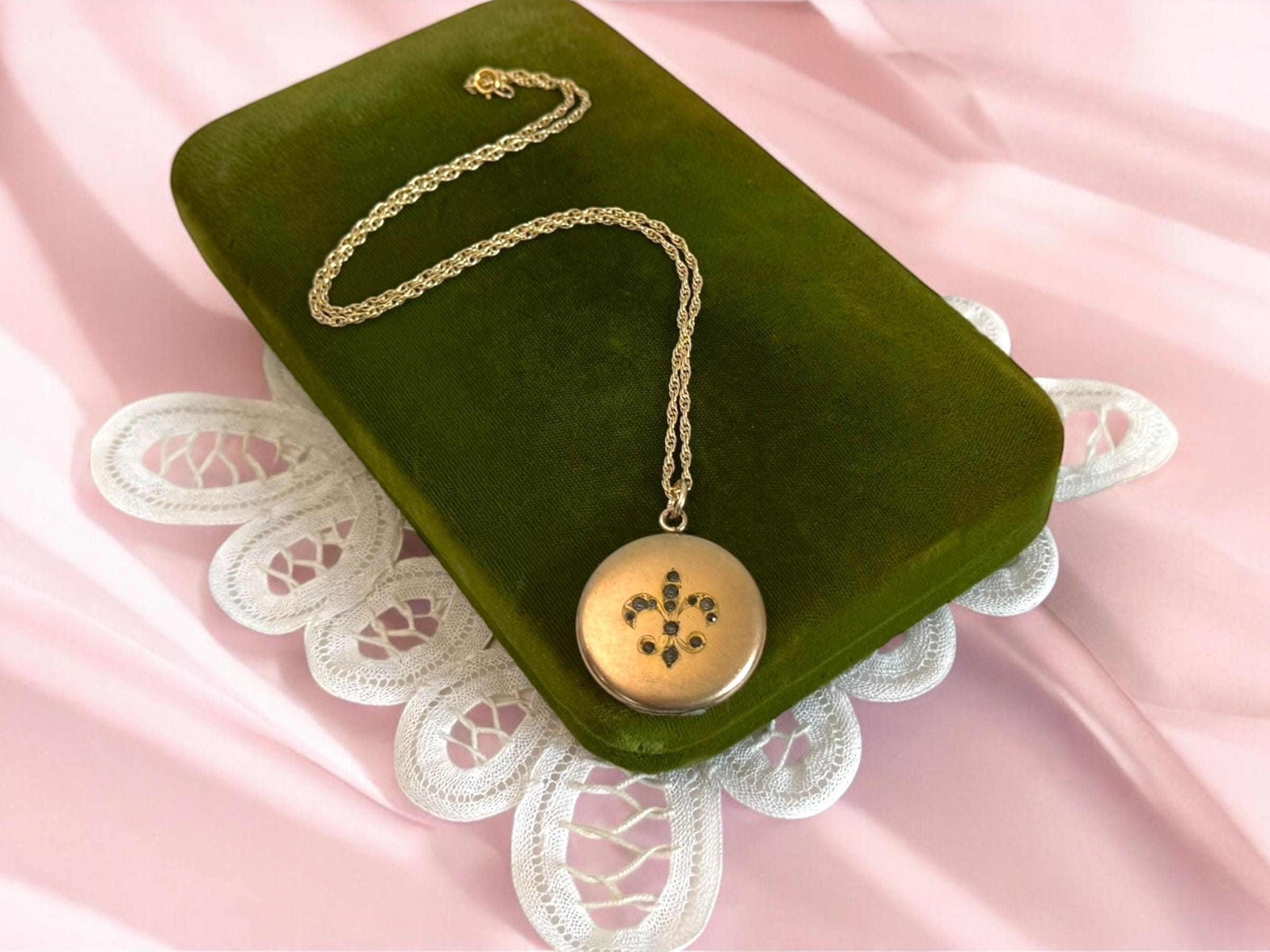 Vintage Gold Filled Locket – Fleur de Lis Paste Stones, 14K GF Chain