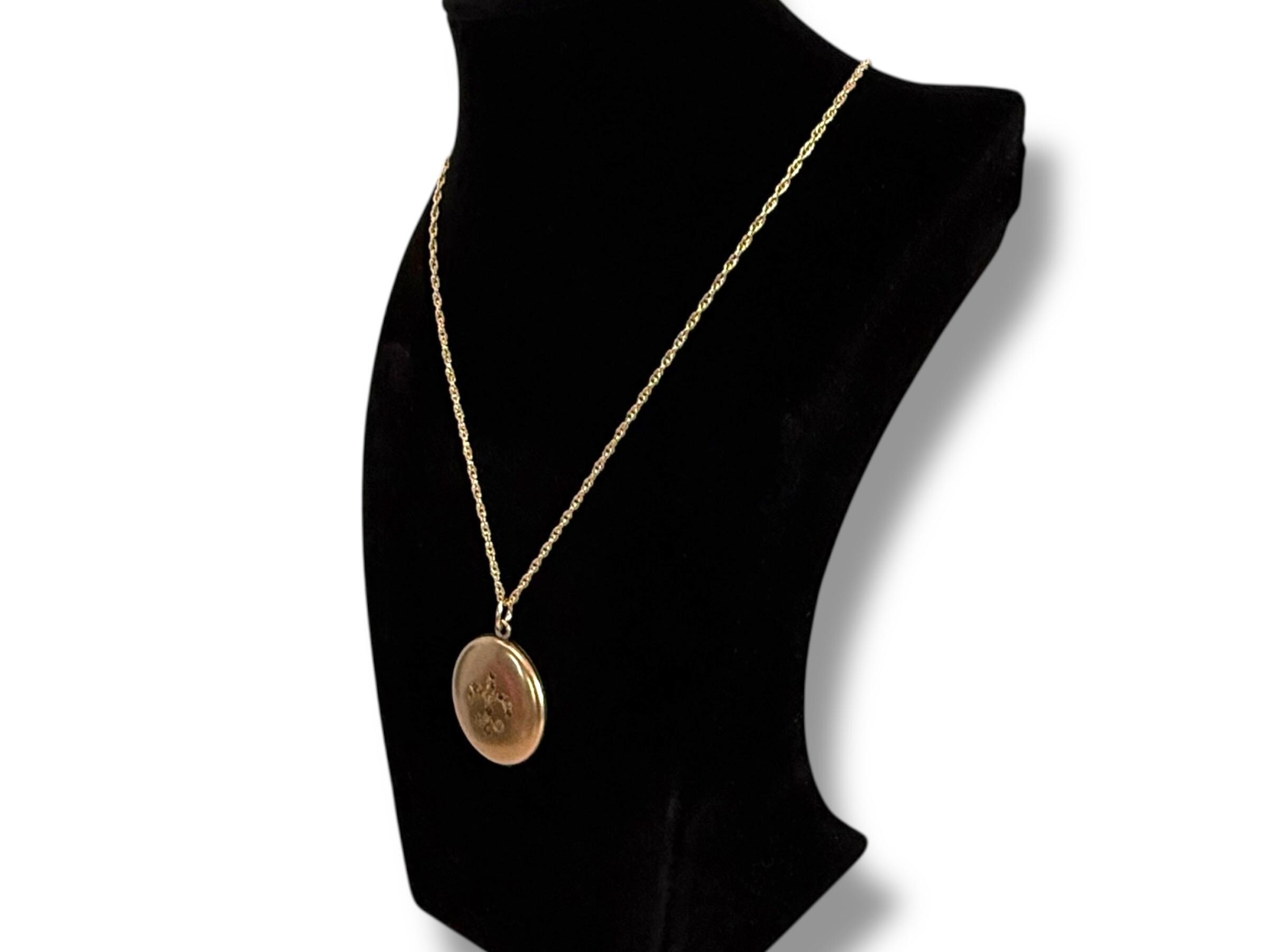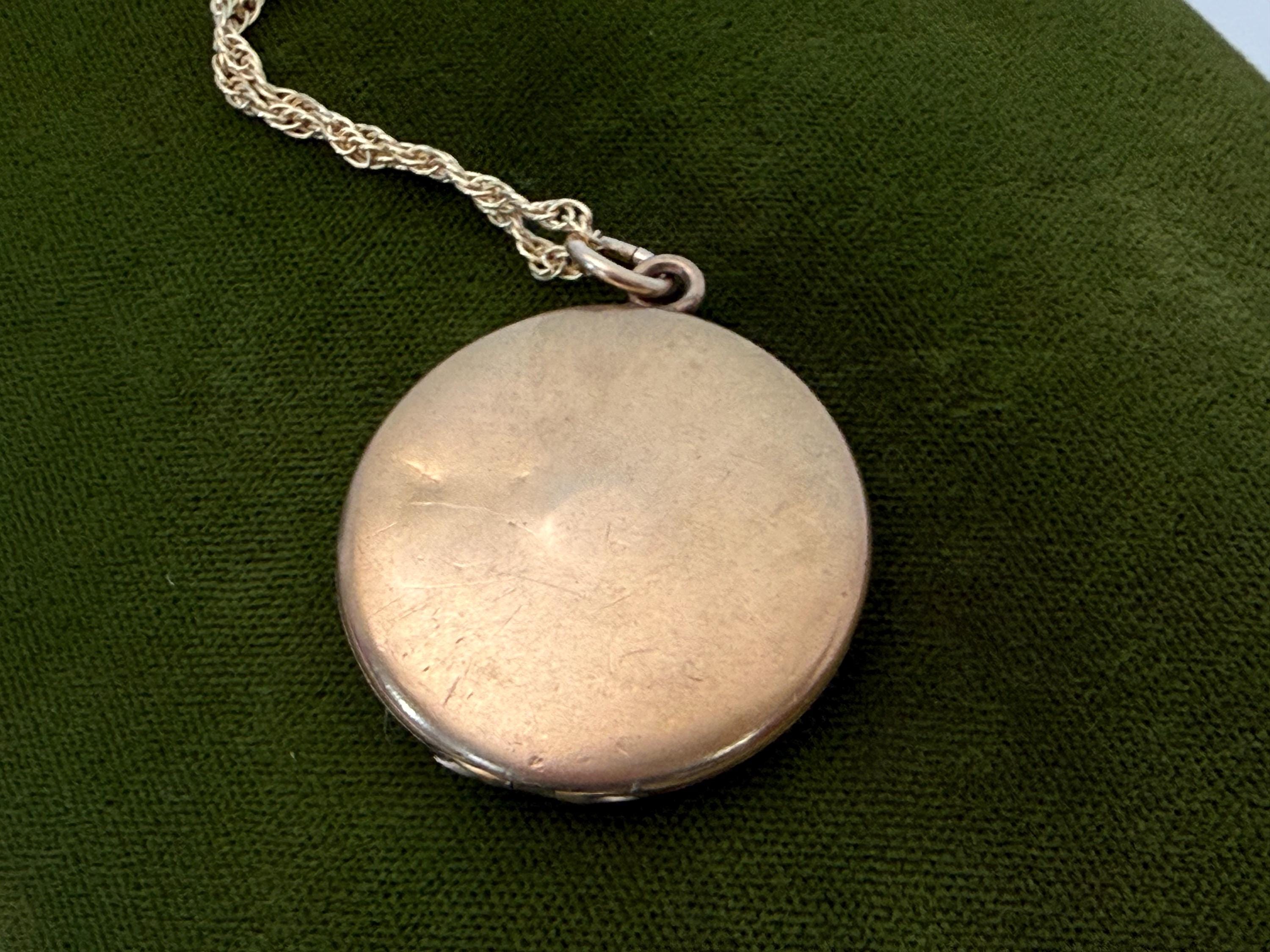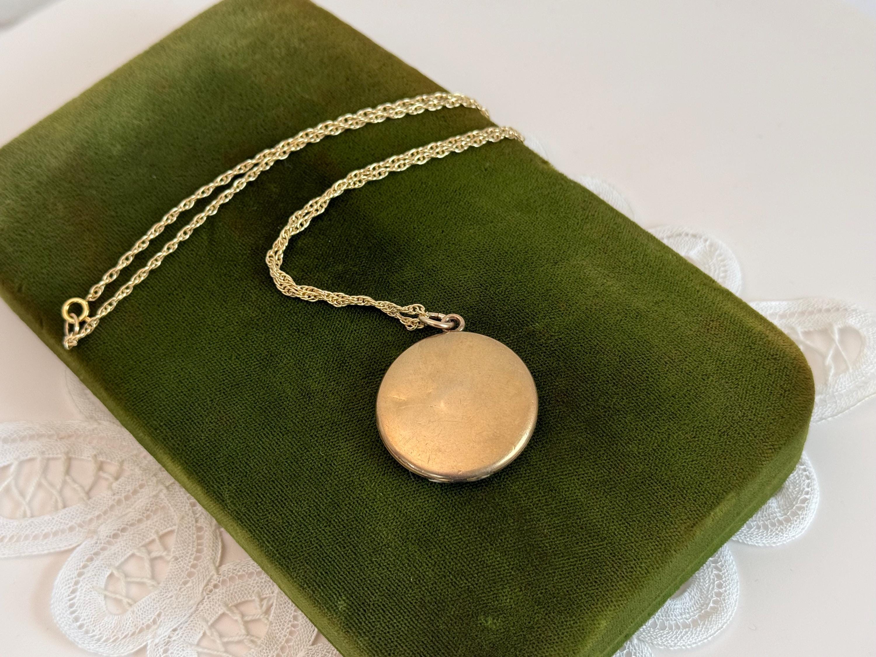 This vintage round locket hangs from a 20” long 14K gold filled rope link chain. The locket has its hinge on the bottom and it opens from the top. The spring ring clasp on the chain opens easily and closes securely.