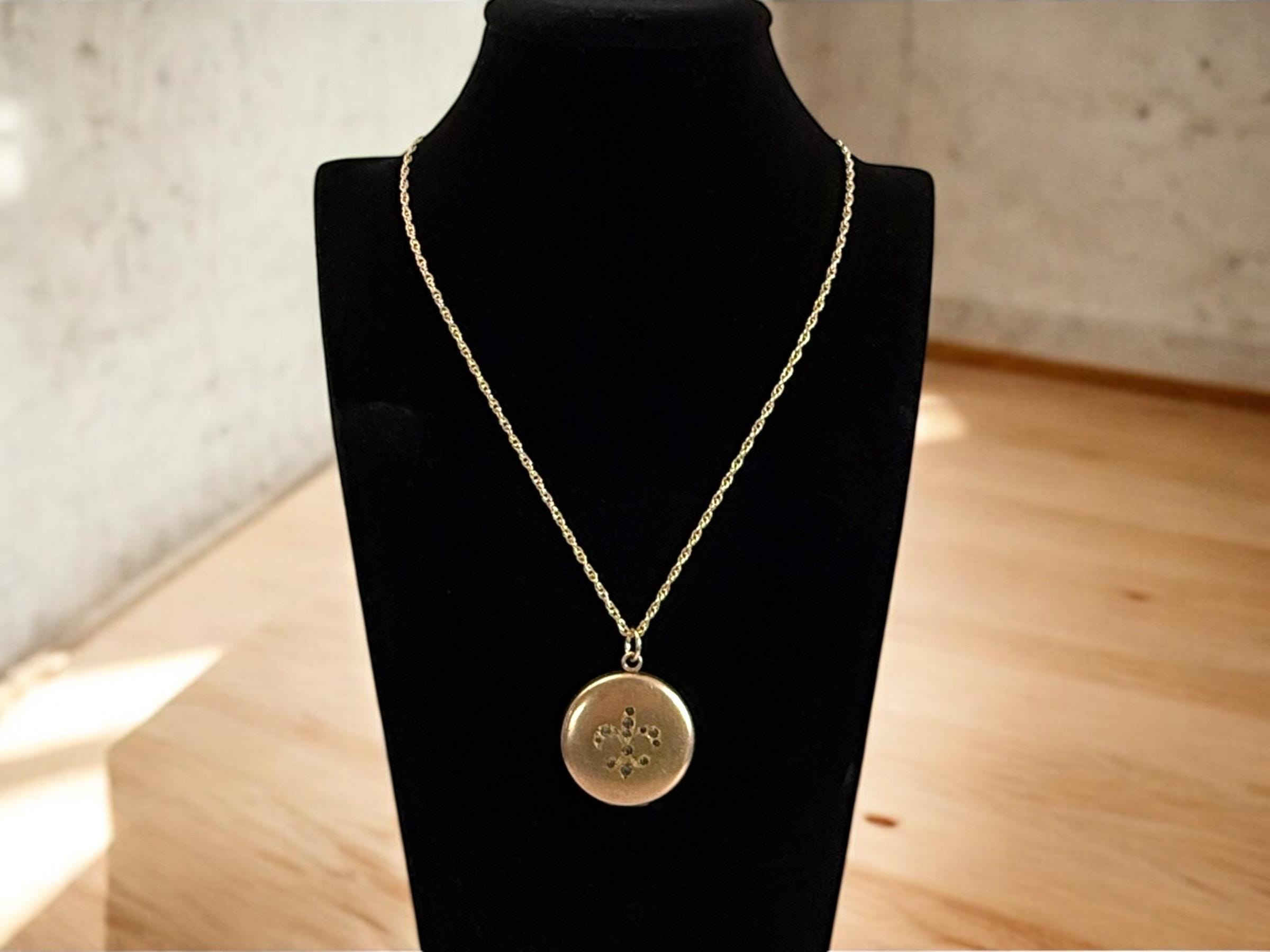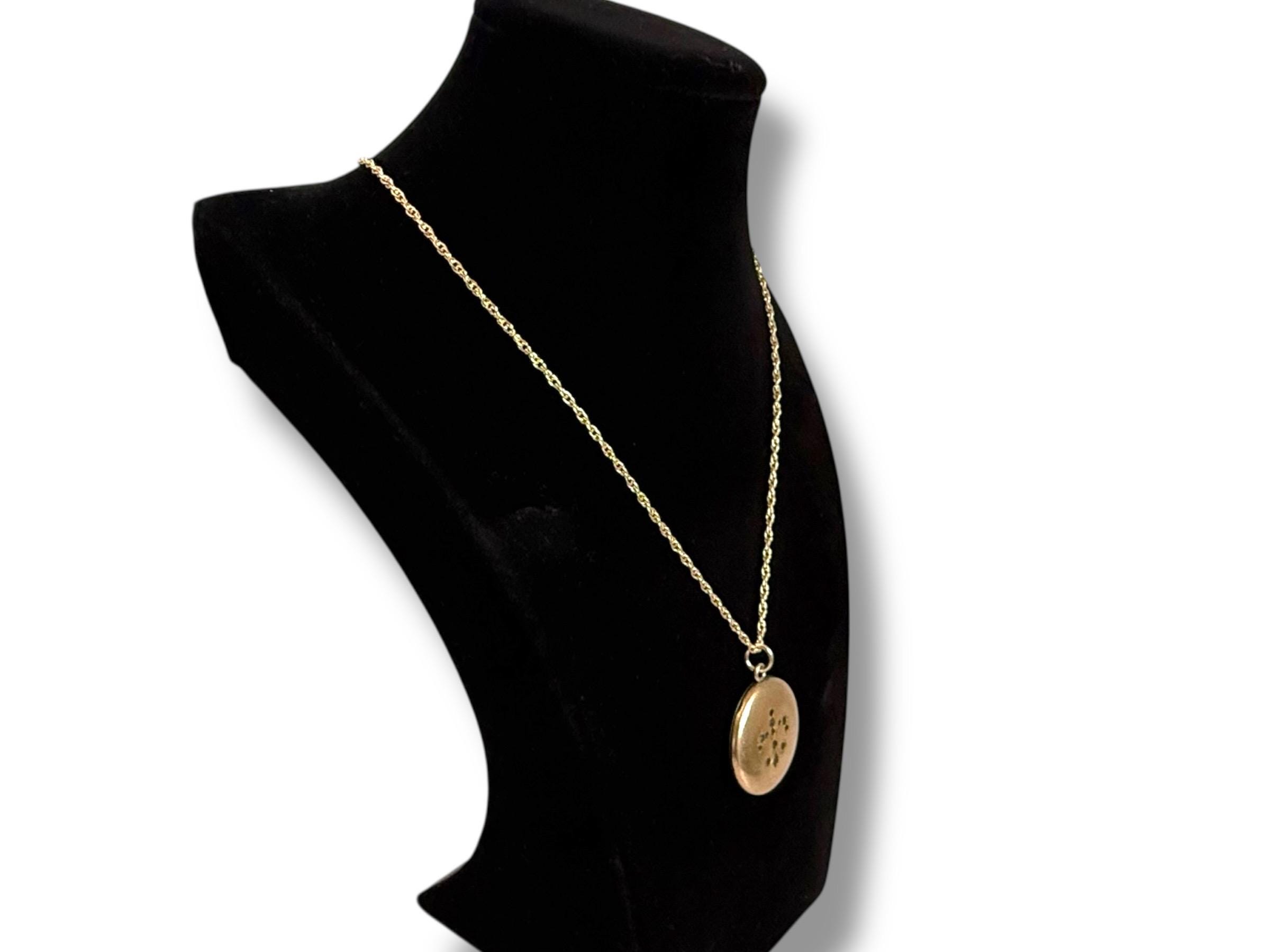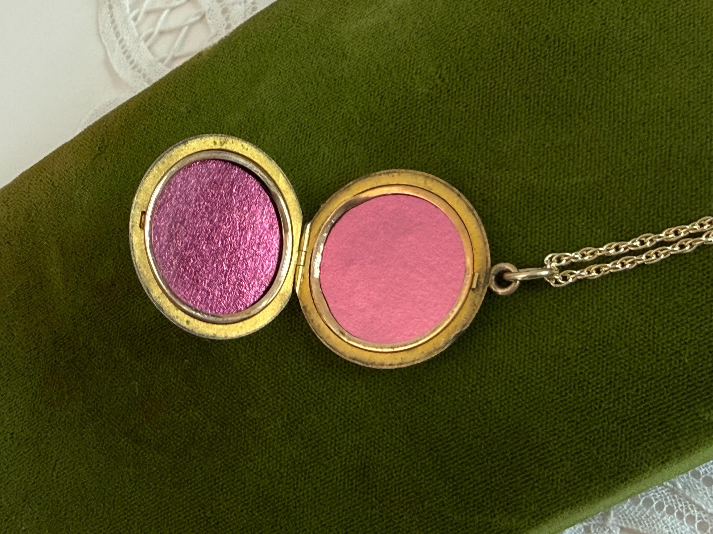 This vintage round locket hangs from a 20” long 14K gold filled rope link chain. The locket has its hinge on the bottom and it opens from the top. The spring ring clasp on the chain opens easily and closes securely.