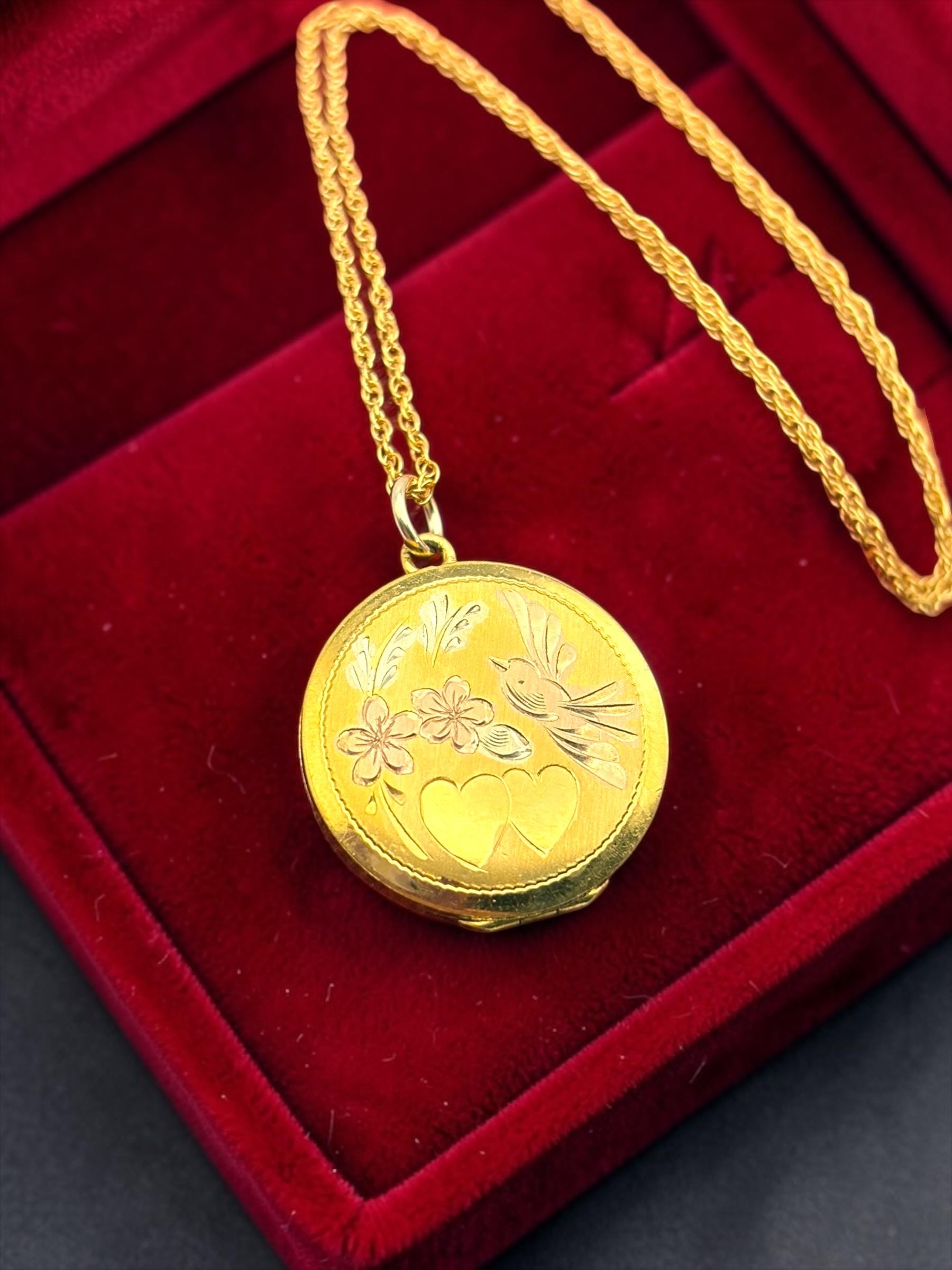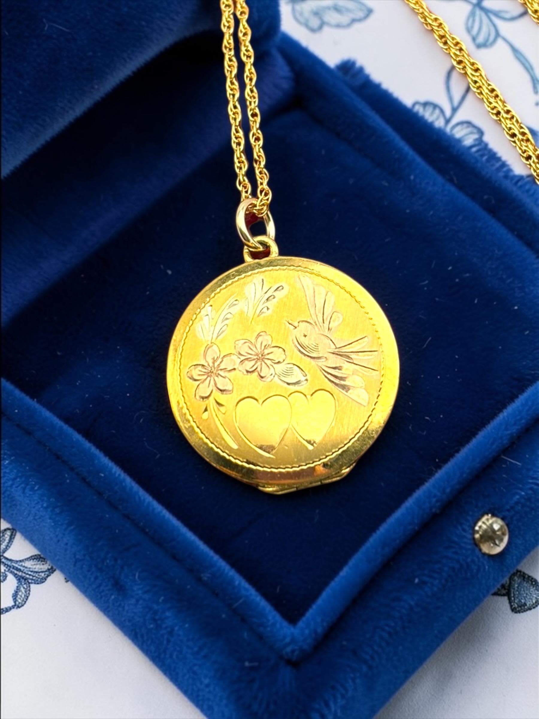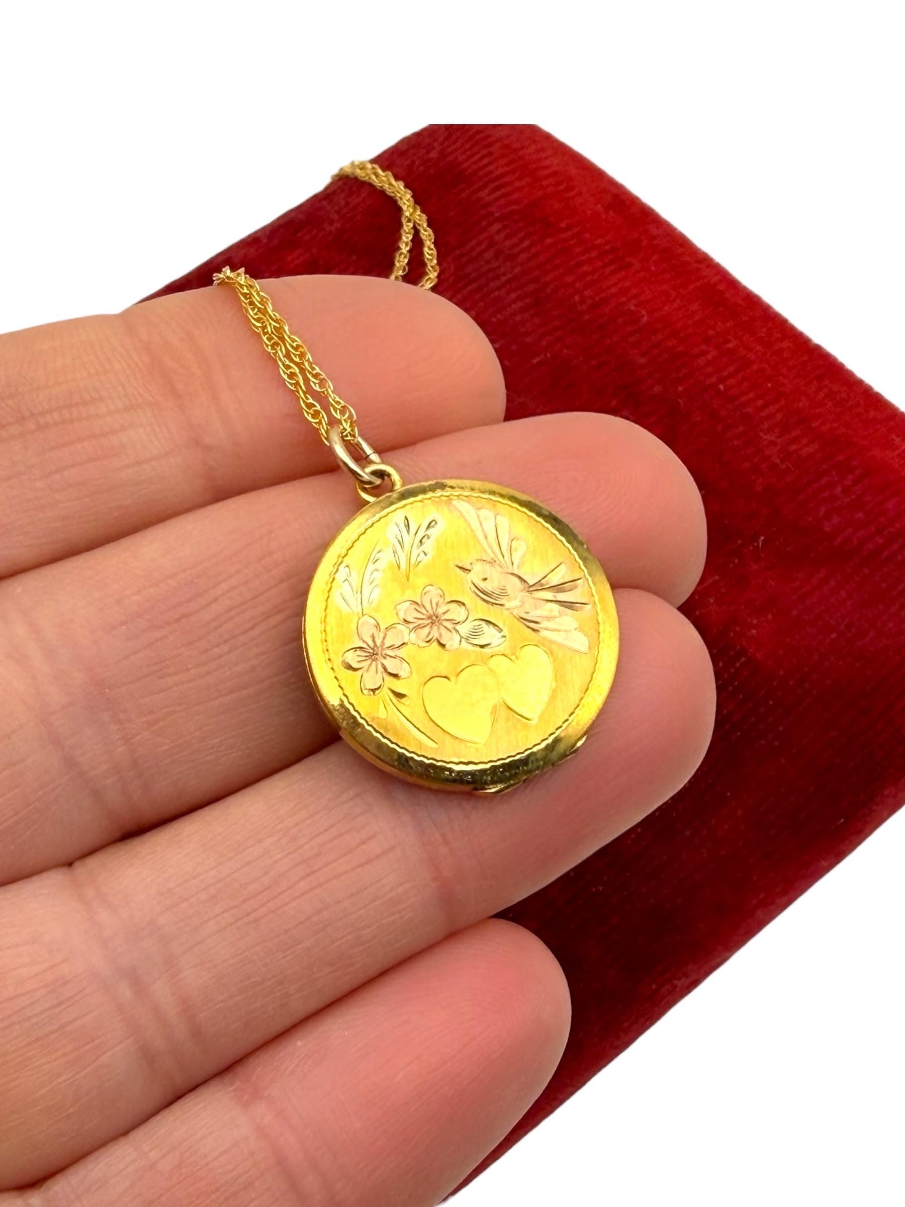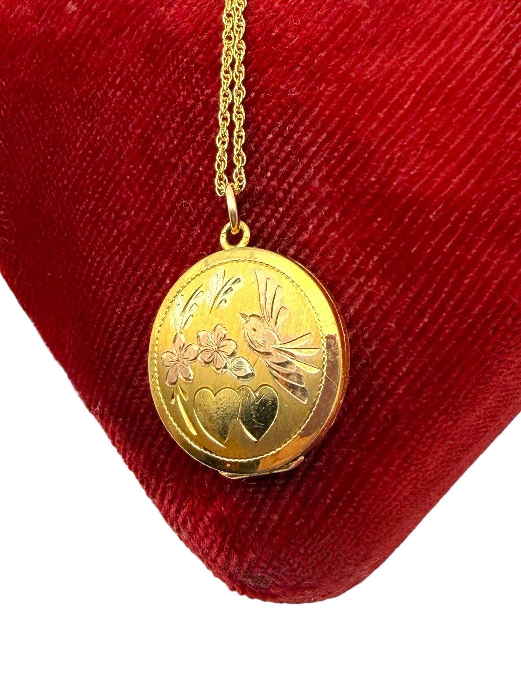 Vintage LeStage Gold Filled Locket Necklace: Etched Hearts, Flowers, Lovebird