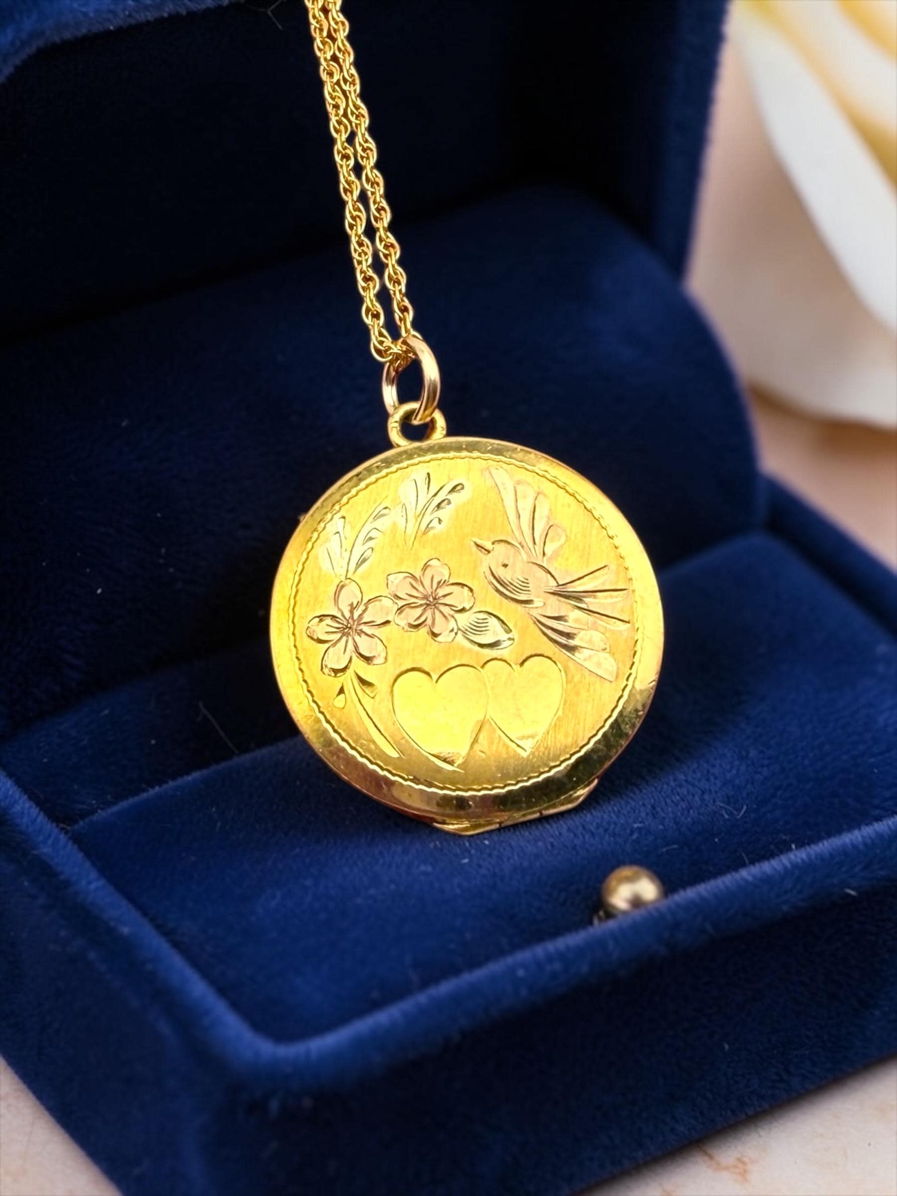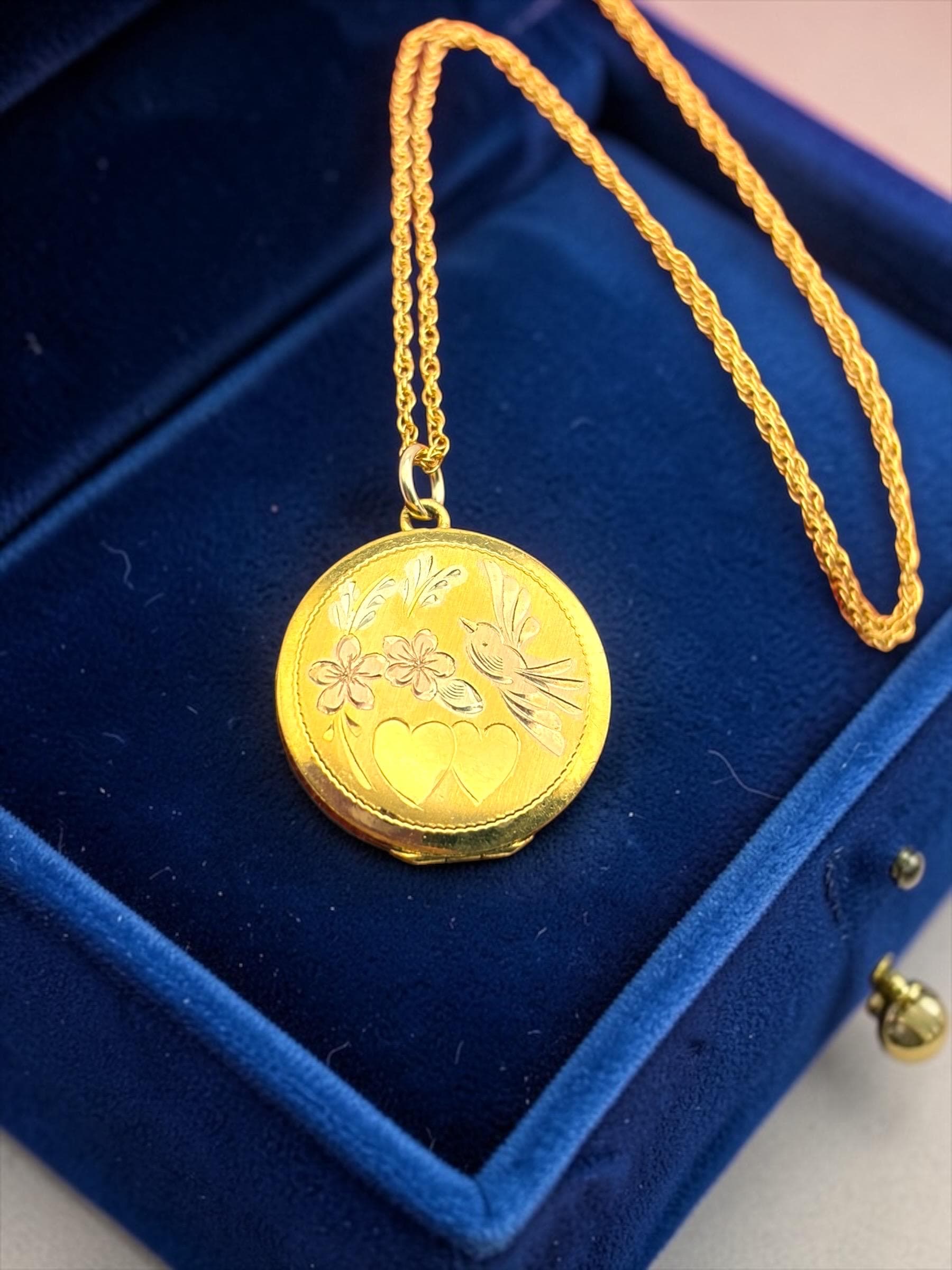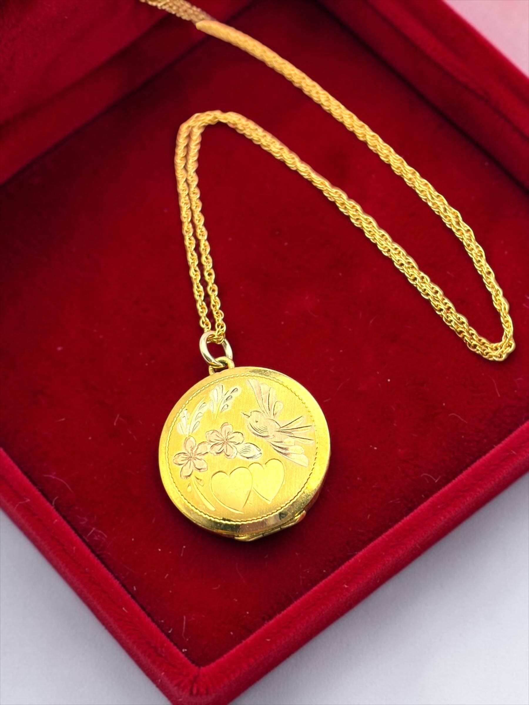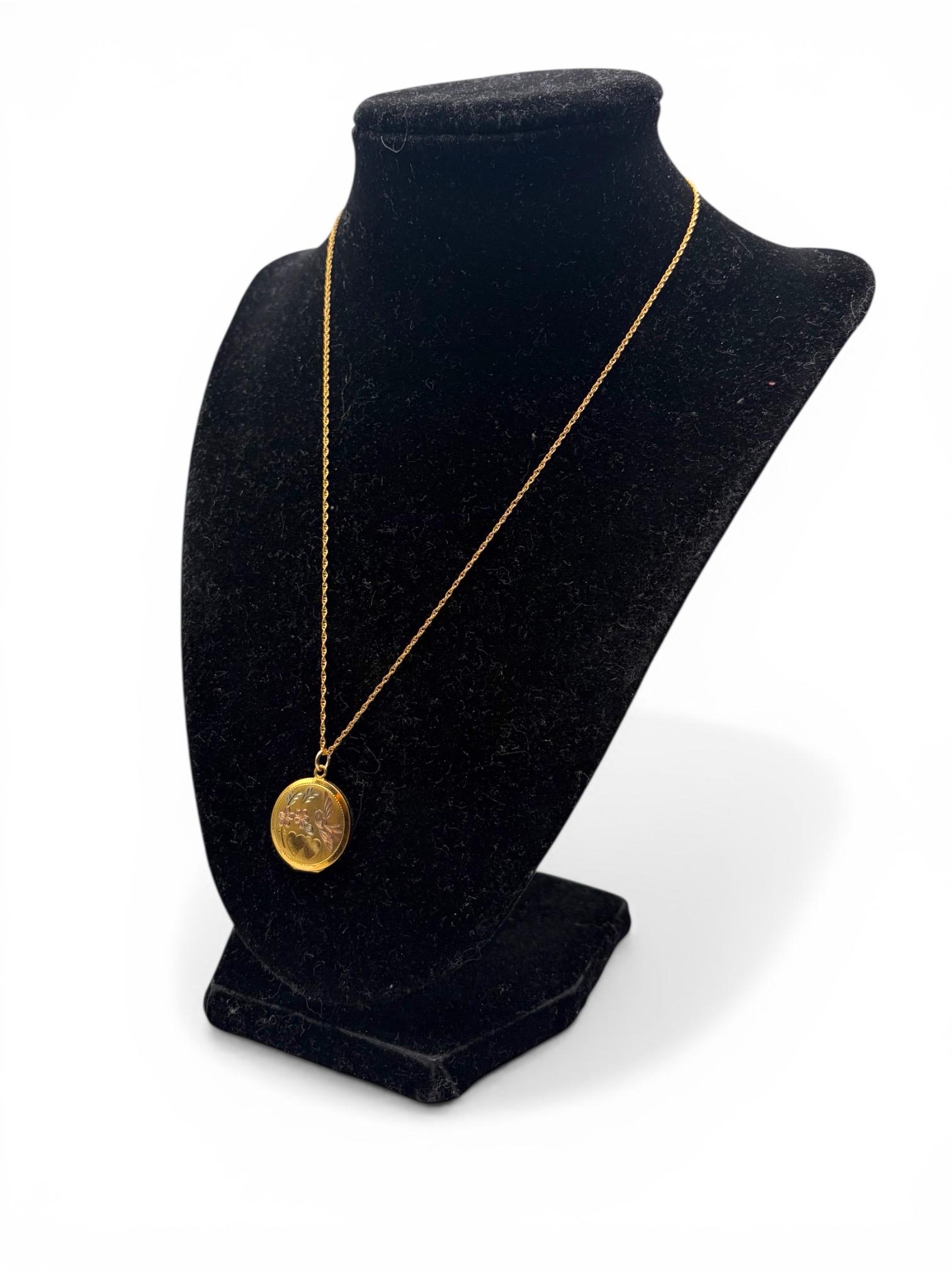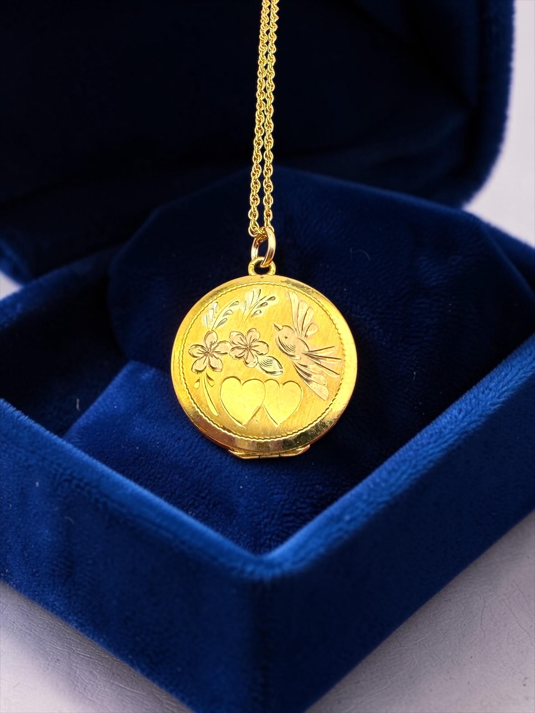 Vintage LeStage Gold Filled Locket Necklace: Etched Hearts, Flowers, Lovebird