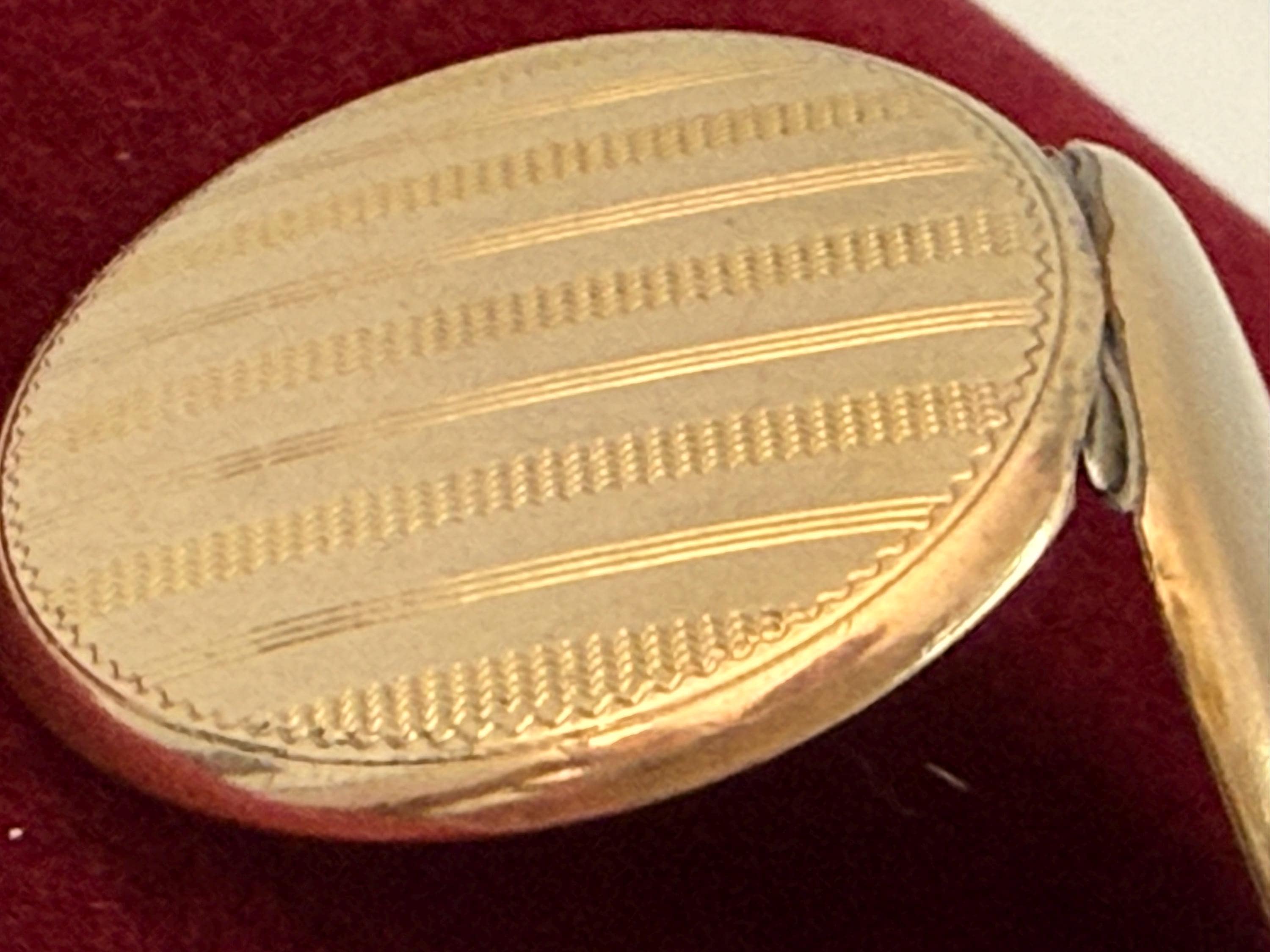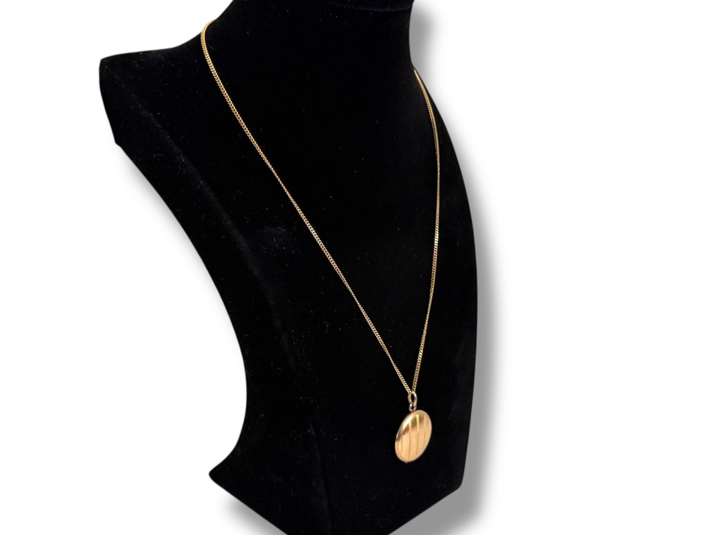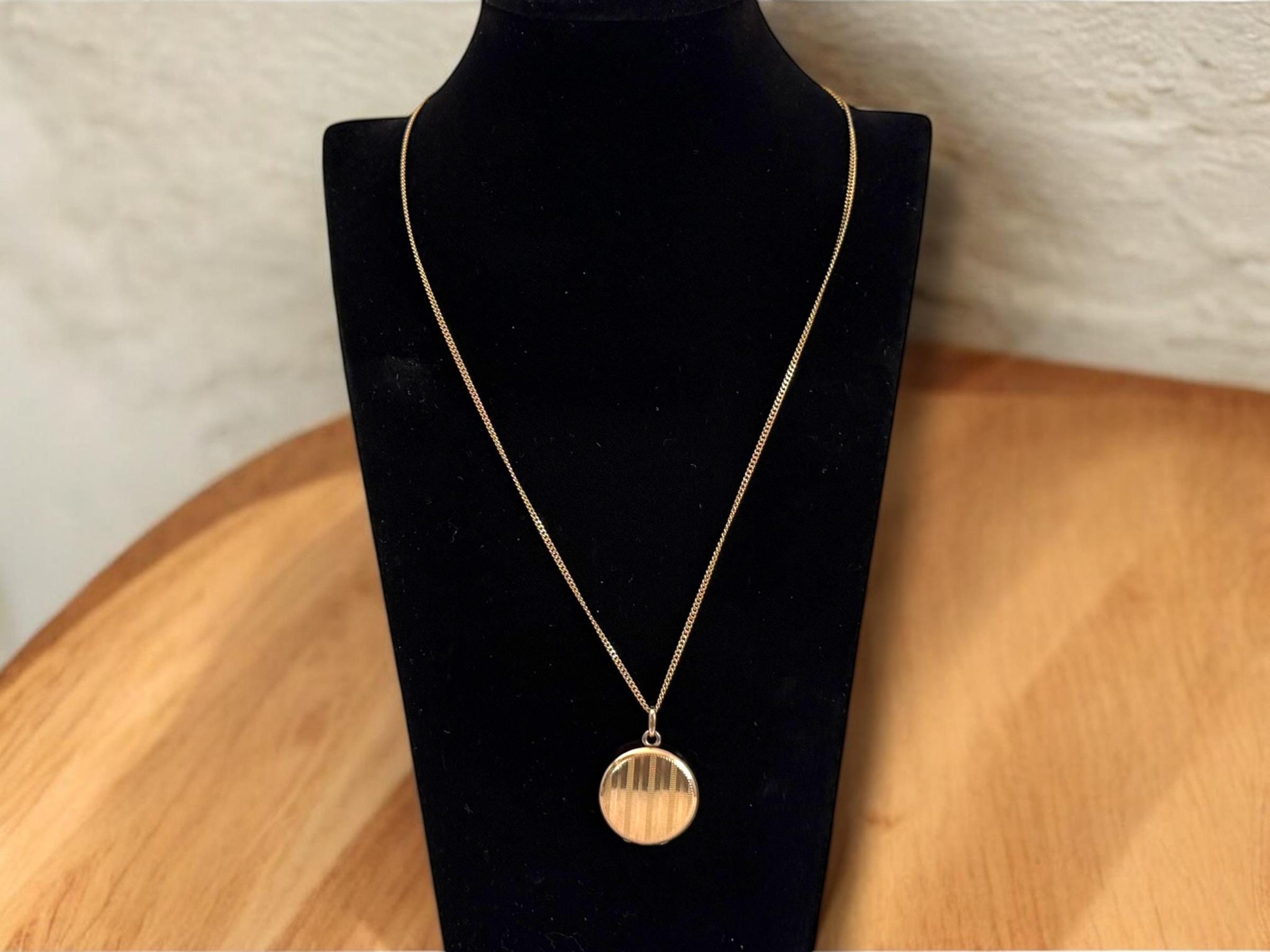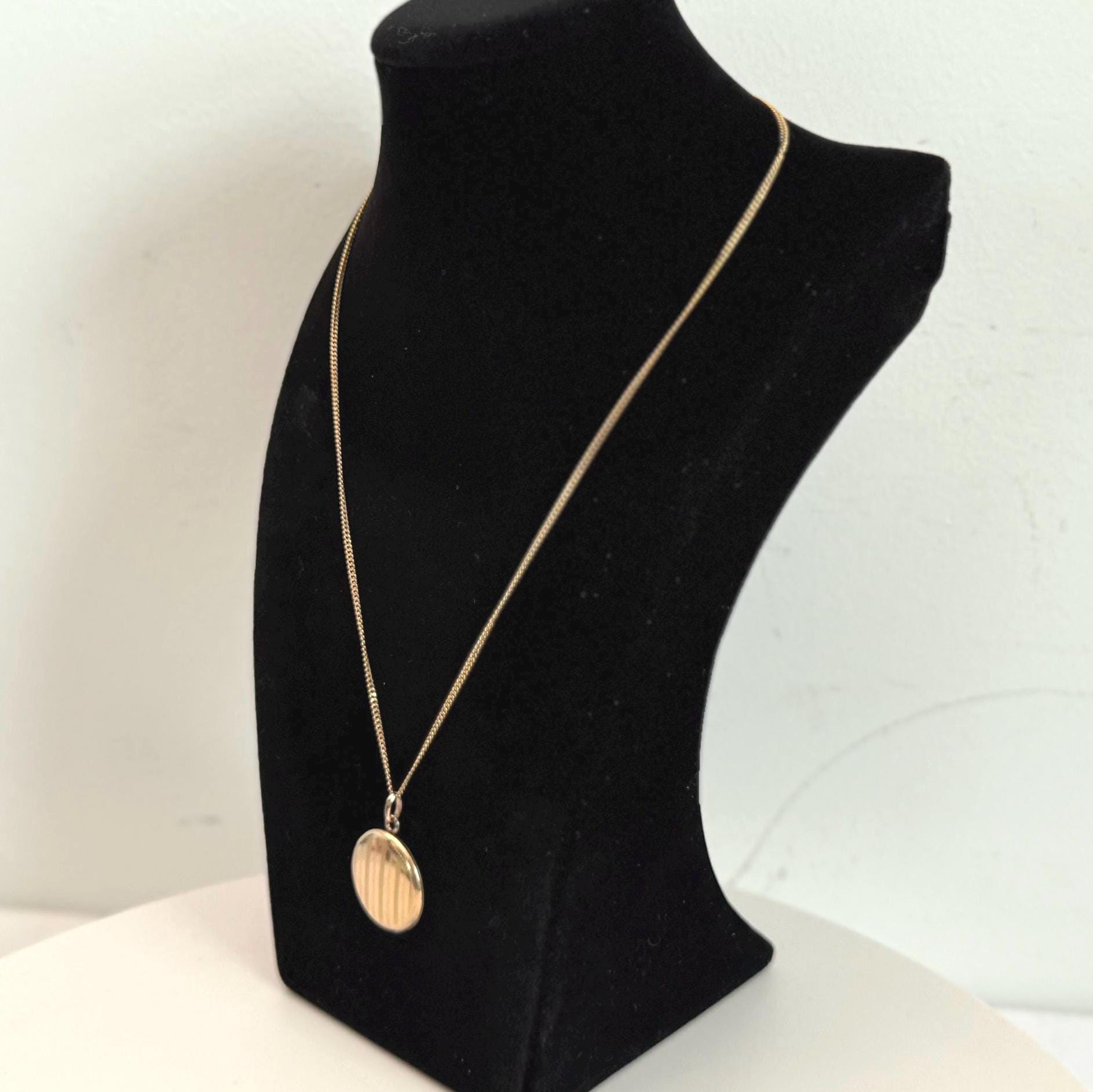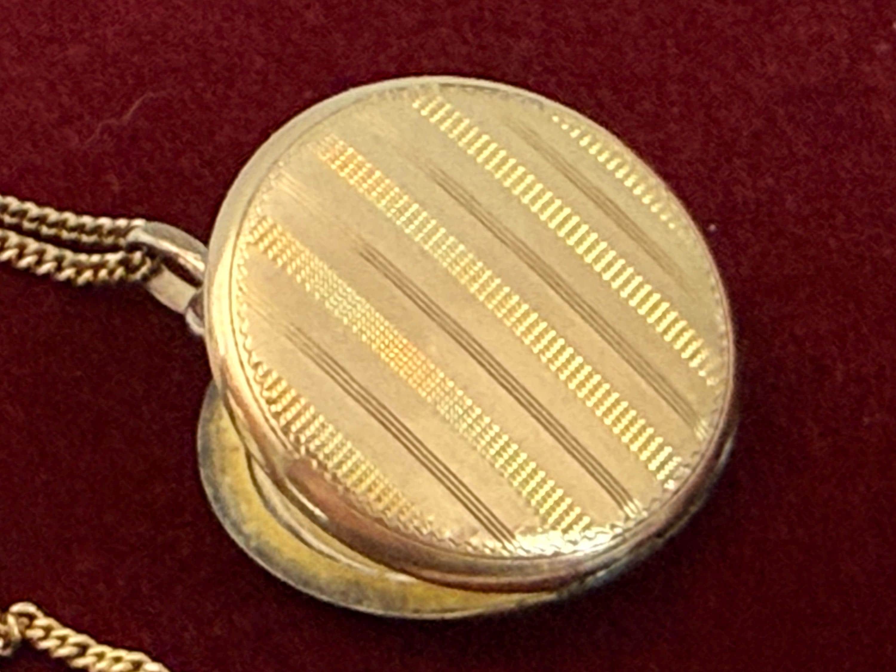 Beautiful round gold filled locket necklace featuring etched vertical pinstripes design on the front. The locket hangs on a vintage 12K gold filled curb chain.