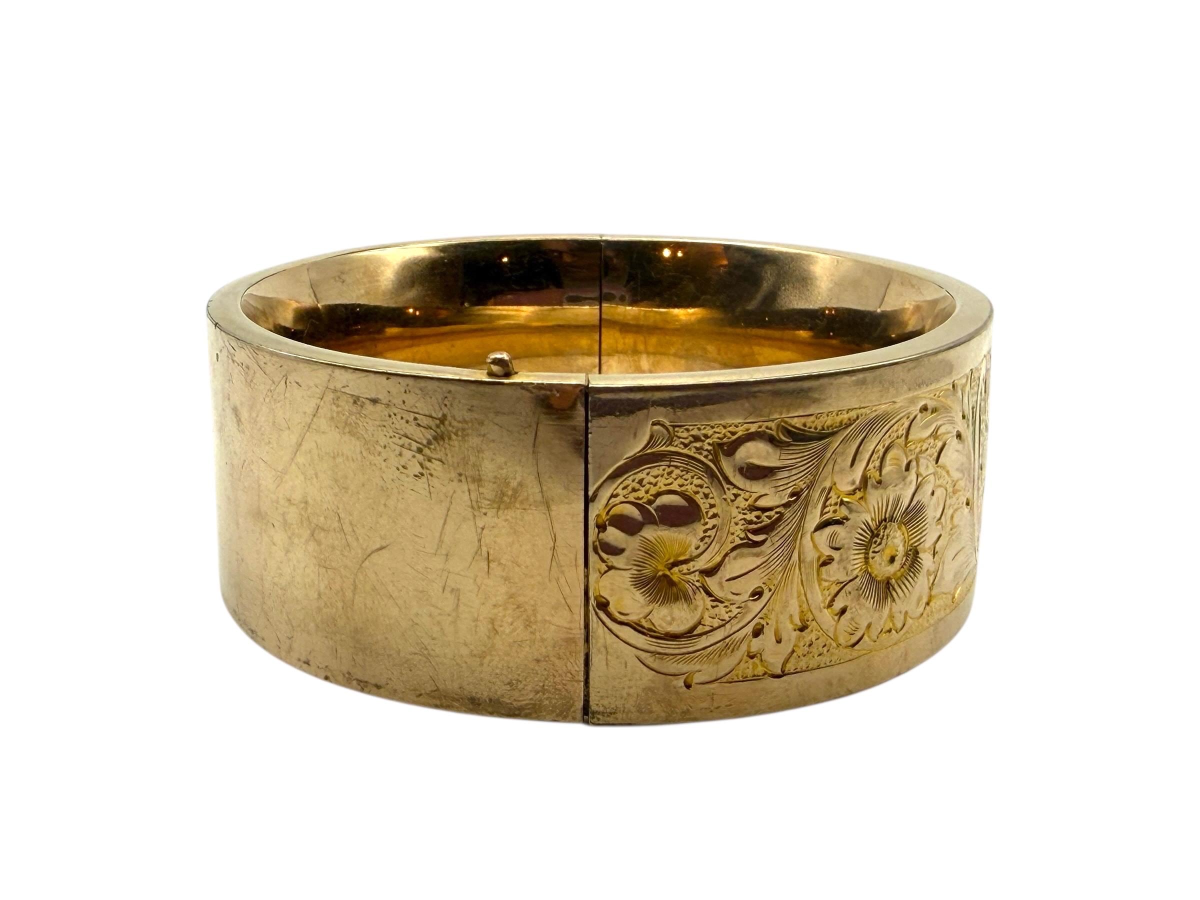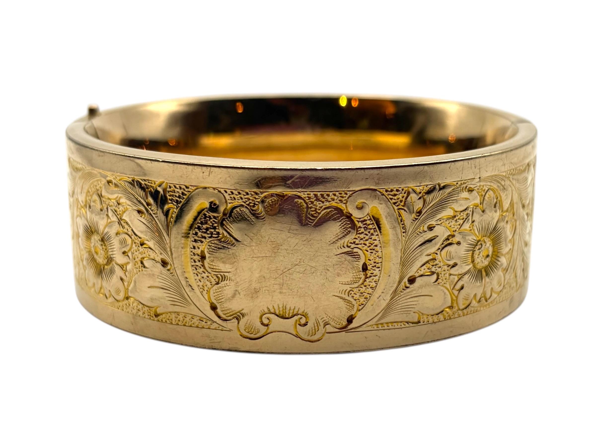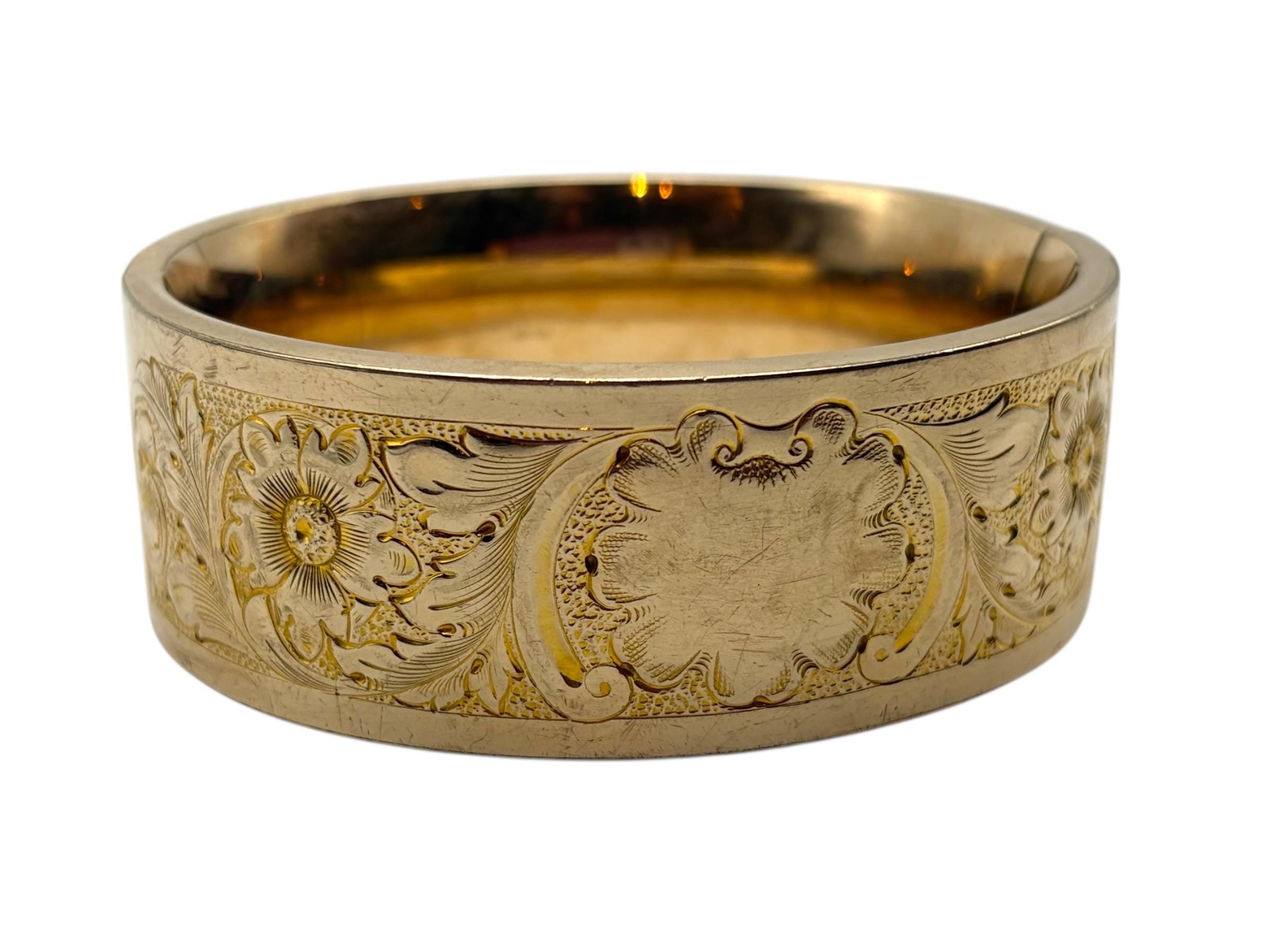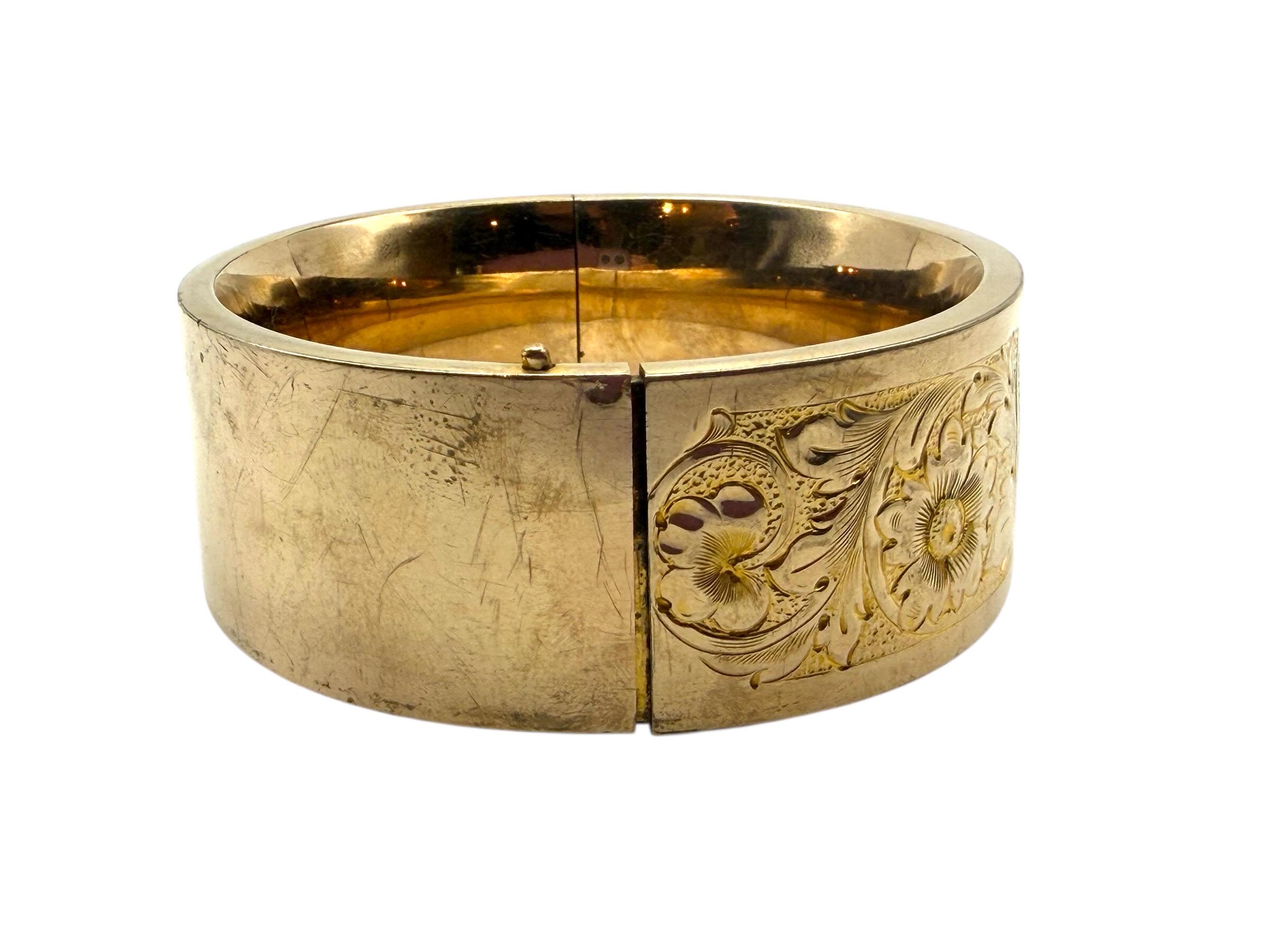 Lovely vintage gold filled bracelet - very thick (1'' wide) with a beautiful floral design on the front of this late Victorian or early Edwardian era bangle that is circa early 1900s in age (circa 1900-1910s). The back portion of the bracelet is plain with no design.