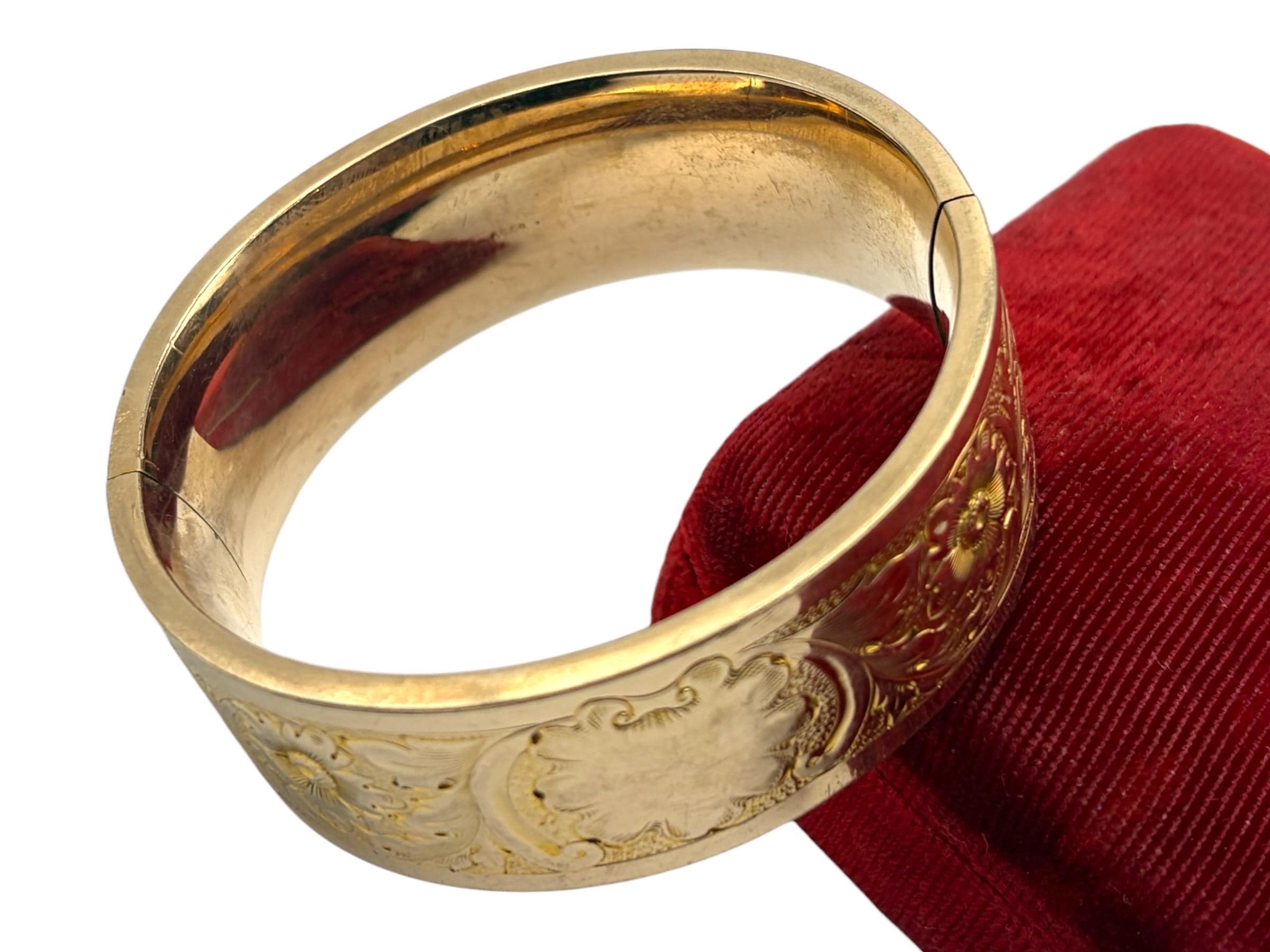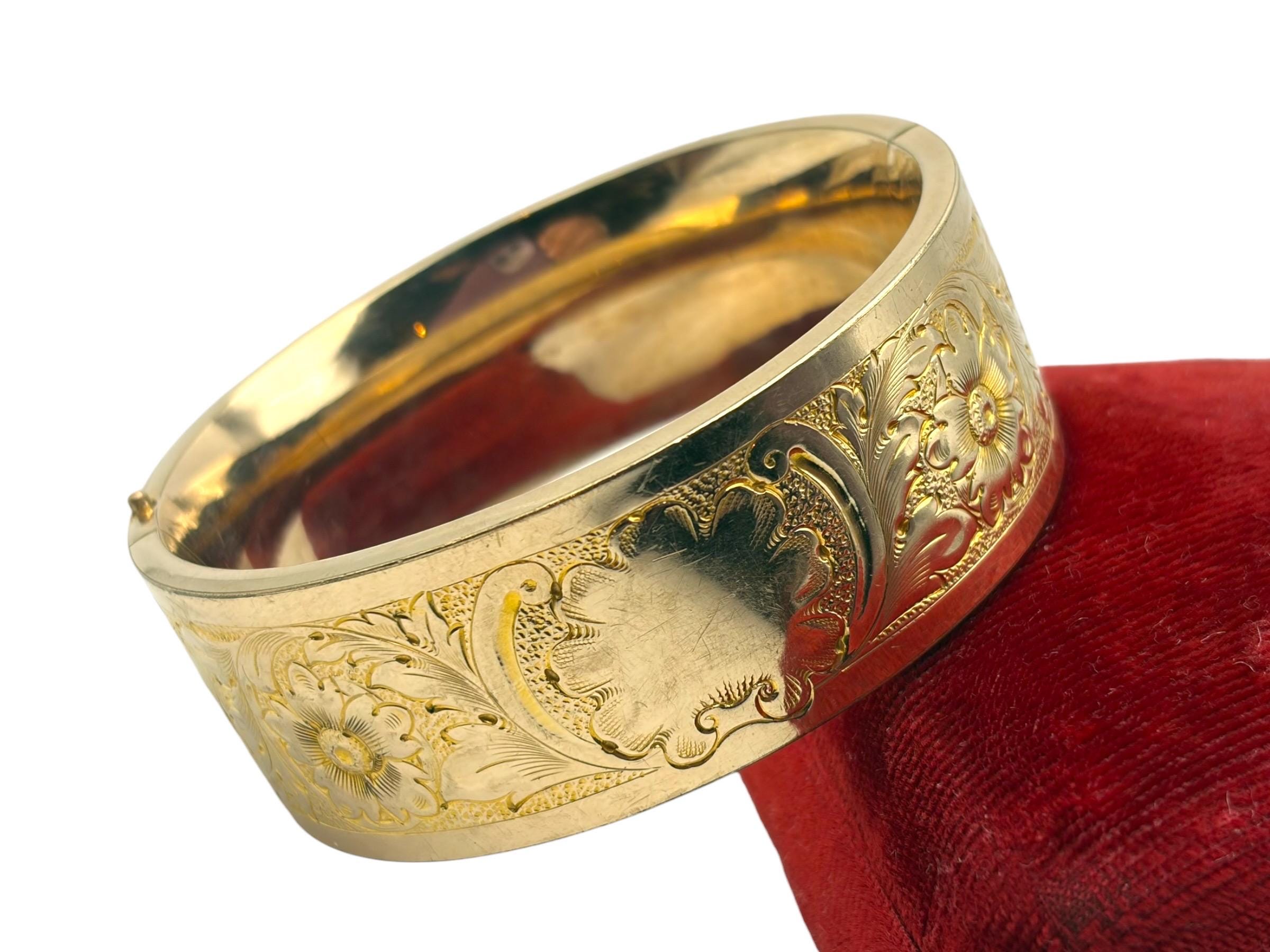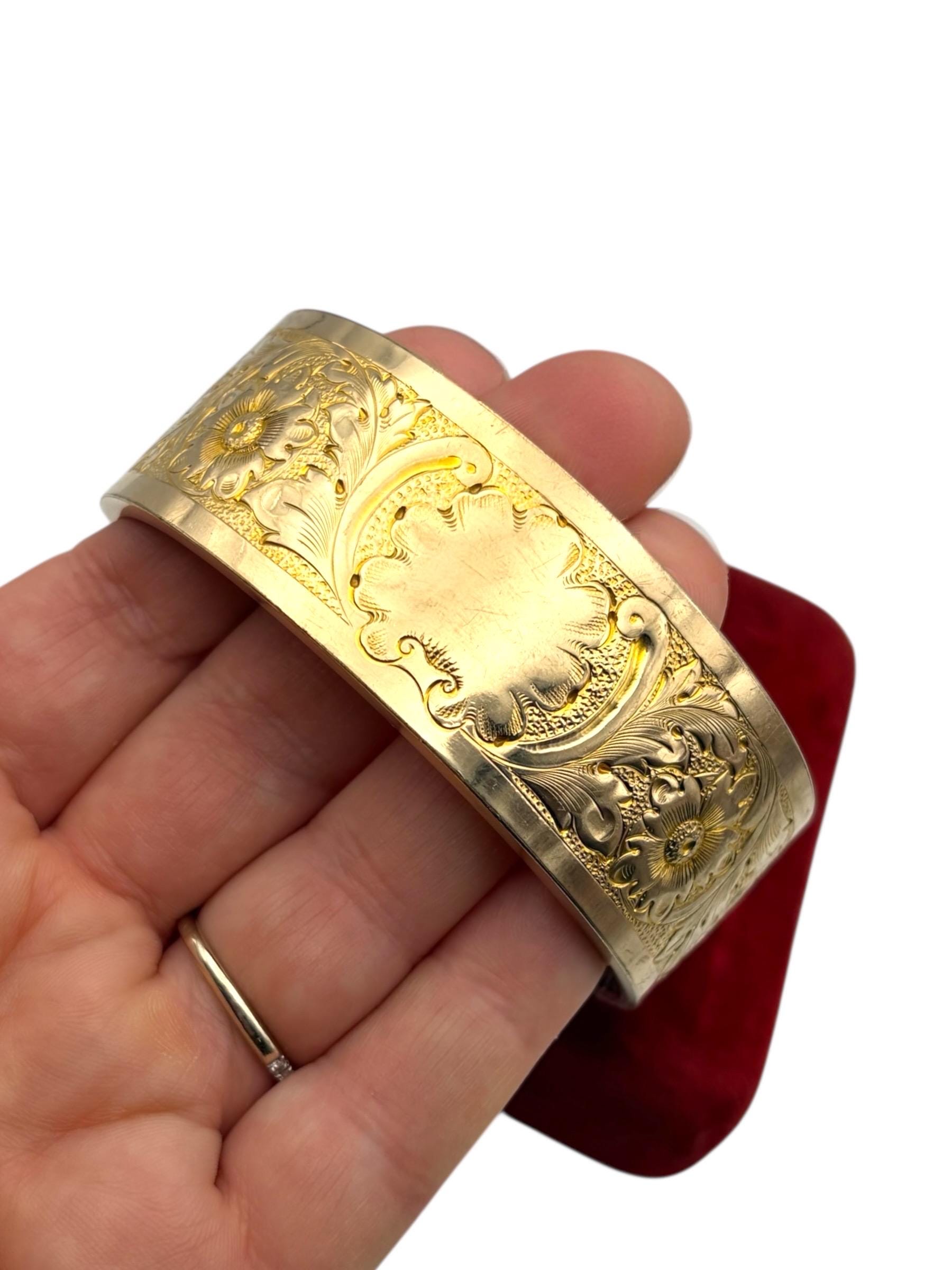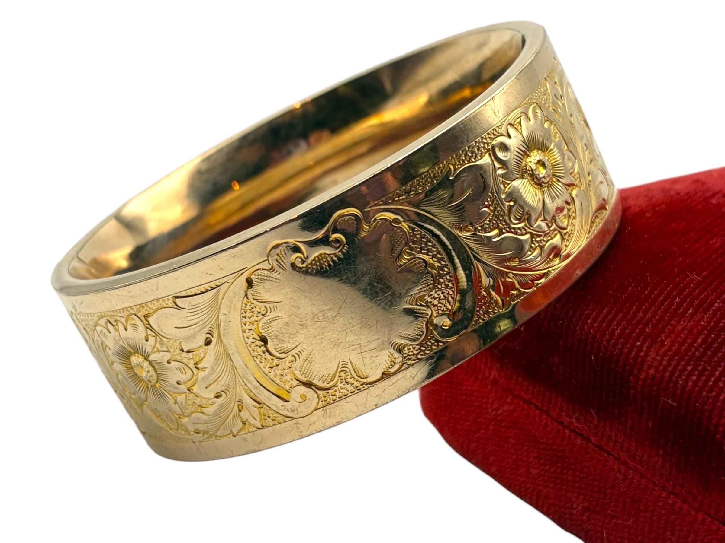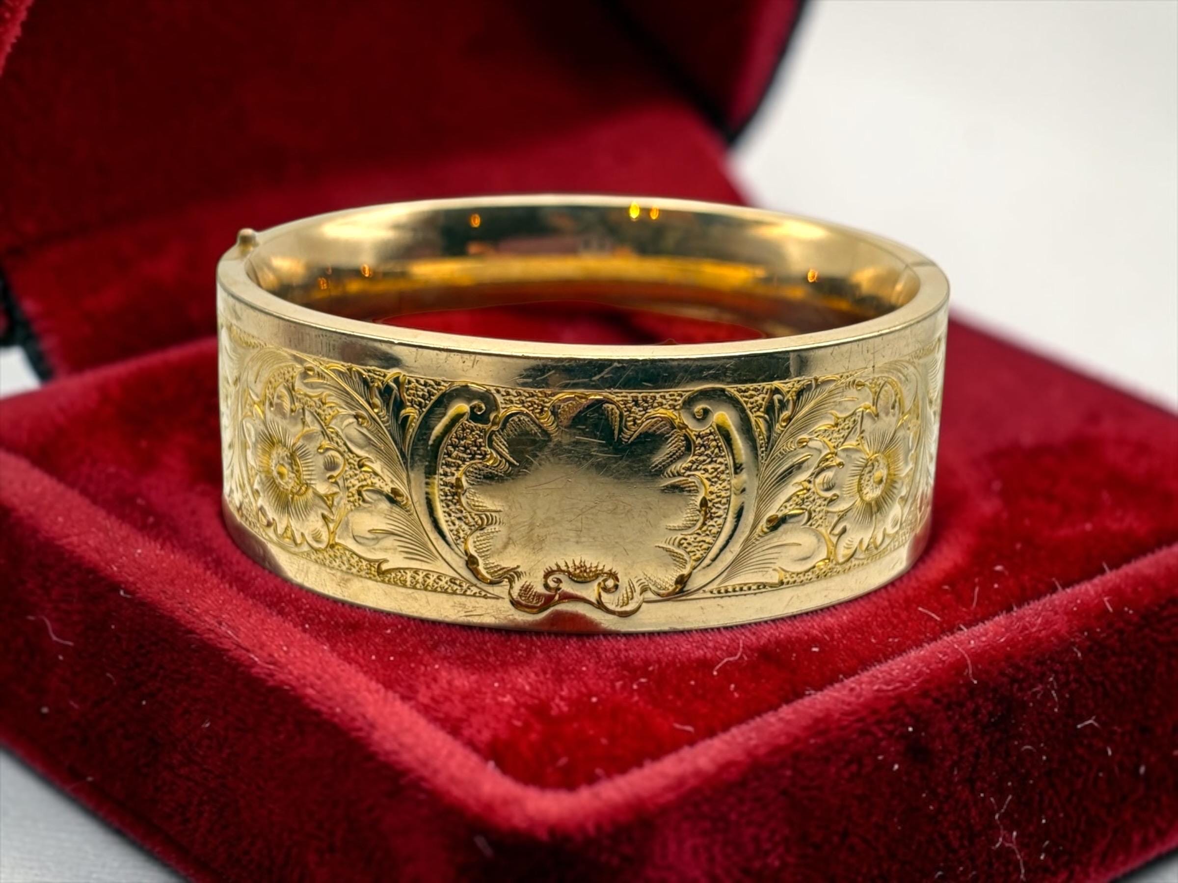 Lovely vintage gold filled bracelet - very thick (1'' wide) with a beautiful floral design on the front of this late Victorian or early Edwardian era bangle that is circa early 1900s in age (circa 1900-1910s). The back portion of the bracelet is plain with no design.