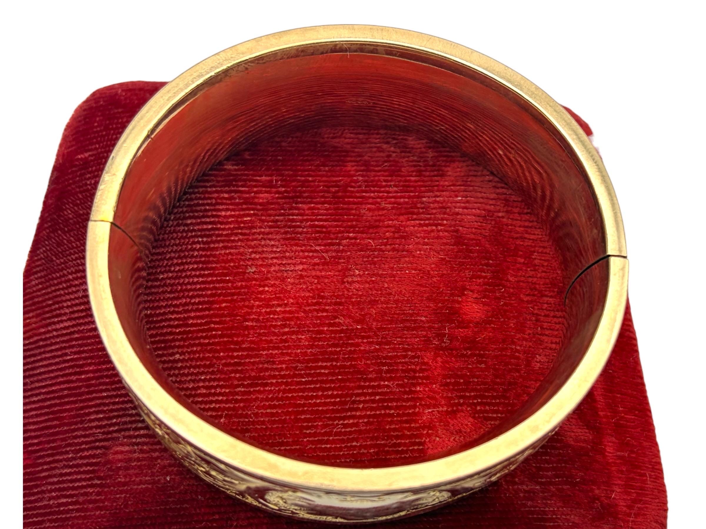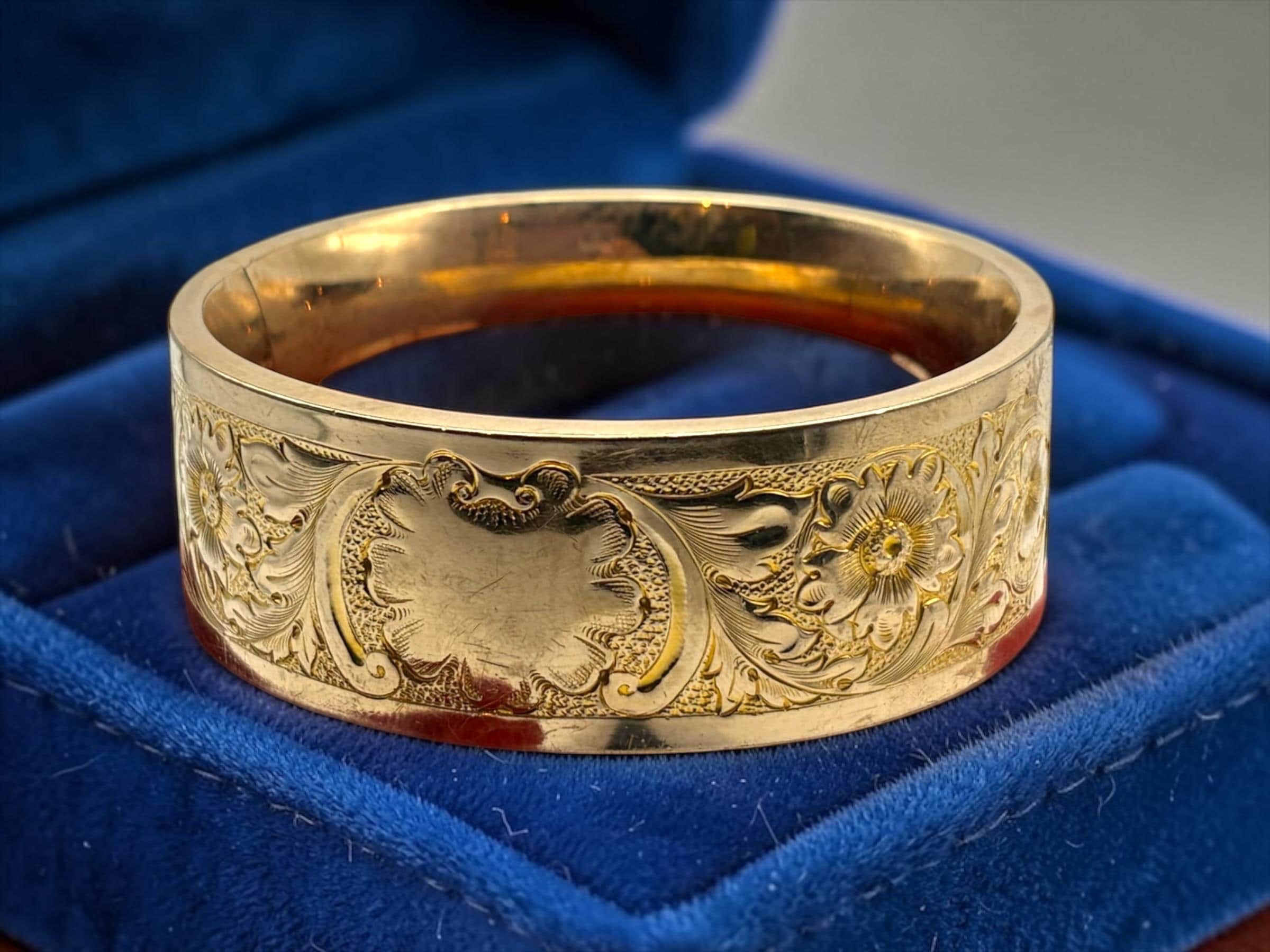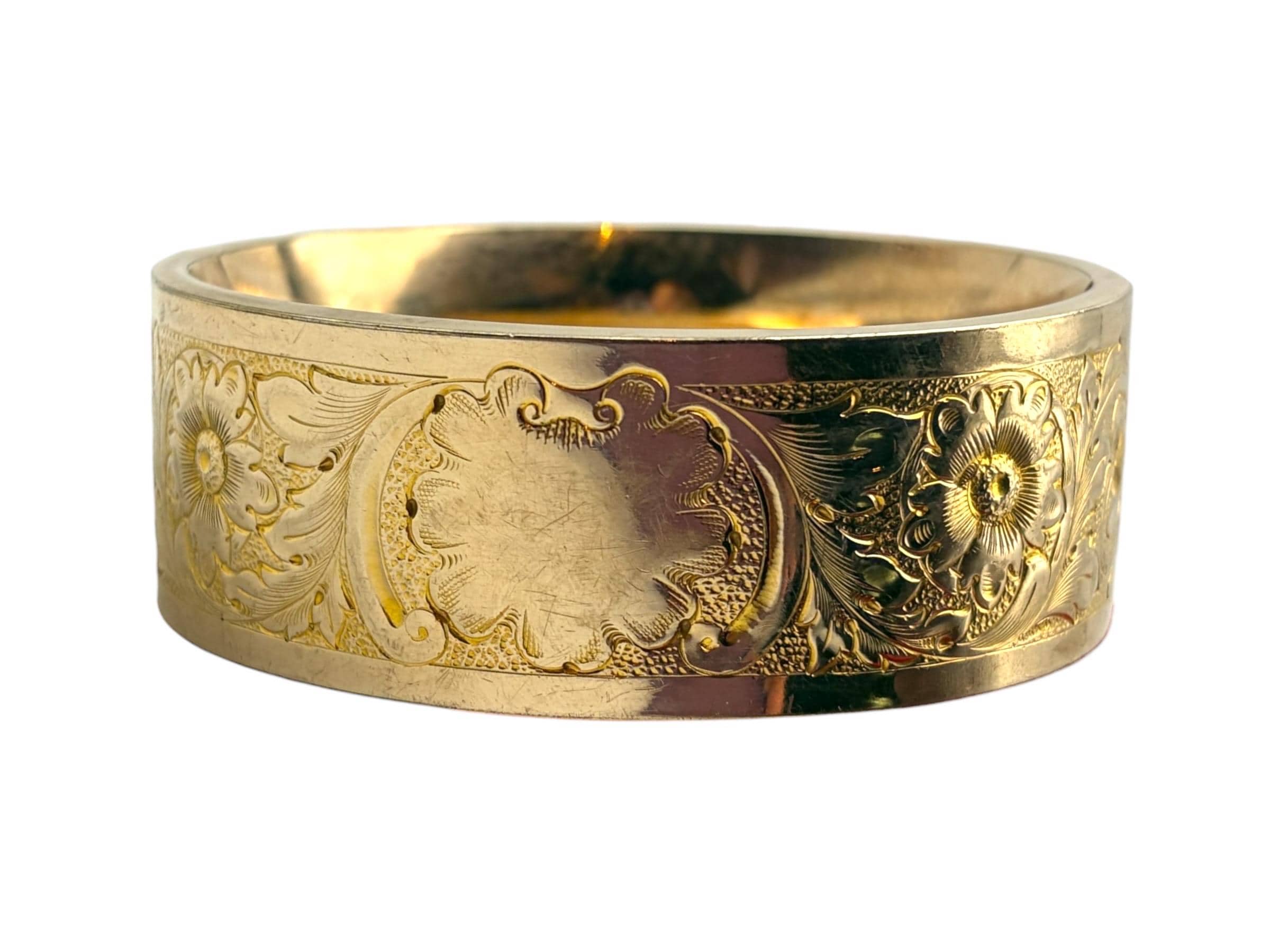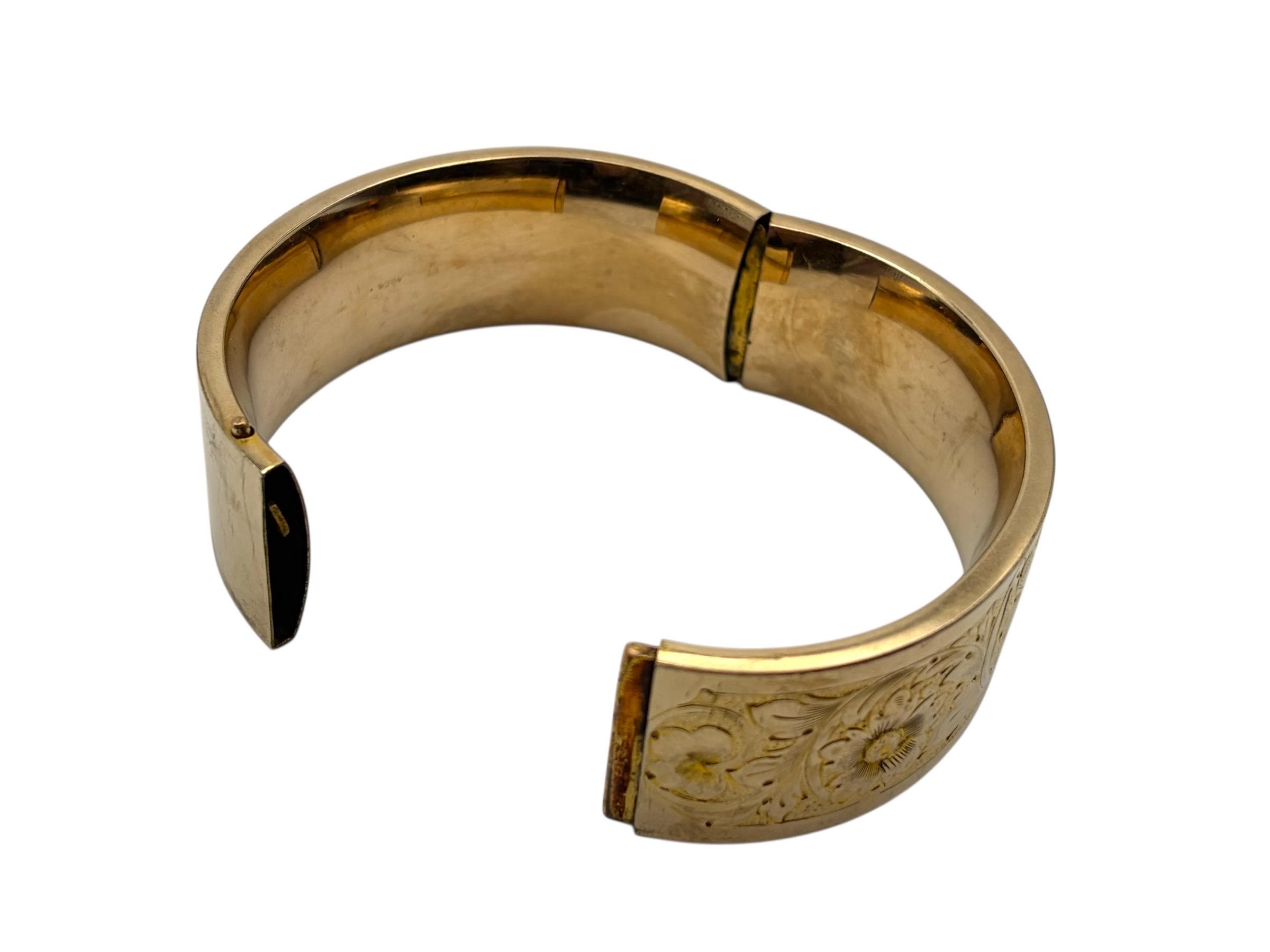 Lovely vintage gold filled bracelet - very thick (1'' wide) with a beautiful floral design on the front of this late Victorian or early Edwardian era bangle that is circa early 1900s in age (circa 1900-1910s). The back portion of the bracelet is plain with no design.